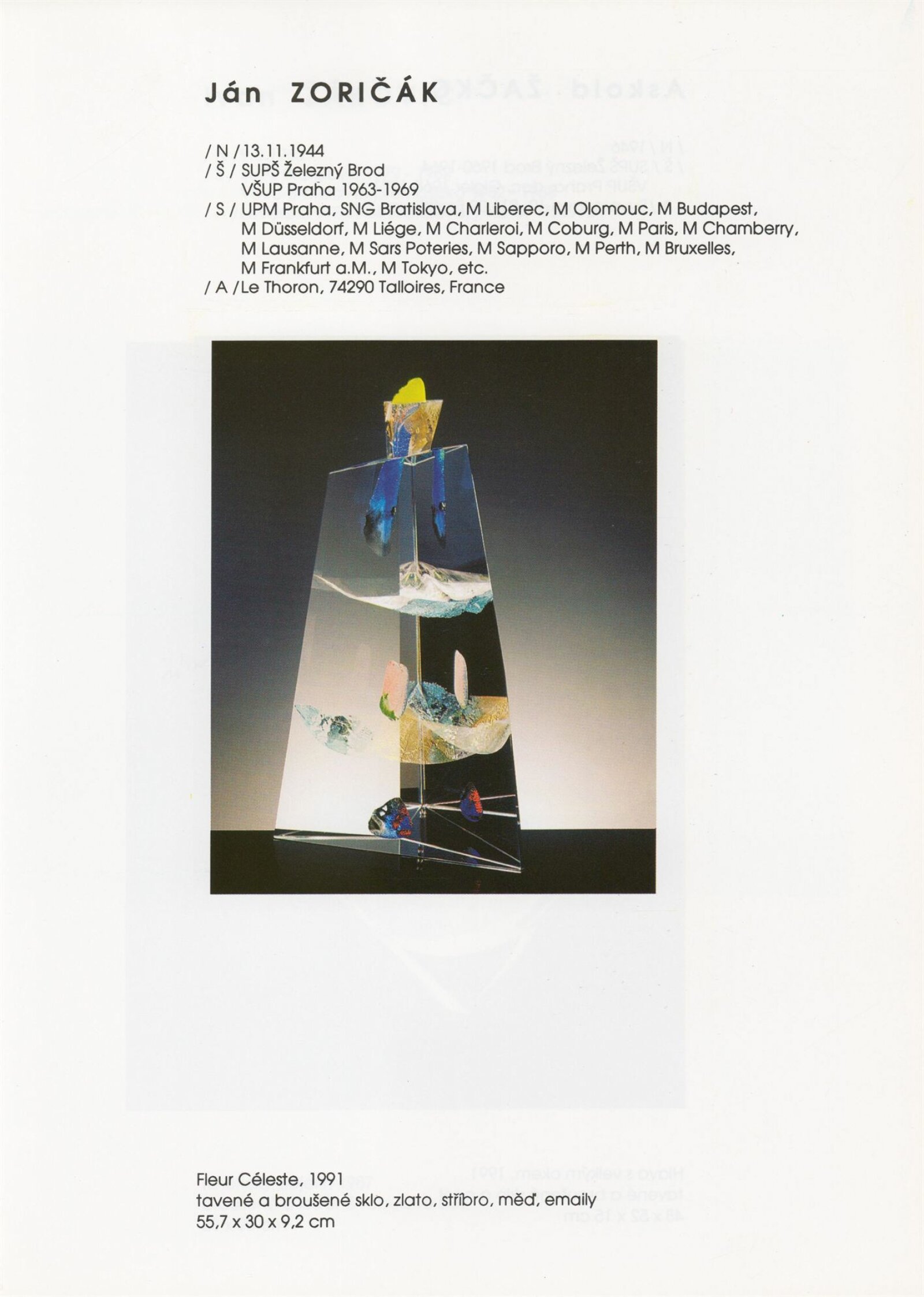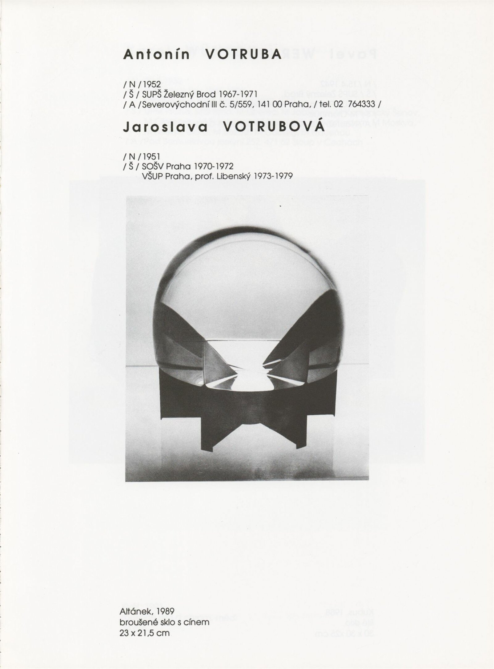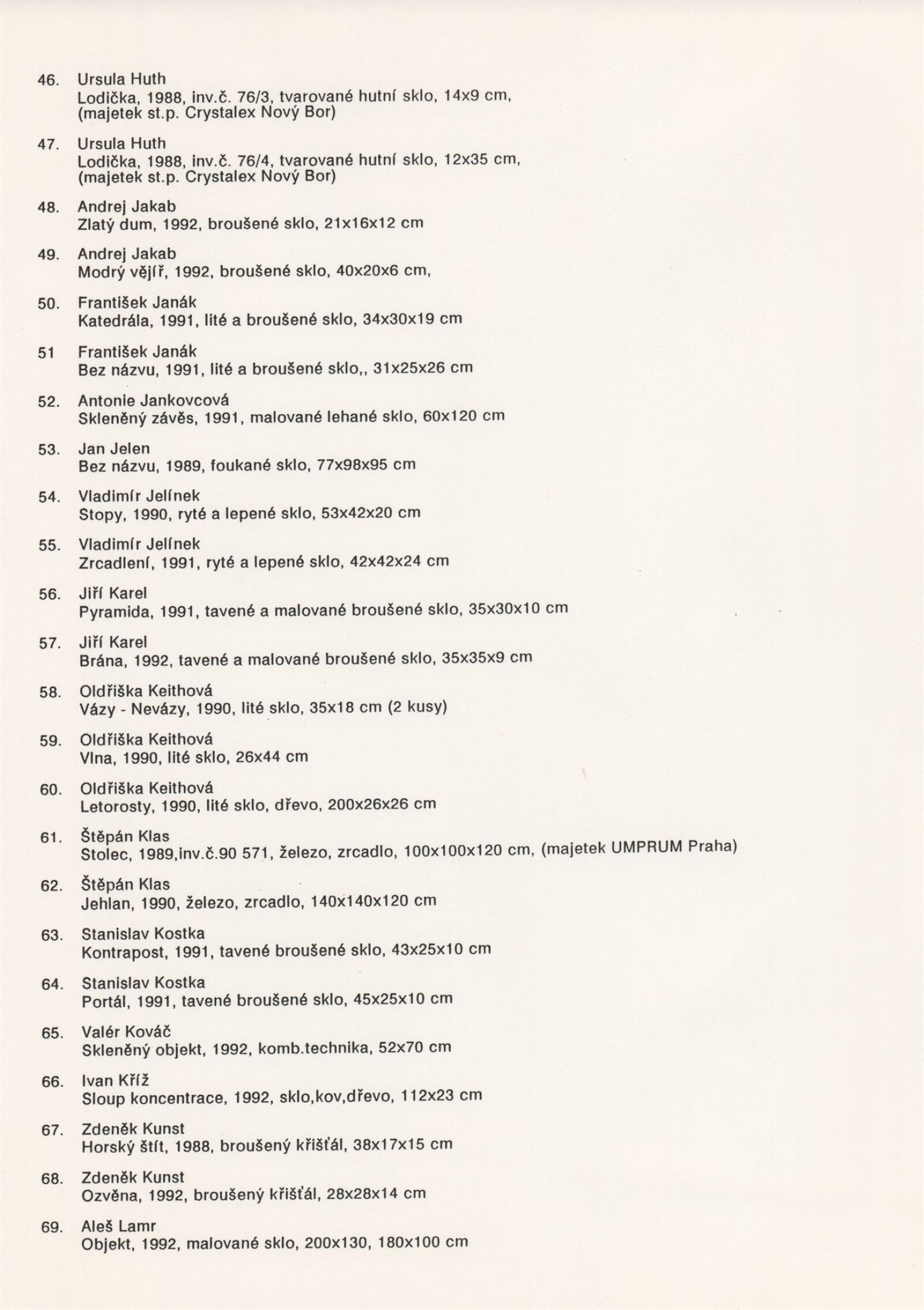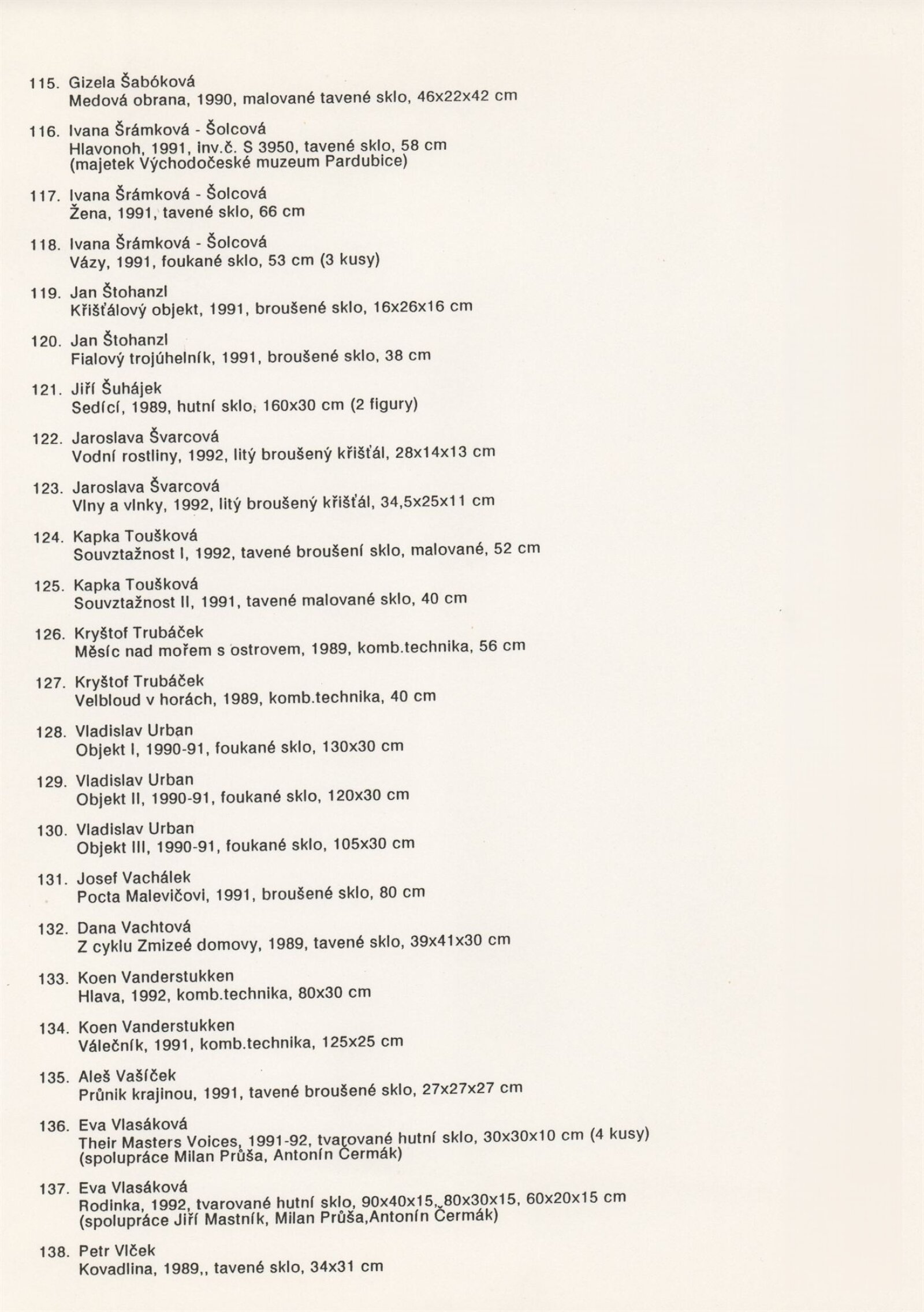 Jan Adam, Blanka Adensamová, Miloš Balgavý, Vlastimil Beránek, Ilja Bílek, Václav Cigler, Zdeněk Čáp, Richard Čermák, Lenka Čermáková, Anča Daučíková, Milan Drábek, Karol Drexler, Bohumil Eliáš, Jan Exnar, Ľubomír Ferko, Jan Fišar, Jitka Forejtová, Karel Fuksa, Eliška Fuksová, Laco Garaj, Marie Glückhaufová, Václav Hanuš, Pavel Homolka, Stanislav Honzík, Petr Hora, Ivana Houserová, Ursula Huth, Andrej Jakab, František Janák, Antonie Jankovcová, Karolína Jankovcová, Jan Jelen, Vladimír Jelínek, Jiří Karel, Martin Jiřička, Oldřiška Keithová, Štěpán Klas, Stanislav Kostka, Valér Kováč, Ivan Kříž, Zdeněk Kunst, Aleš Lamr, Peter Layton, Edward Leibovitz, Stanislav Libenský, Jaroslava Brychtová, Oldřich Lípa, Marvin Lipofsky, Finn Lynggaard, Jan Malejovský, Jan Mareš, Ivana Mašitová, Antonín Oth, Charles Parriott, Rony Plesl, Drahomír Primel, Karel Rechlík, Veronika Richterová, René Roubíček, Miluše Roubíčková, Ivo Rozsypal, Eliška Rožátová, Jitka Růžičková, Jaromír Rybák, Juraj Steinhübel, Jaroslav Svoboda, Gizela Šabóková, Ivana Šrámková-Šolcová, Jan Štohanzl, Jiří Šuhájek, Jaroslava Švarcová, Kapka Toušková, Pavel Trnka, Kryštof Trubáček, Vladislav Urban, Josef Vachálek, Dana Vachtová, Koen Vanderstukken, Aleš Vašíček, Eva Vlasáková, Petr Vlček, Marian Volráb, Antonín Votrub, Jaroslava Votrubová, Pavel Werner, Karel Wünsch, Miroslava Wyckmans-Svobodová, Ján Zoričák, Askold Žačko, Ivan Žákovič, Jiřina Žertová