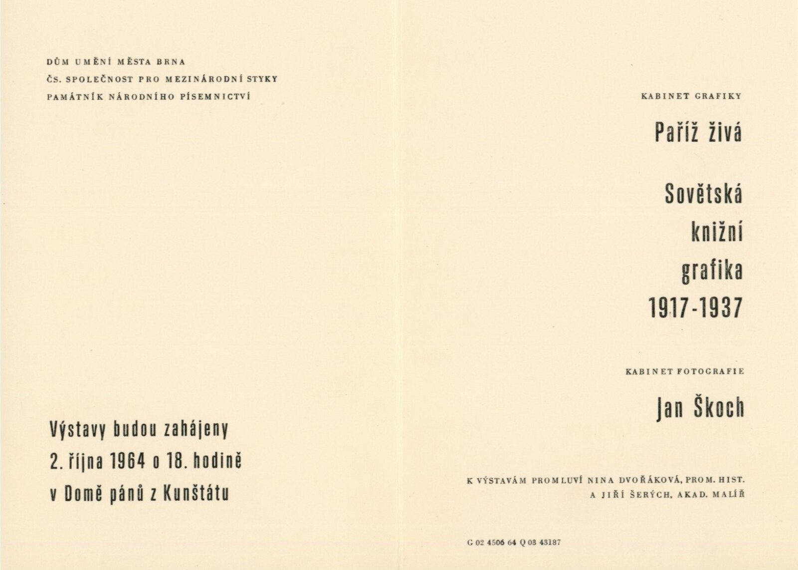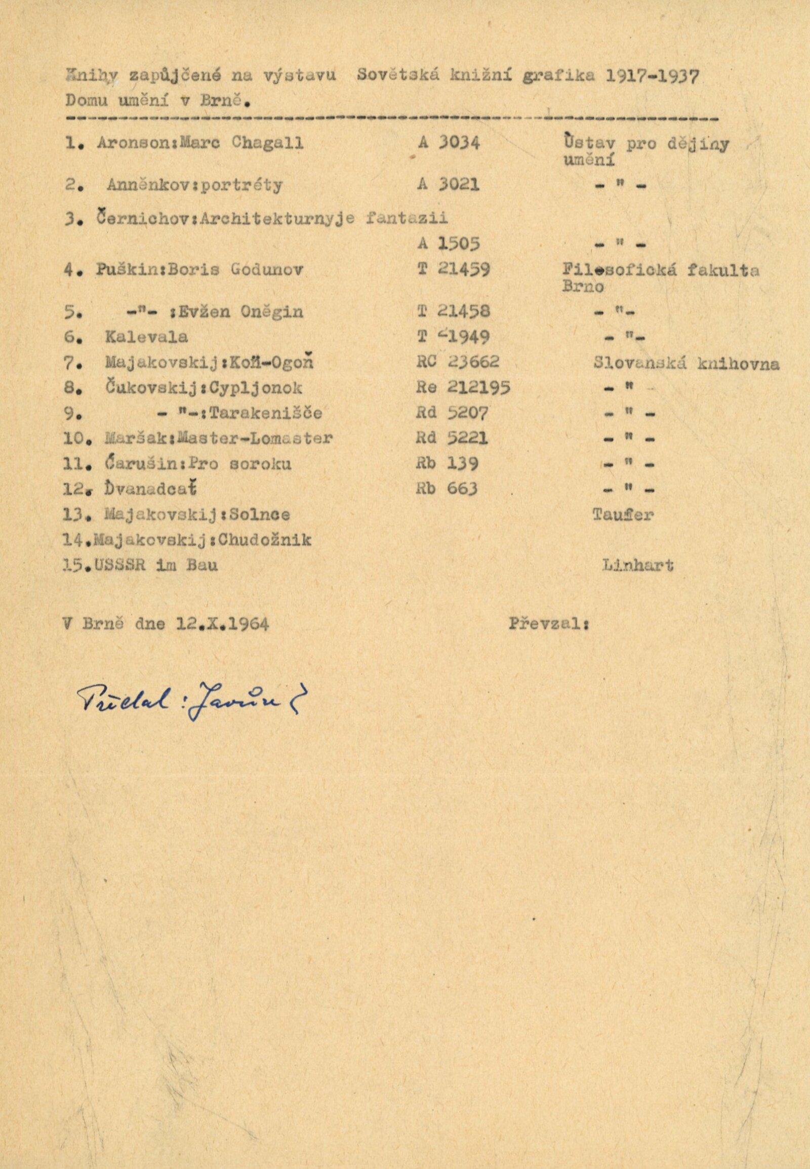 pozvánka, texty k výstavě (strojopisy), seznam vystavených knih, provozní korespondence, převzetí Památníkem Petra Bezruče Opava, recenze v tisku