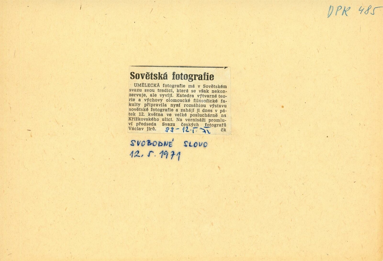 Sovětští spolupracovníci čs. revue Fotografie: Dům umění města Brna / Dům pánů z Kunštátu, Kabinet fotografie Jaromíra Funka, 12. 11. – 5. 12. 1971 / Text: Václav Jírů. – Brno: DUmB, 1971. – 12 s., obr. DPK 485. – MZK; MG