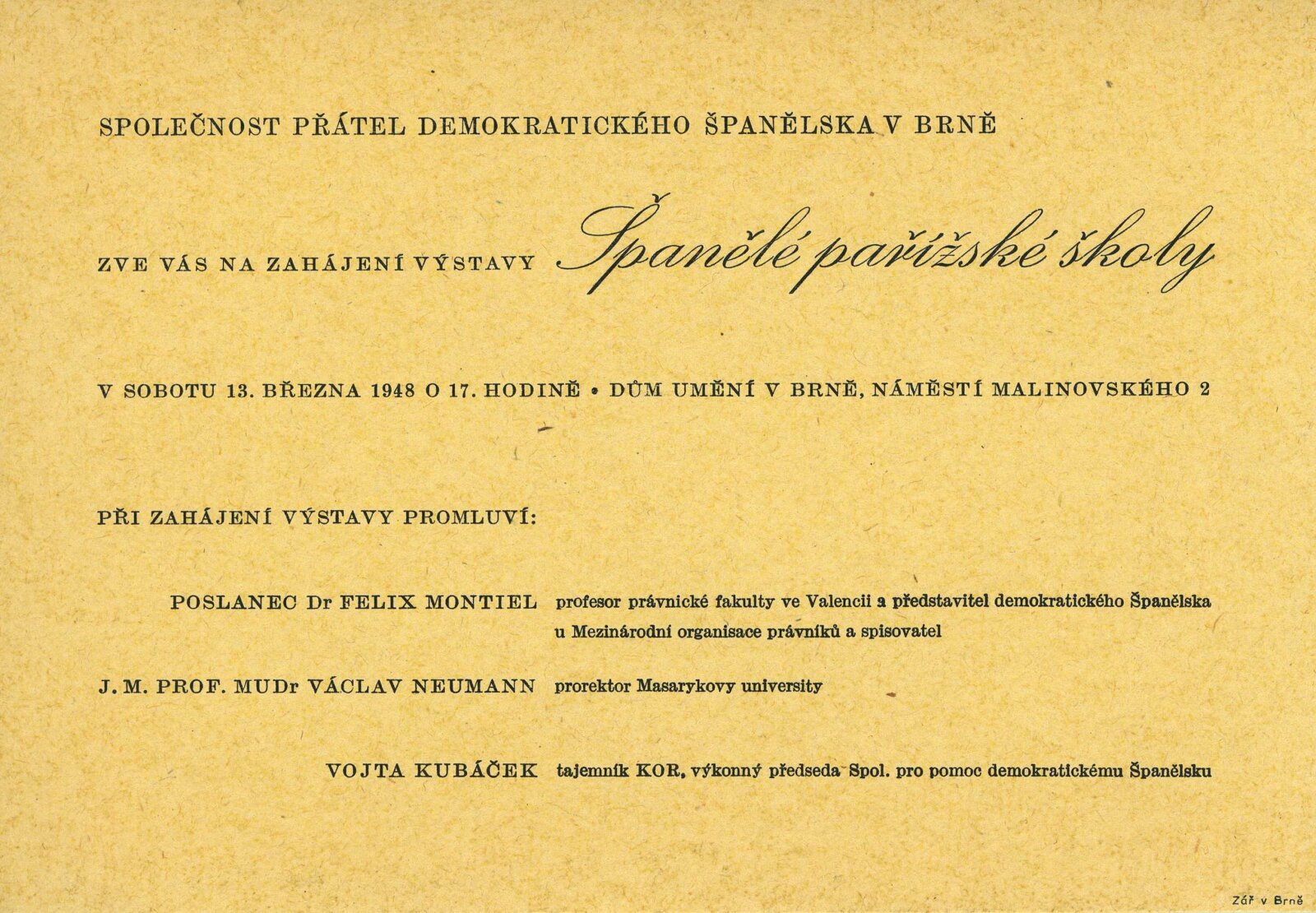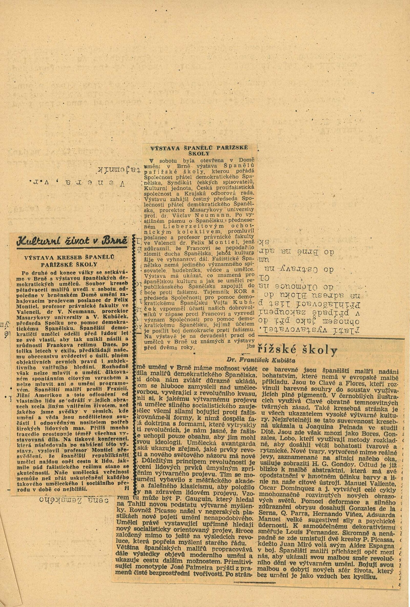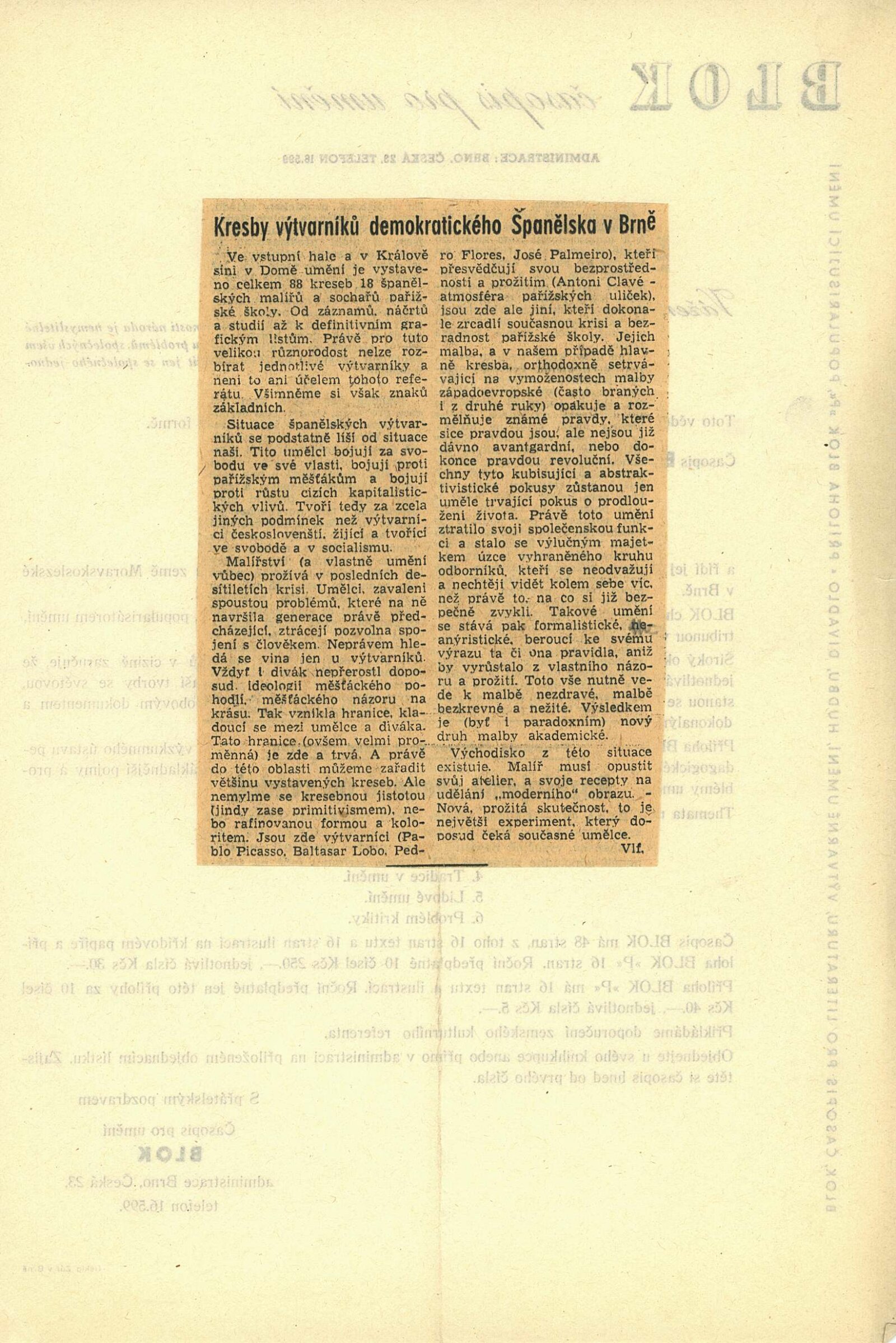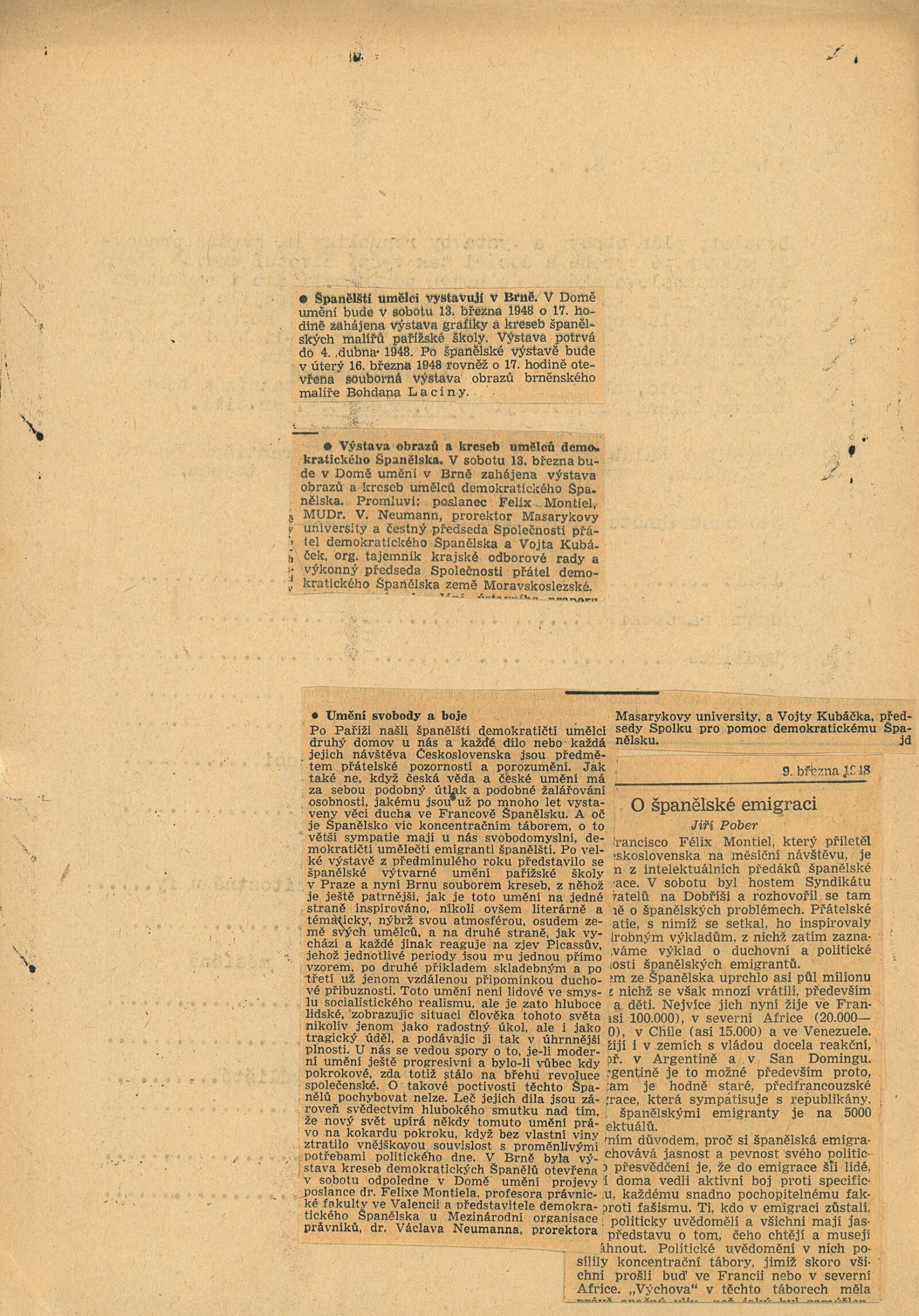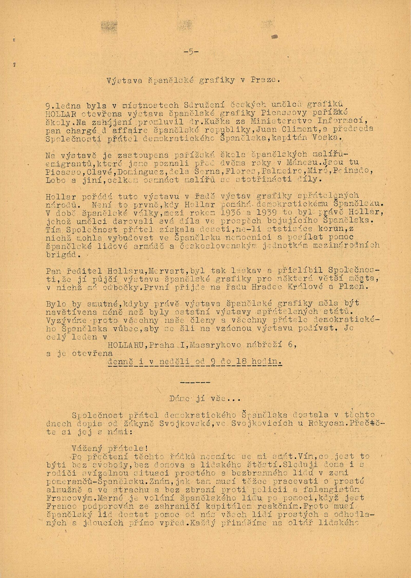 pozvánka, seznam vystavujících umělců, fotografie z výstavy, texty Informační služby Společnosti přátel demokratického Španělska, provozní korespondence (s cenami prodejných děl), potvrzení o převzetí děl, recenze v tisku, pozvánka na výstavu (Praha)