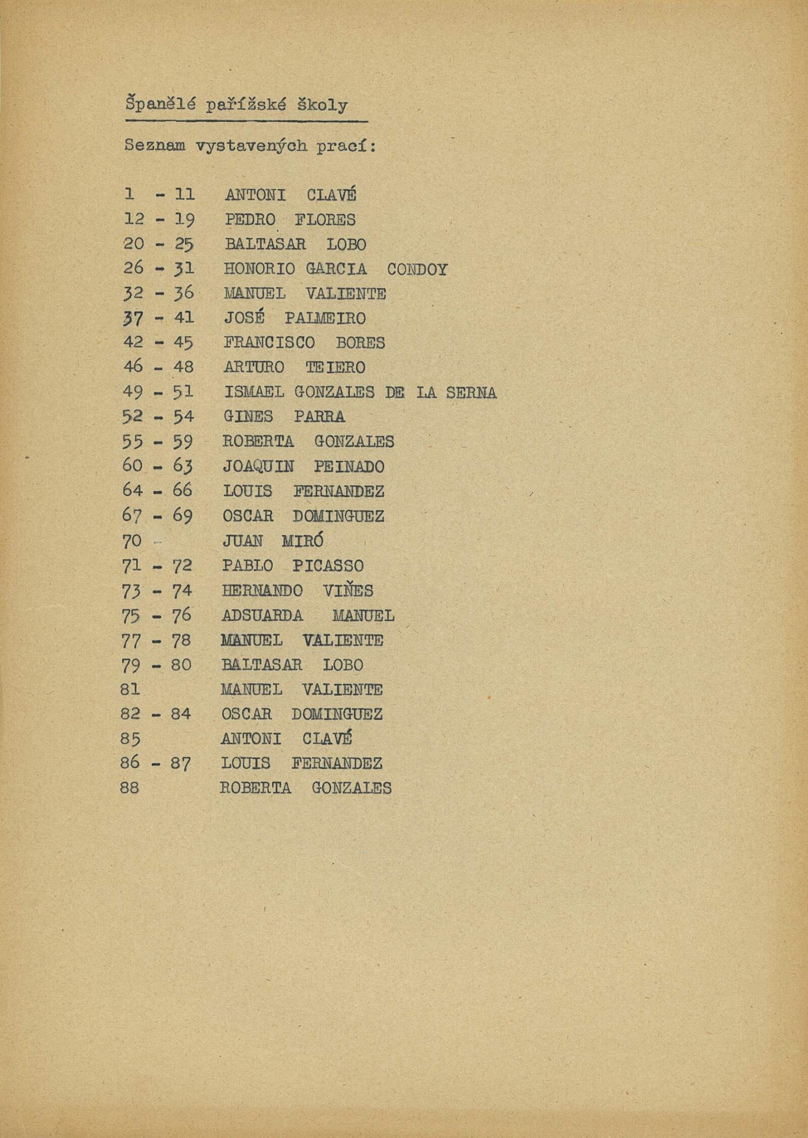 Španělé pařížské školy: Dům umění, od 13. 3. 1948 / Převzatý katalog. Španělé pařížské školy: Síň Hollara v Praze, leden 1948 / Praha: Sdružení českých umělců grafiků Hollar, 1948. – 11 s., báseň Františka Halase, DU 69. – MG