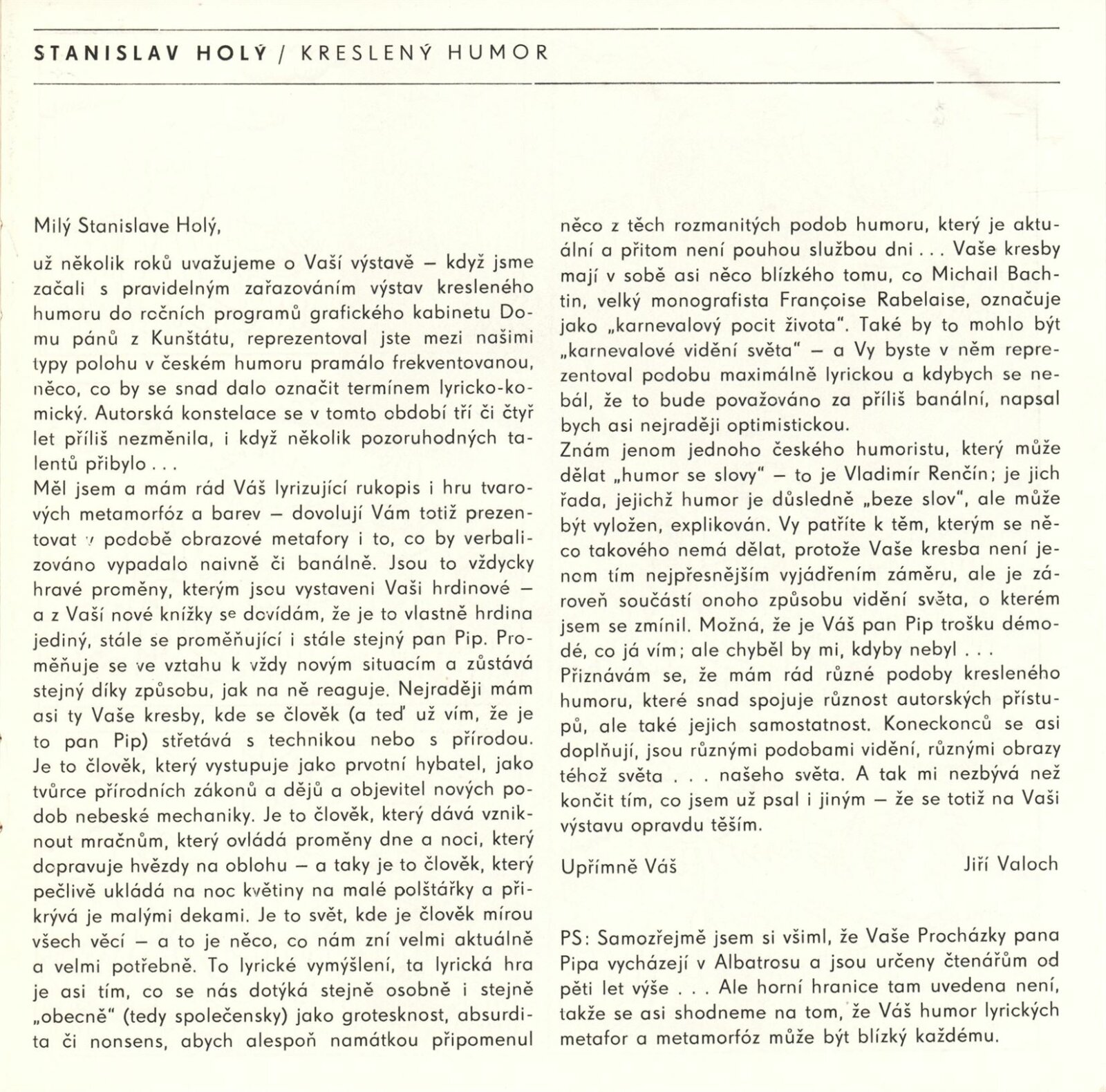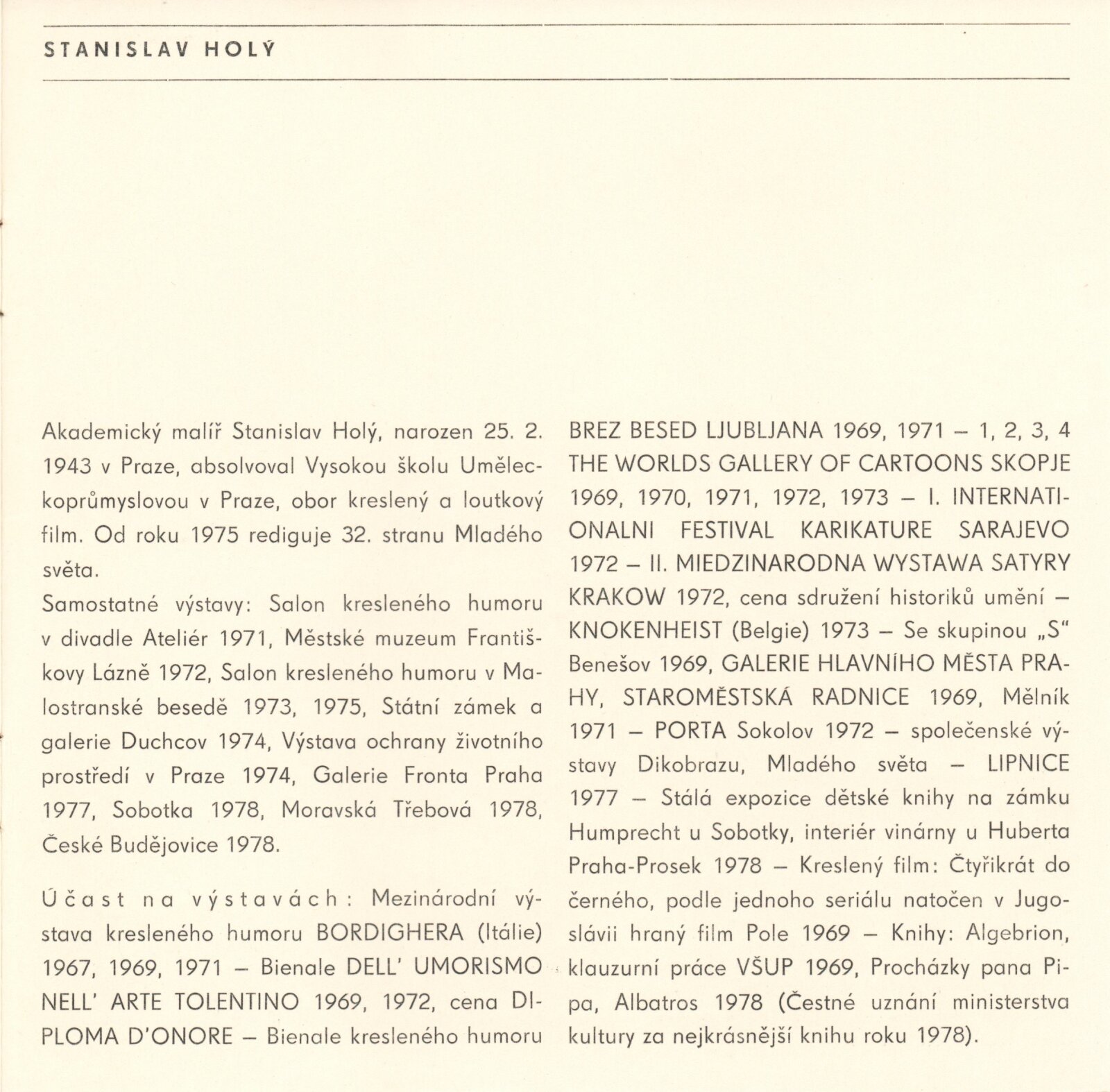 Stanislav Holý. Kreslený humor: Kabinet grafiky, Dům pánů z Kunštátu 11. 5. – 10. 6. 1979 / Text Jiří Valoch. - Brno: DUmB, - 8 s., obr. Životopis DPK 702; MZK; MG; MMB
