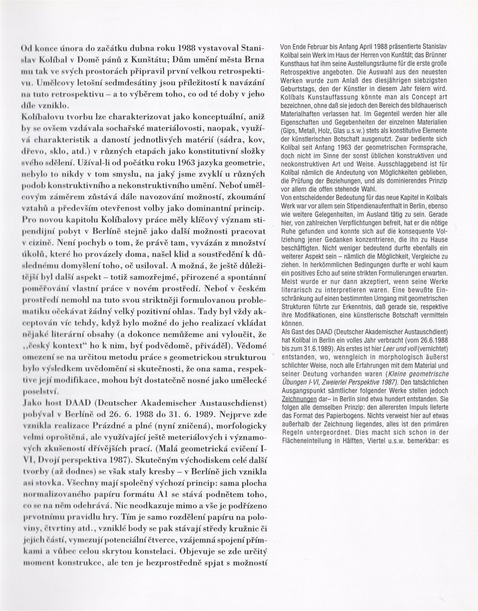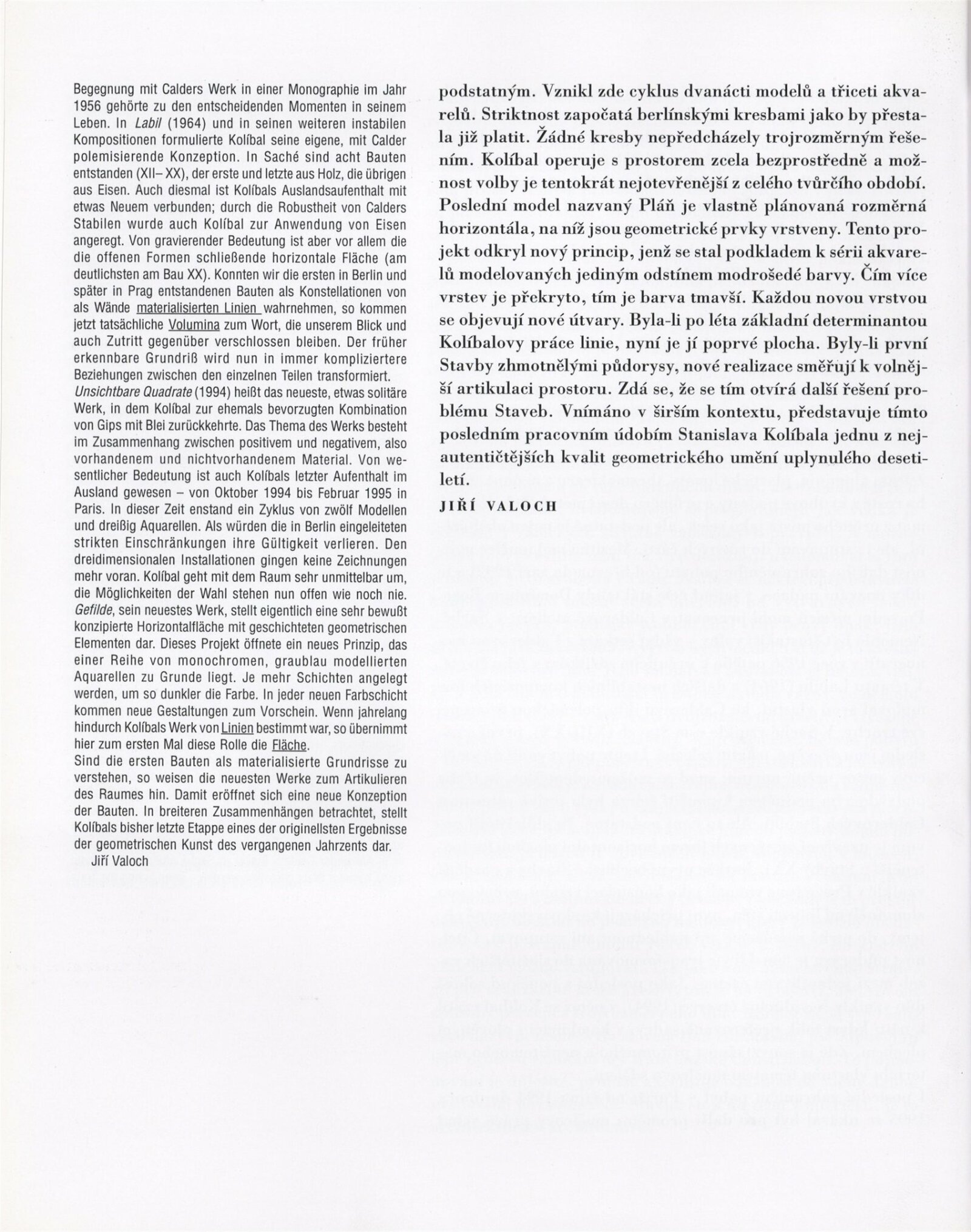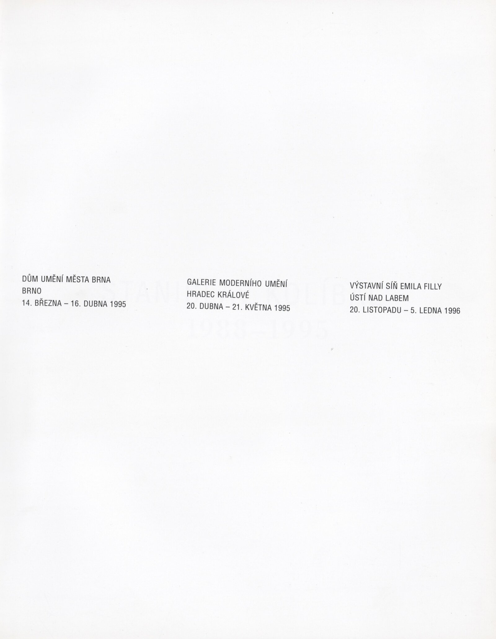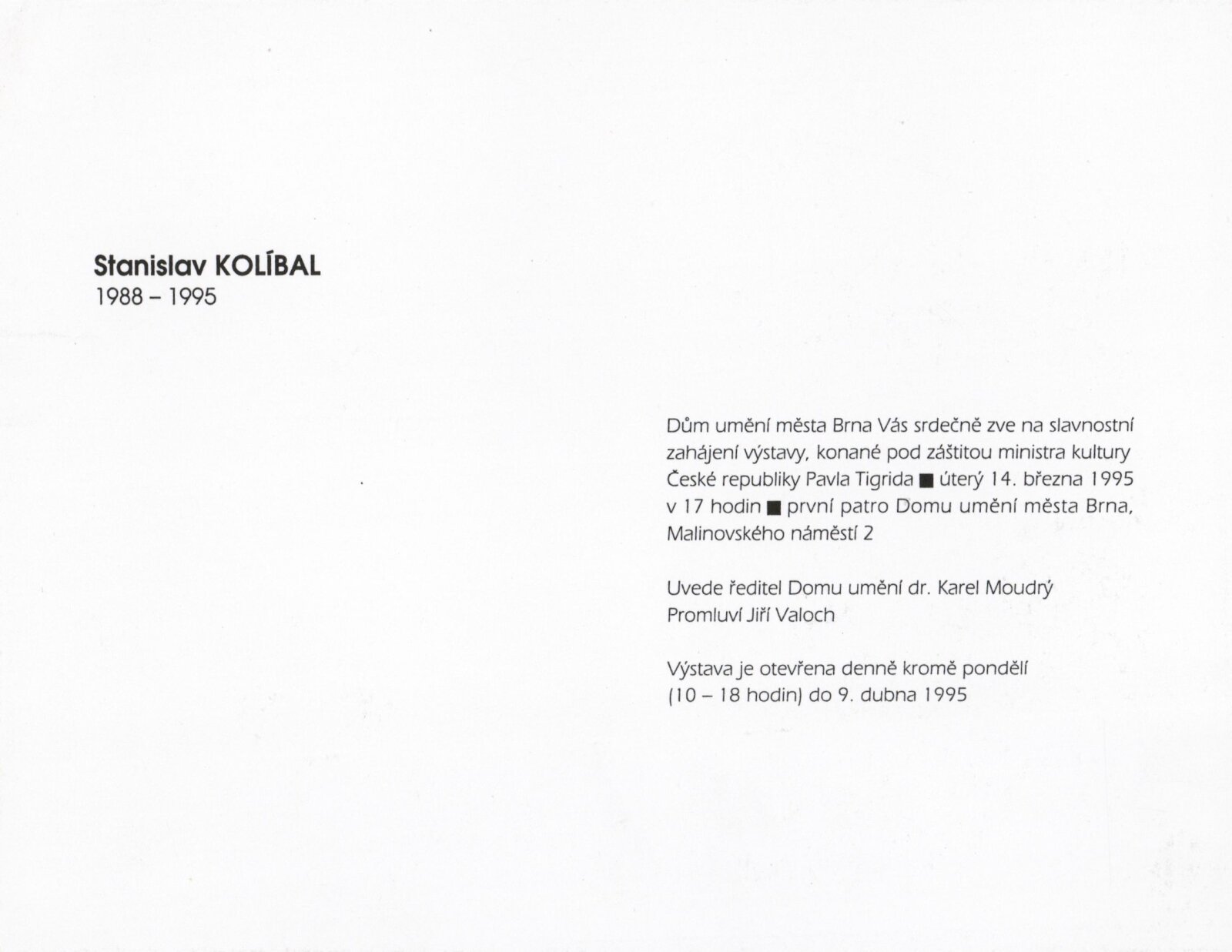 Stanislav Kolíbal, 1988–1995: Dům umění města Brna 14. 3. – 16. 4. 1995 ... / Text Jiří Valoch, autor. - Brno: DUmB, - 39 s., obr. DU 987; MZK