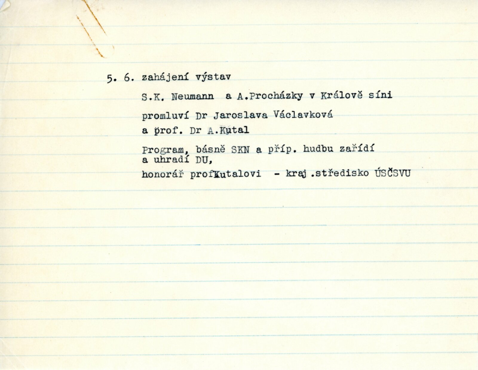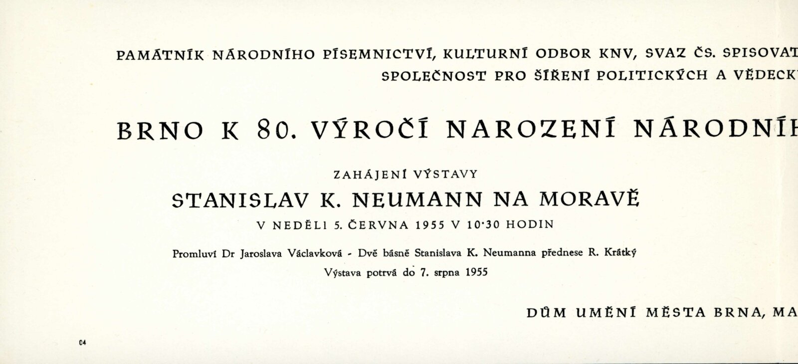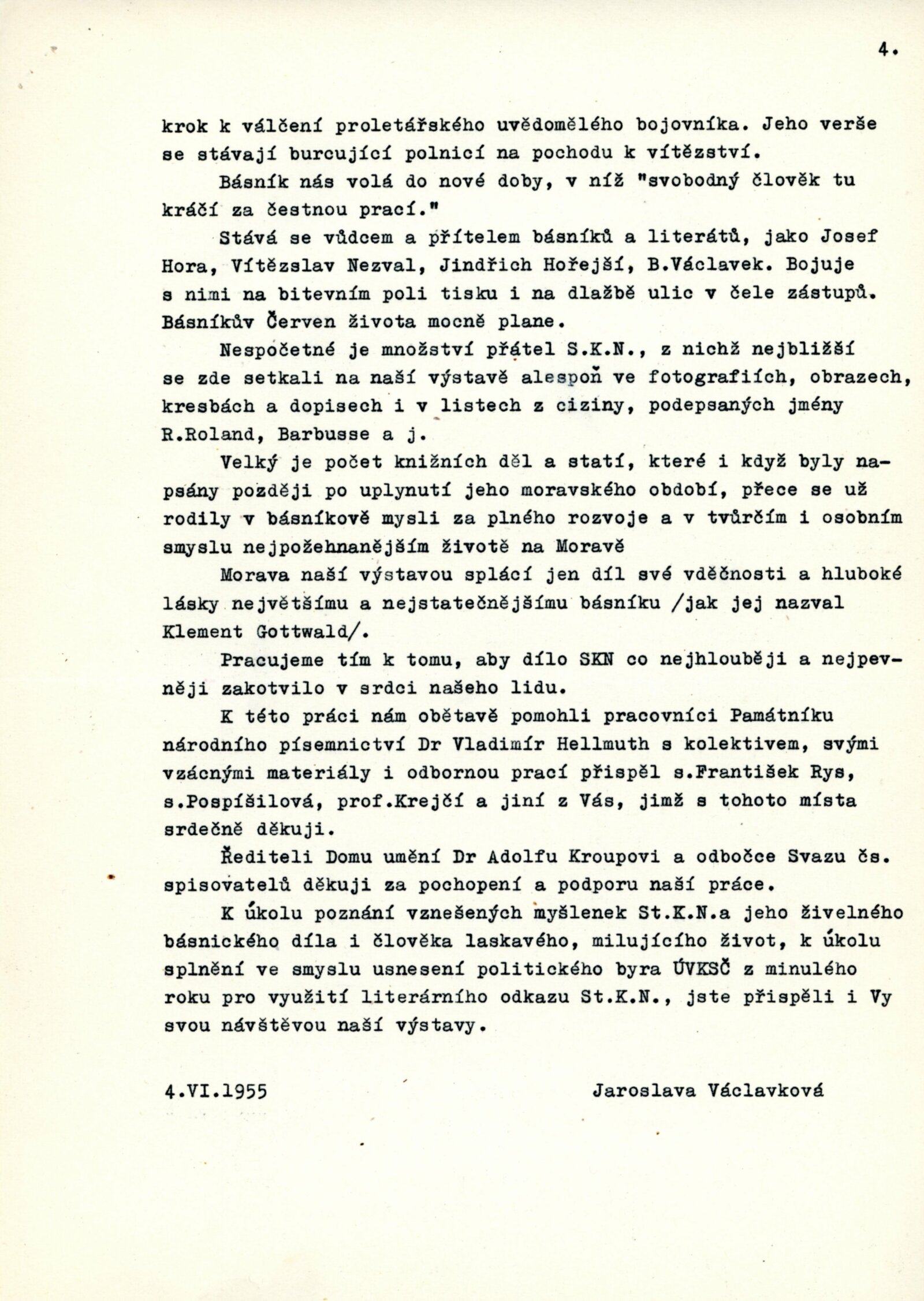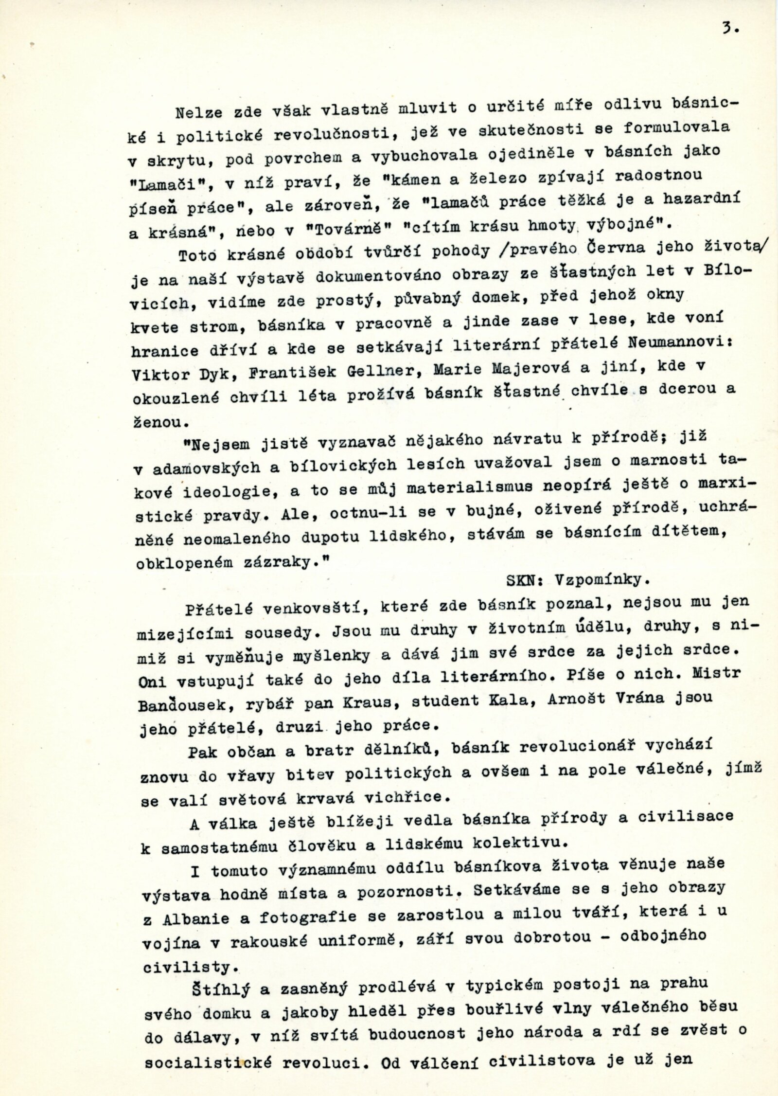 pozvánka, úvodní řeč (Dr. Václavkové), text z Muzea SKN v Bílovicích (básníkova činnost na Moravě v letech 1905–1917), zápis o přípravě výstavy, provozní korespondence