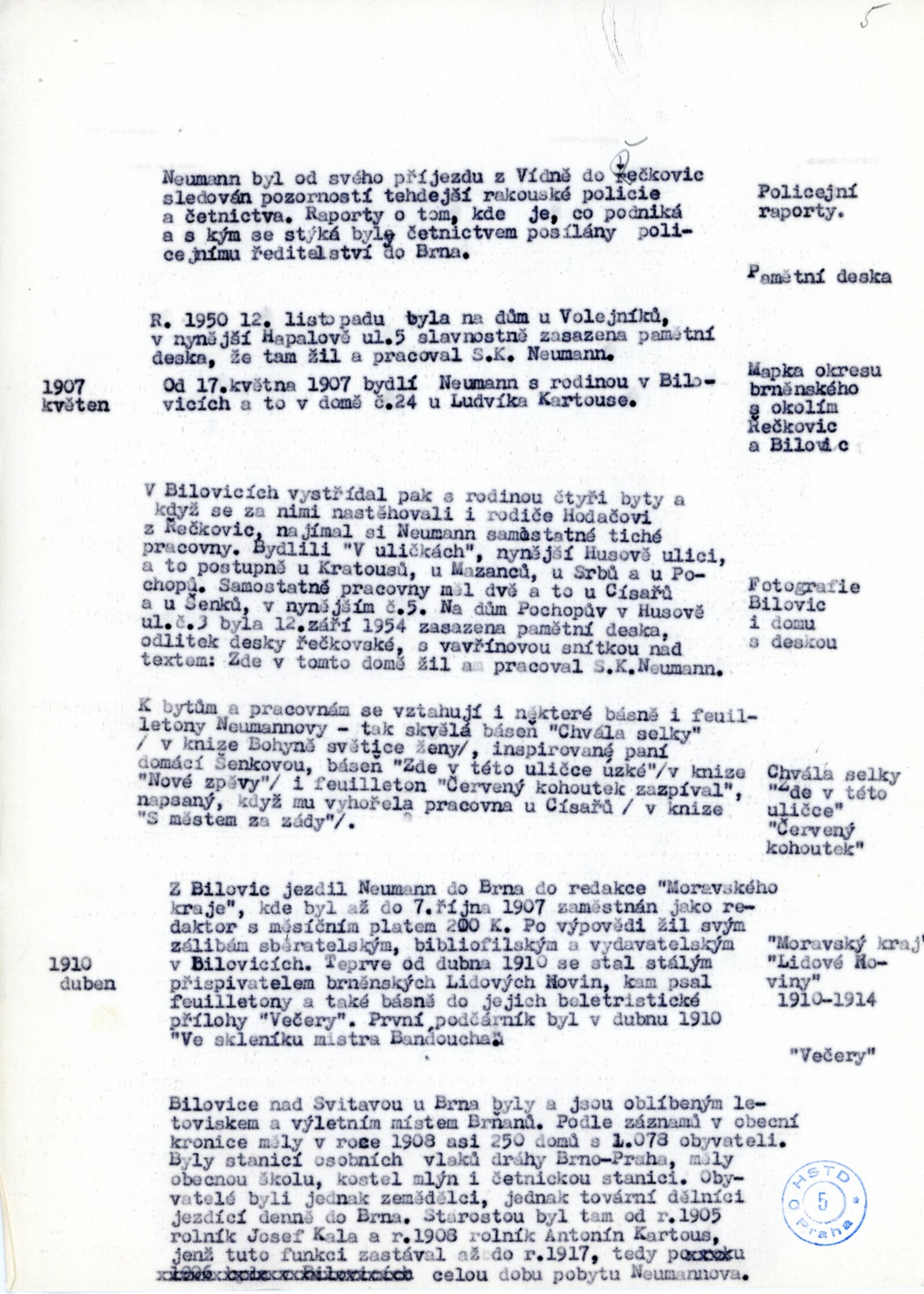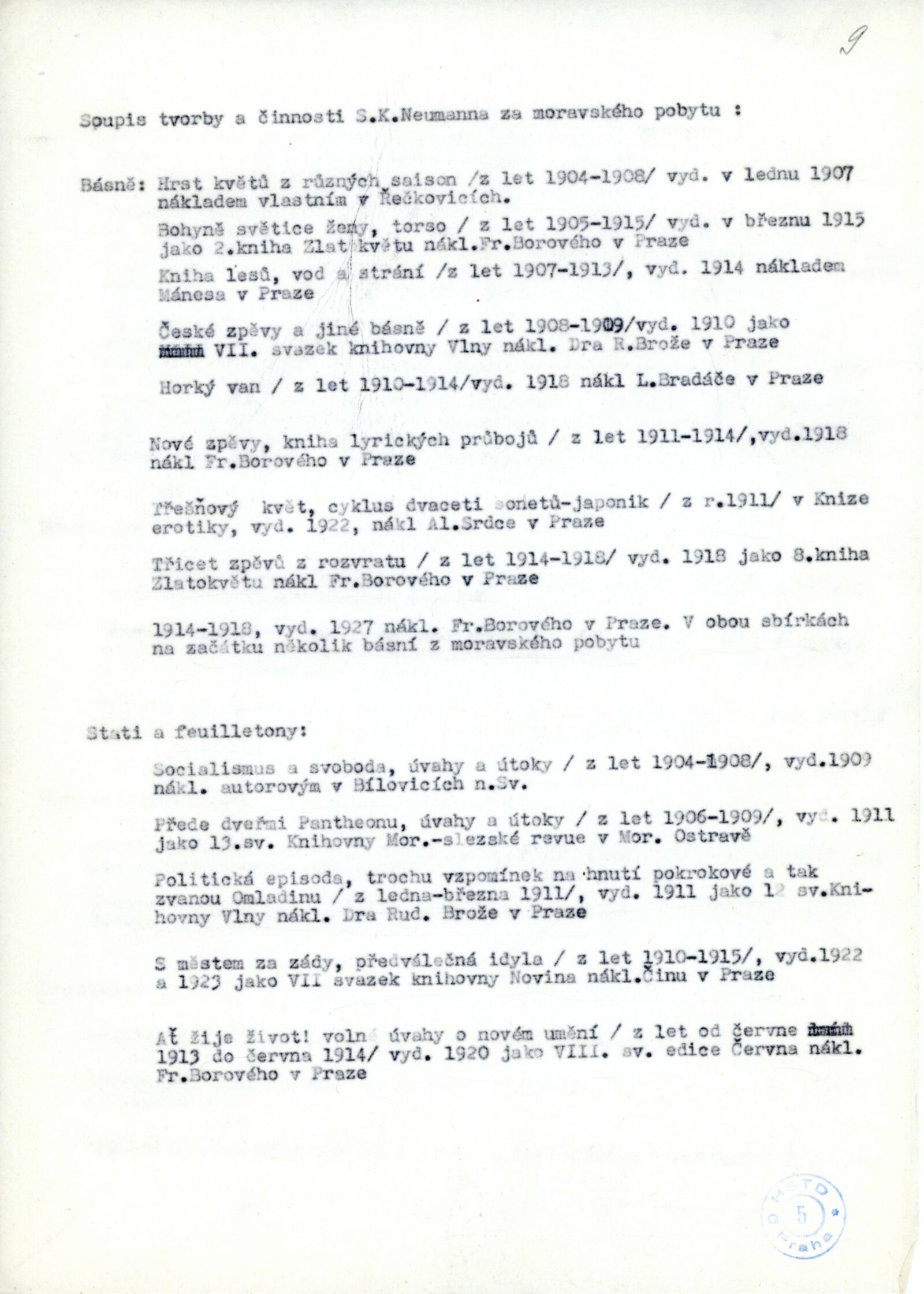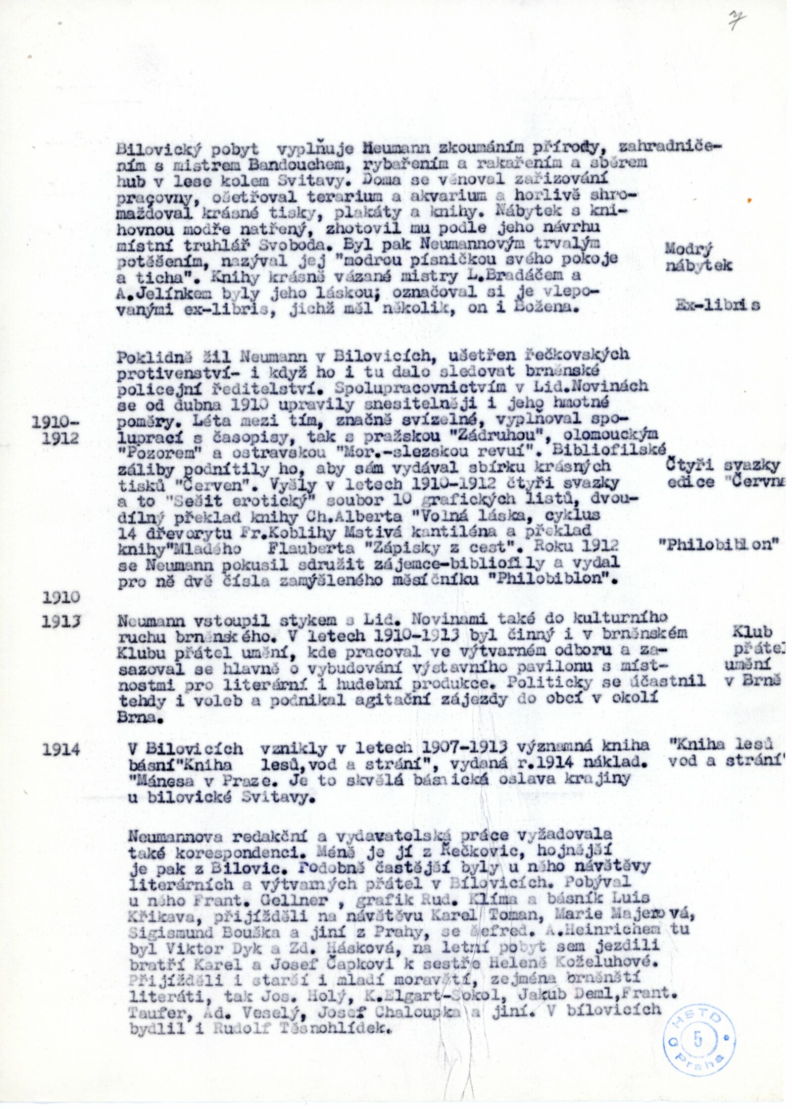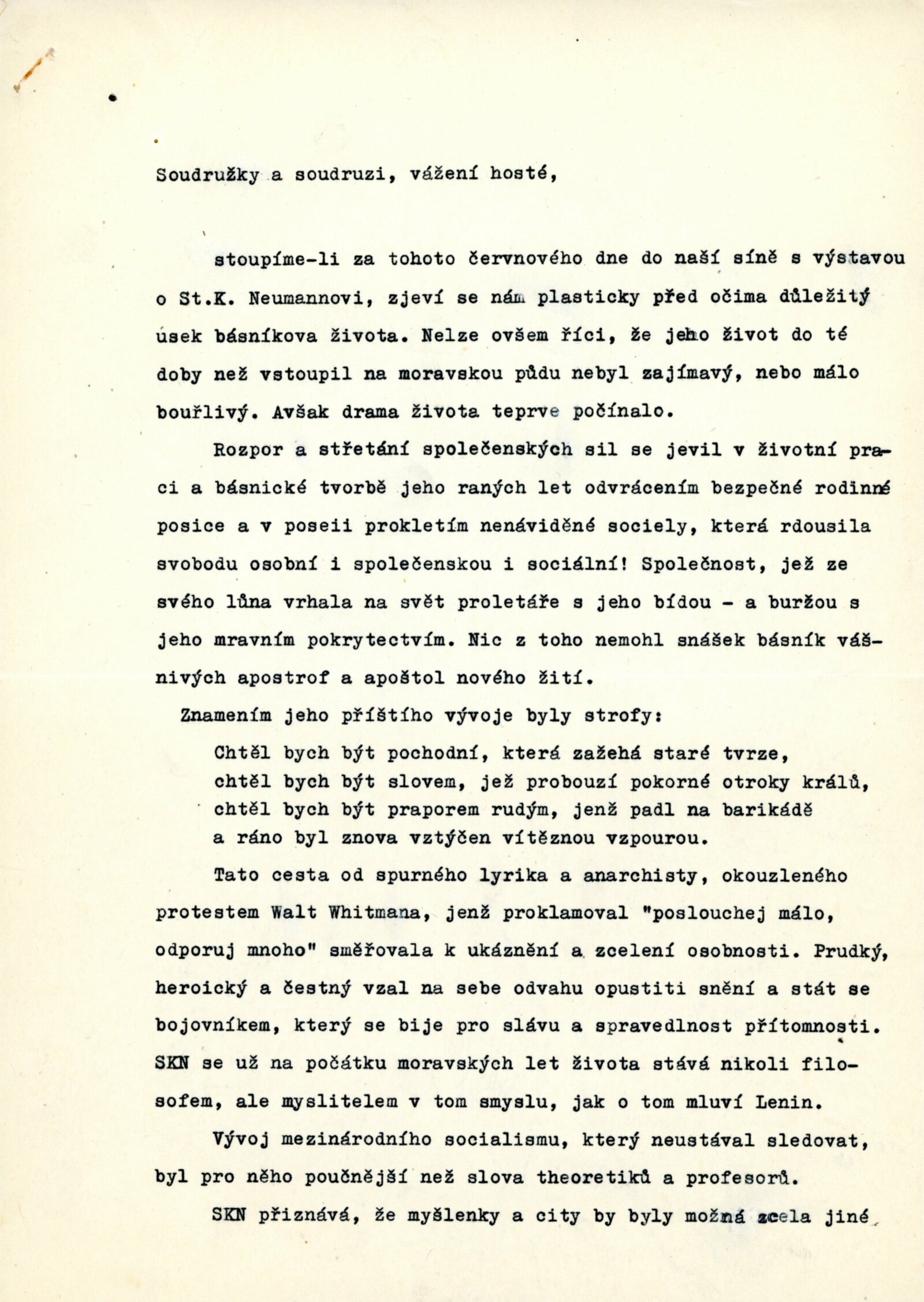 pozvánka, úvodní řeč (Dr. Václavkové), text z Muzea SKN v Bílovicích (básníkova činnost na Moravě v letech 1905–1917), zápis o přípravě výstavy, provozní korespondence
