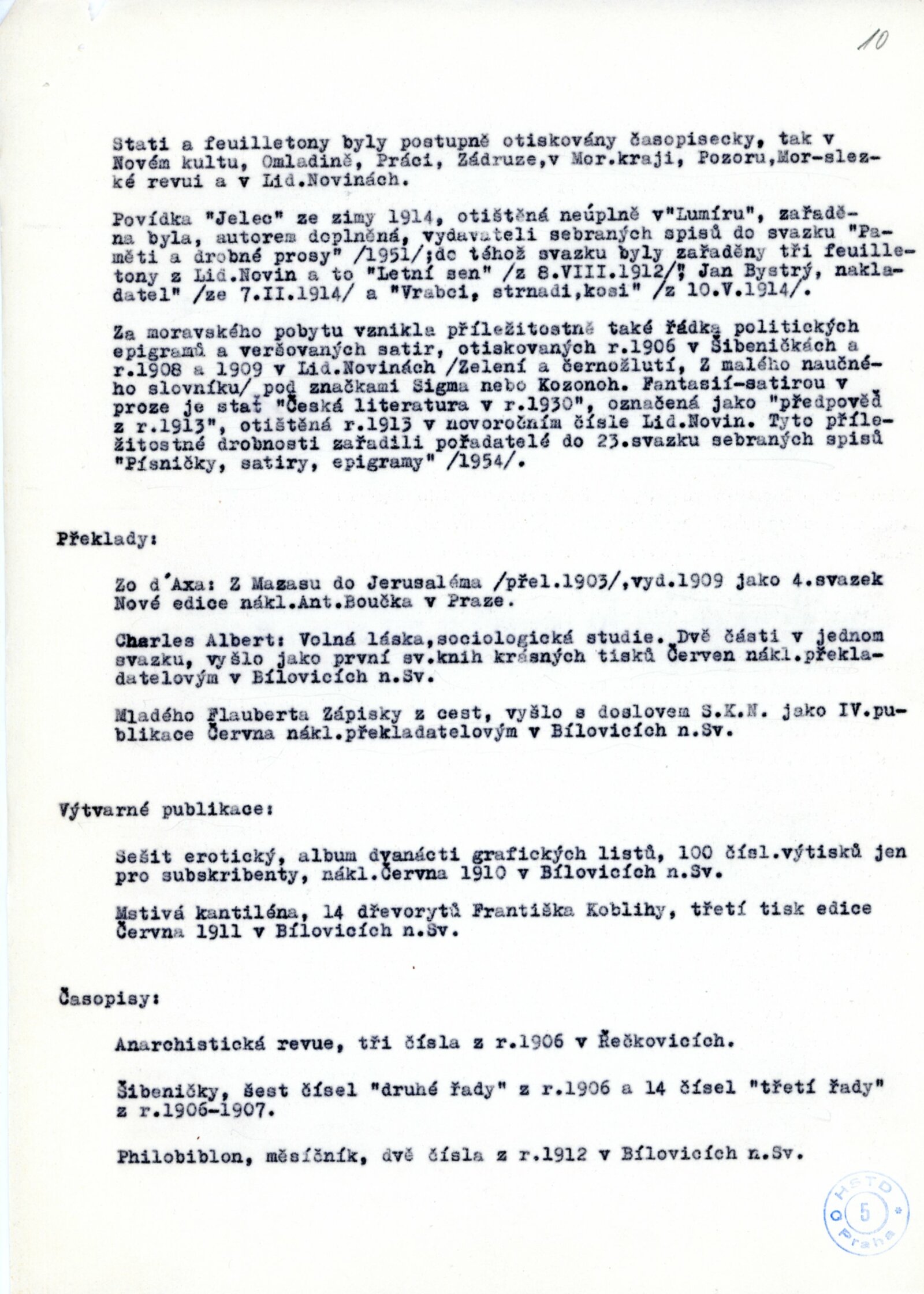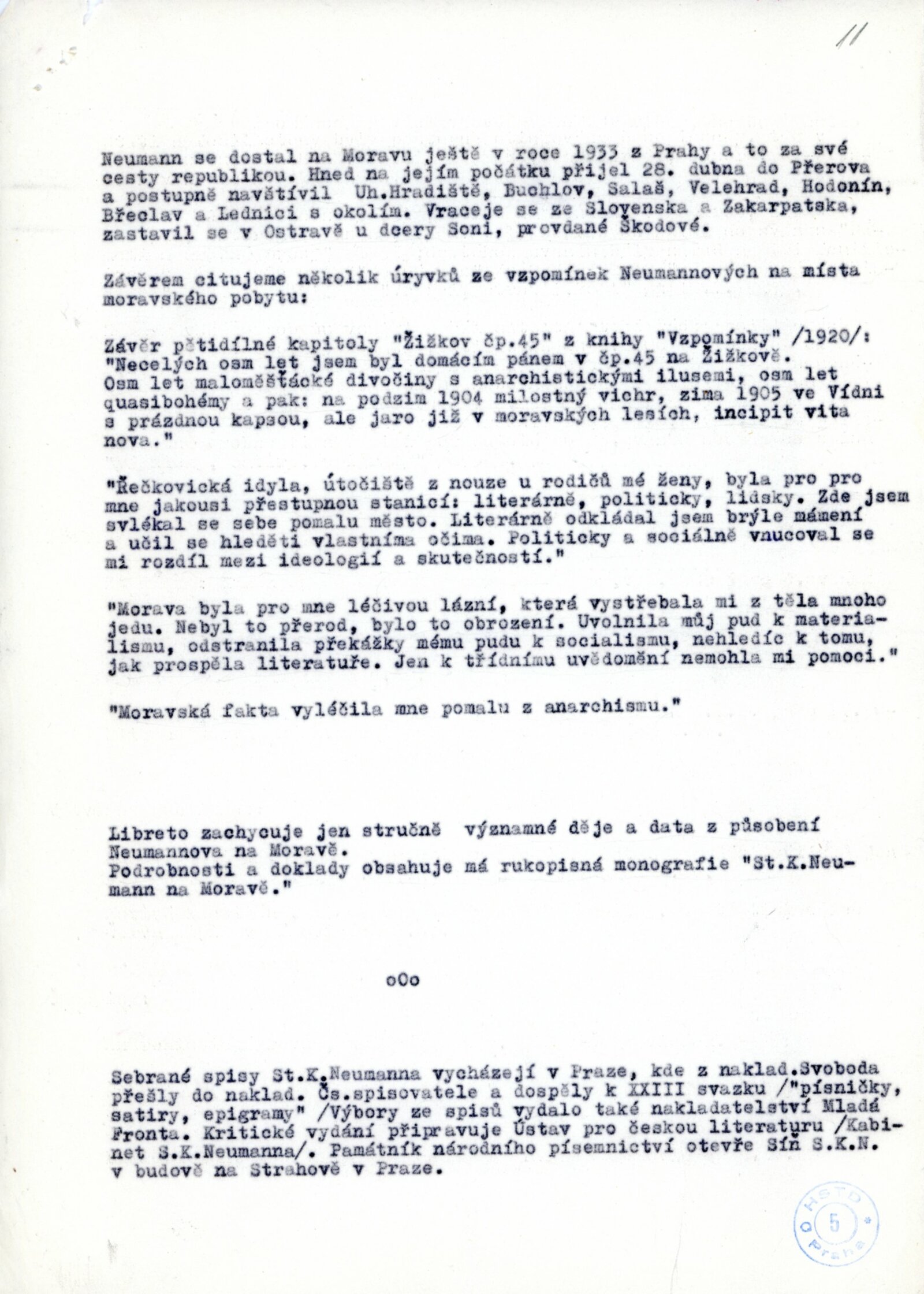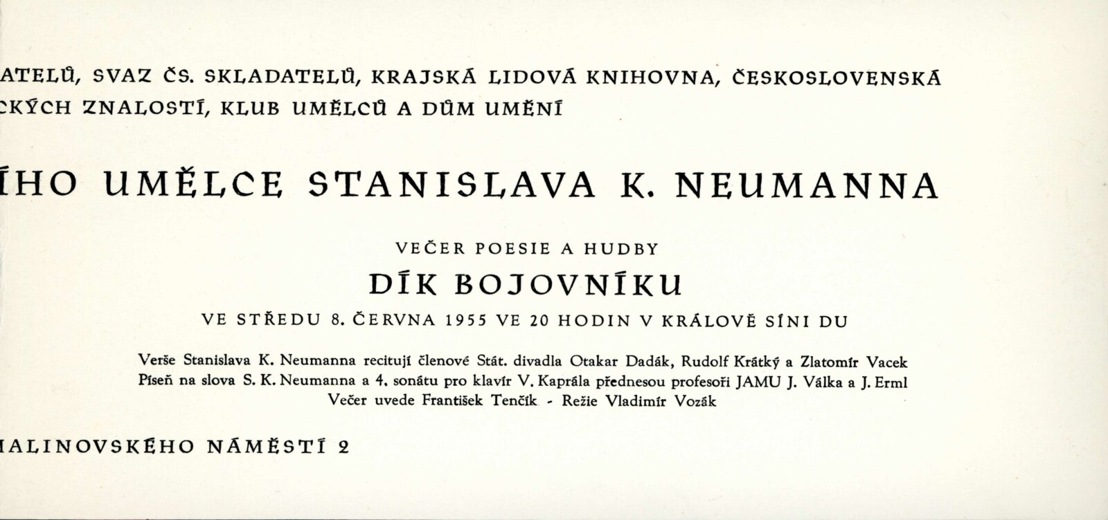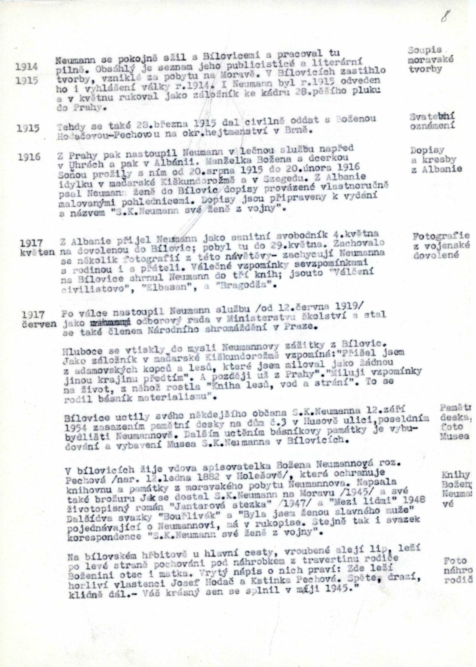 pozvánka, úvodní řeč (Dr. Václavkové), text z Muzea SKN v Bílovicích (básníkova činnost na Moravě v letech 1905–1917), zápis o přípravě výstavy, provozní korespondence