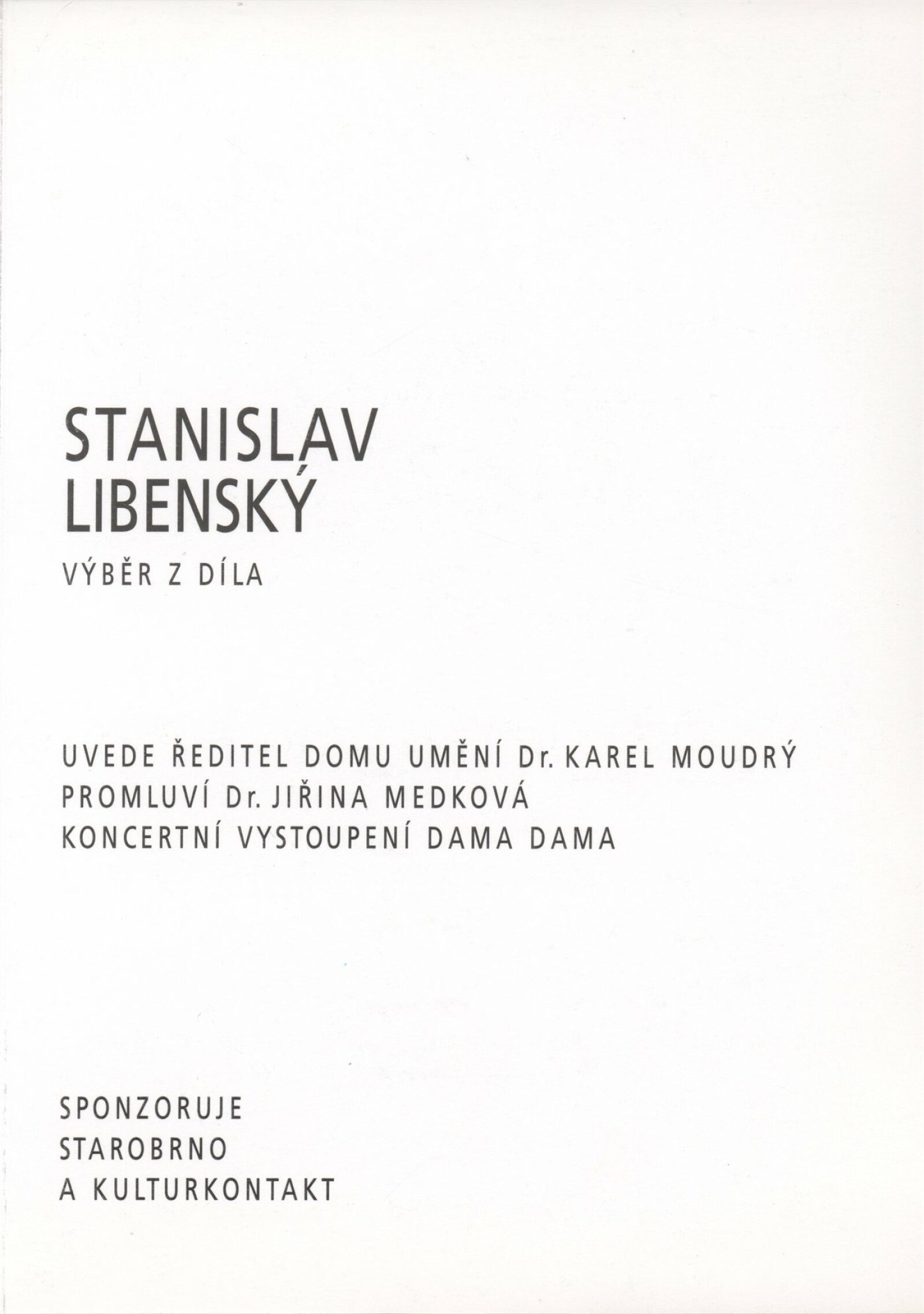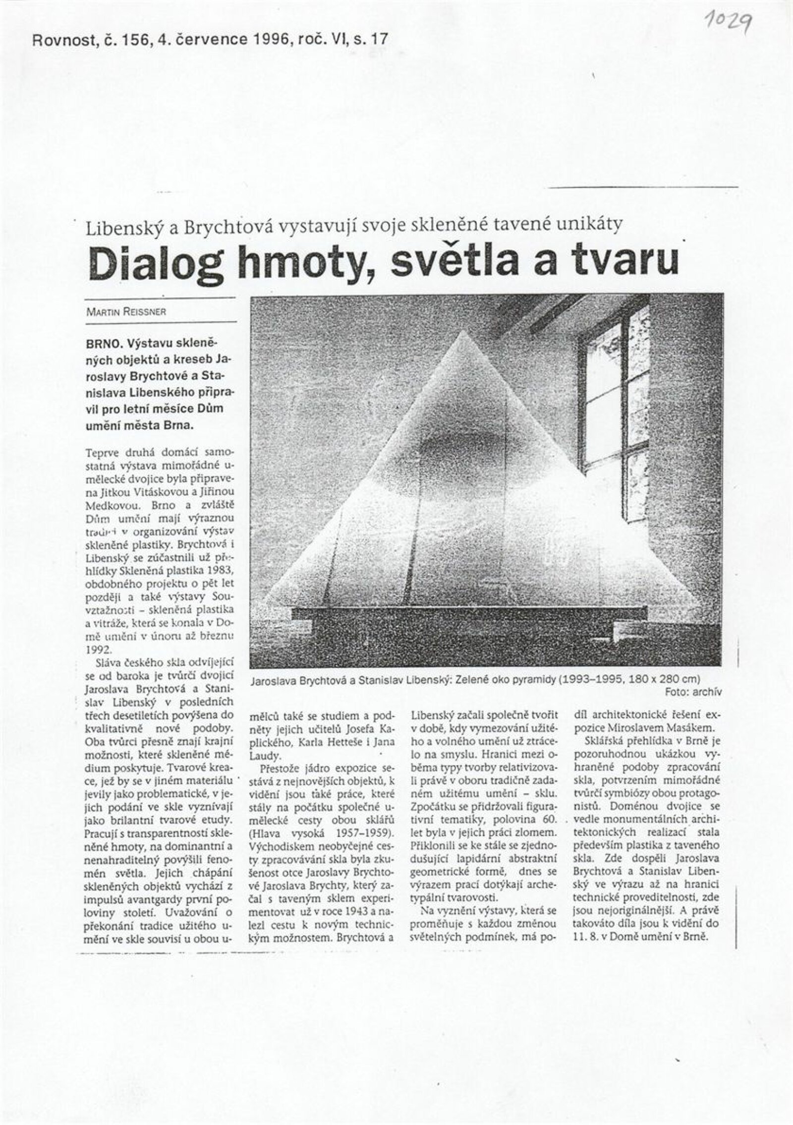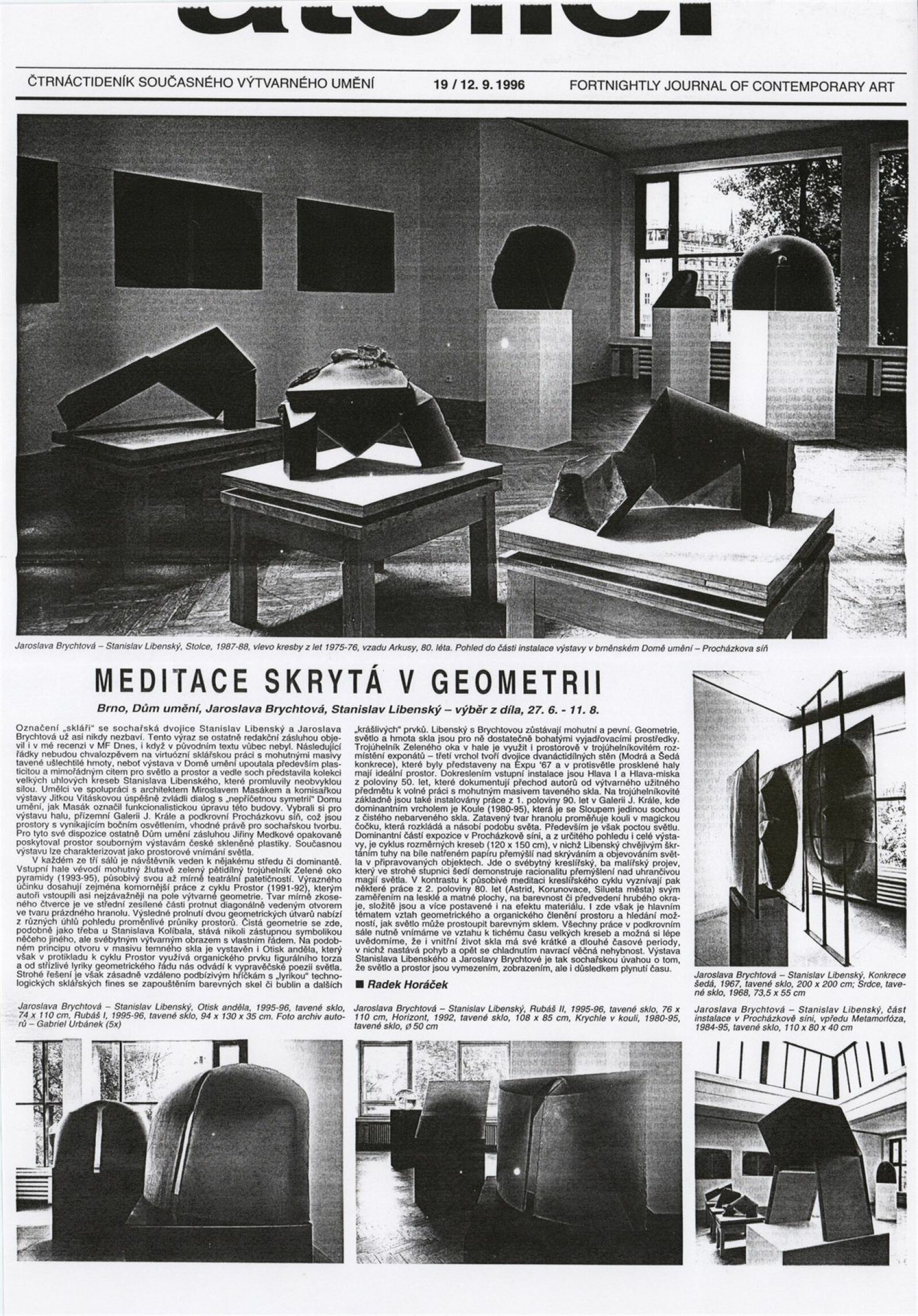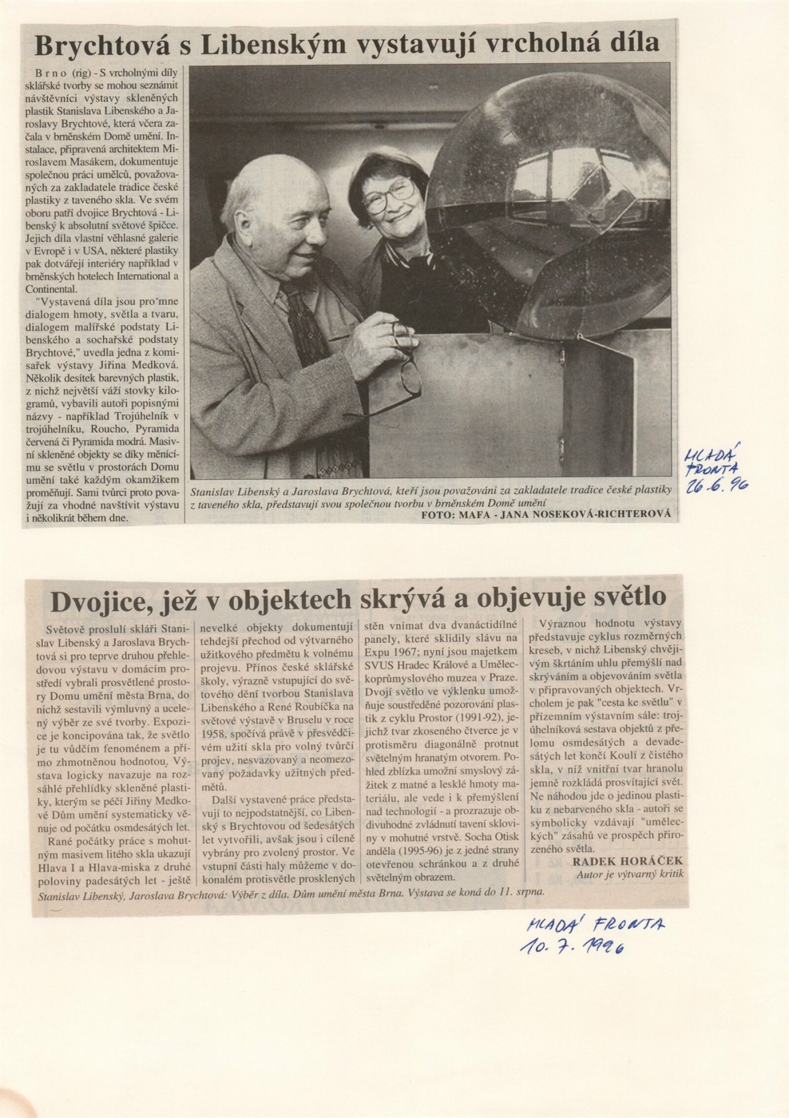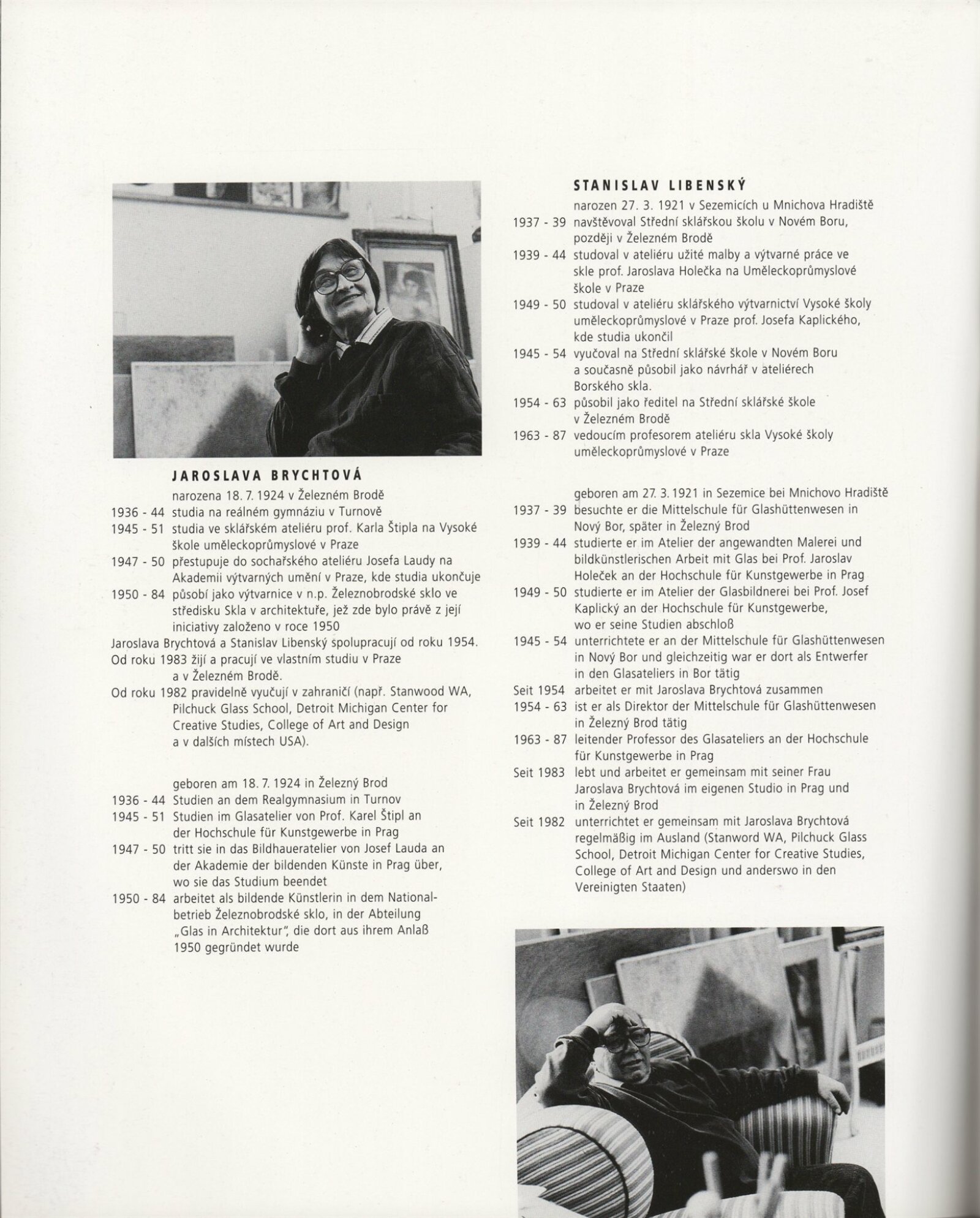Stanislav Libenský. Jaroslava Brychtová. Výběr z díla: Dům umění města Brna, 27. [spr. 25.] 6. – 11. 8. 1996 / Text: Jiří Šetlík. – Brno: DUmB, 1996. – [40] s., obr., portréty, ceny, realizace v architektuře, výstavy, DU 1029. – MZK; MG