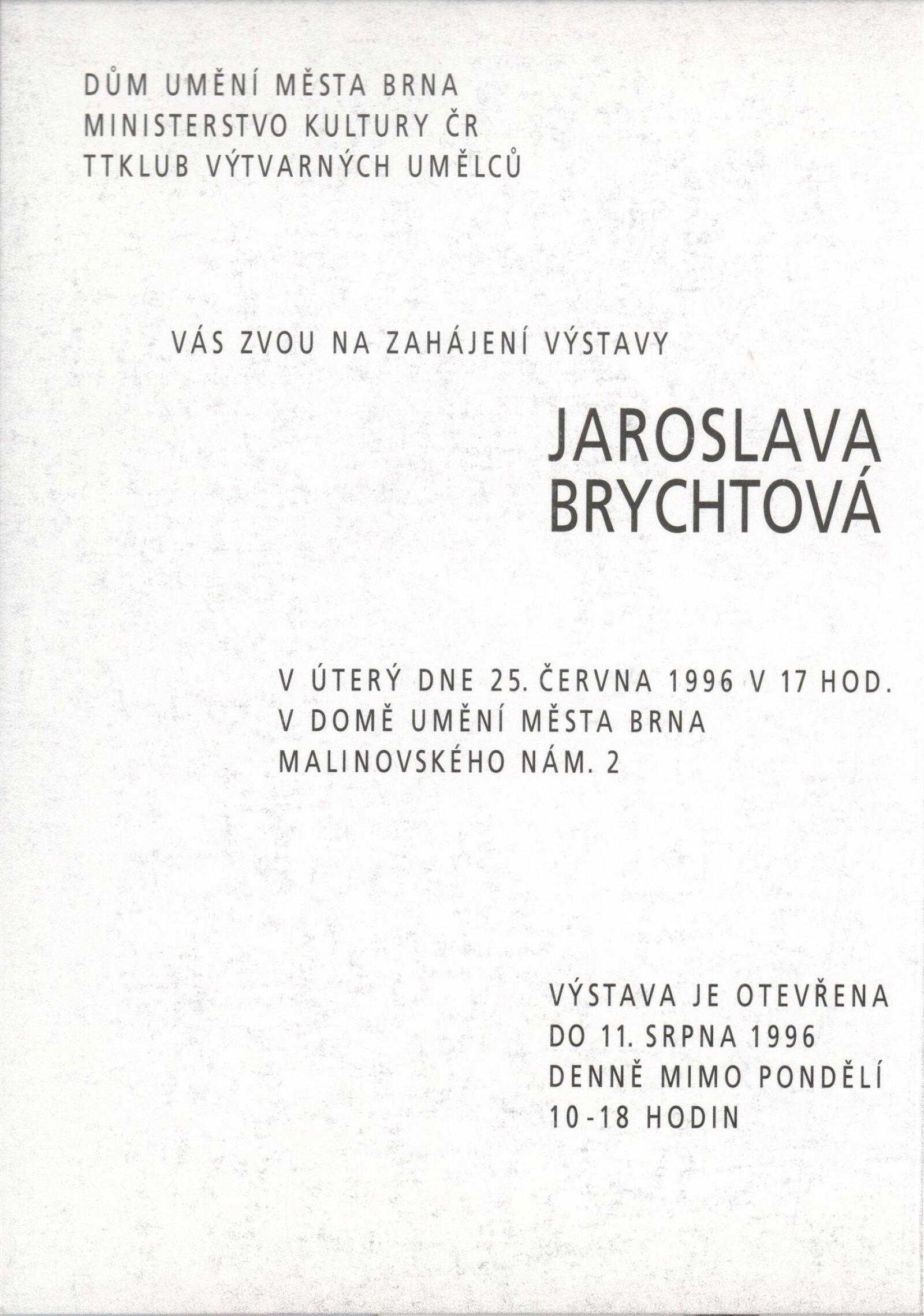 pozvánka, katalog, fotografie výstavy a vernisáže, seznam vystavených děl, materiály pro katalog a pozvánku, nátisky textů katalogu, smlouvy, faktury provozní korespondence, žádost o výstavu, poznámky, kresebné náčrtky vybraných děl, plán instalace výstavy, recenze v tisku, katalog Jaroslava Brychtová, digitalizovaný videozáznam z výstavy (VHS)