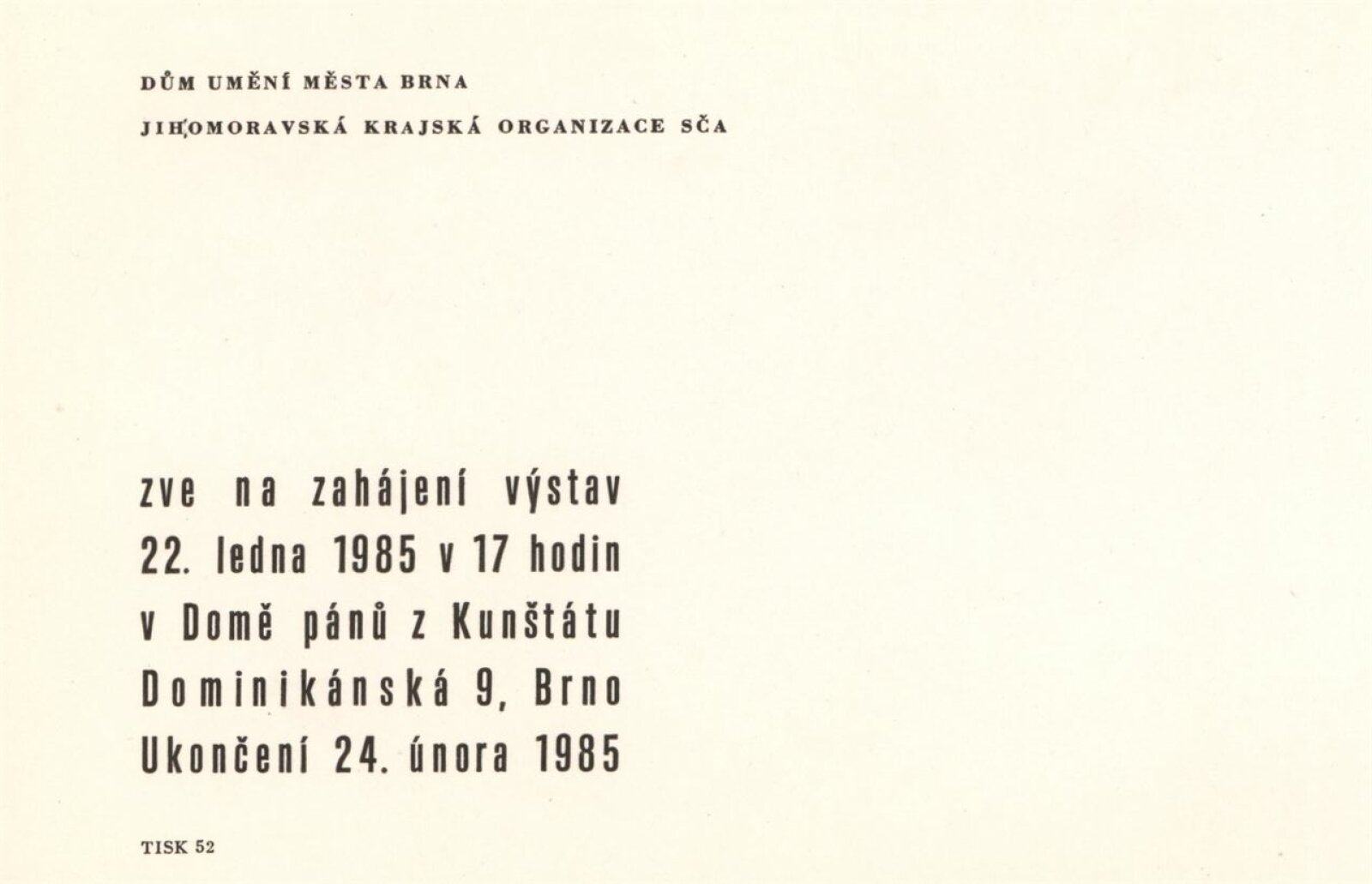 Stanislav Tůma. Fotografie 1980–1985: Dům umění / Dům pánů z Kunštátu, Kabinet fotografie Jaromíra Funka, 22. 1. – 24. 2. 1985 / Text: Antonín Dufek. – Brno: DUmB, 1985. – 9 s., obr., životní data, zastoupení ve sbírkách, výstavy, DPK 835. – MZK; MG; MMB