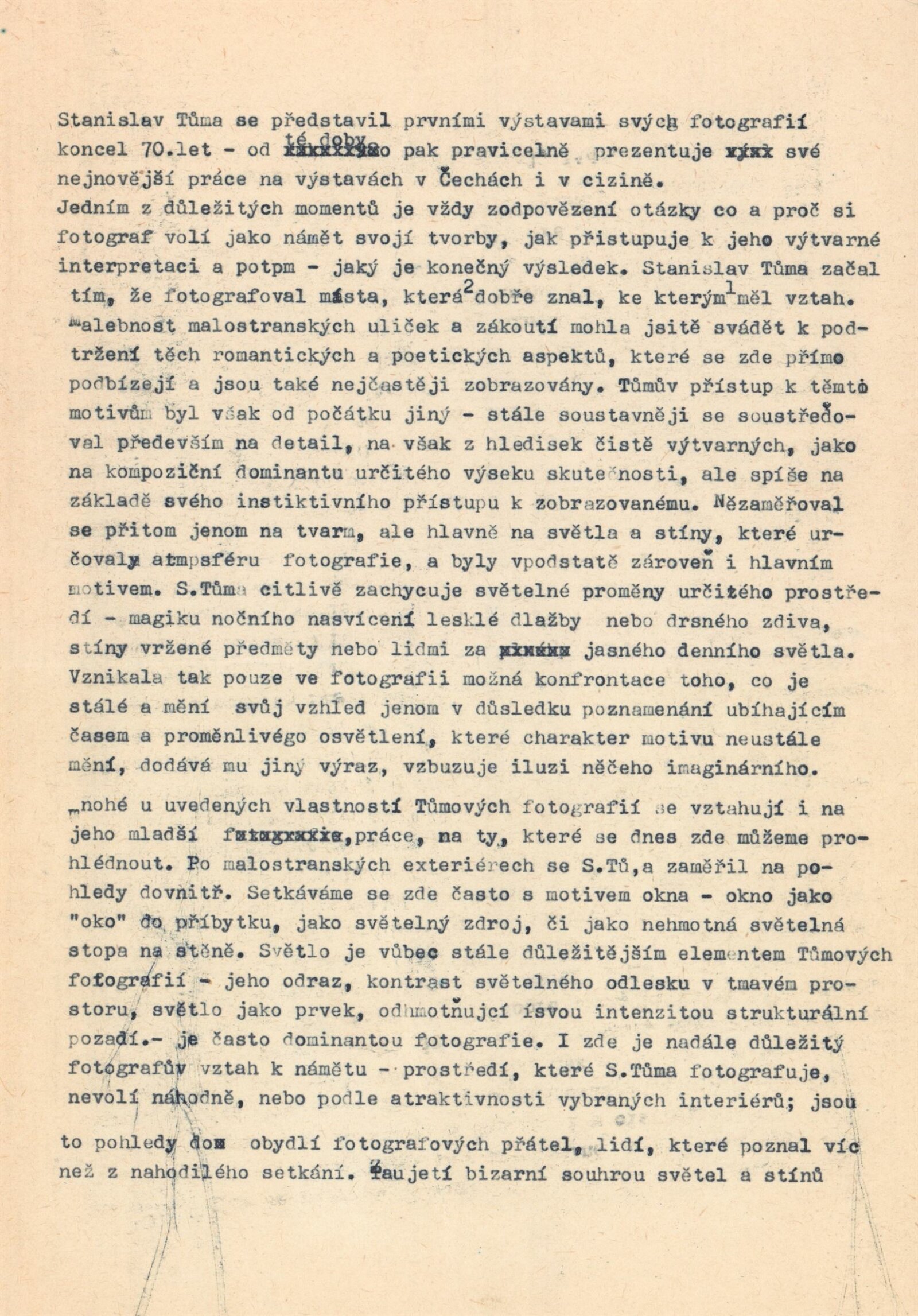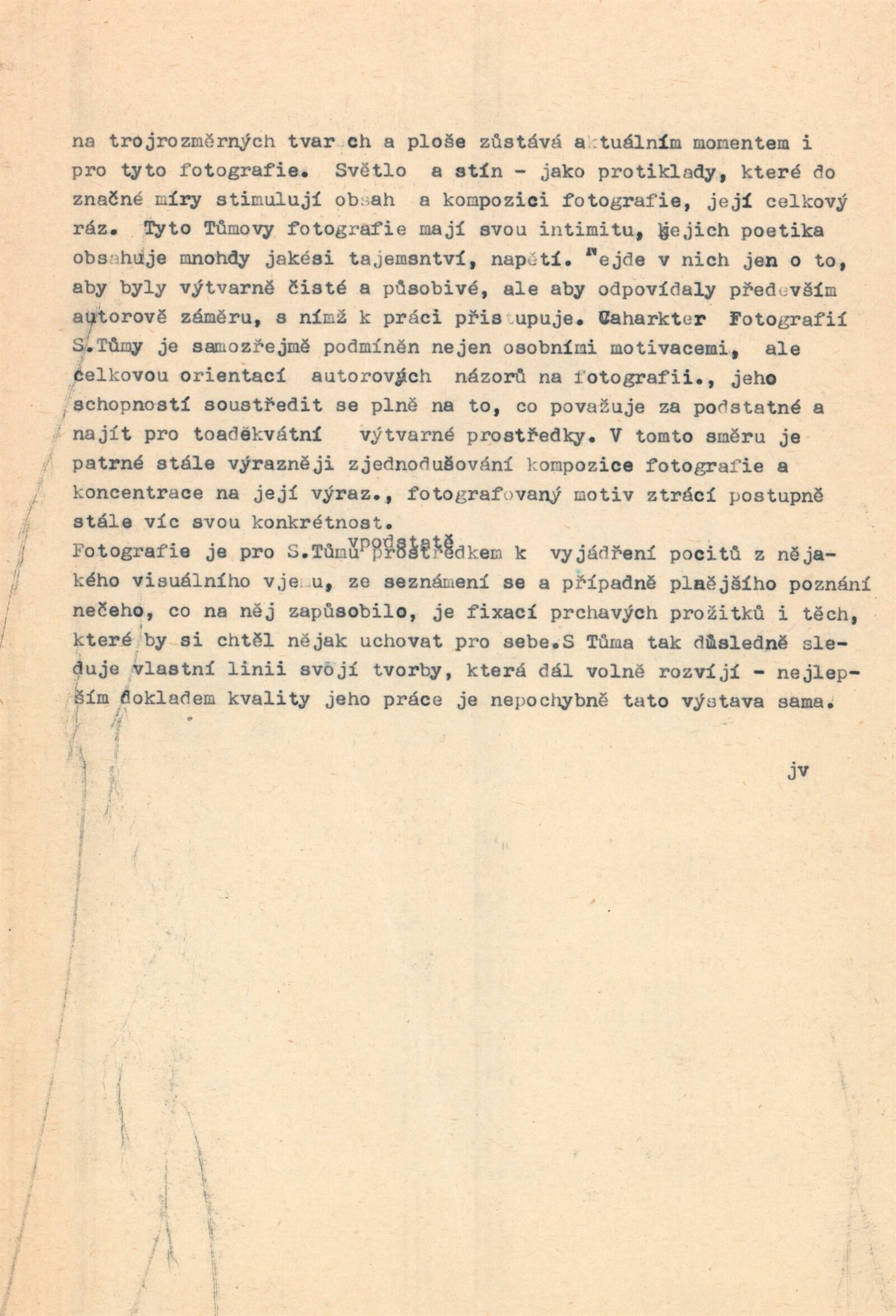 pozvánka, podklady pro katalog (texty zaslané Stanislavem Tůmou a tiráž), úvodní slovo Jany Vránové, žádost o povolení výstavy, fotografie vystavených fotografií, provozní korespondence (ohledně tisku katalogů, korespondence mezi J. Vránovou a autorem), recenze v tisku
