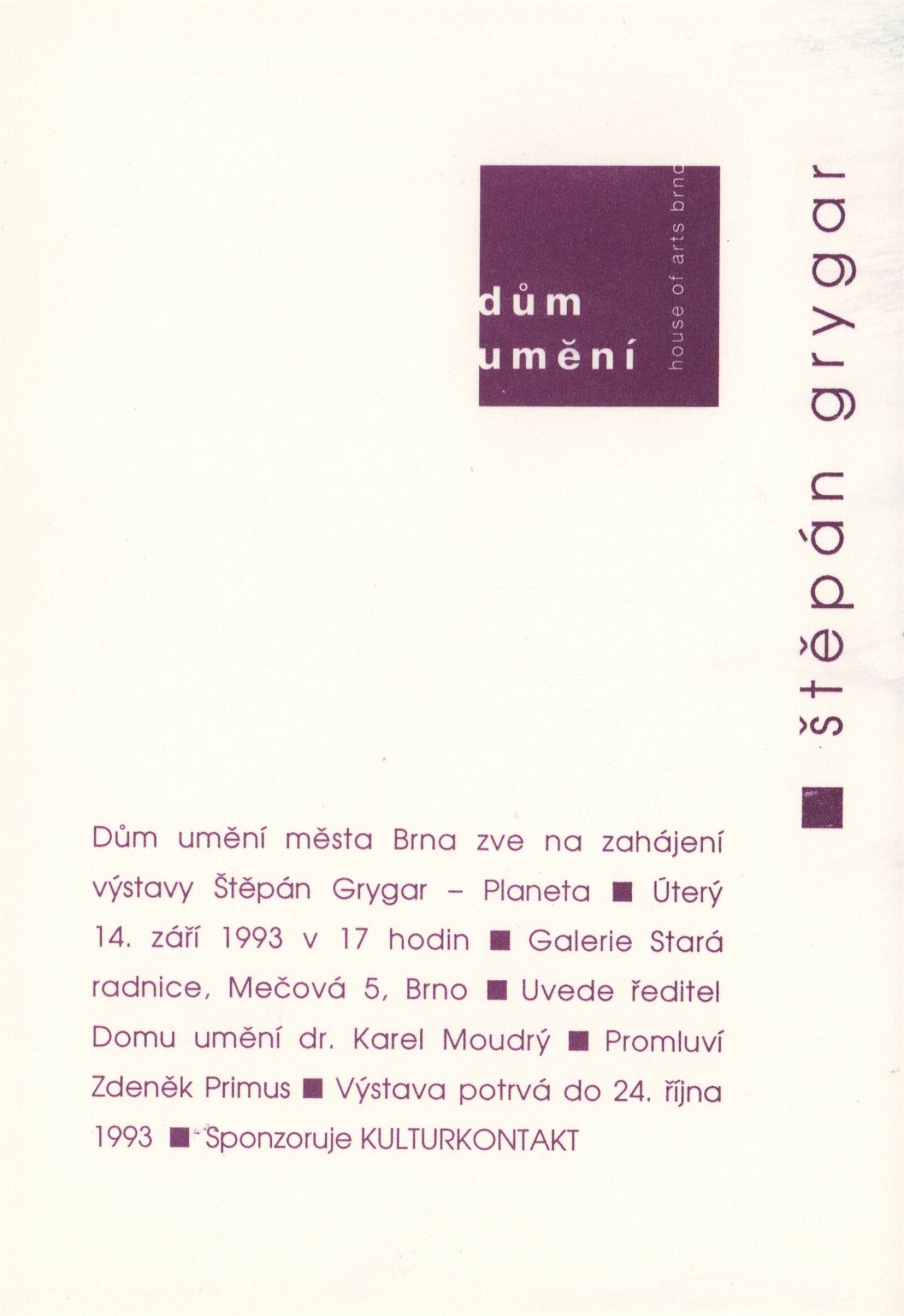 Štěpán Grygar. Planeta. 19 fotografií: Galerie Stará radnice 14. 9. – 24. 10. 1993. Současně vyšel tisk Planeta. 19 fotografií Štěpána Grygara z roku 1991 / Text Zdenek Primus. - Praha: Umbrella Editions, - [8] s., [20] l. obr. jako skládačka GSR 147