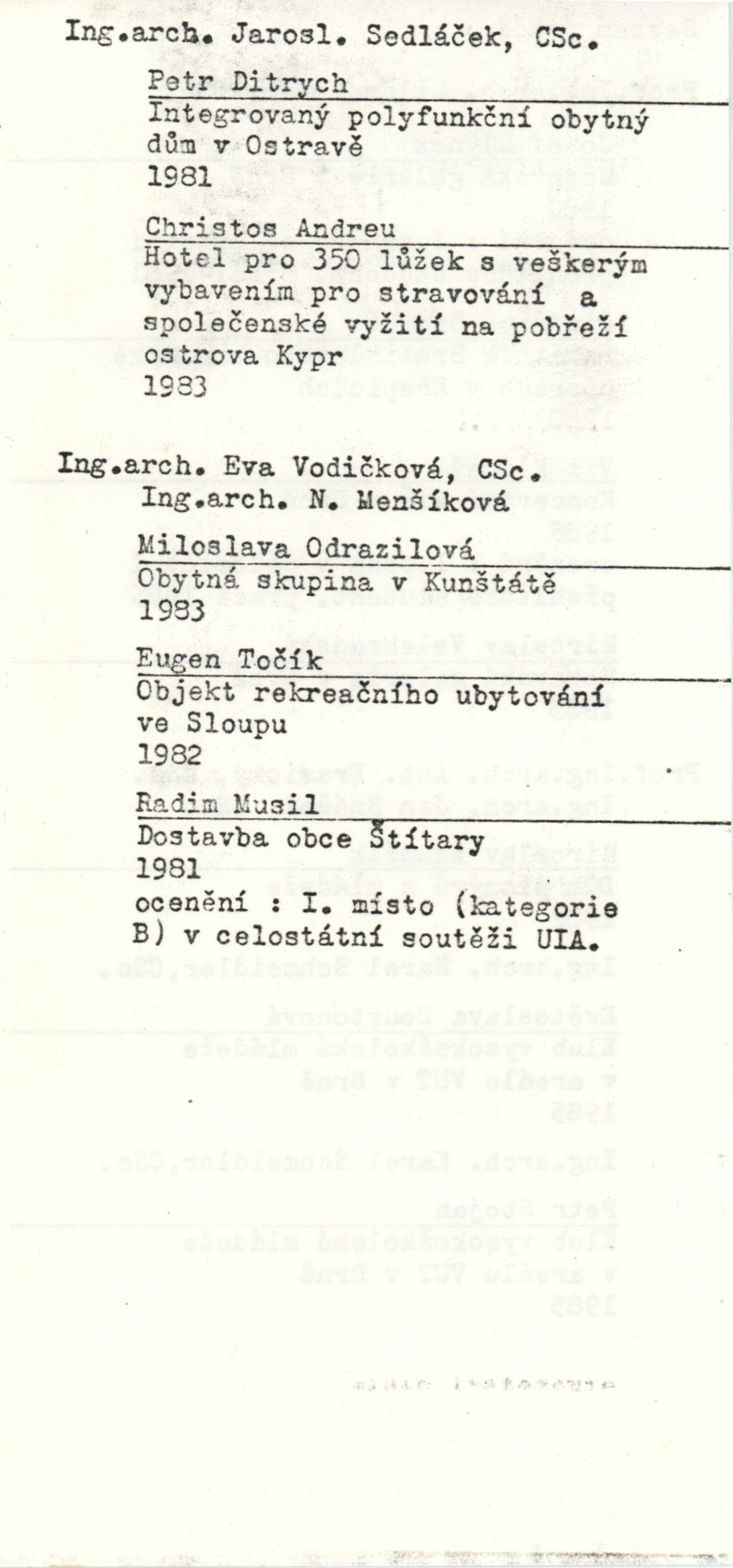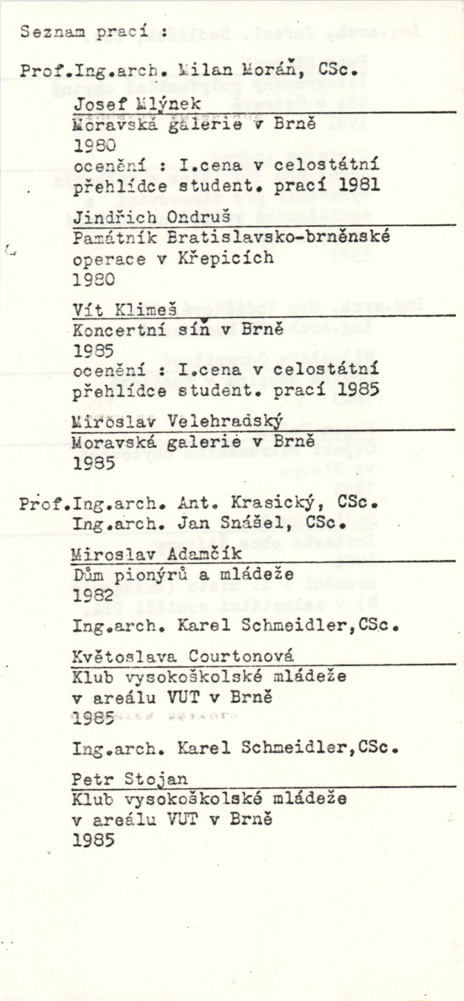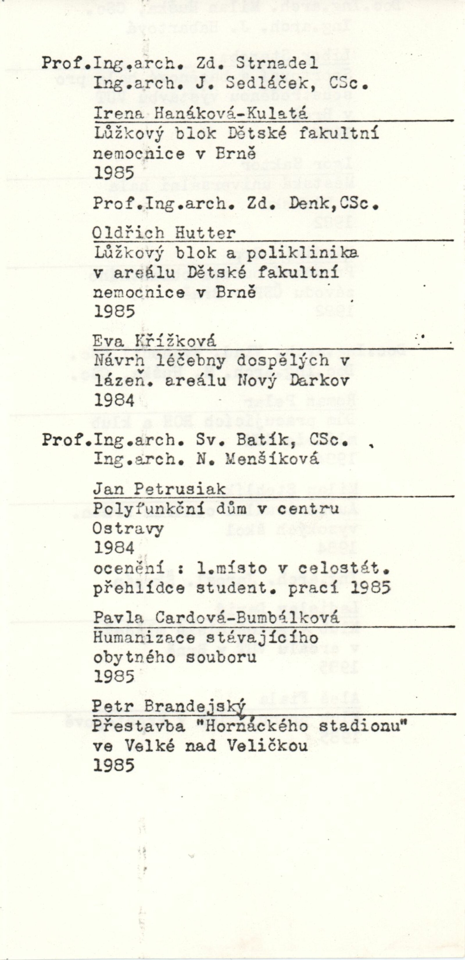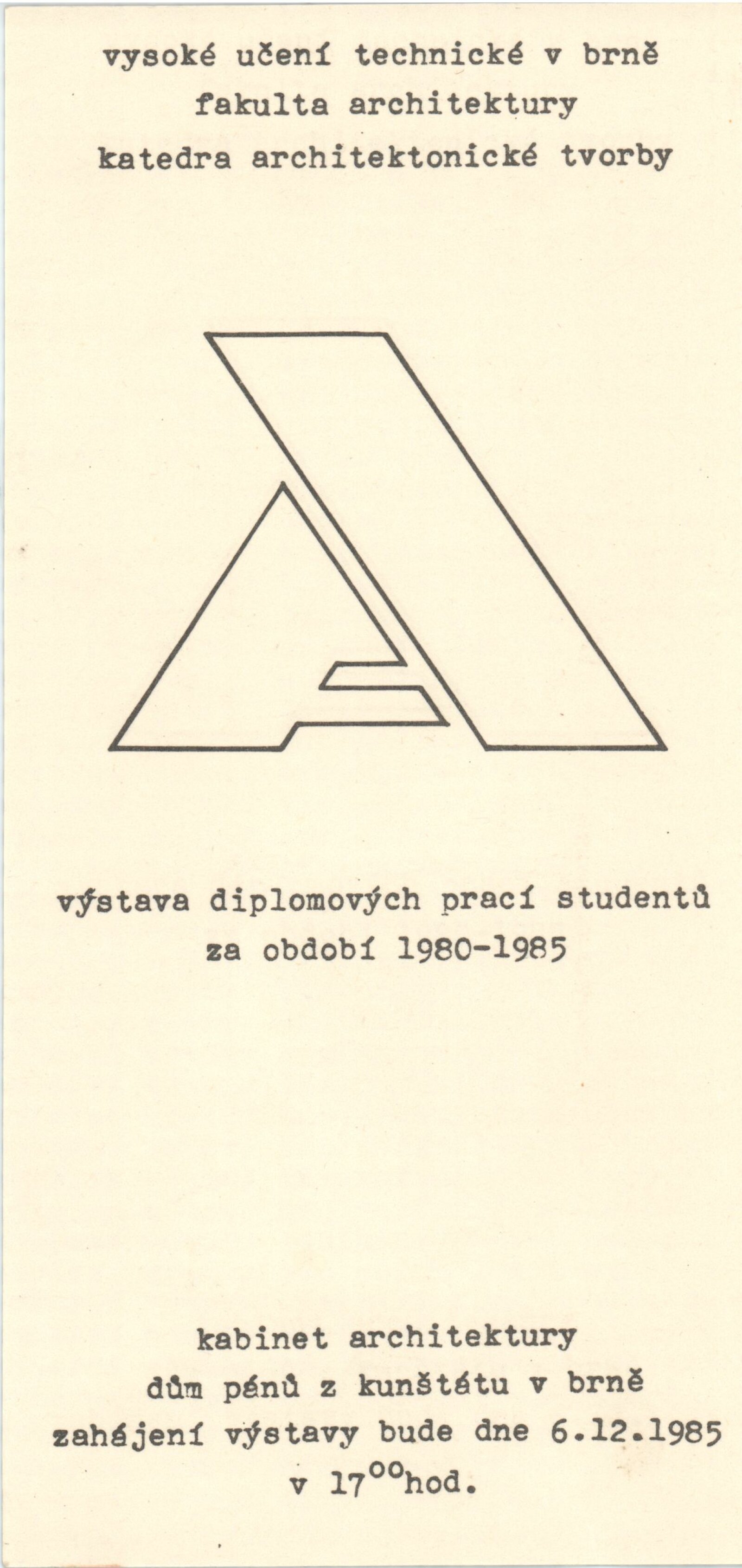 Výstava diplomových prací studentů katedry architektonické tvorby fakulty architektury Vysokého učení technického v Brně za období 1980–1985: Dům umění / Dům pánů z Kunštátu, 161. výstava Kabinetu architektury, 6. 12. 1985 – 12. 1. 1986 / Brno: FA VUT, 1985. – skládačka 6 s. v obalu, DPK 859