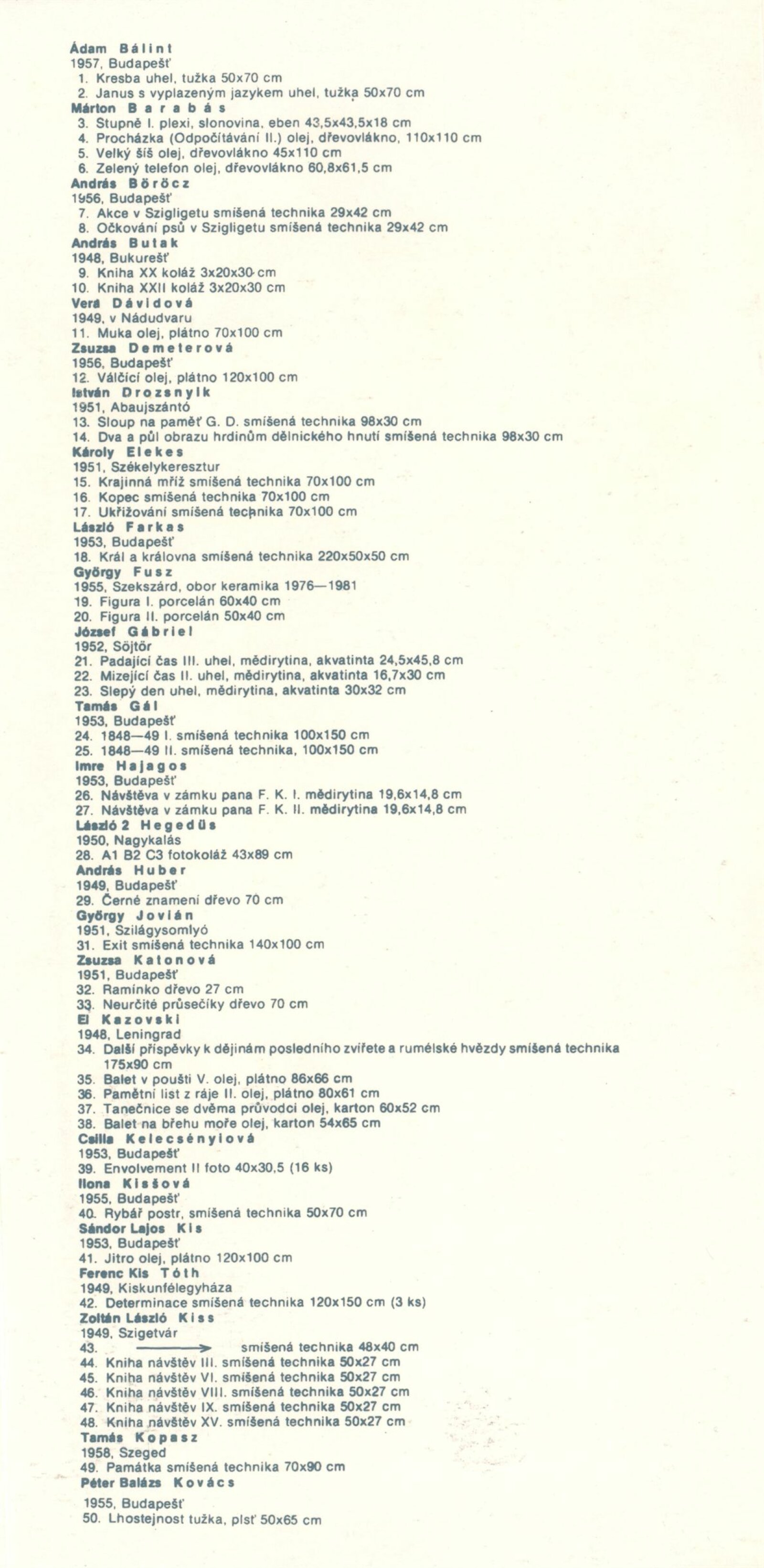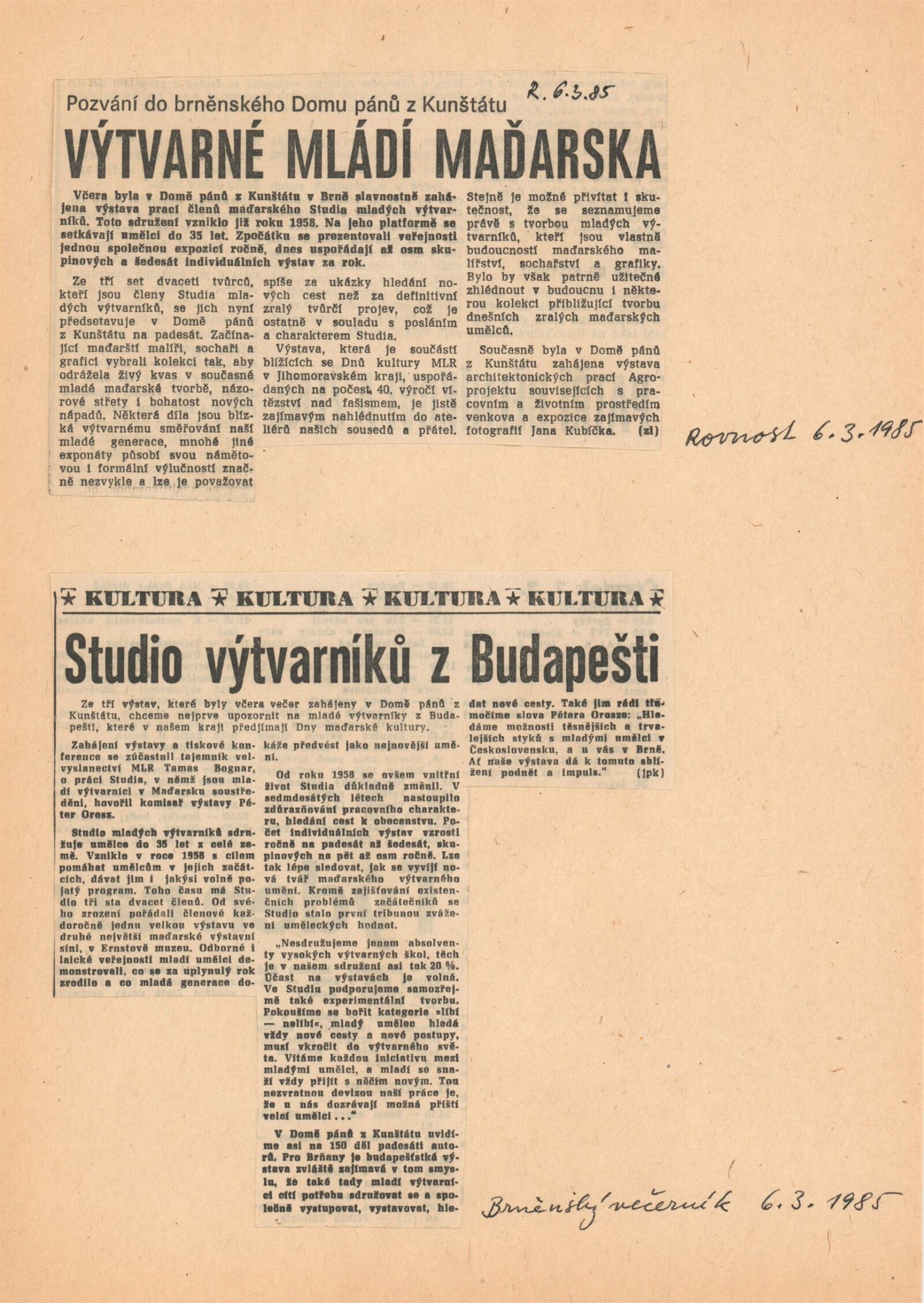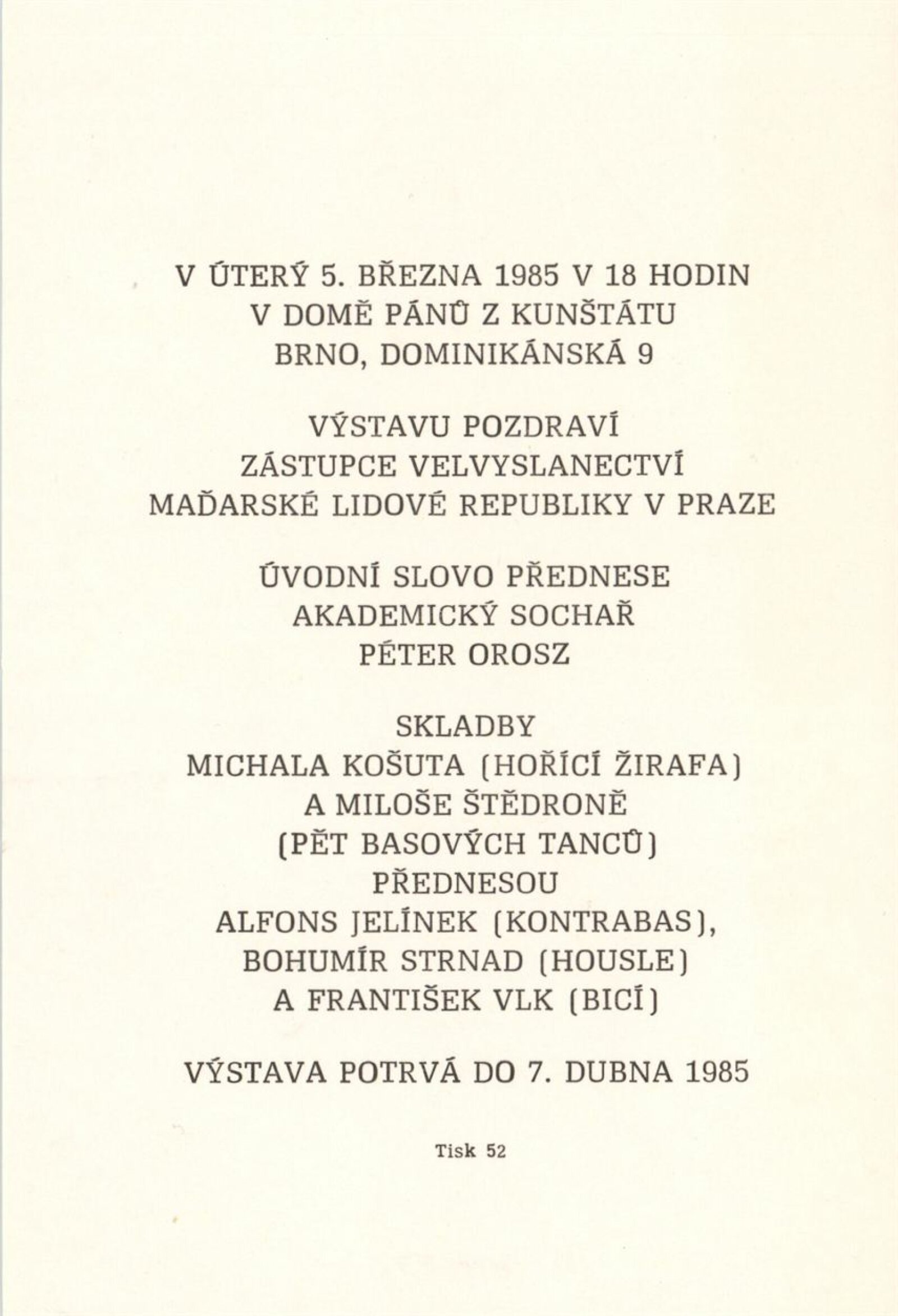 Výstava studia mladých umělců Budapešť: Dům kultury města Brna: Dům umění / Dům pánů z Kunštátu, Kabinet grafiky, březen–duben / Na vložce opraveno. Dům umění města Brna / Dům pánů z Kunštátu, 5. 3. – 7. 4. 1985 / Text: Bálint Chikán. – Budapešť, b. n. – 12 s., obr., v obálce s textem a seznamem exponátů, DPK 840. – MG