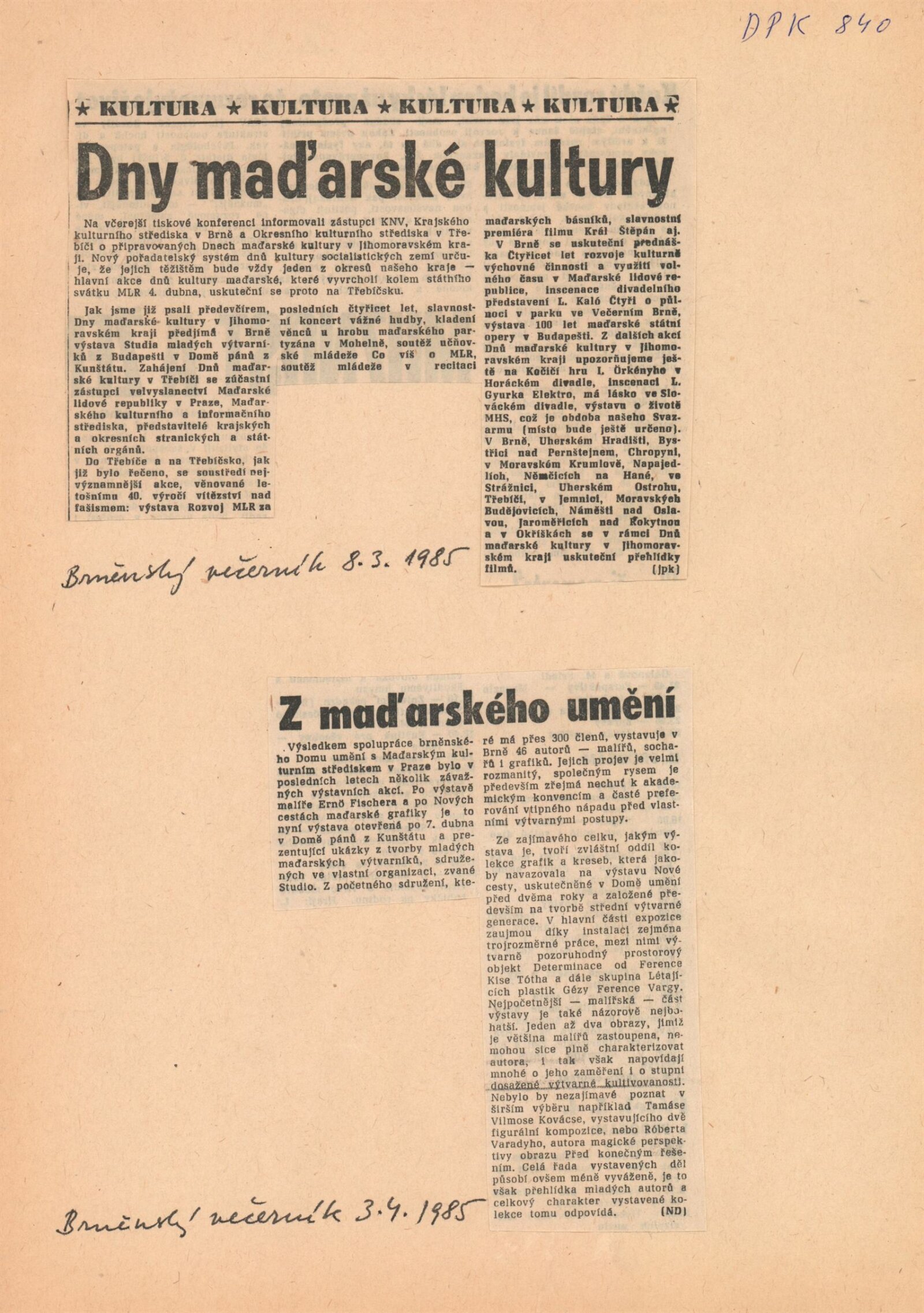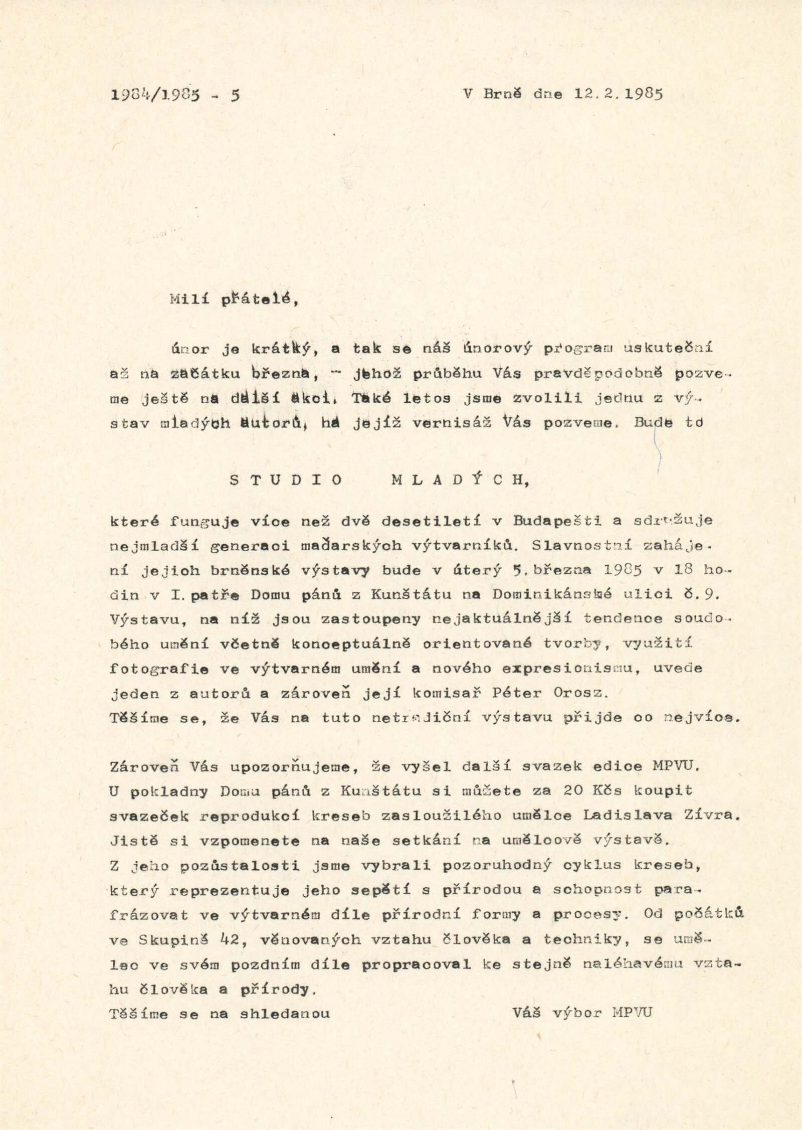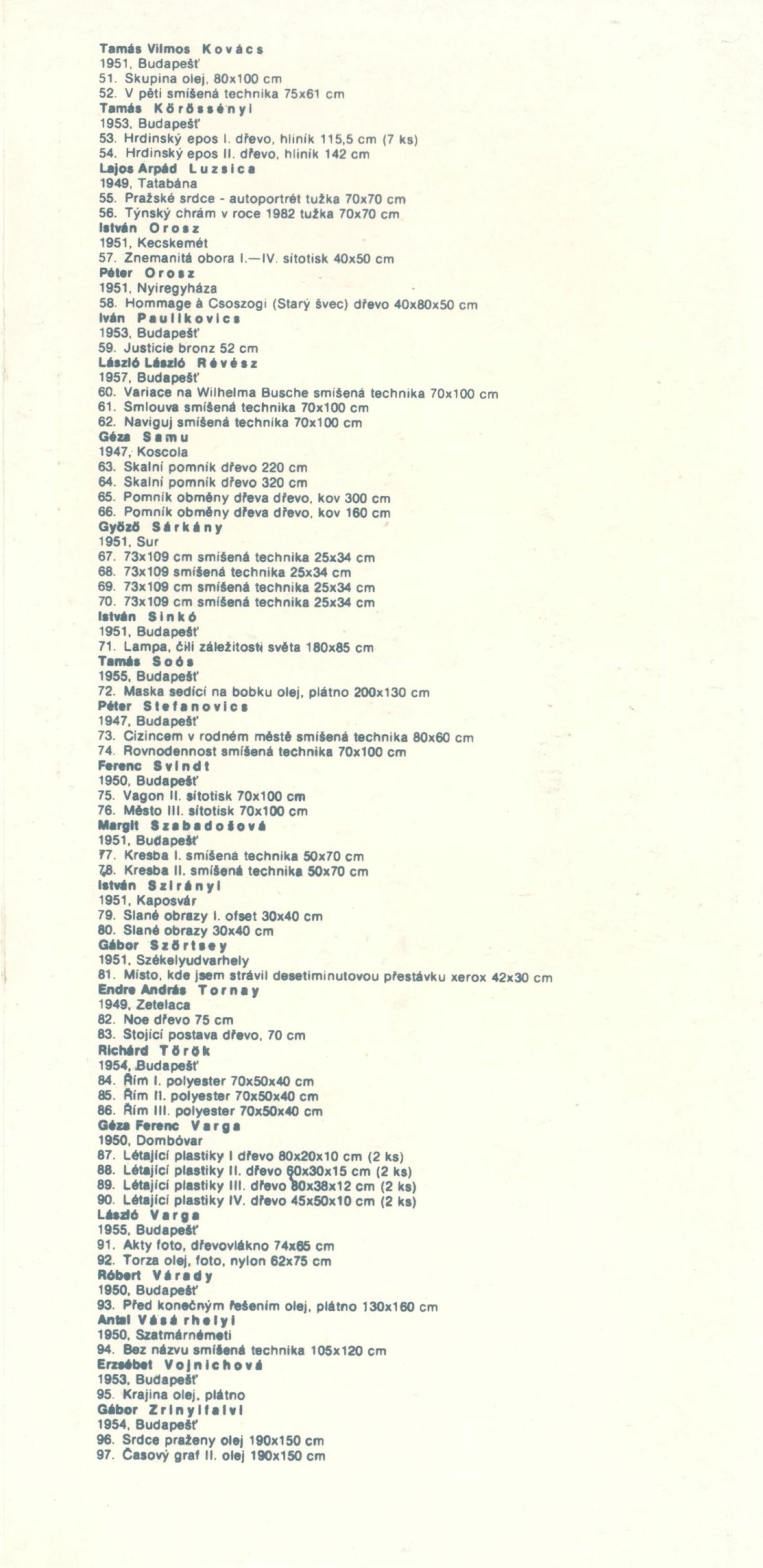 Výstava studia mladých umělců Budapešť: Dům kultury města Brna: Dům umění / Dům pánů z Kunštátu, Kabinet grafiky, březen–duben / Na vložce opraveno. Dům umění města Brna / Dům pánů z Kunštátu, 5. 3. – 7. 4. 1985 / Text: Bálint Chikán. – Budapešť, b. n. – 12 s., obr., v obálce s textem a seznamem exponátů, DPK 840. – MG