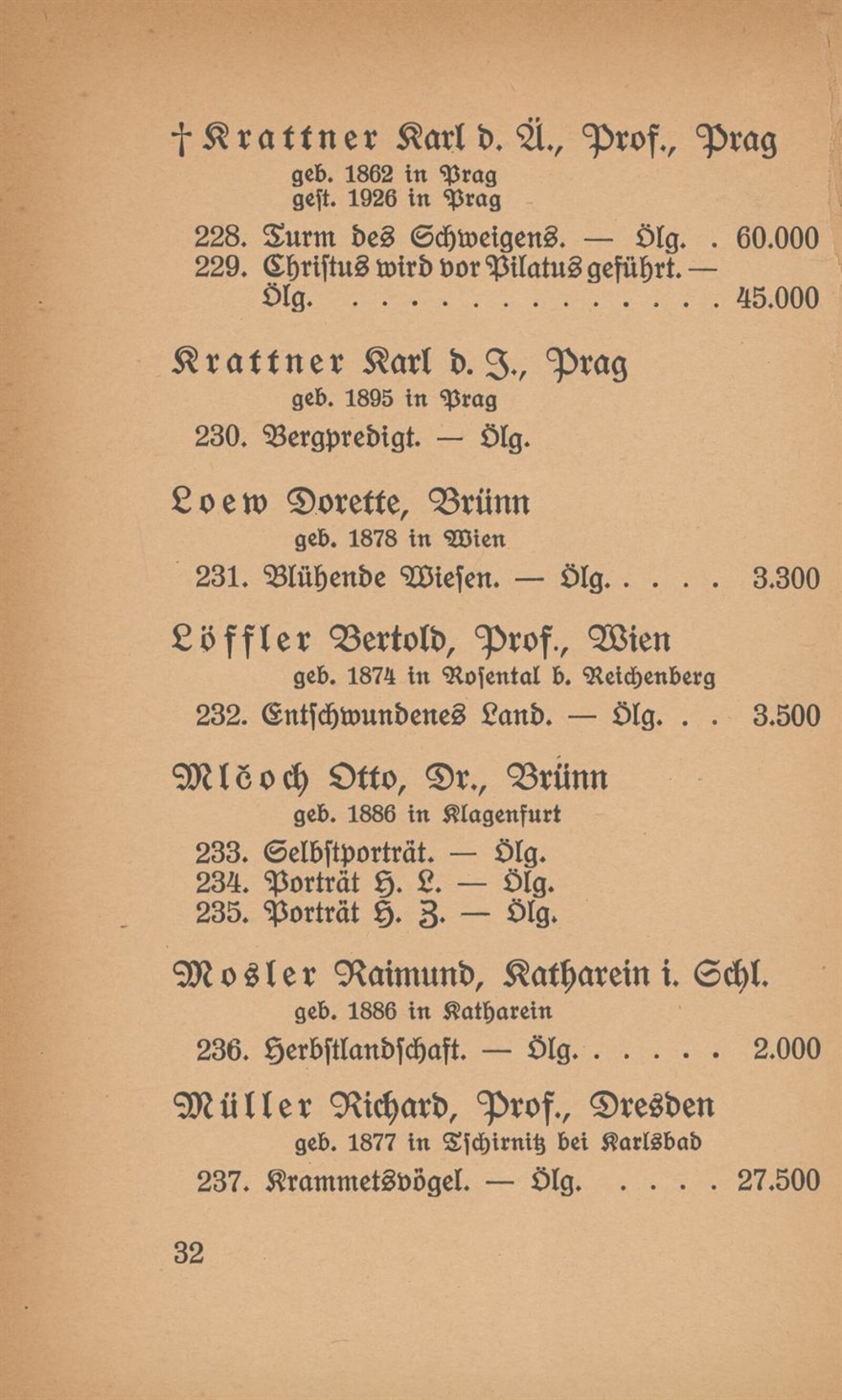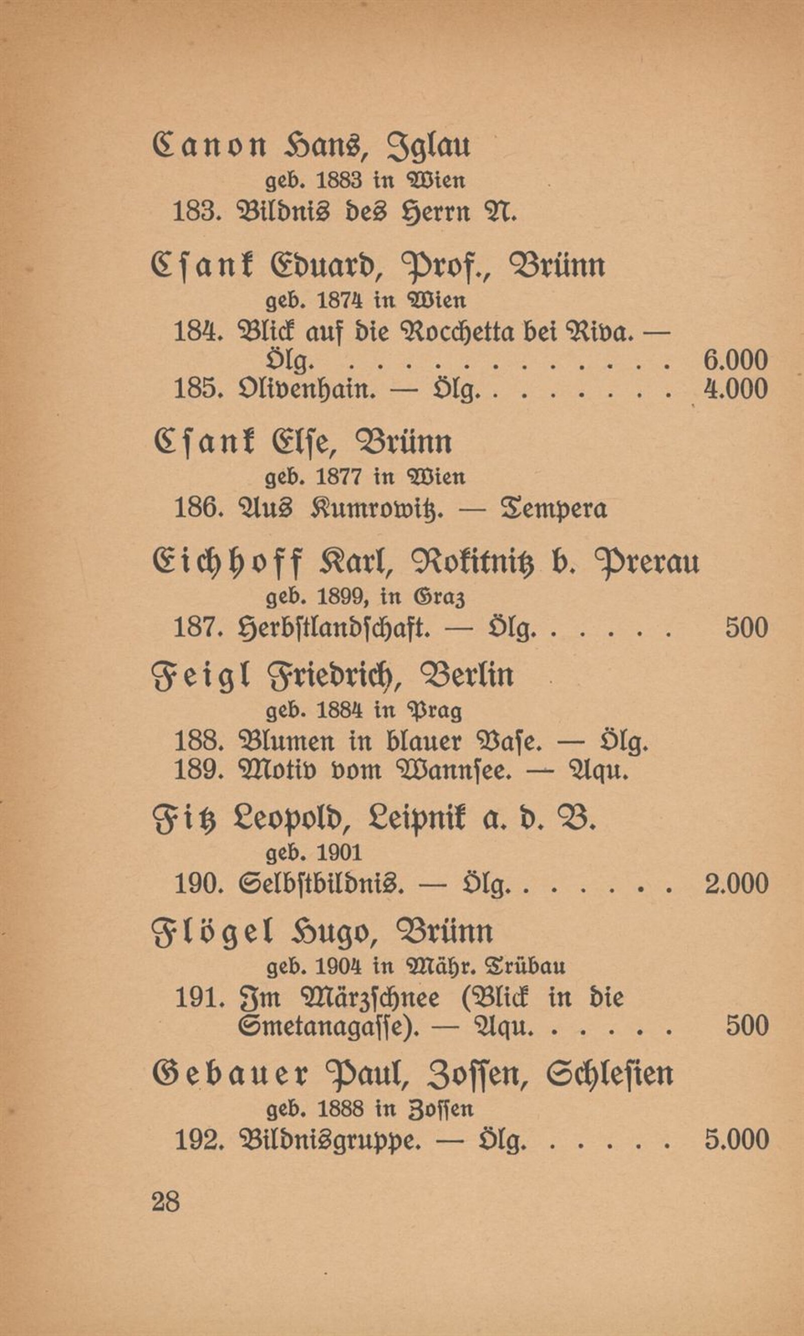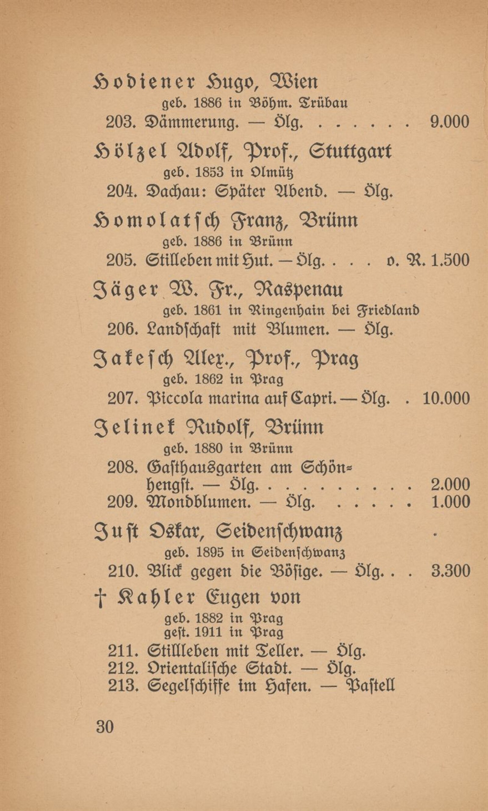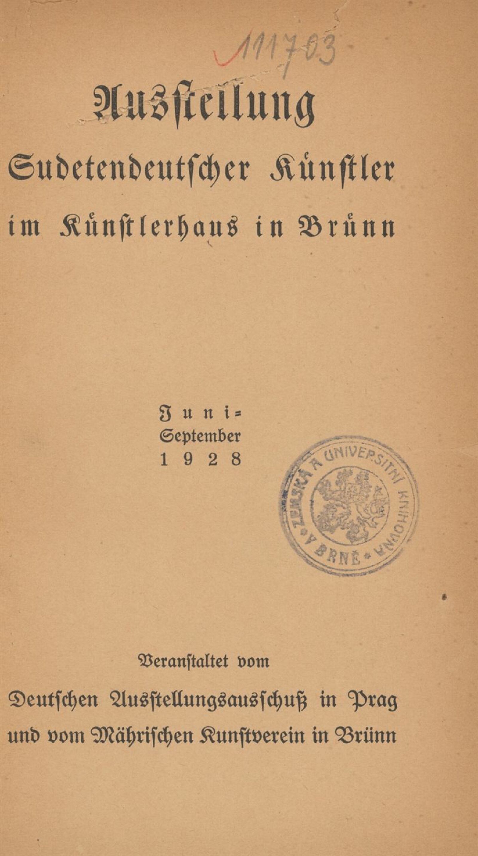 Ausstellung Sudetendeutscher Künstler im Künstlerhaus in Brünn: Juni–September 1928 / Text: Otto Kletzl. – Brünn: Mährischer Kunstverein, 1928. – 45 s. Životní data vystavujících umělců. – MZK; UPM