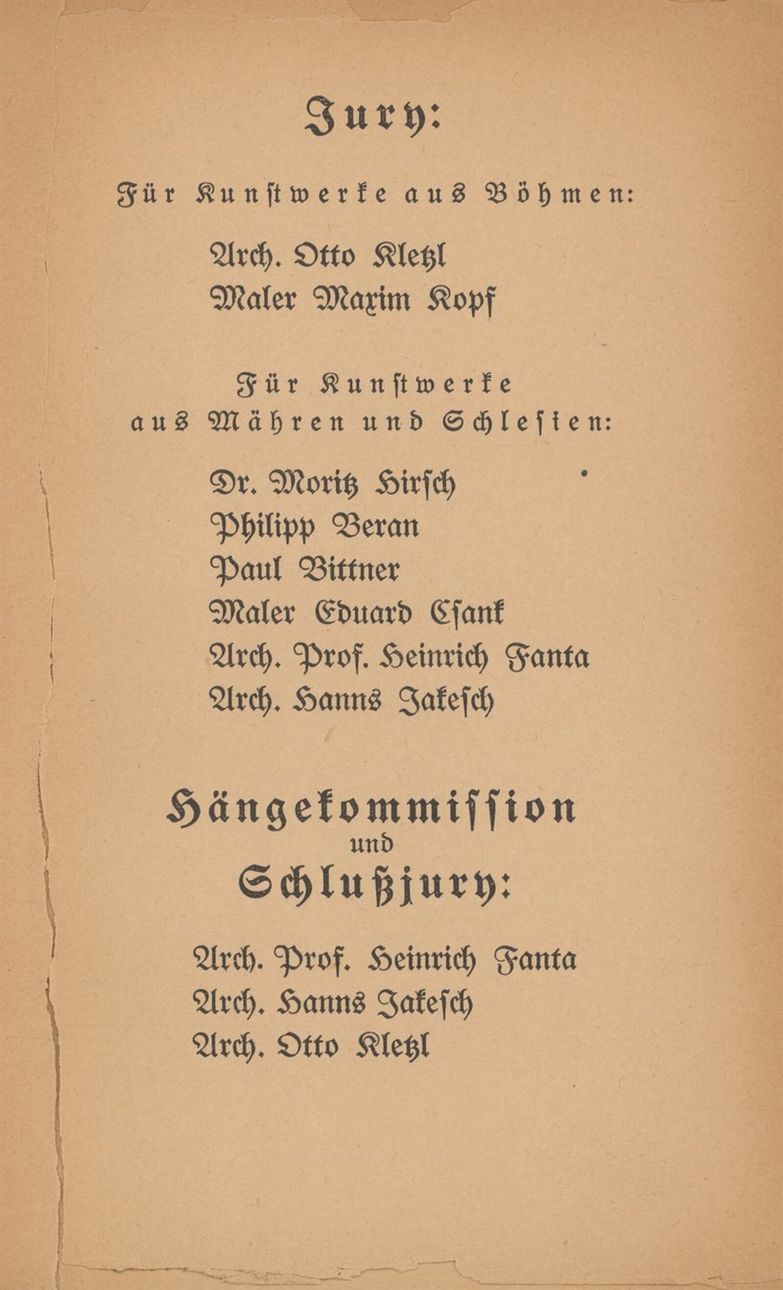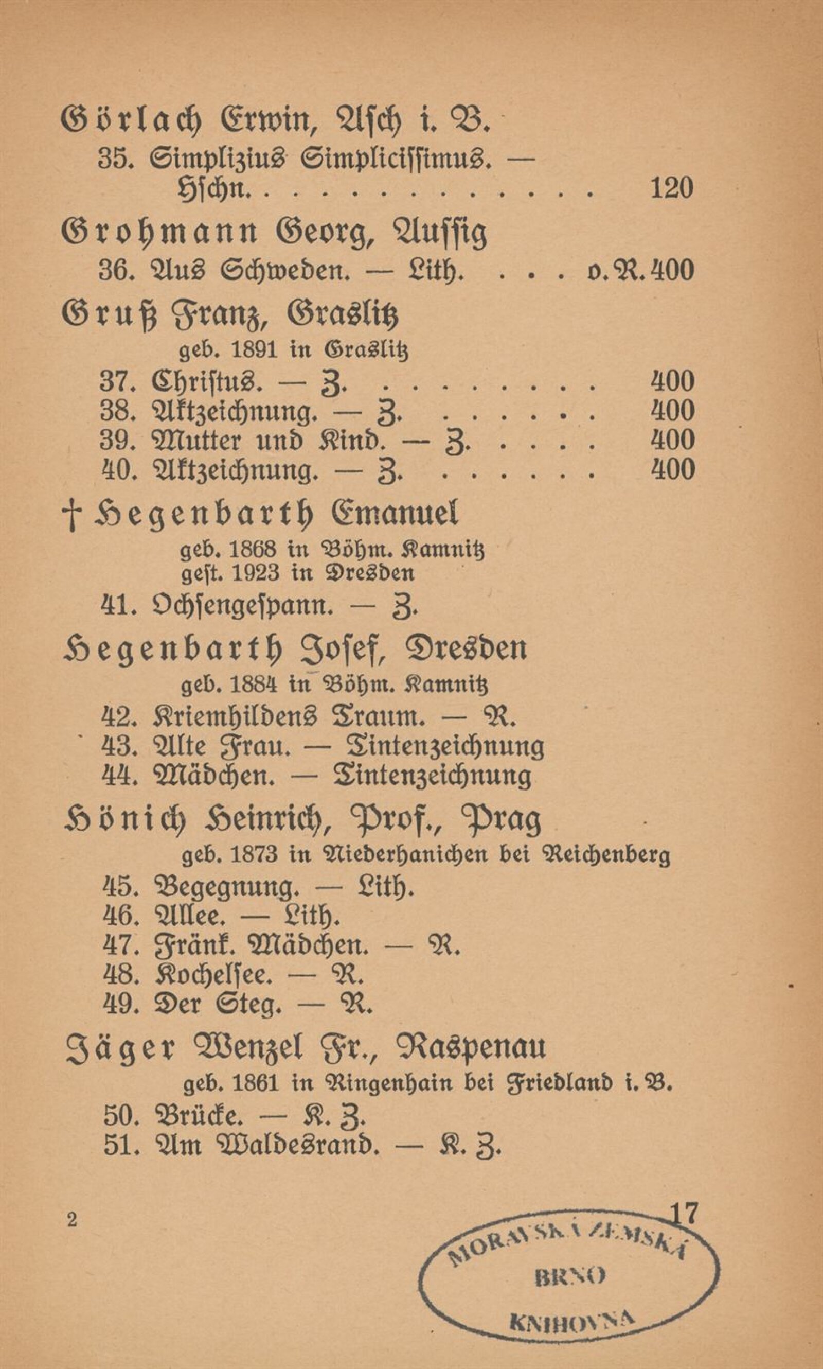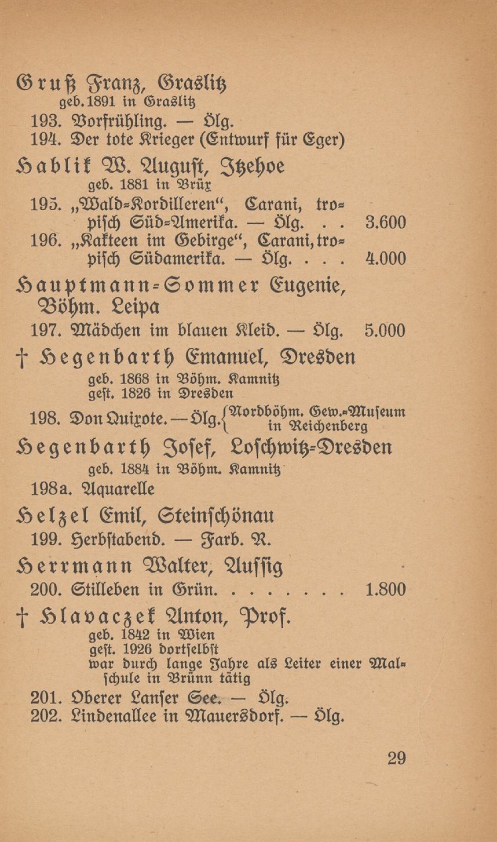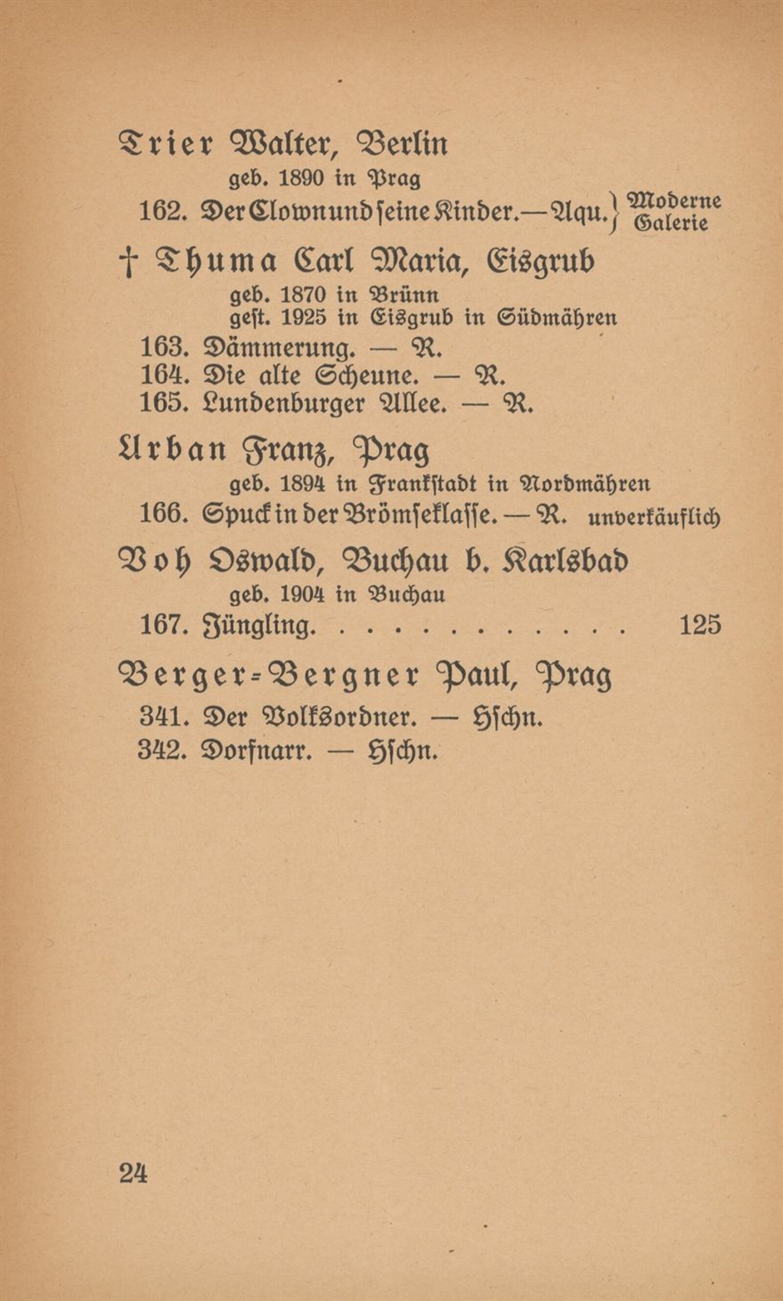 Ausstellung Sudetendeutscher Künstler im Künstlerhaus in Brünn: Juni–September 1928 / Text: Otto Kletzl. – Brünn: Mährischer Kunstverein, 1928. – 45 s. Životní data vystavujících umělců. – MZK; UPM