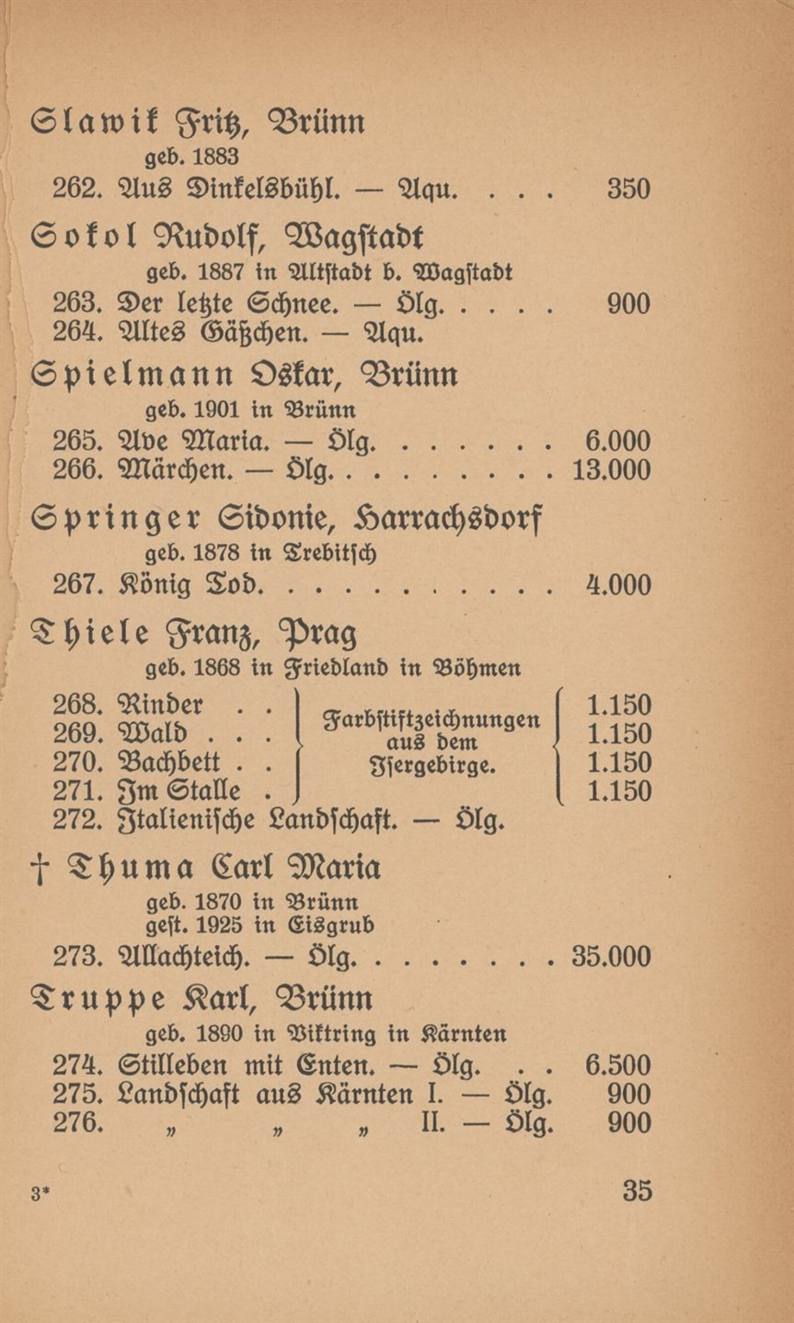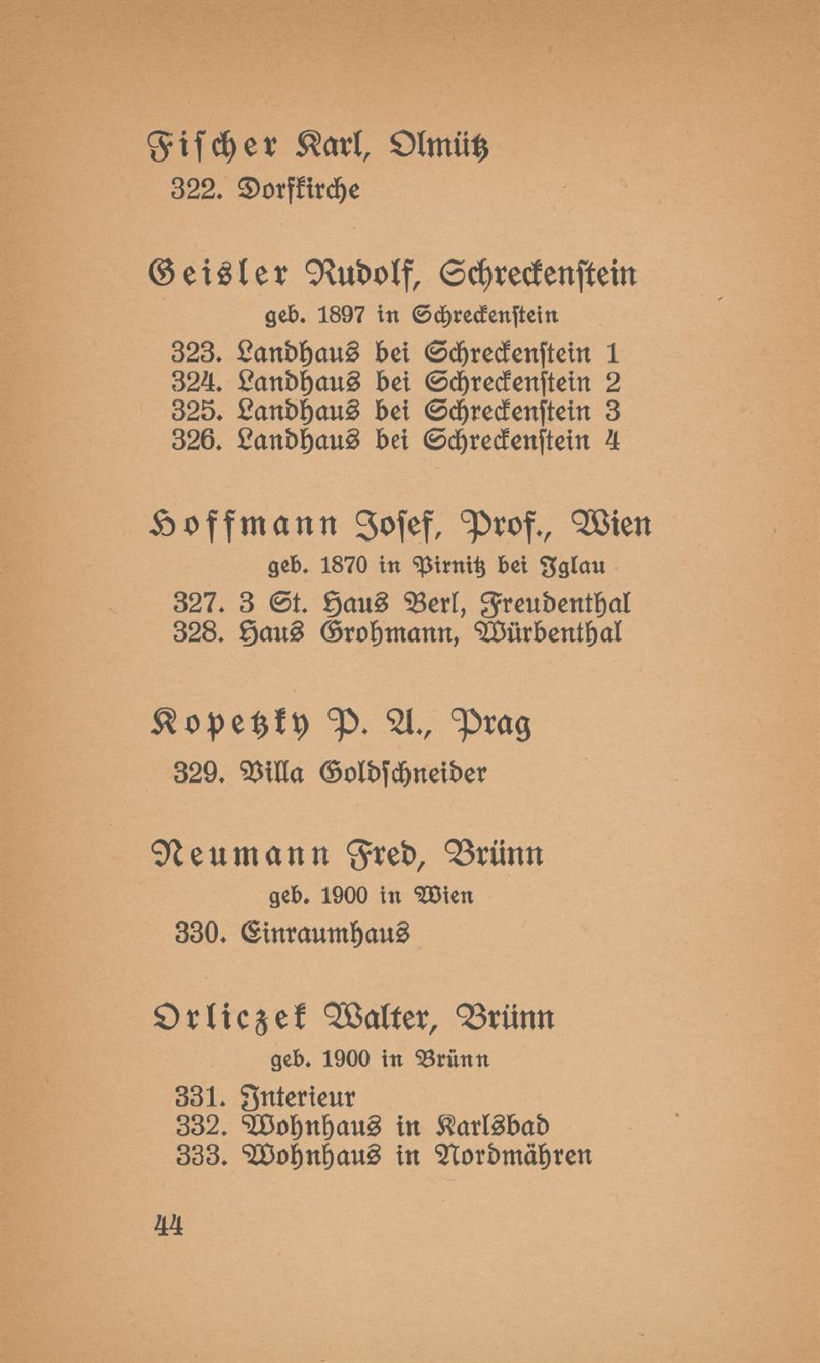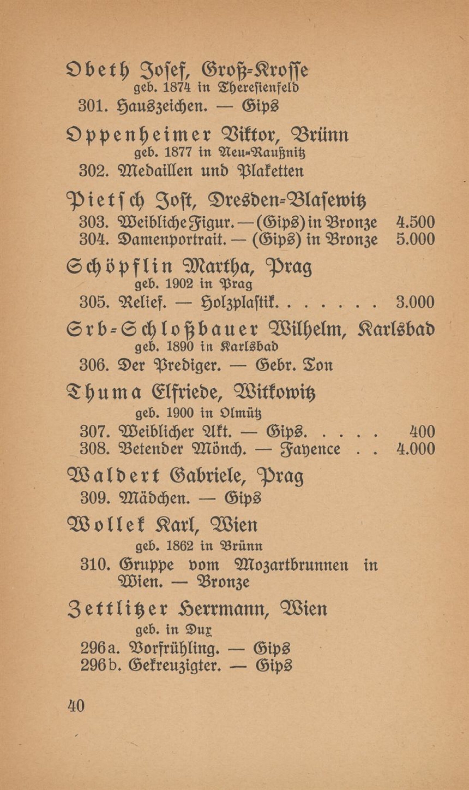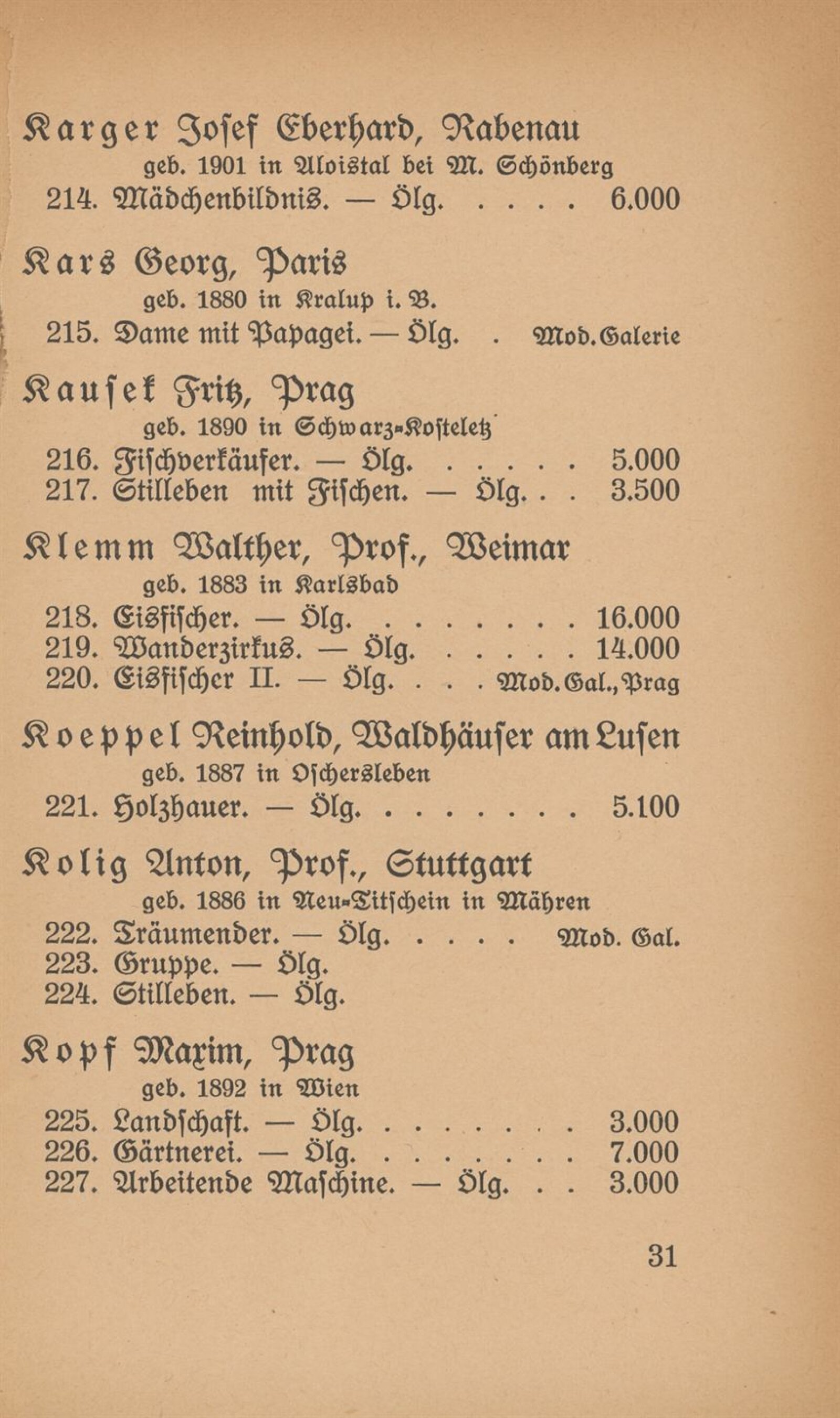 Ausstellung Sudetendeutscher Künstler im Künstlerhaus in Brünn: Juni–September 1928 / Text: Otto Kletzl. – Brünn: Mährischer Kunstverein, 1928. – 45 s. Životní data vystavujících umělců. – MZK; UPM