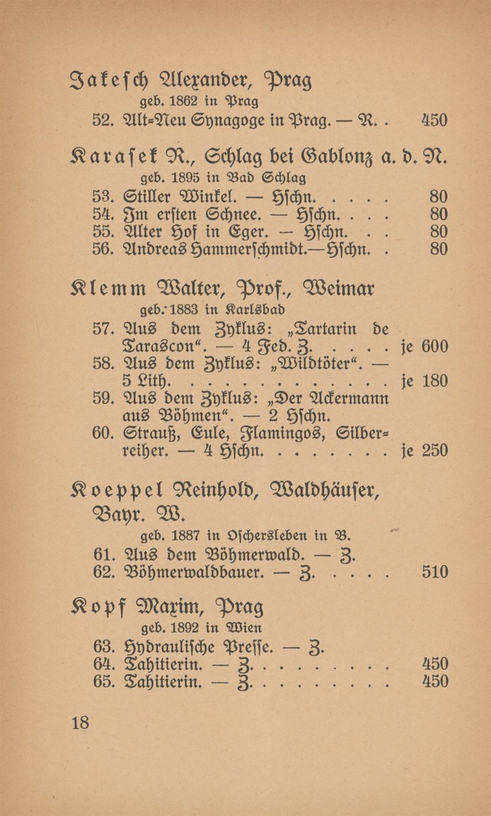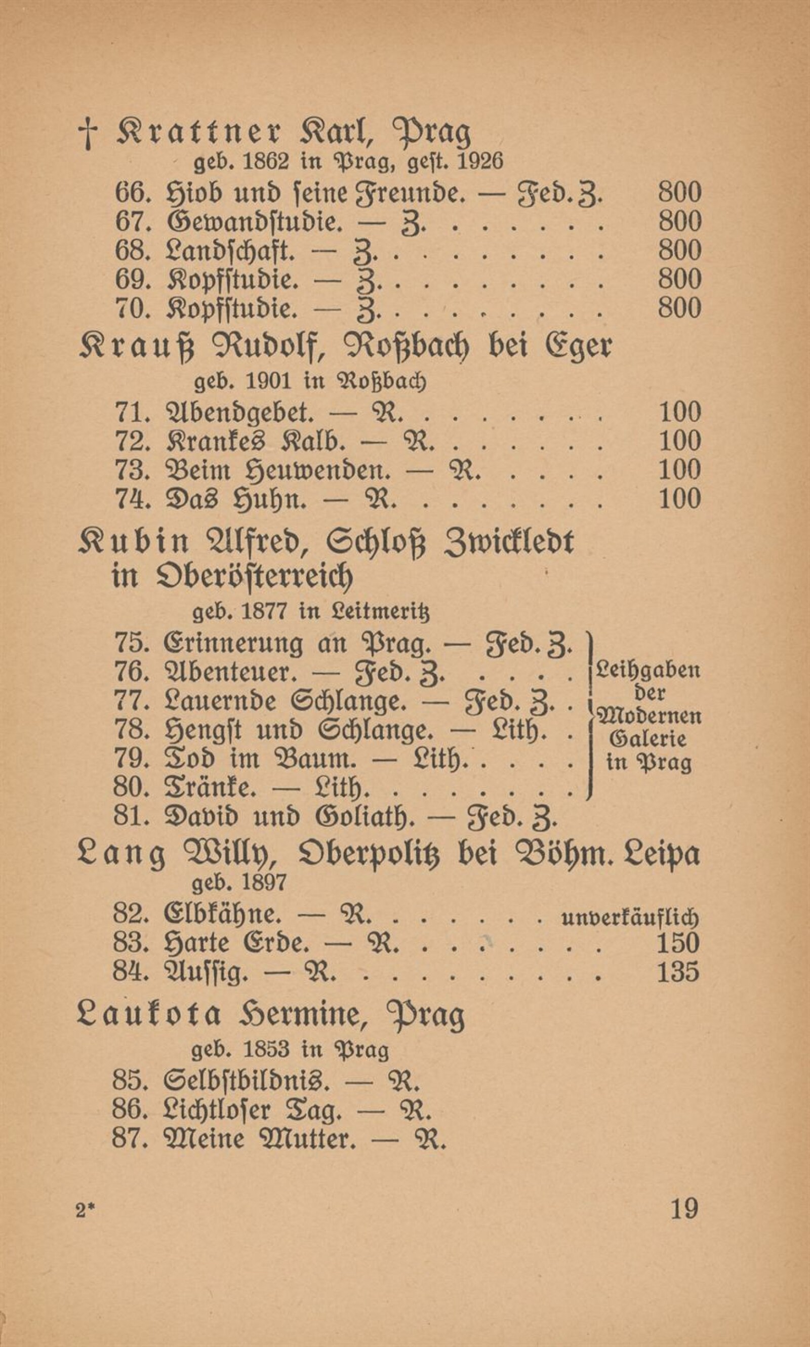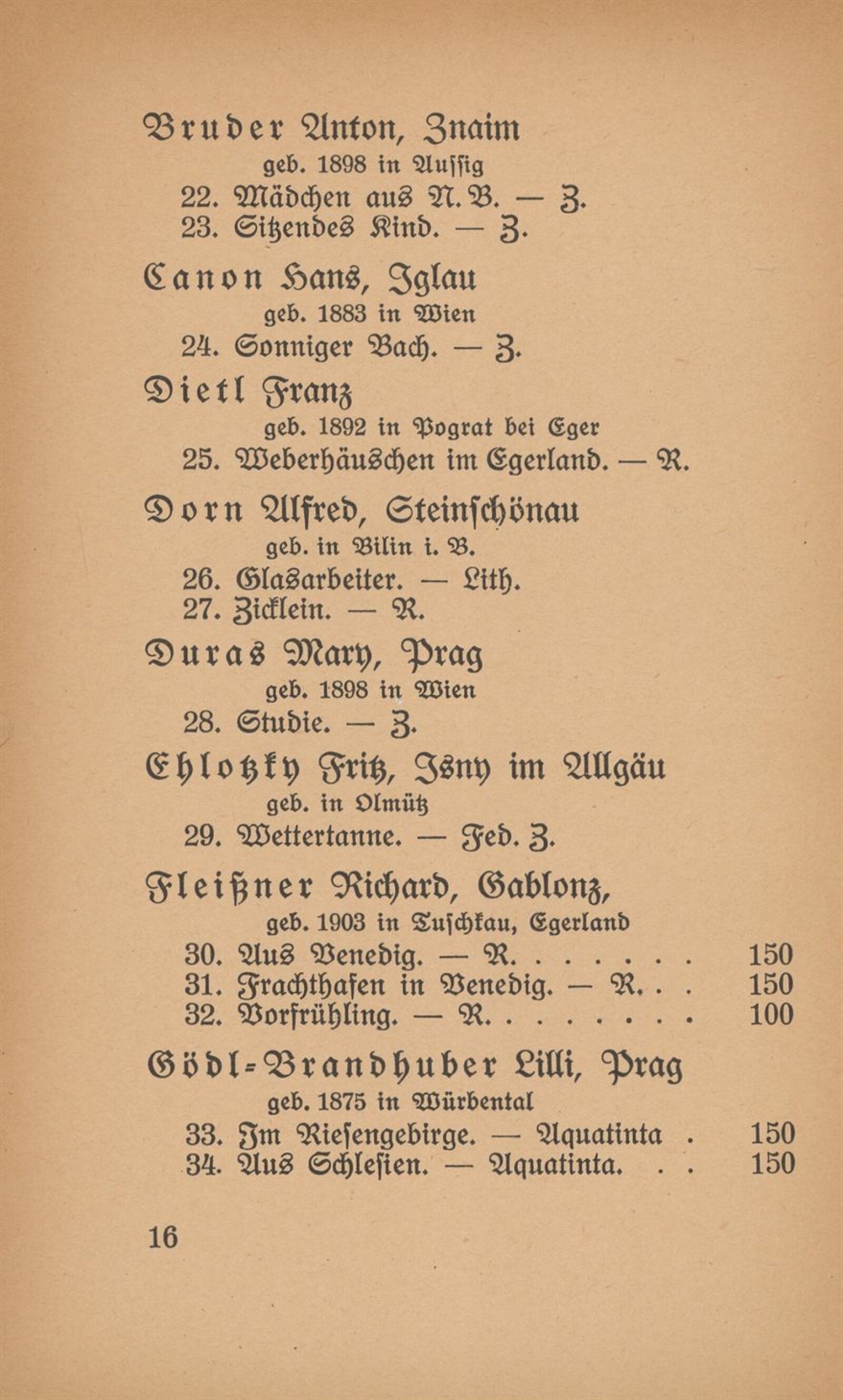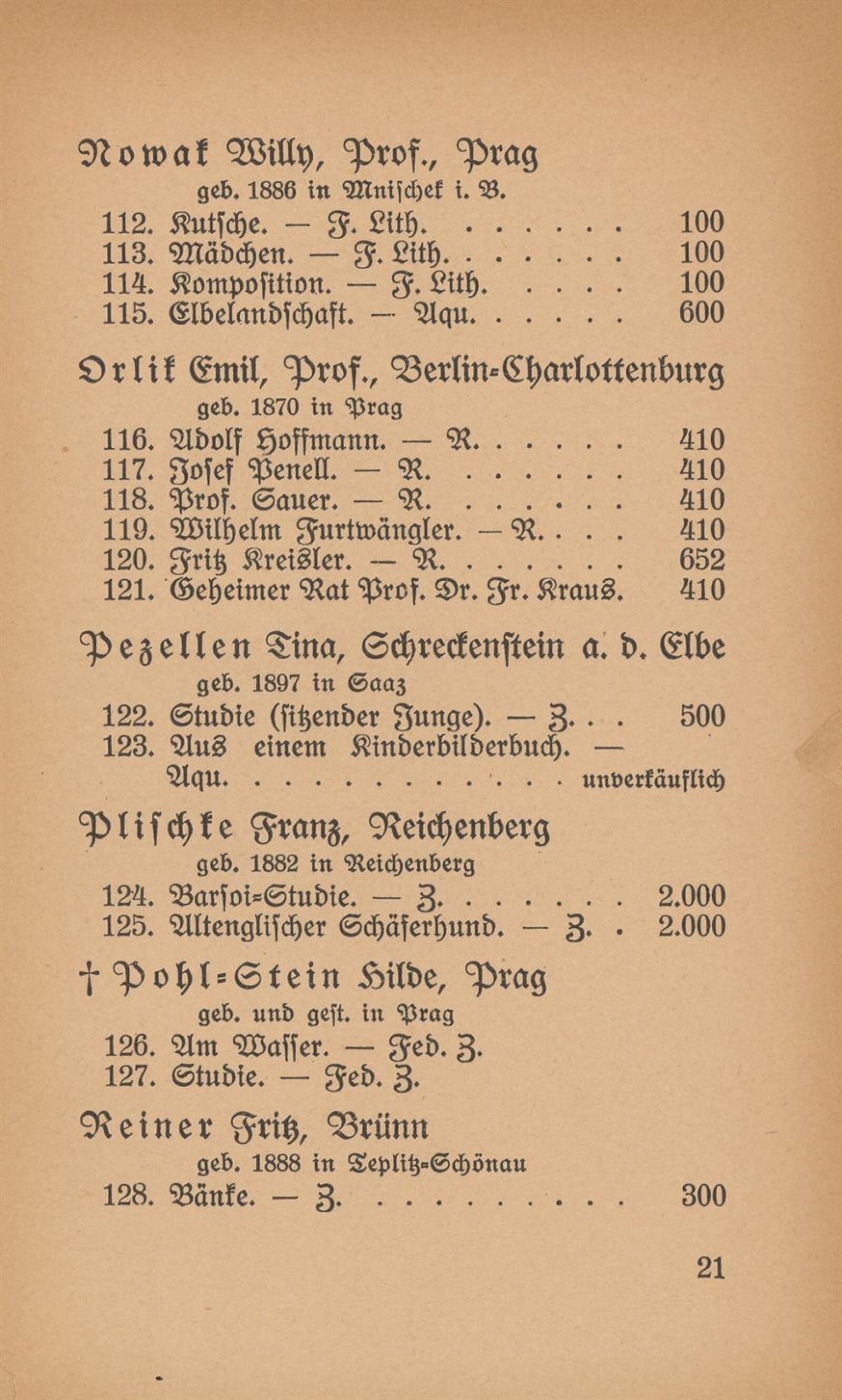 Hugo Baar, Franz Barwig, Leopold Bauer, Bruno Beran, Paul Berger-Bergner, Felix Bibus, Rudolf Bitzan, Gustav Böhm, B. Böhm, August Brömse, Anton Bruder, Samuel Brunner, Hans Canon, Eduard Csank, Elfe Csank, Franz Dietl, Alfred Dorn, Mary Duras, Zoltan Egri, Karl Eichhoff, Friz Ehlotzky, Heinrich Fanta, Friedrich Feigl, Karl Fischer, Leopold Fitz, Richard Fleißner, Hugo Flögel, Paul Gebauer, Rudolf Geisler, Lilli Göbl-Brandhuber, Erwin Görlach, Georg Grohmann, Franz Gruß, August Hablik, Anton Hanak, Eugenie Hauptmann-Sommer, Emanuel Hegenbarth, Josef Hegenbarth, Emil Helzel, Walter Hermann, Anton Hlavaczek, Hugo Hodiener, Josef Hoffman, Oswald Hofmann, Adolf Hölzel, Franz Homolatsch, Heinrich Hönich, Wenzel Franz Jäger, Alexander Jakesch, Rudolf Jelinek, Oskar Just, Eugen von Kahler, Engelbert Kaps, Rudolf Karasek, Josef Eberhard Karger, Georg Kars, Fritz Kausek, Walter Klemm, Reinhold Koeppel, Anton Kolig, P. A. Kopetzky, Maxim Kopf, Karl Korschann, Karl Krattner ml., Karl Krattner st., Rudolf Krauß, Alfred Kubin, Willy Lang, Hermine Laukota, Hugo Lederer, Dorette Loew, Bertold Löffler, Theodor Malléner, Adolf Mayerl, Ludwig Martin, Rudolf Mather, Moriz Melzer, Franz Metzner, Otto Mlčoch, Raimund Mosler, Erwin Müller, Richard Müller, Fred Neumann, Anton Nowak, Willy Nowak, Josef Obeth, Viktor Oppenheimer, Walter Orliczek, Emil Orlik, Rudolf Otto, Artur Payr, Tina Pezellen, Jost Piestch, Franz Plischke, Hilde Pohl-Stein, Josef Prinke, Ludwig Püschel, Fritz Raida, Luß Raida, Fritz Reiner, Arthur Ressel, Ernst Riedel, Hans Ruzicka-Lautenschlager, Ivo Saliger, Martha Schöpflin, Toni Schönecker, Charlotte Schroetter-Radnitz, Richard Schroetter, Julius Schustala, Fritz Slawik, Rudolf Sokol, Oskar Spielmann, Sidonie Springer, Wilhelm Srb-Schloßbauer, Ferdinand Staeger, Hugo Steiner, Karl Stratil, Alfred Strnischtie, Richard Teschner, Franz Thiele, Inge Thiele-Peschka, Th. Thiele, Carl Thiemann, Walter Trier, Alfred Thuma, Carl Maria Thuma, Emil Tranquillini, Karl Truppe, Otto Ungar, Franz Urban, Wilhelm Konrad Uxa, Gustav Vogt, Oswald Voh, Karl Wagner, Gabriele Waldert, Alois Watznauer, Elly Weingarten, Ludwig Wieden, Karl Wollek, Hermann Zettlitzer