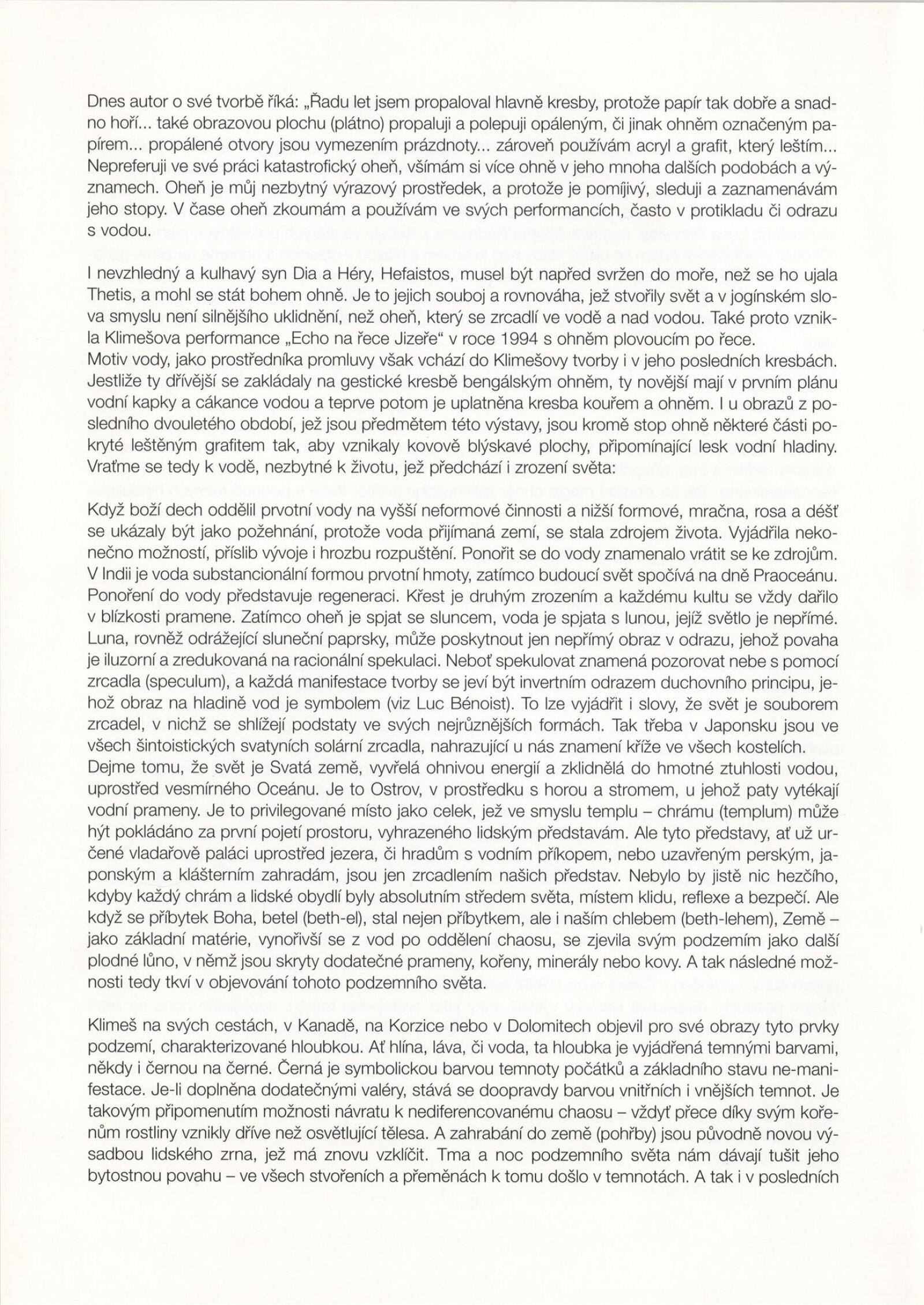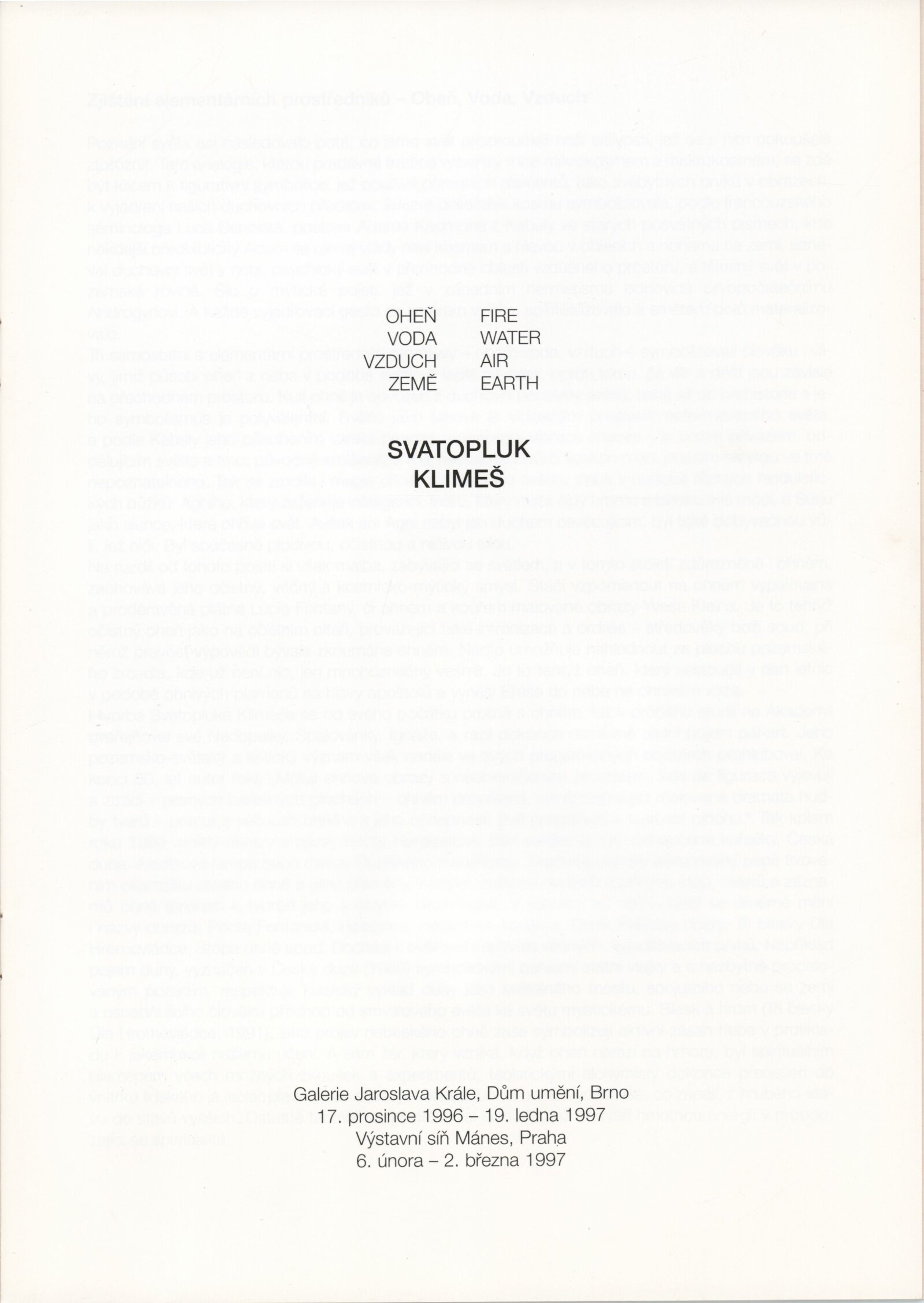 Svatopluk Klimeš. Ohěn, voda, vzduch, země: Dům umění města Brna, 204. výstava v Galerii Jaroslava Krále, 17. 12. 1996 – 19. 1. 1997 / Text: Vlasta Čiháková-Noshiro. – Brno: DUmB, 1996. – [14] s., obr., životní data, výstavy, zastoupení ve sbírkách, DU 1039. – MZK