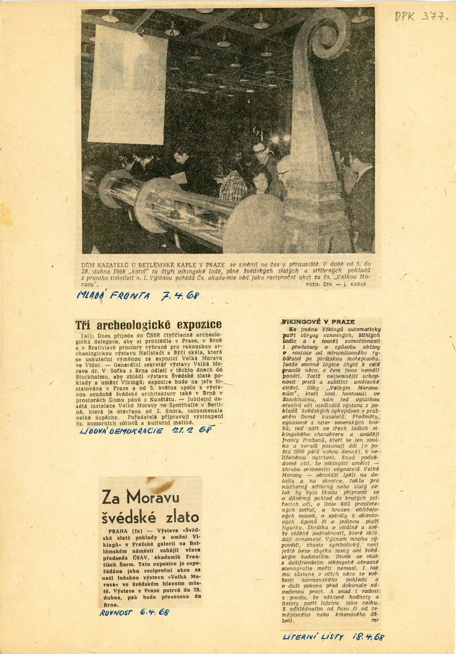 společná pozvánka DPK 377–380, katalog, měsíční plakát (DU, DPK), fotografie (z vernisáže a výstavy – společné fotografie DPK 377 a 378), korespondence (poděkování O. Isakssona z Musea ve Stockholmu za přijetí a organizaci výstavy v Brně, společná provozní korespondence DPK 377–378, dopisy dr. V. Sofky – ČSAV o realizaci švédské archeologické výstavy v DPK), recenze v tisku (o výstavách v Brně i Praze), pozvánka z výstavy (Praha)