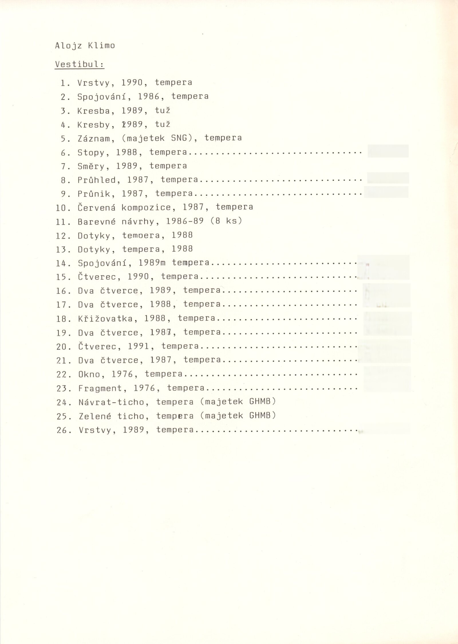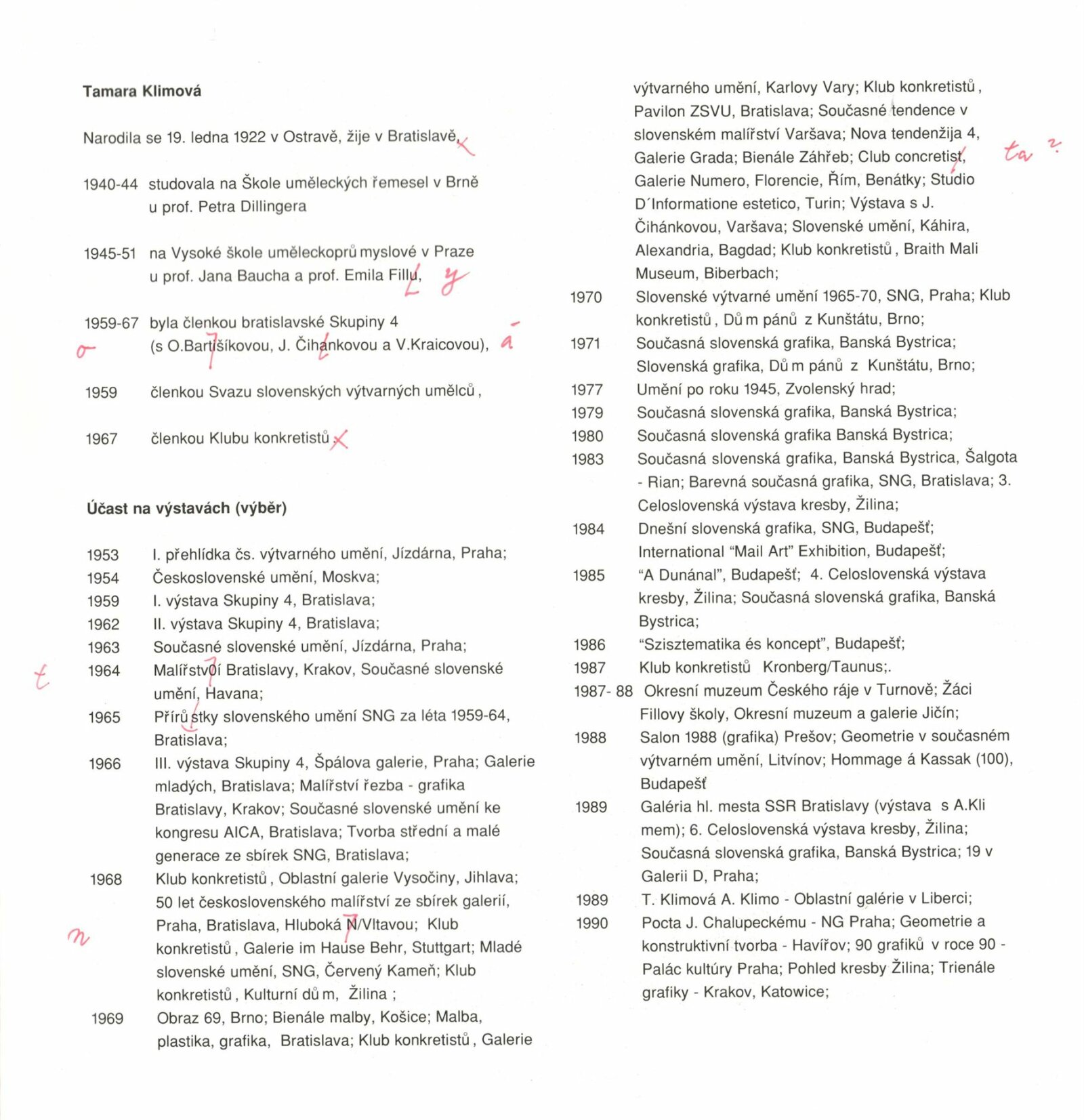 pozvánka, katalog, strojopis, seznam vystavených děl, seznam prodejných děl, smlouvy o výpůjčce, potvrzení převzetí, reversy, korespondence o přípravě výstavy, žádost o výstavní termín, pozvánka, katalog z výstavy T. Klímové a A. Klima v GHM SSR Bratislavy (1989), pozvánka na výstavu v OG v Liberci (1989)