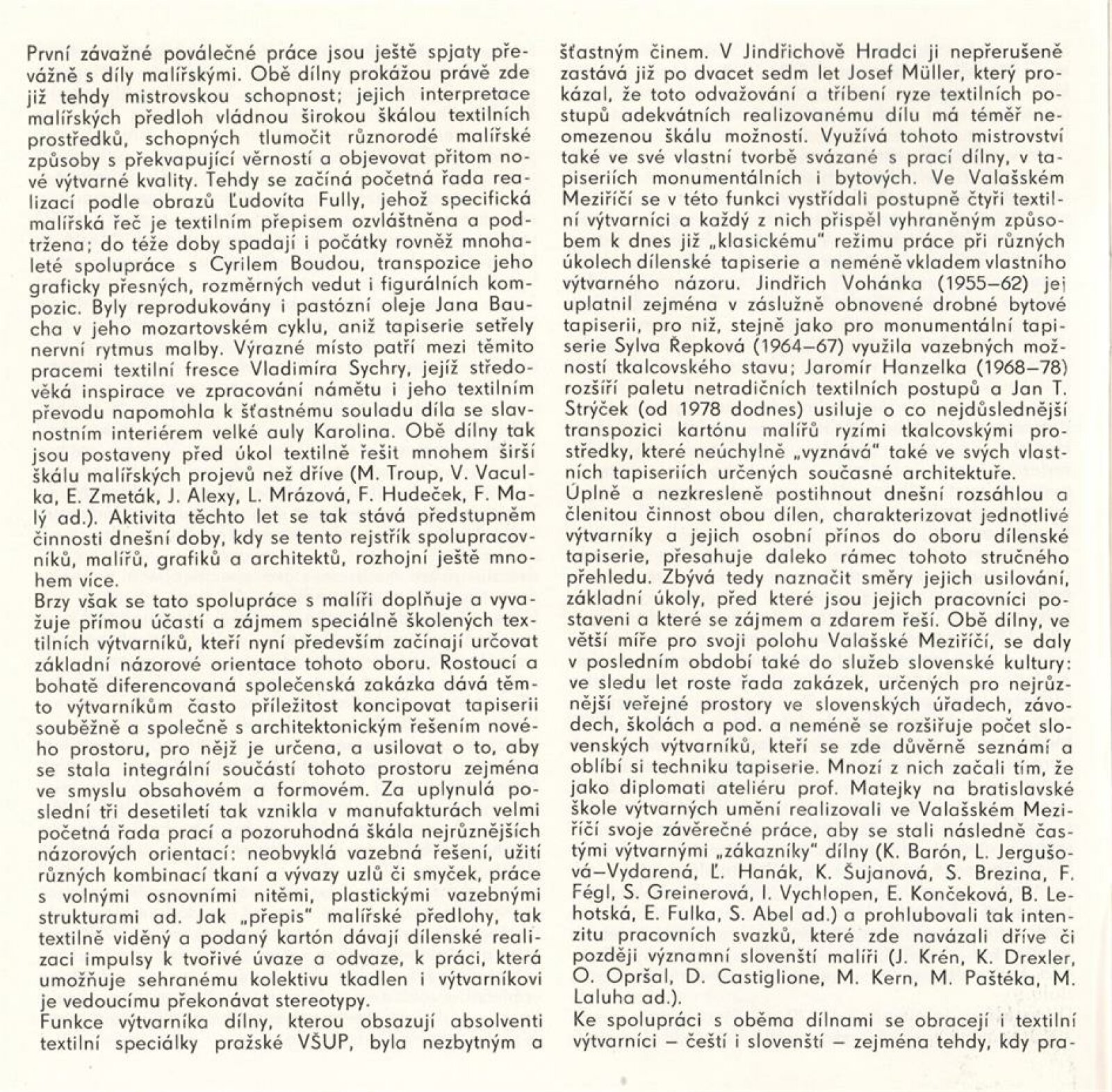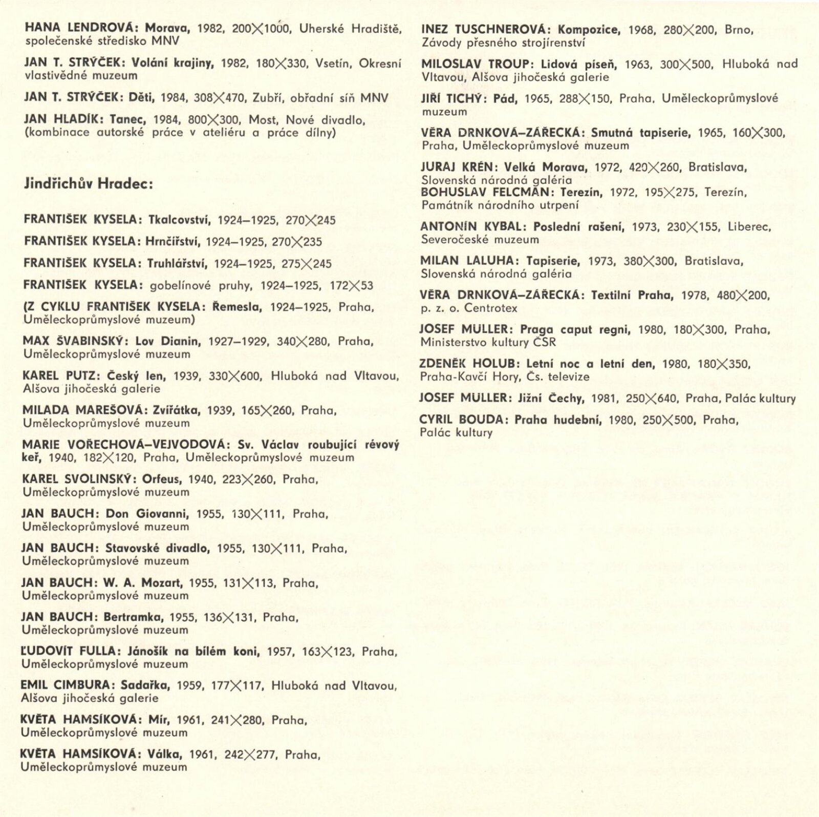 Tapiserie, umění a řemeslo. Výstava k 75. výročí založení gobelínových a kobercových dílen Ústřední uměleckých řemesel ve Valašském Meziříčí a v Jindřichově Hradci: Dům umění města Brna, 1. patro, 11. 1. – 10. 2. 1985 / Text: Ludmila Kybalová. – Brno: DUmB, 1985. – 32 s., obr., seznam vystavených tapiserií 2 s., historiografie dílen, DU 790. – MZK; MG