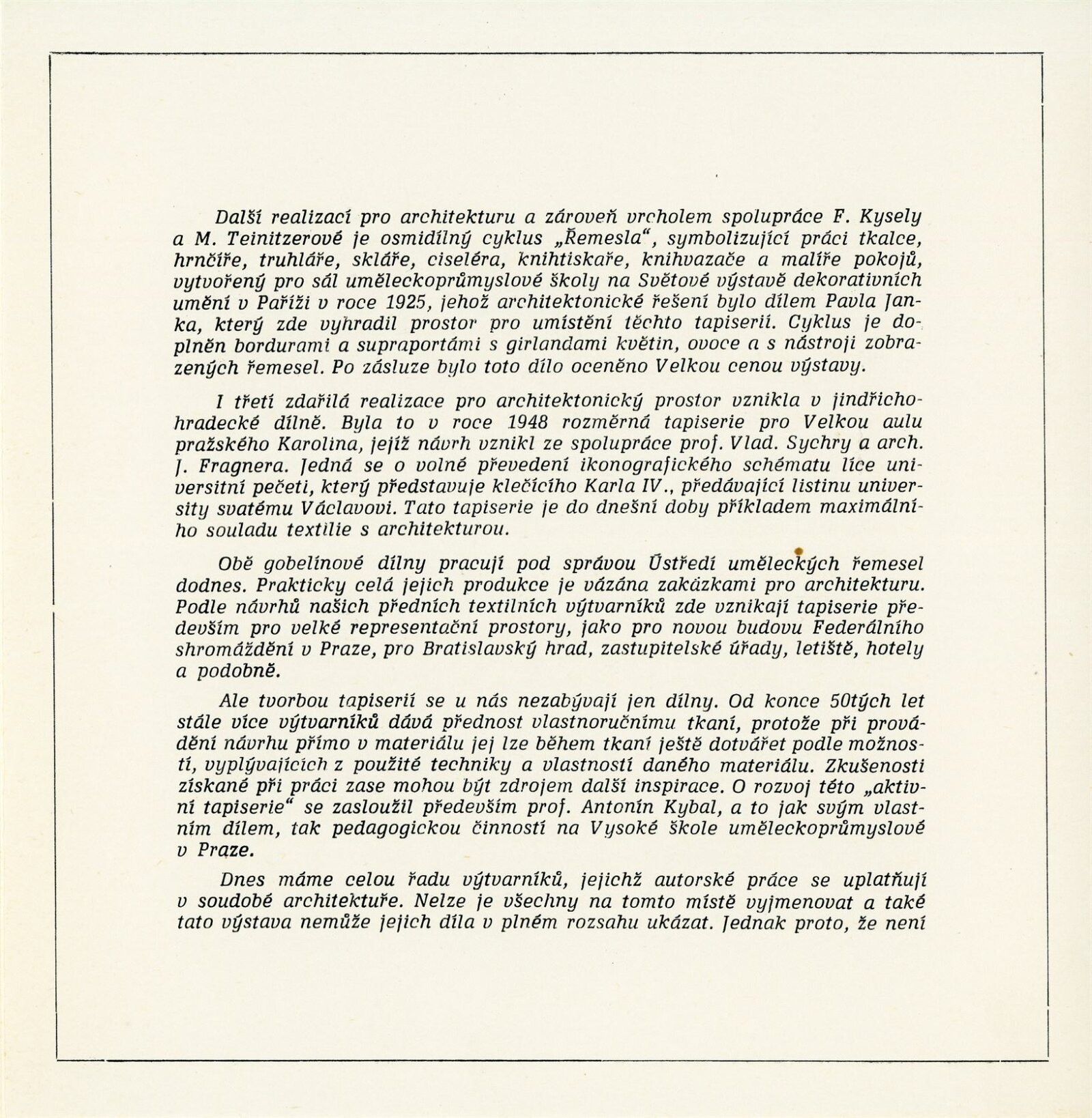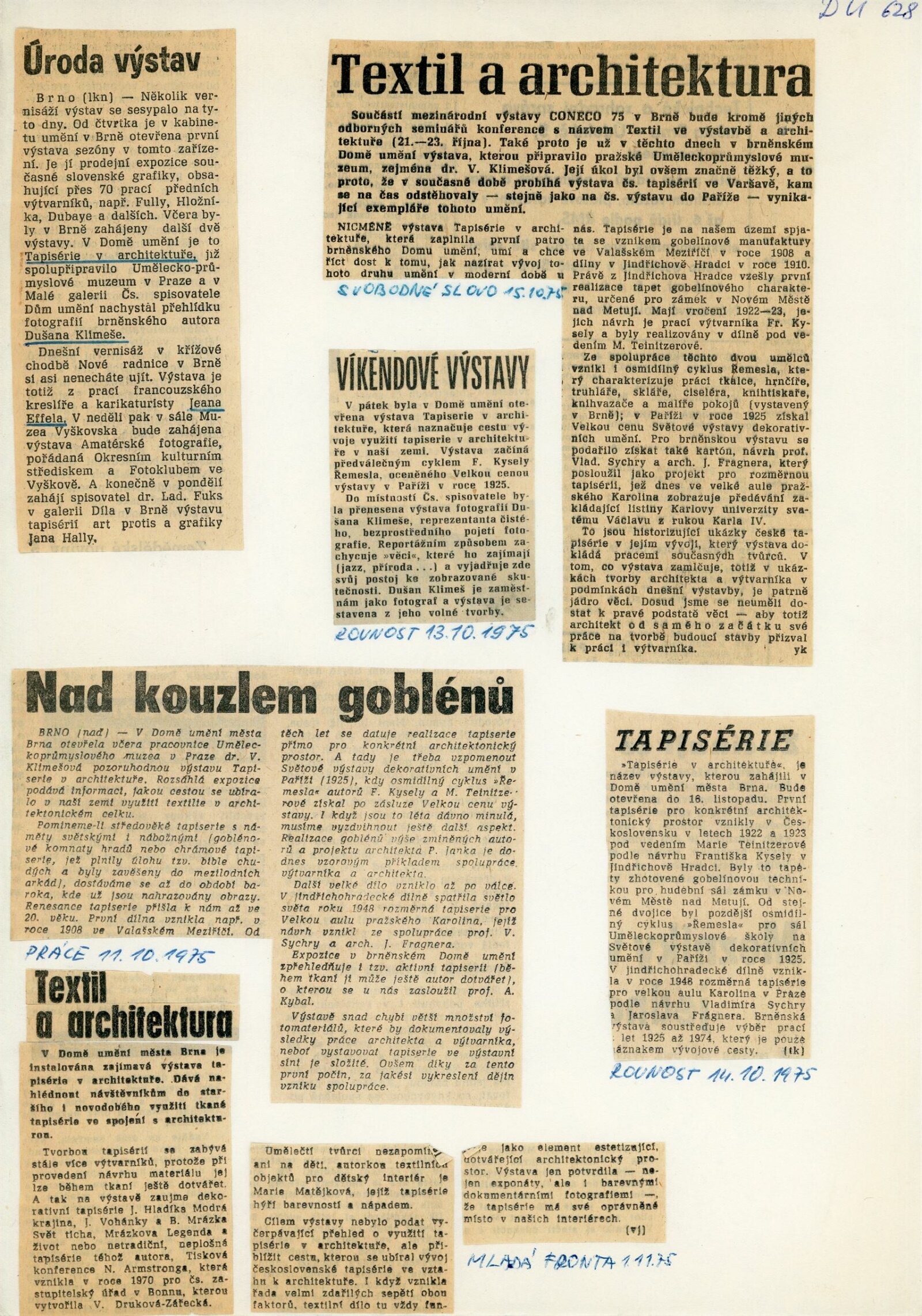 Tapiserie v architektuře: Dům umění města Brna, 10. 10. – 16. 11. 1975 / Text: Věra Klimešová. – Brno: DUmB, 1975. – 4 s., DU 628. – MZK; MG; MMB