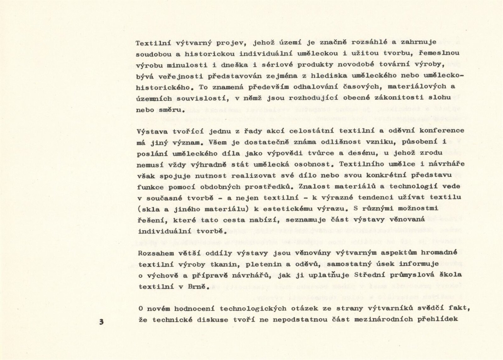 pozvánka, katalog (průvodce) výstavou, program III. celostátní textilní a oděvní konference, fotografie instalace, libreto výstavy a konference, záznamy z pracovních schůzí, seznam zapůjčených výrobků od Střední průmyslové školy textilní v Brně, zápisy ze schůzí, provozní korespondence (Vládní komise pro výstavnictví ČSR, Výzkumný ústav vlnařský, Cetok 80 (7. 9. 1979), Čes. vědecko-tech. spol. - objednávka a smlouva o pořádání výstavy), žádost o povolení výstavy, recenze v tisku