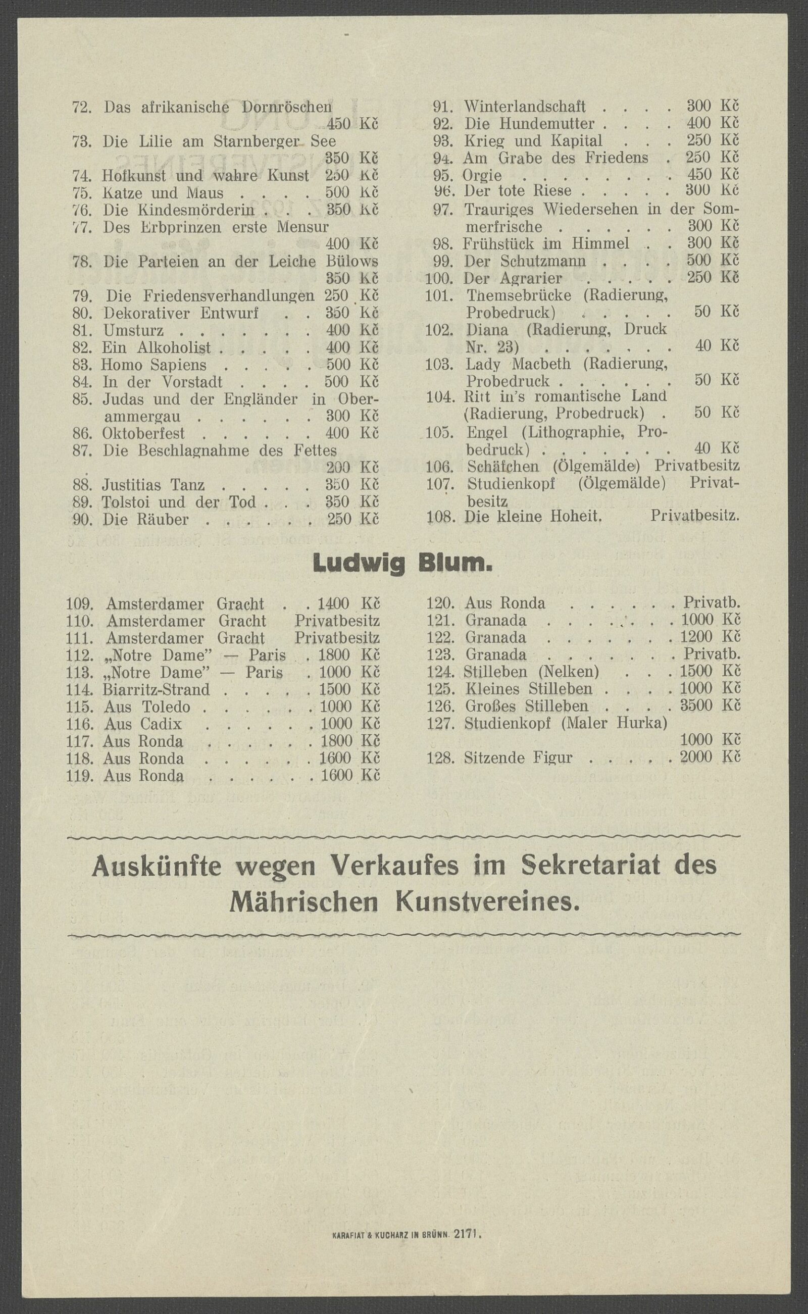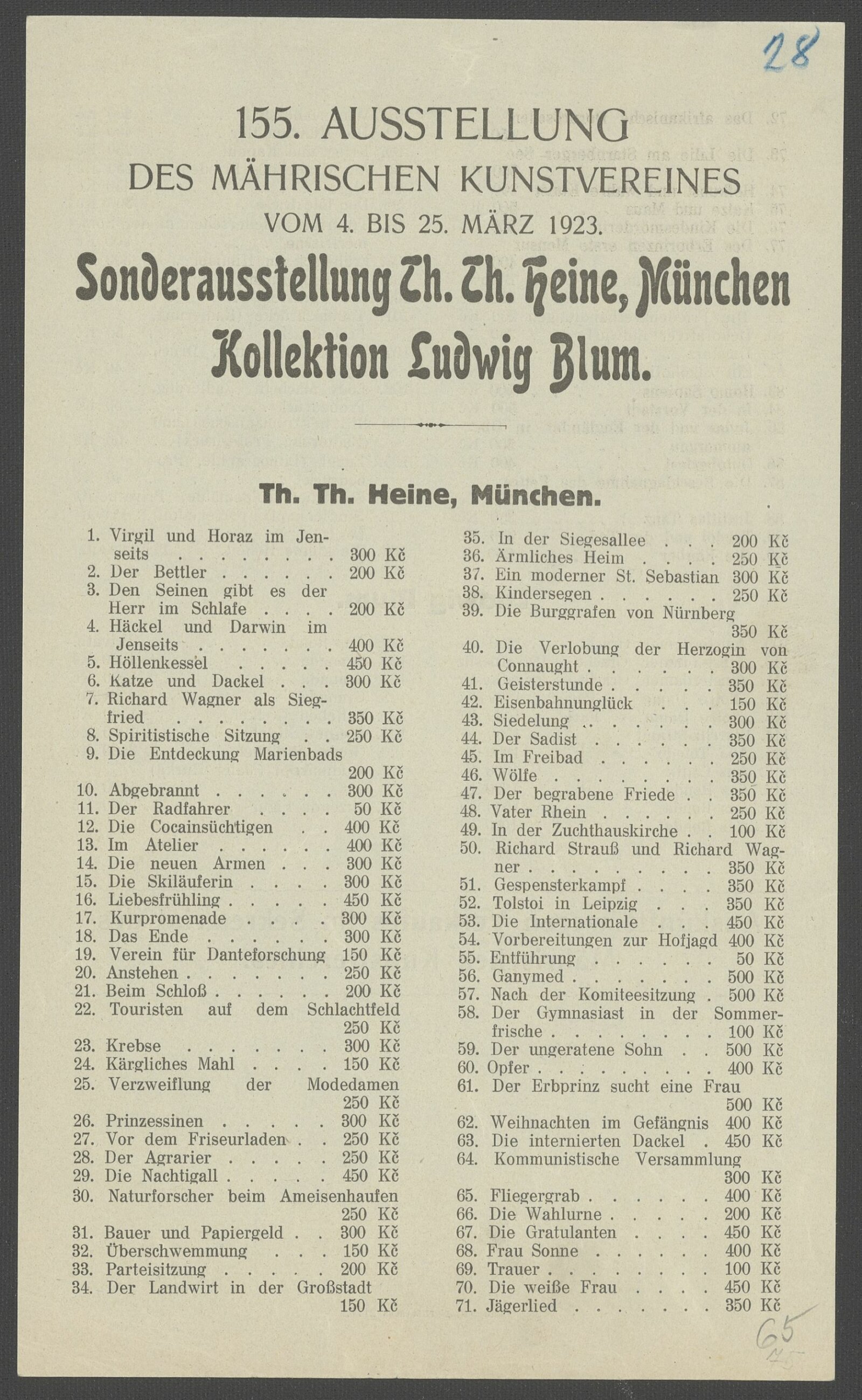 Sonderausstellung Th. Th. Heine, München. Kollektion Ludwig Blum: 155. Ausstellung des Mährischen Kunstvereines 4. – 25. 3. 1923 / Brünn: Mährischer Kunstverein, 1923. – 2 s. – MZA