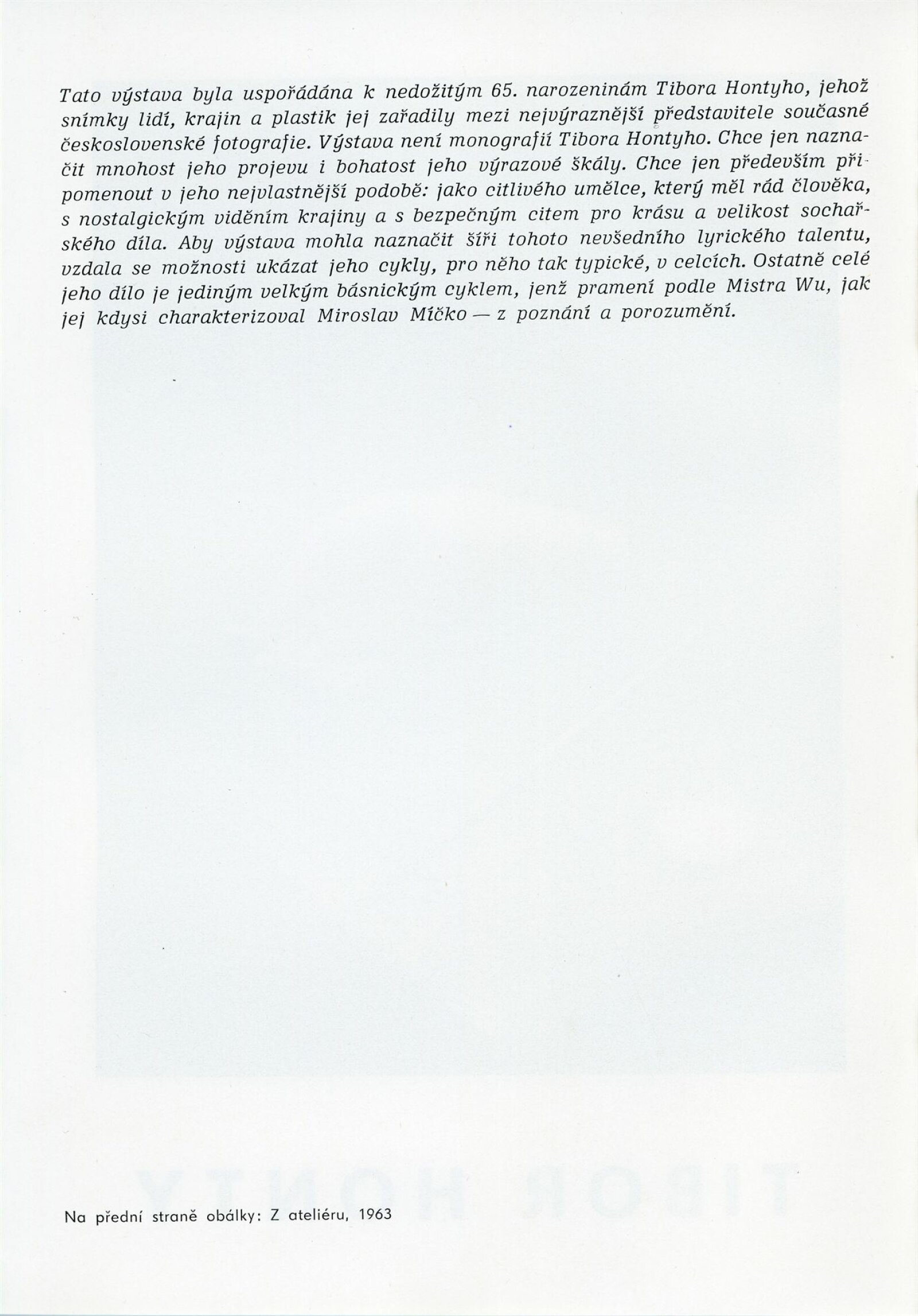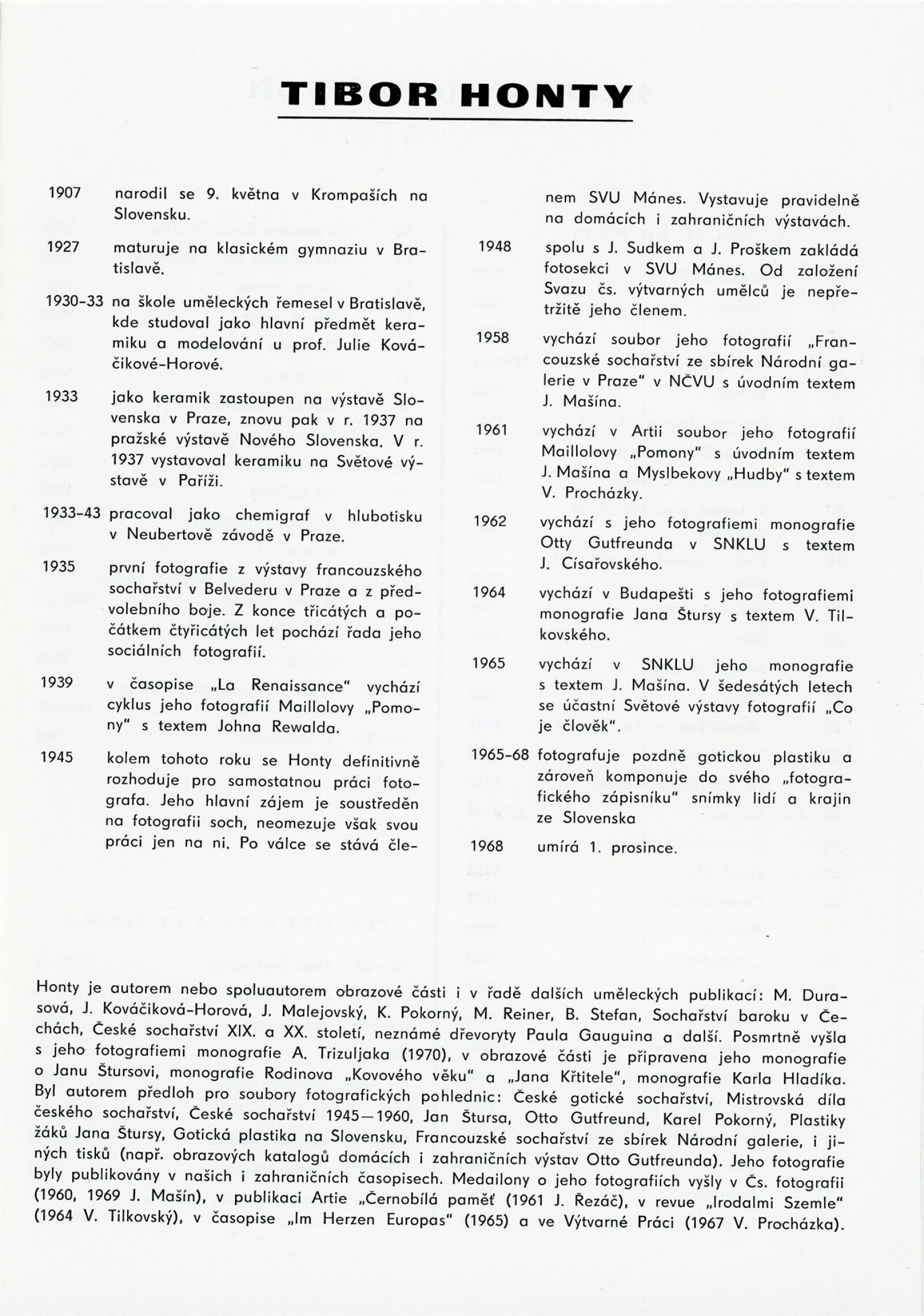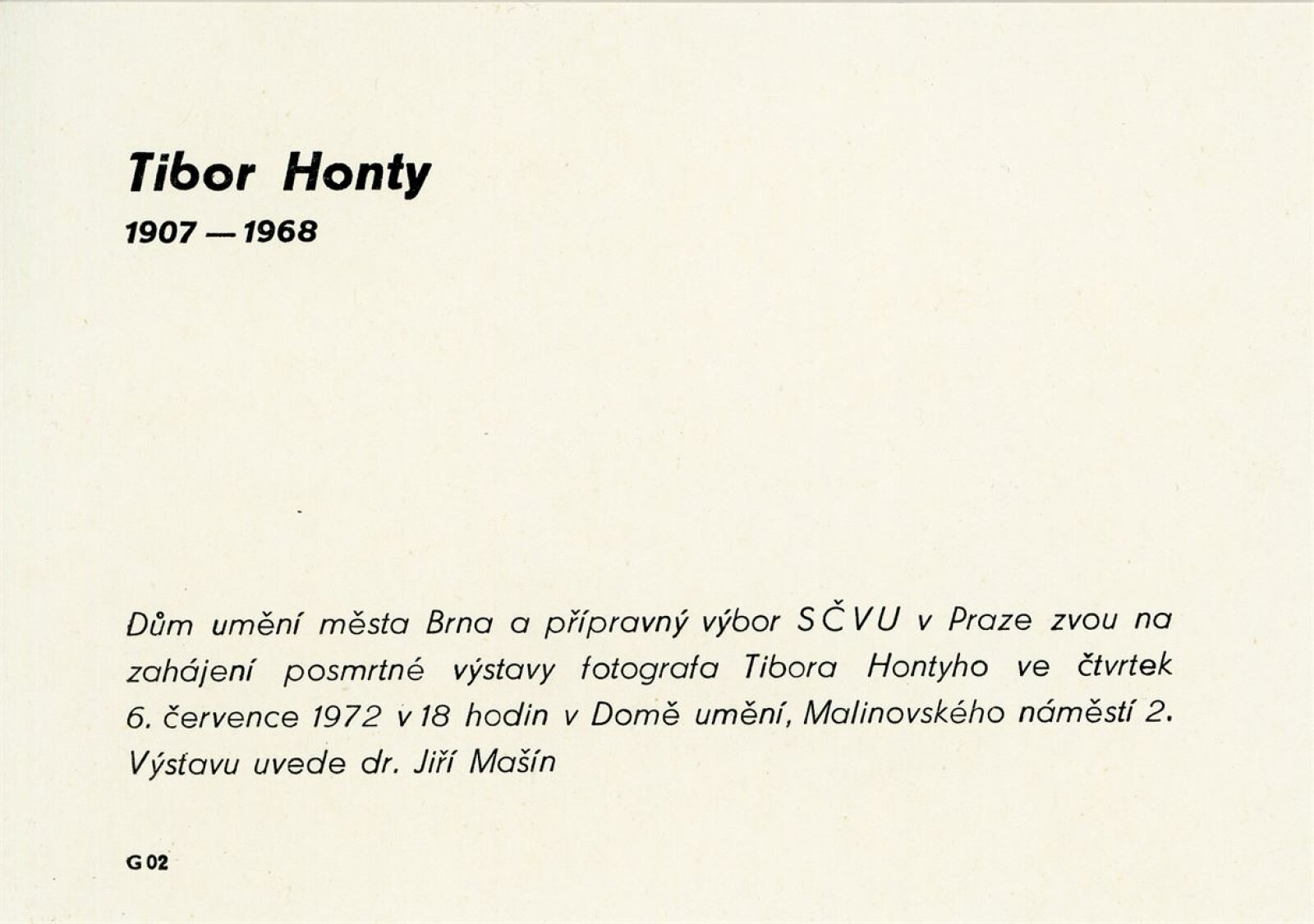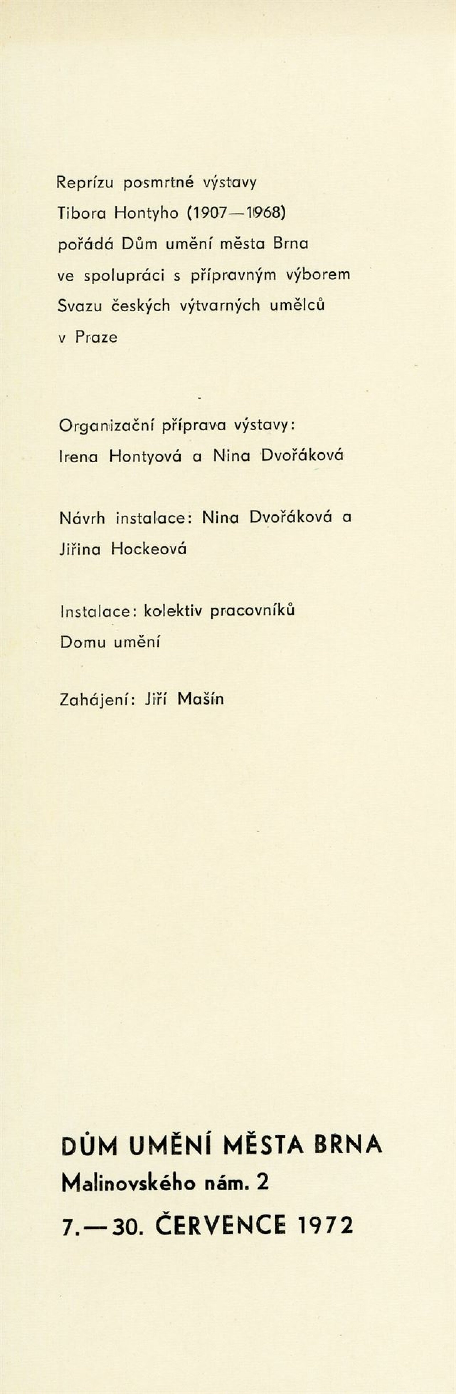 Tibor Honty: Dům umění města Brna, 7. 7. – 30. 7. 1972 / Převzatý katalog s přítiskem pro brněnskou výstavu. Tibor Honty. 1907–1968: Čs. spisovatel v Praze, 12. 4. – 9. 5. 1972 / Texty: Václav Procházka, Vojtěch Tilkovský, John Rewald, Jiří Mašín. – Praha: Čs. spisovatel, 1972. – 14 s., obr., DU 573b. – MG