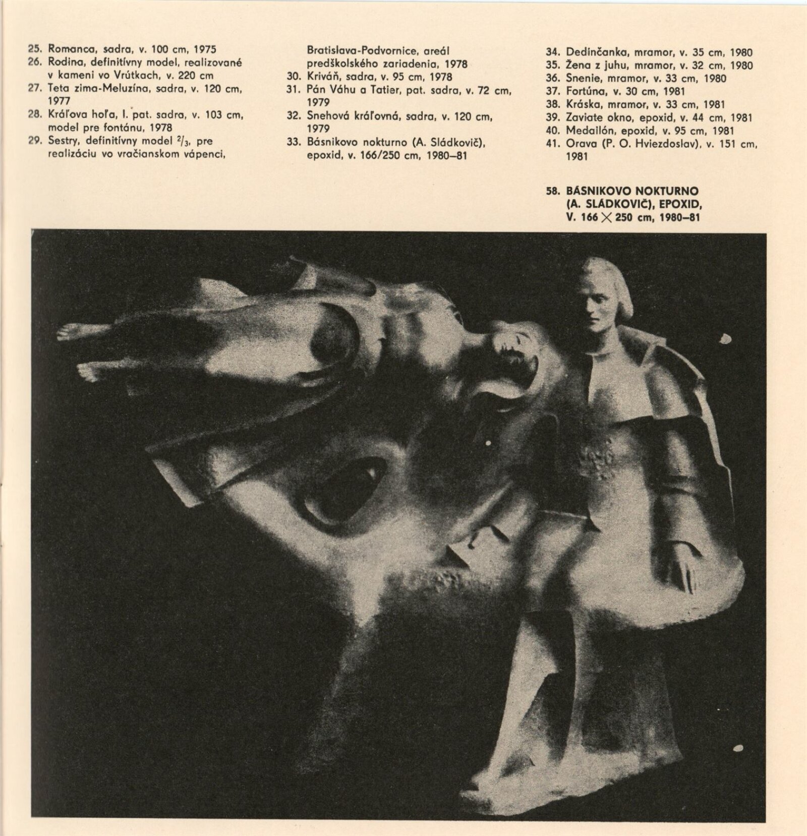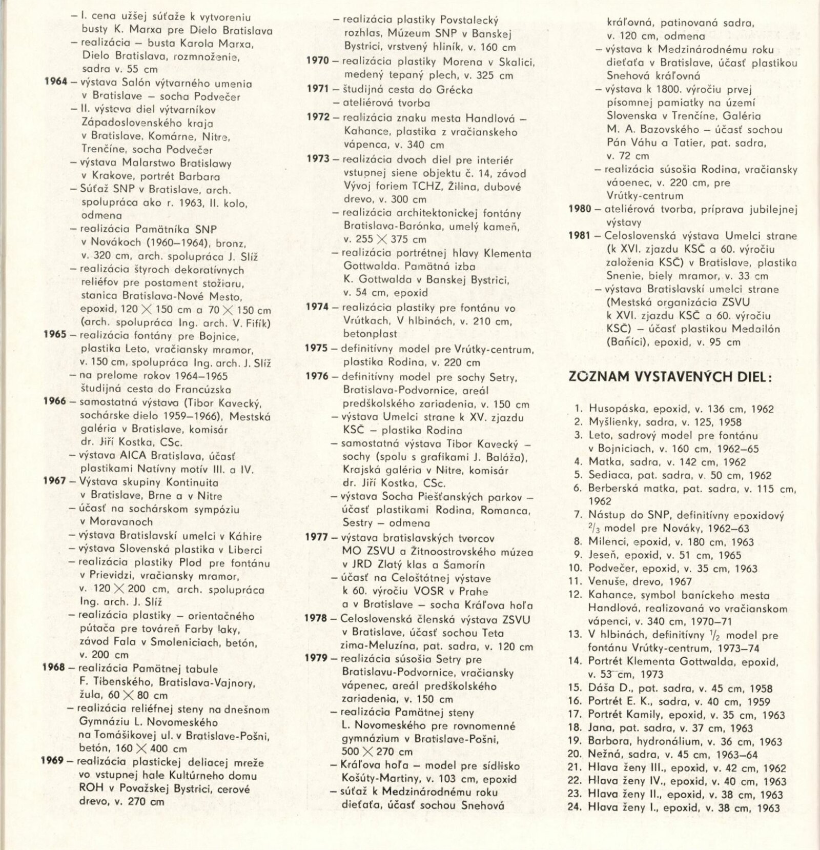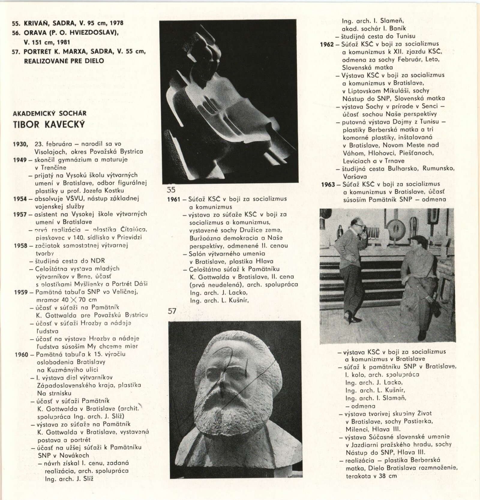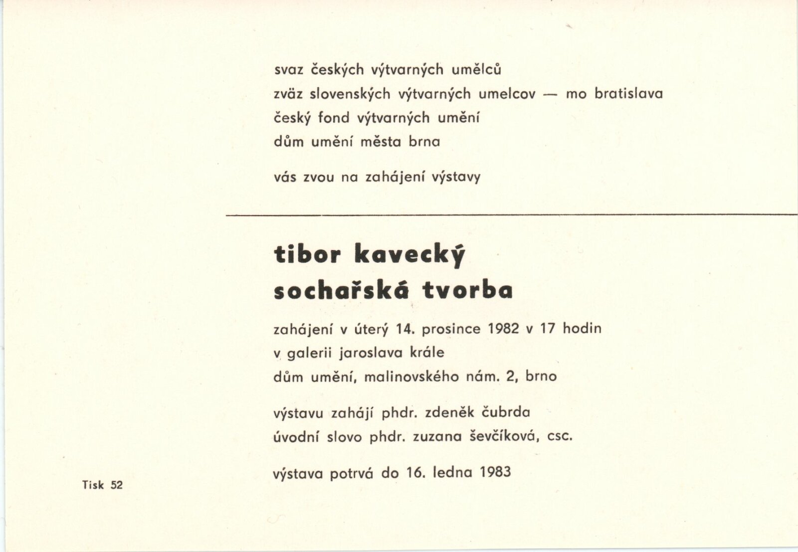 Tibor Kavecký. Sochařská tvorba: Dům umění, Galerie Jaroslava Krále, 14. 12. 1982 – 23. 1. 1983 / Převzatý katalog. Tibor Kavecký. Socharské dielo: Bratislava, Výstavná sieň ZSVU, únor–březen 1982 / Text: Zuzana Ševčíková. – Bratislava: Mestská organizácia ZSVU, 1982. – 33 s., obr., životní data, DU 754