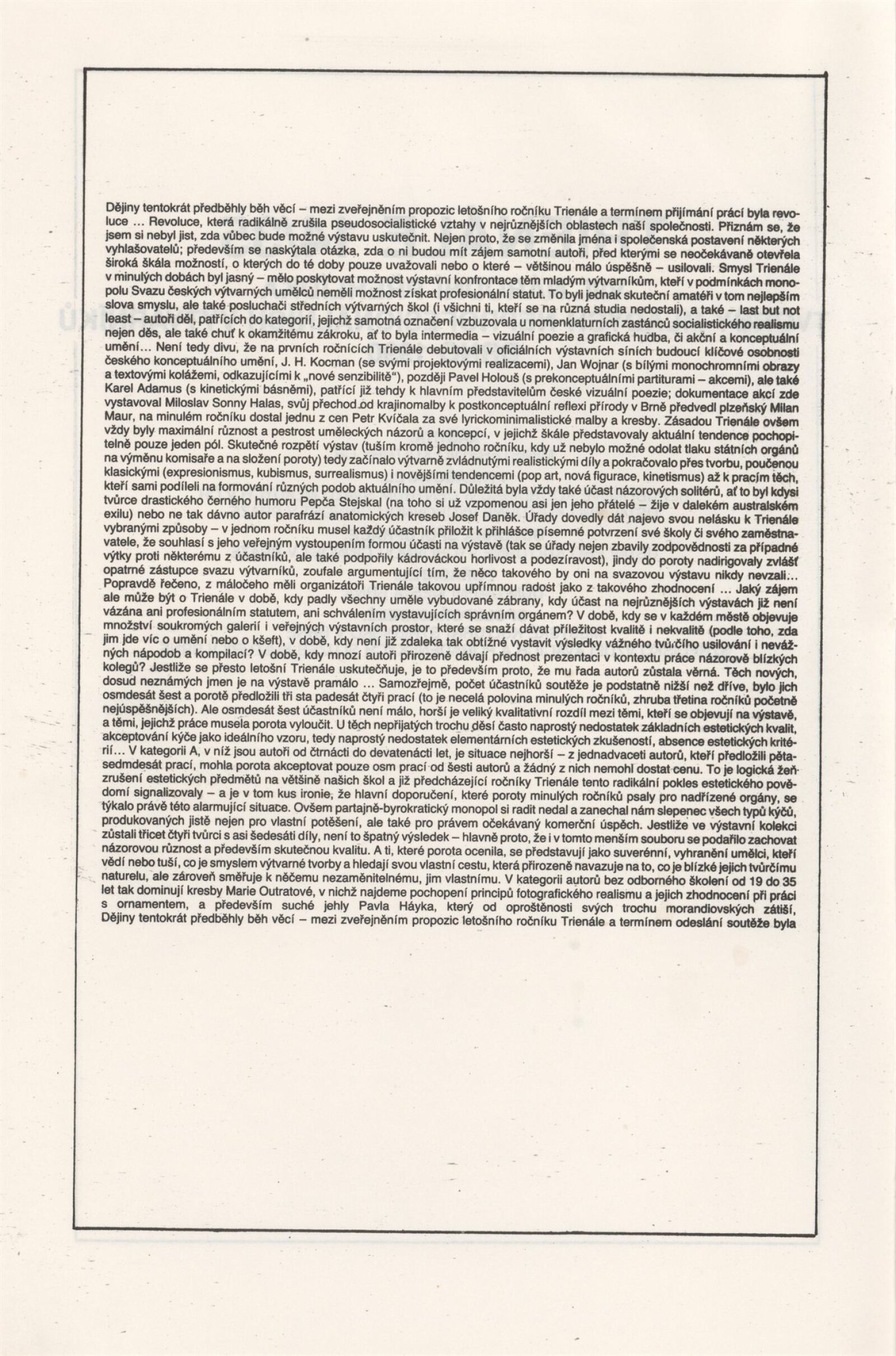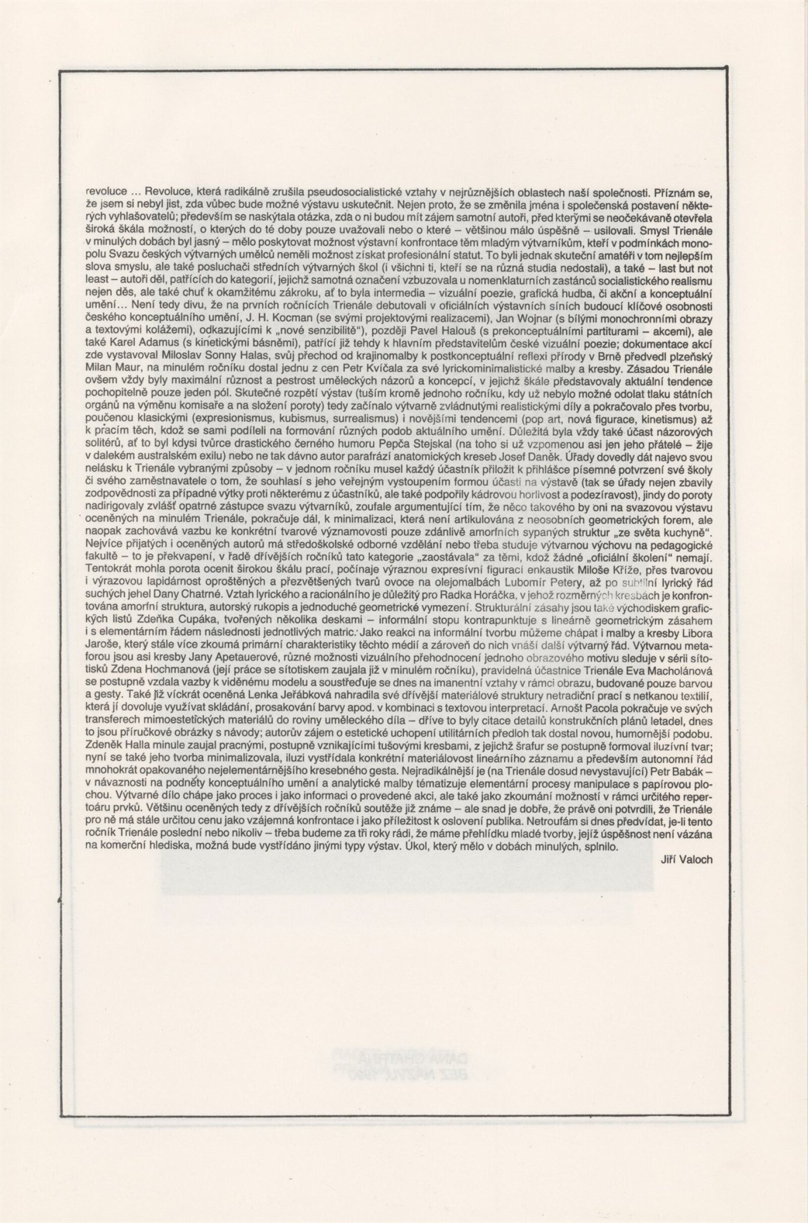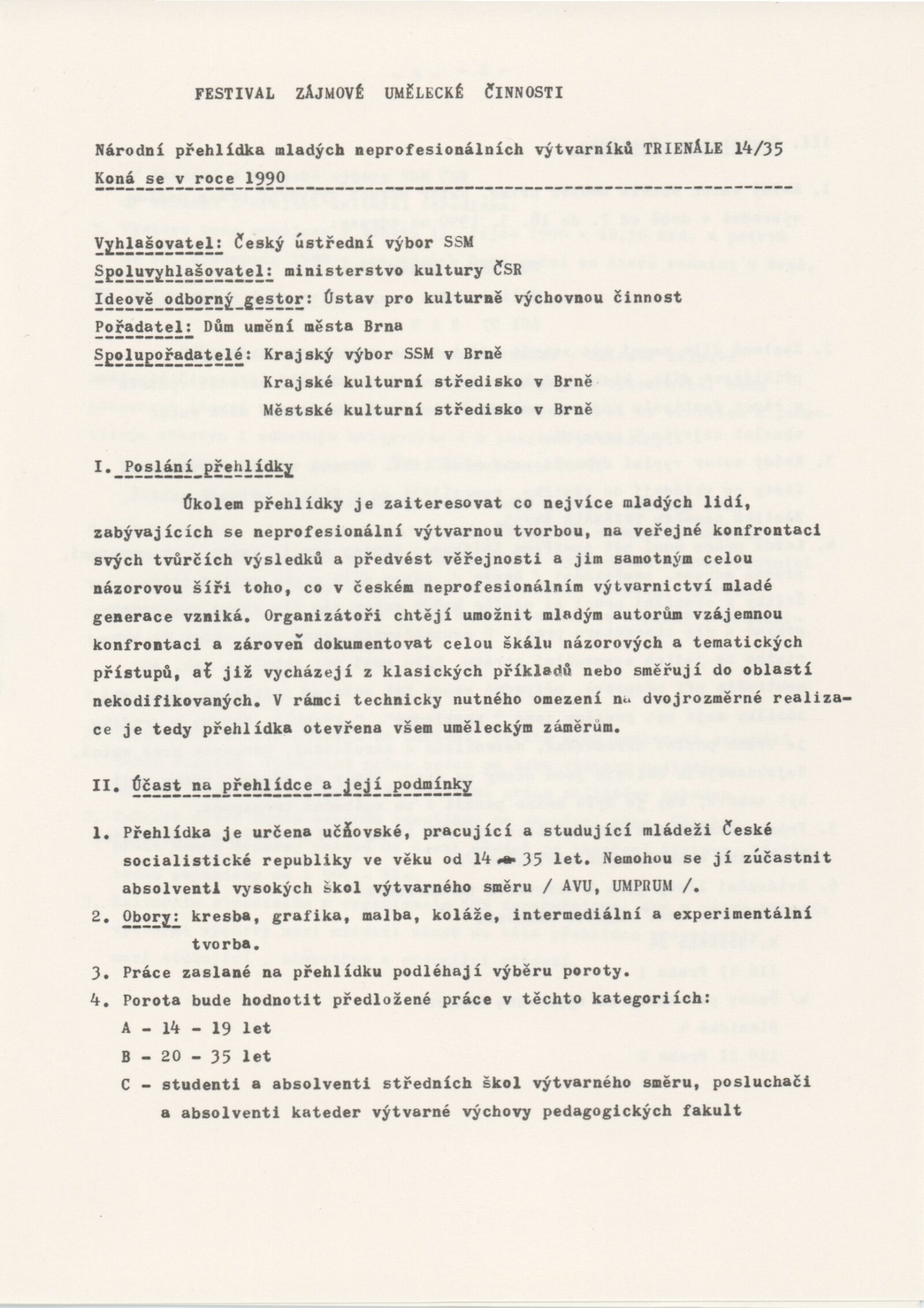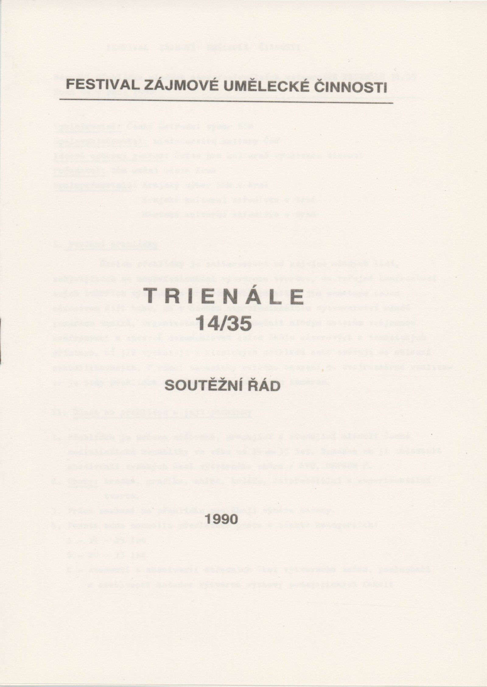 Trienále 14/35. VIII. národní přehlídka mladých neprofesionálních výtvarníků Brno 1990: Galerie Stará radnice, podkroví, 13. 10. – 18. 11. 1990 / Text: Jiří Valoch. – Brno: DUmB, 1990. – [20] s., obr., GSR 81. – MG