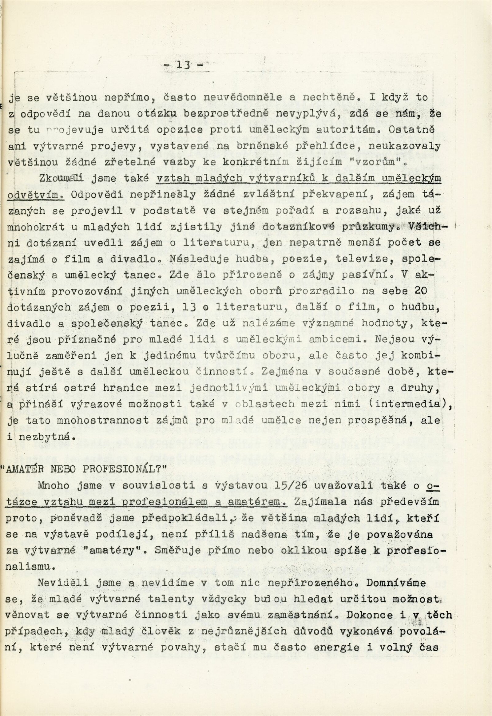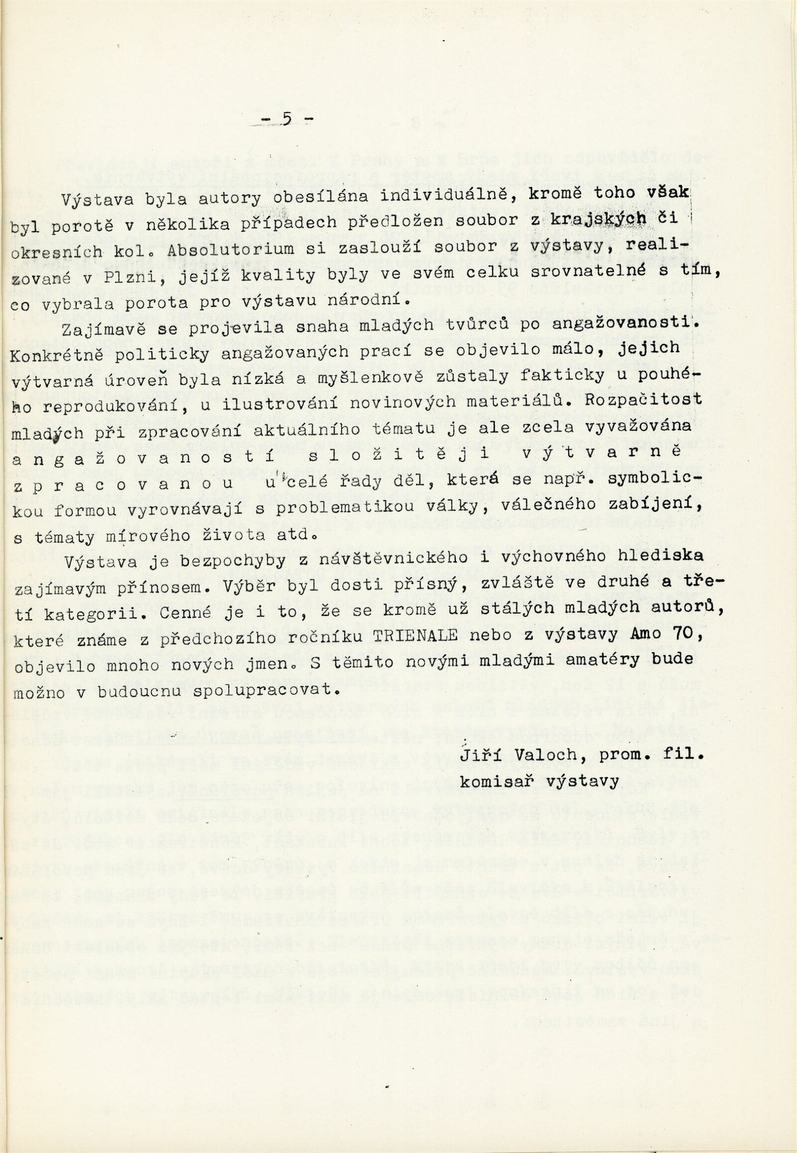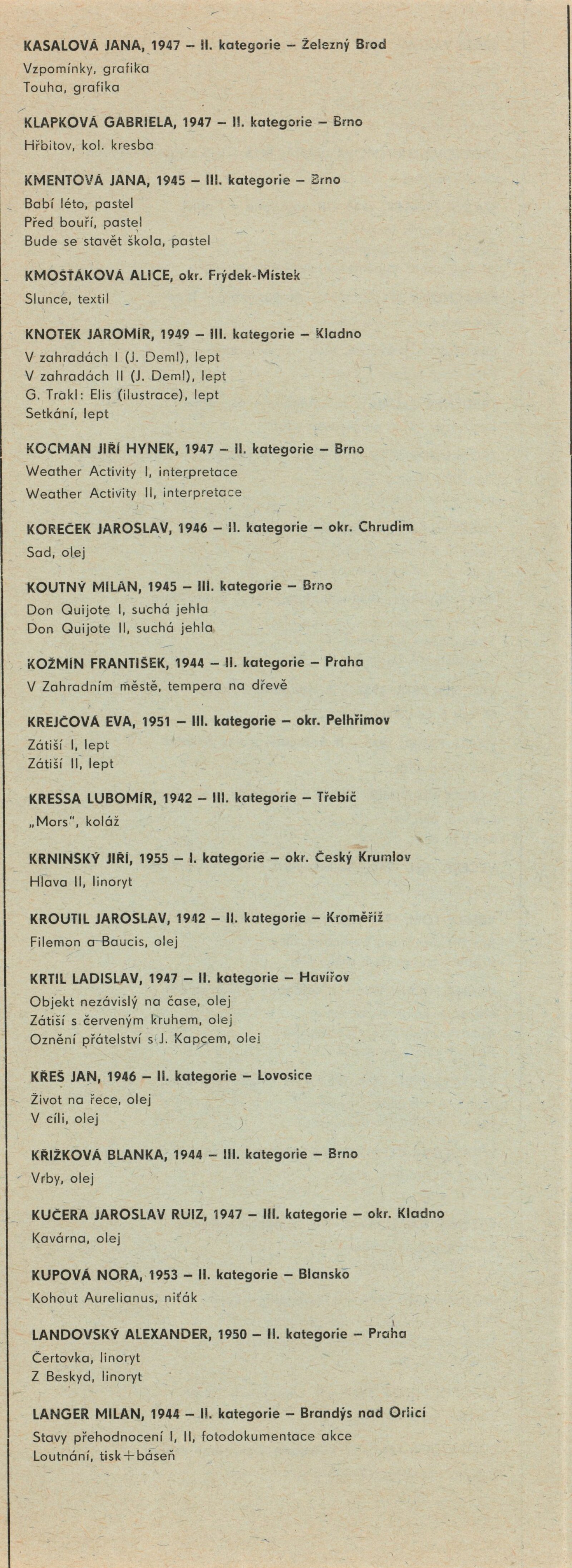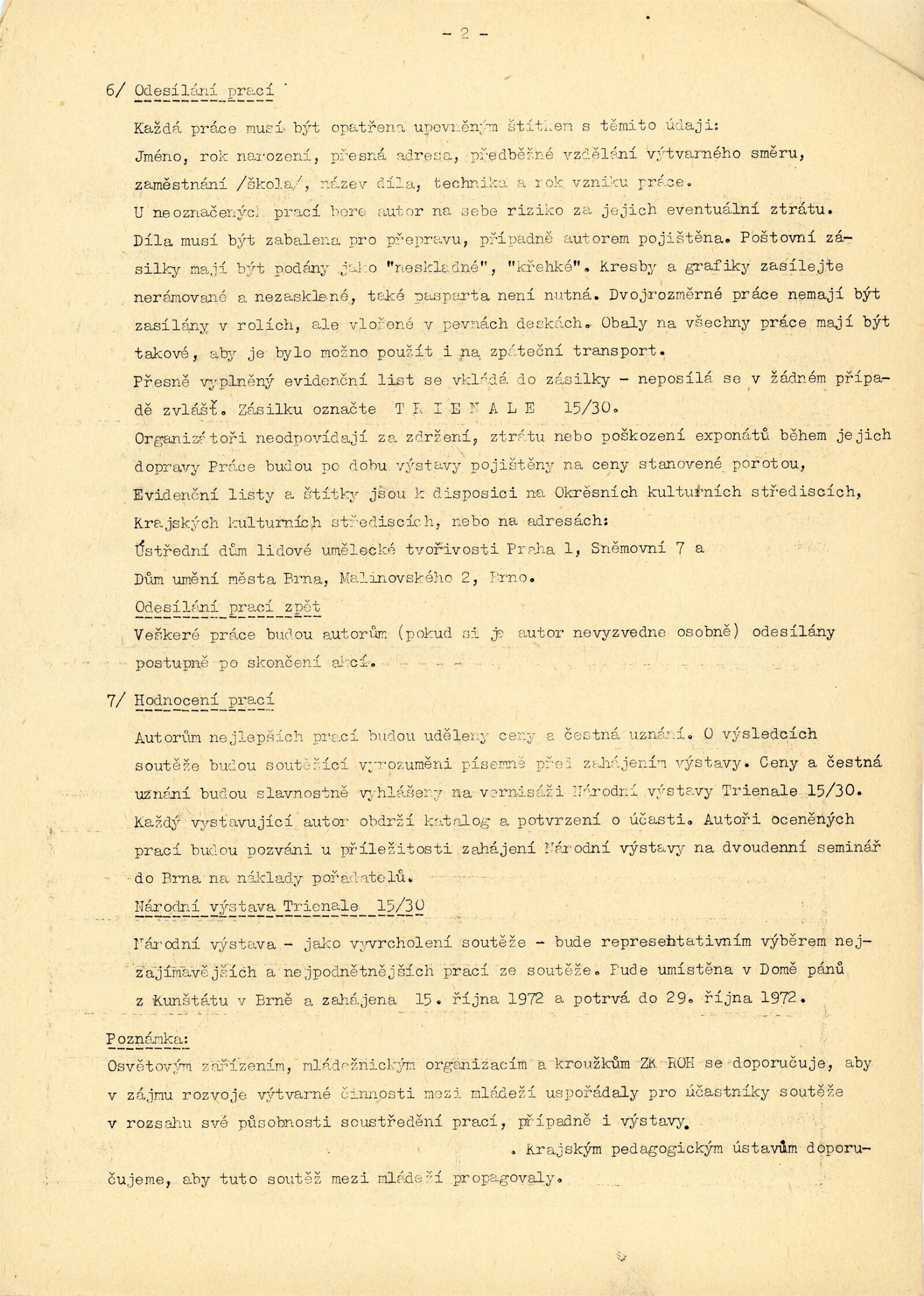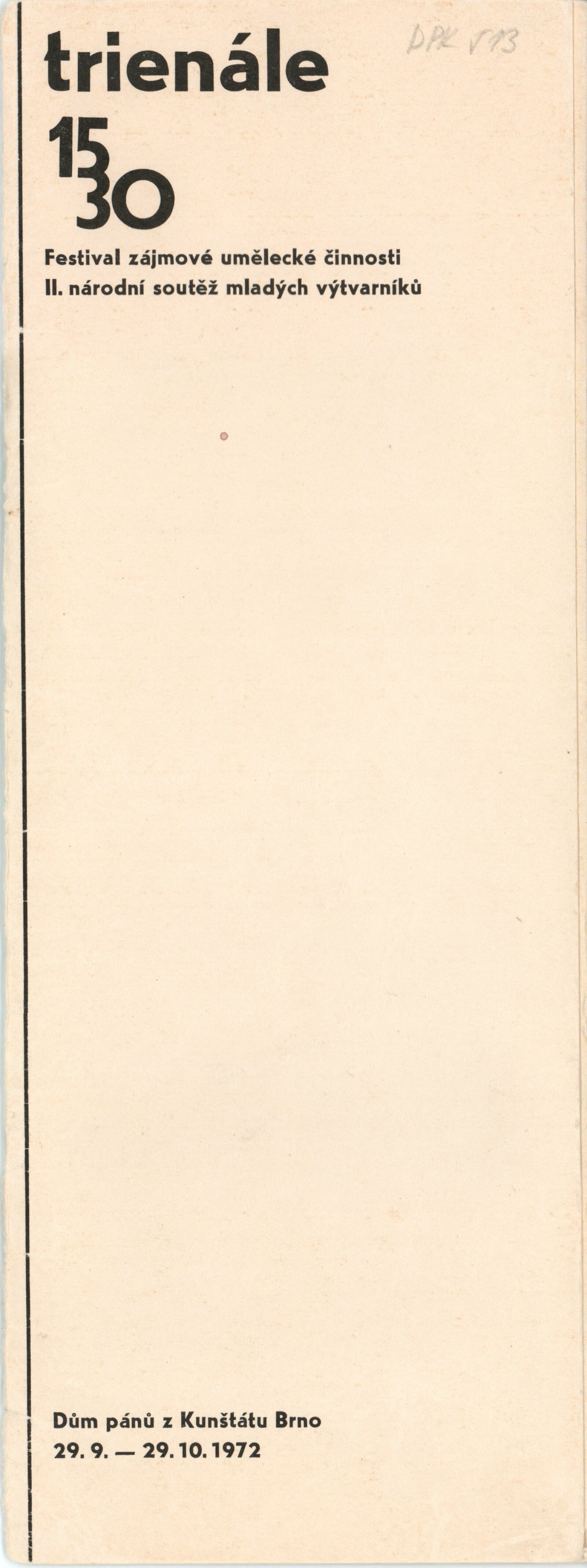 Trienále 15/30. II. národní soutěž mladých výtvarníků: Dům umění města Brna / Dům pánů z Kunštátu 29. 9. – 29. 10. 1972 / Text: Jiří Valoch. – Brno: DUmB, 1972. – 16 s., obr., seznam vystavených prací, skládačka (6 s.), festival zájmové umělecké činnosti, DPK 513. – MZK; MG
