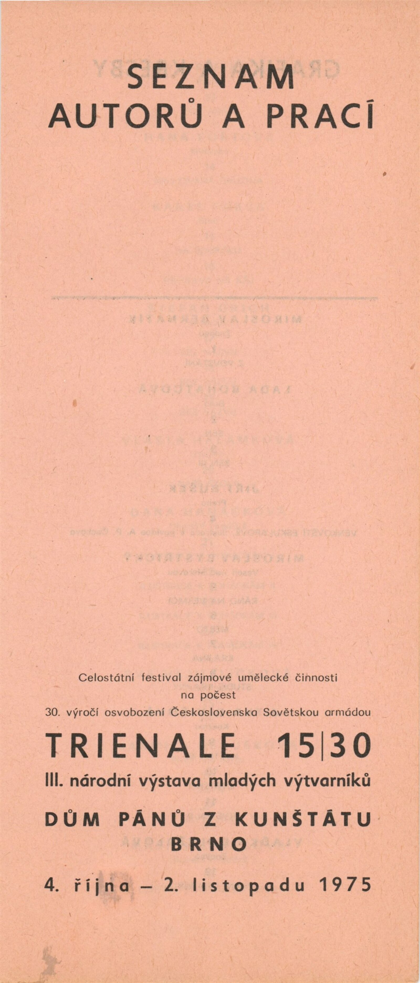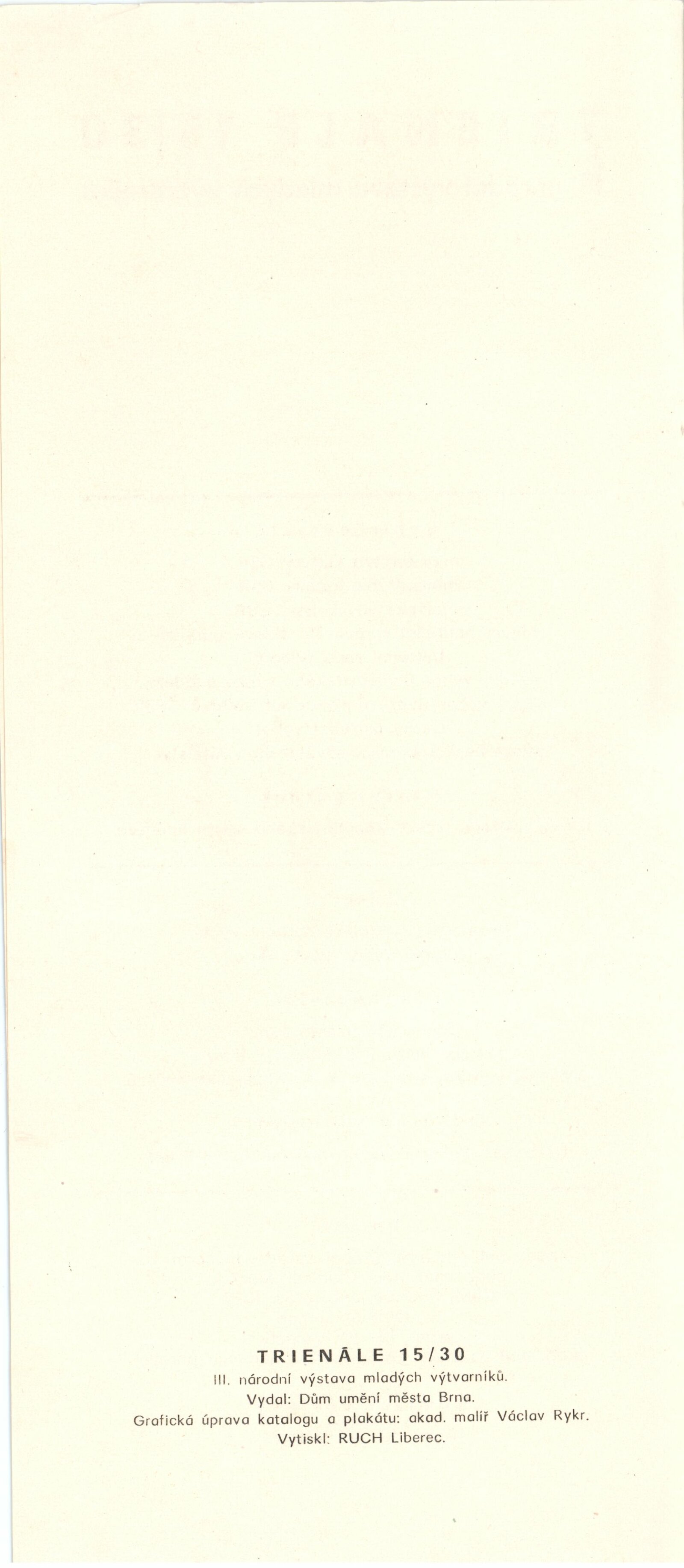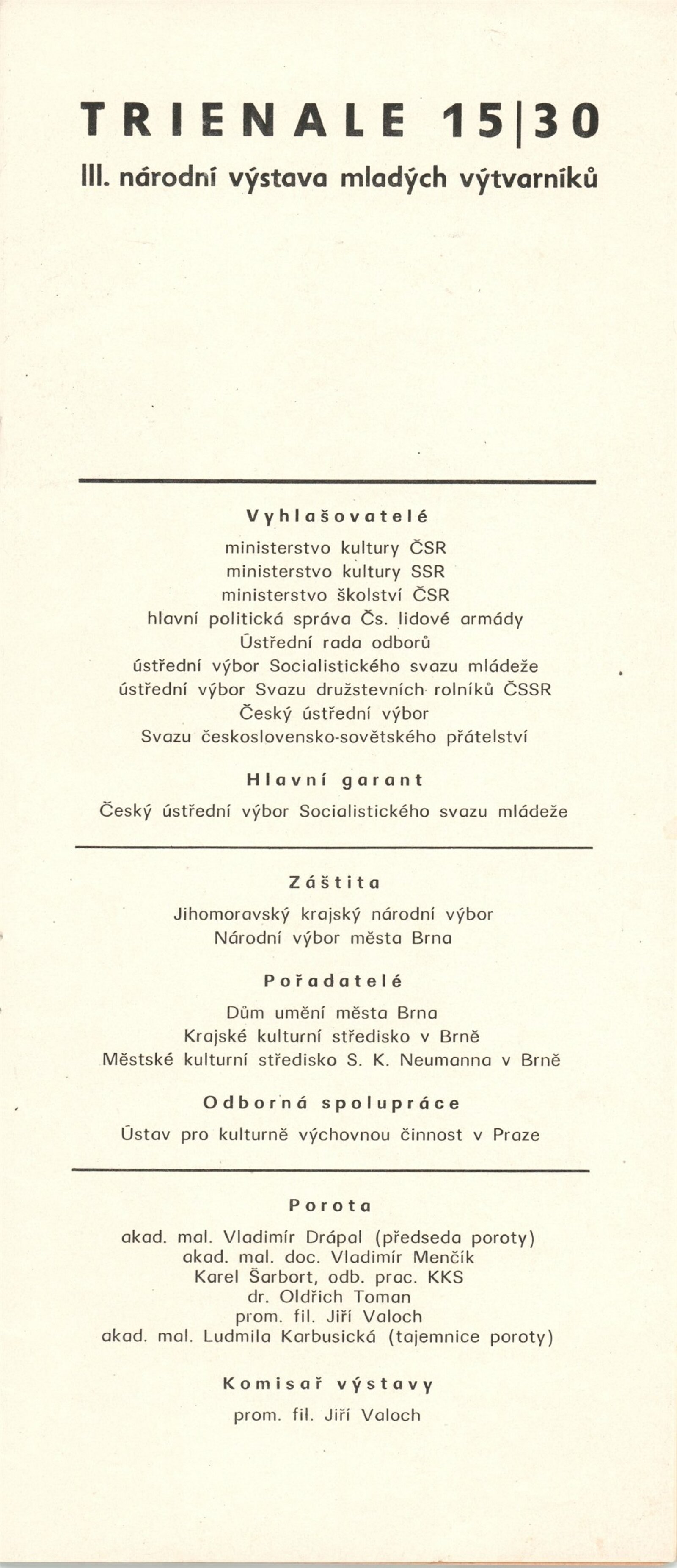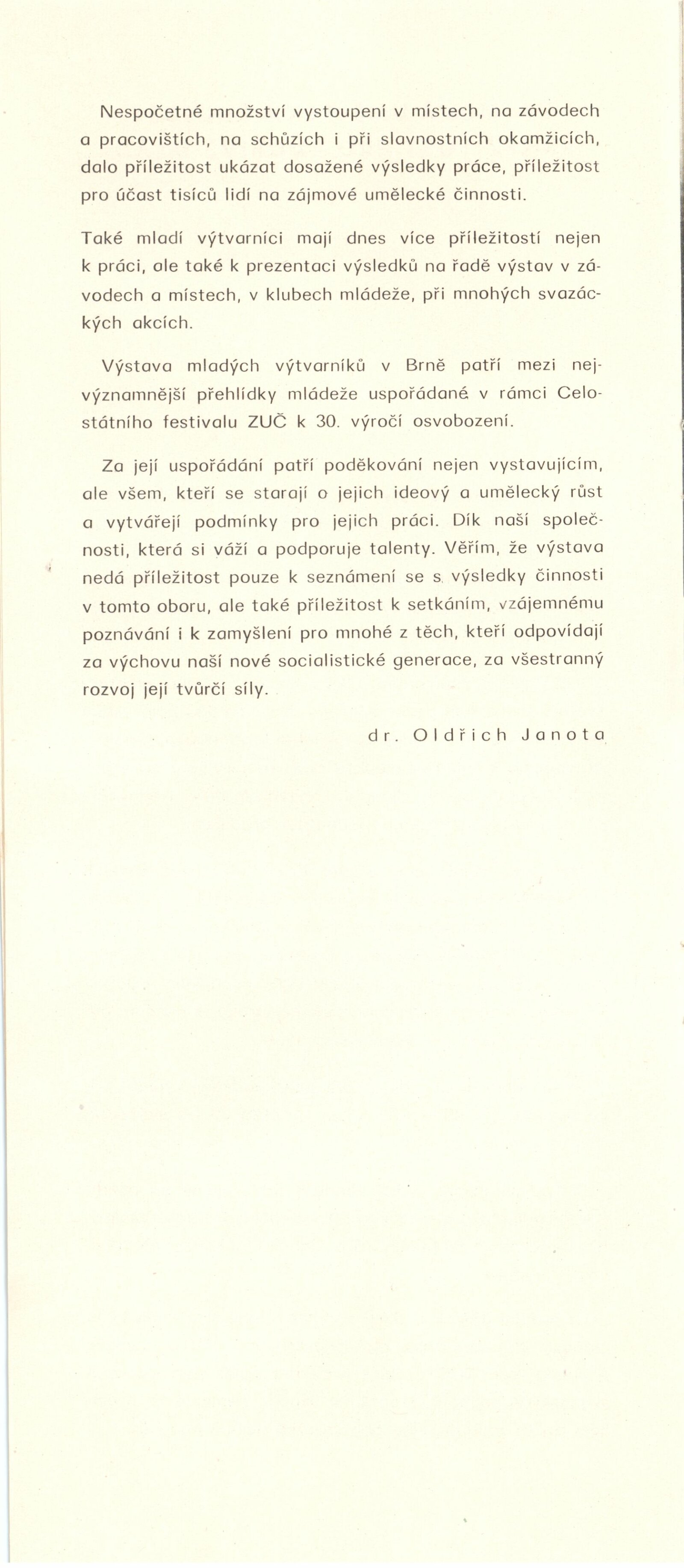 Trienále 15/30. III. národní výstava mladých výtvarníků: Dům umění / Dům pánů z Kunštátu, 4. 10. – 2. 11. 1975 / Texty: Oldřich Janota, Jiří Valoch. – Brno: DUmB, 1975. – 12 s., obr., seznam autorů a prací 12 s., celostátní festival zájmové umělecké činnosti na počest 30. výročí osvobození Československa Sovětskou armádou, DPK 607