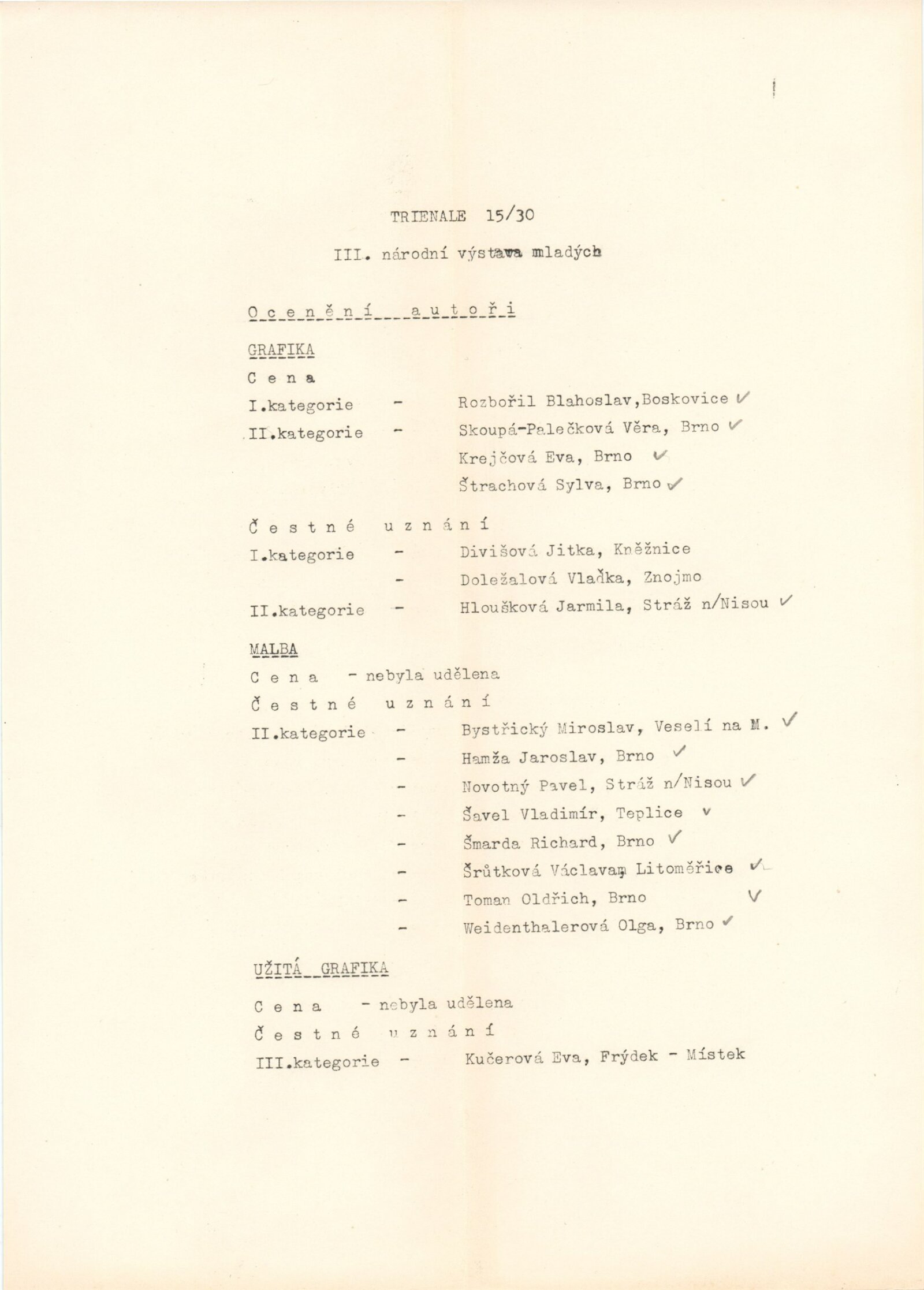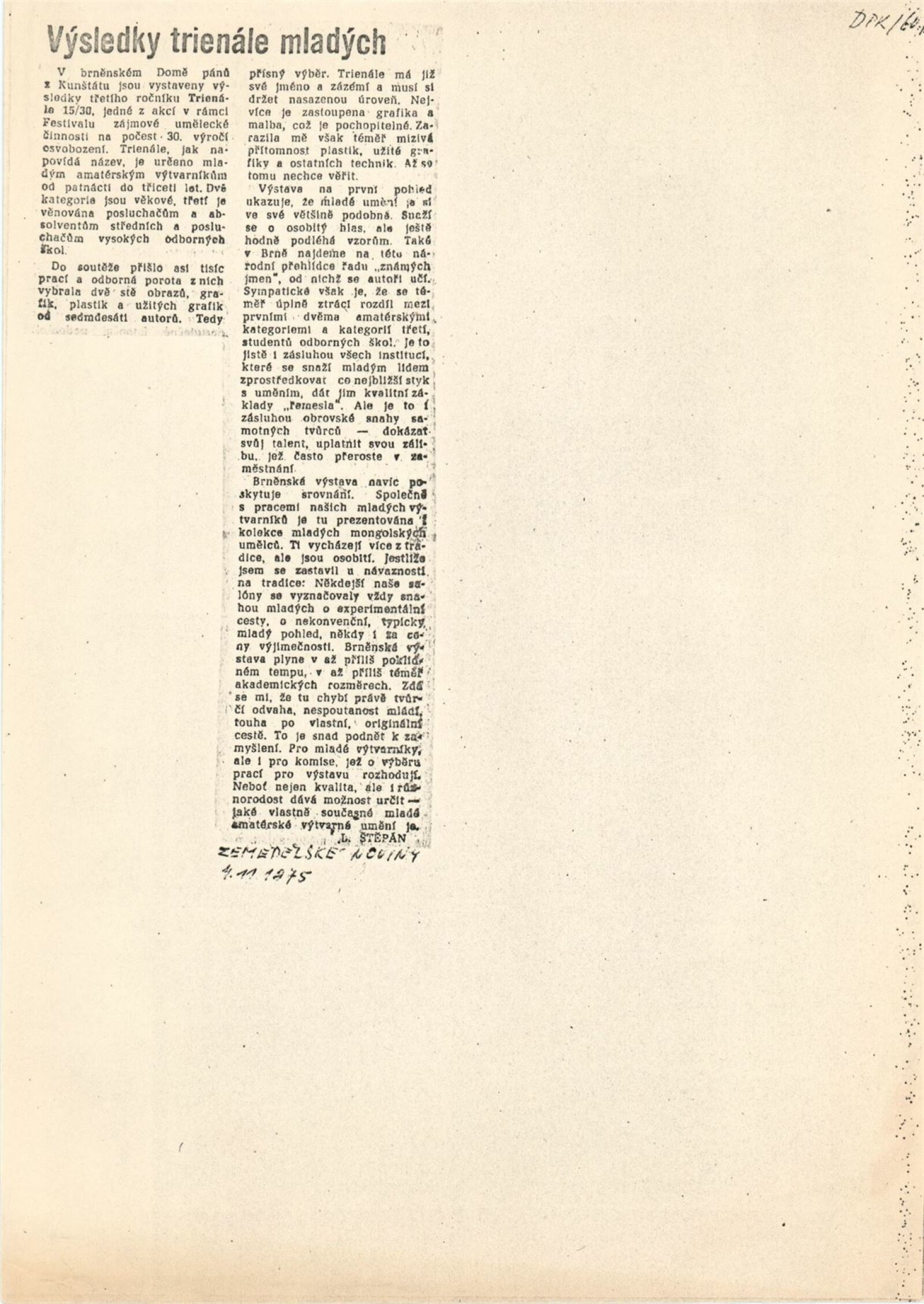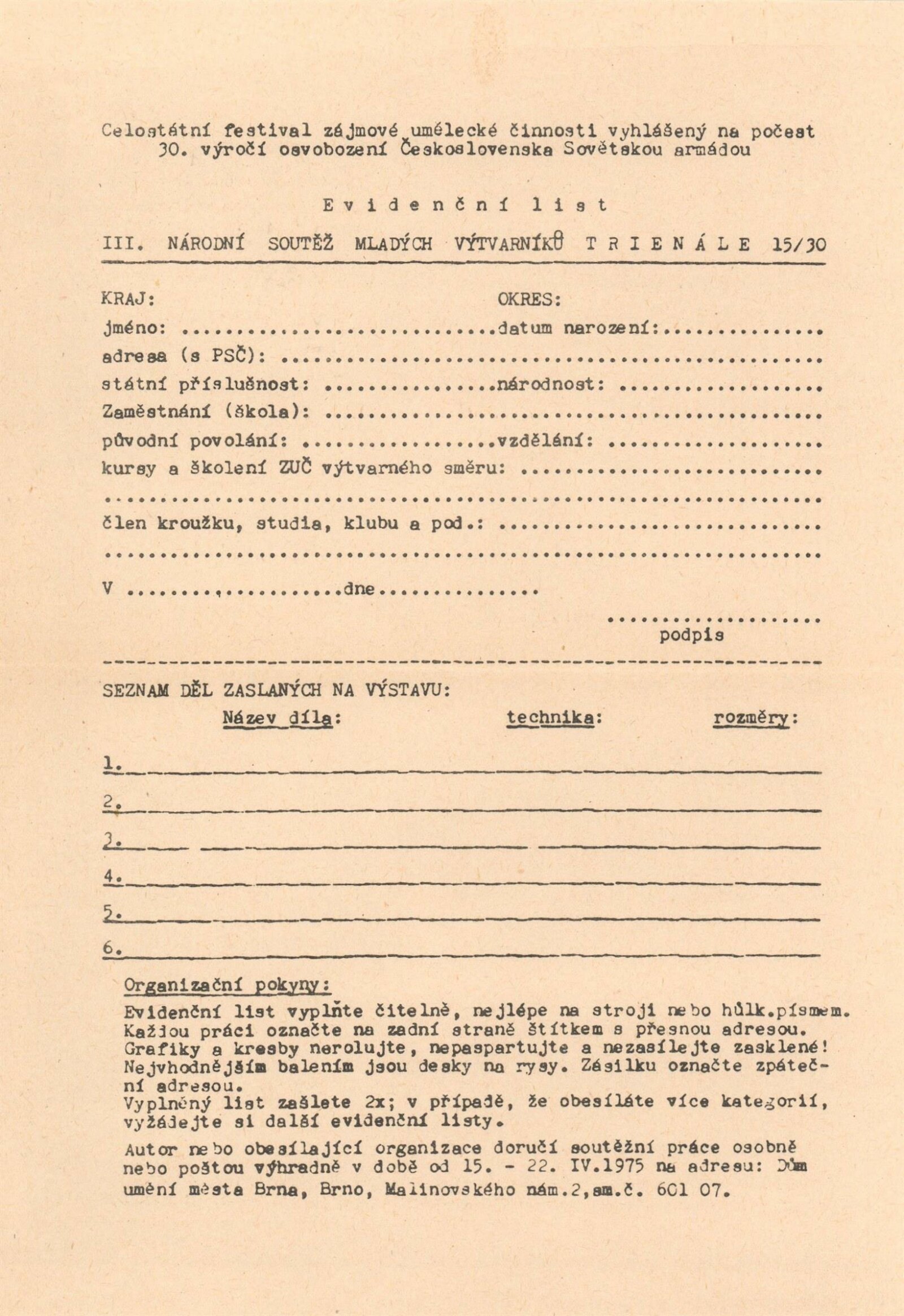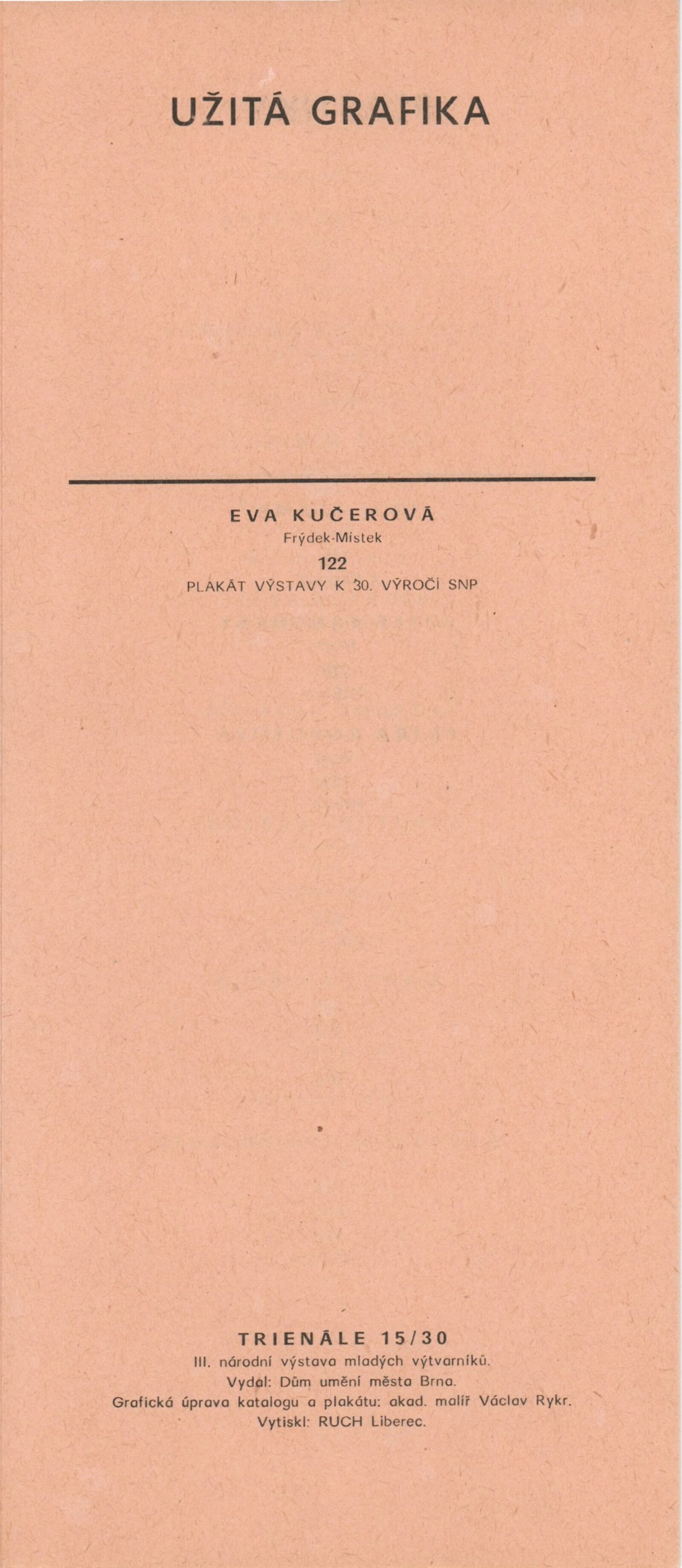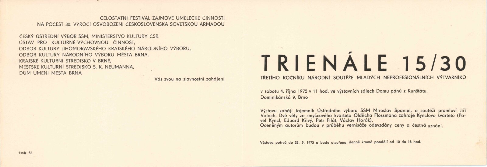 Trienále 15/30. III. národní výstava mladých výtvarníků: Dům umění / Dům pánů z Kunštátu, 4. 10. – 2. 11. 1975 / Texty: Oldřich Janota, Jiří Valoch. – Brno: DUmB, 1975. – 12 s., obr., seznam autorů a prací 12 s., celostátní festival zájmové umělecké činnosti na počest 30. výročí osvobození Československa Sovětskou armádou, DPK 607