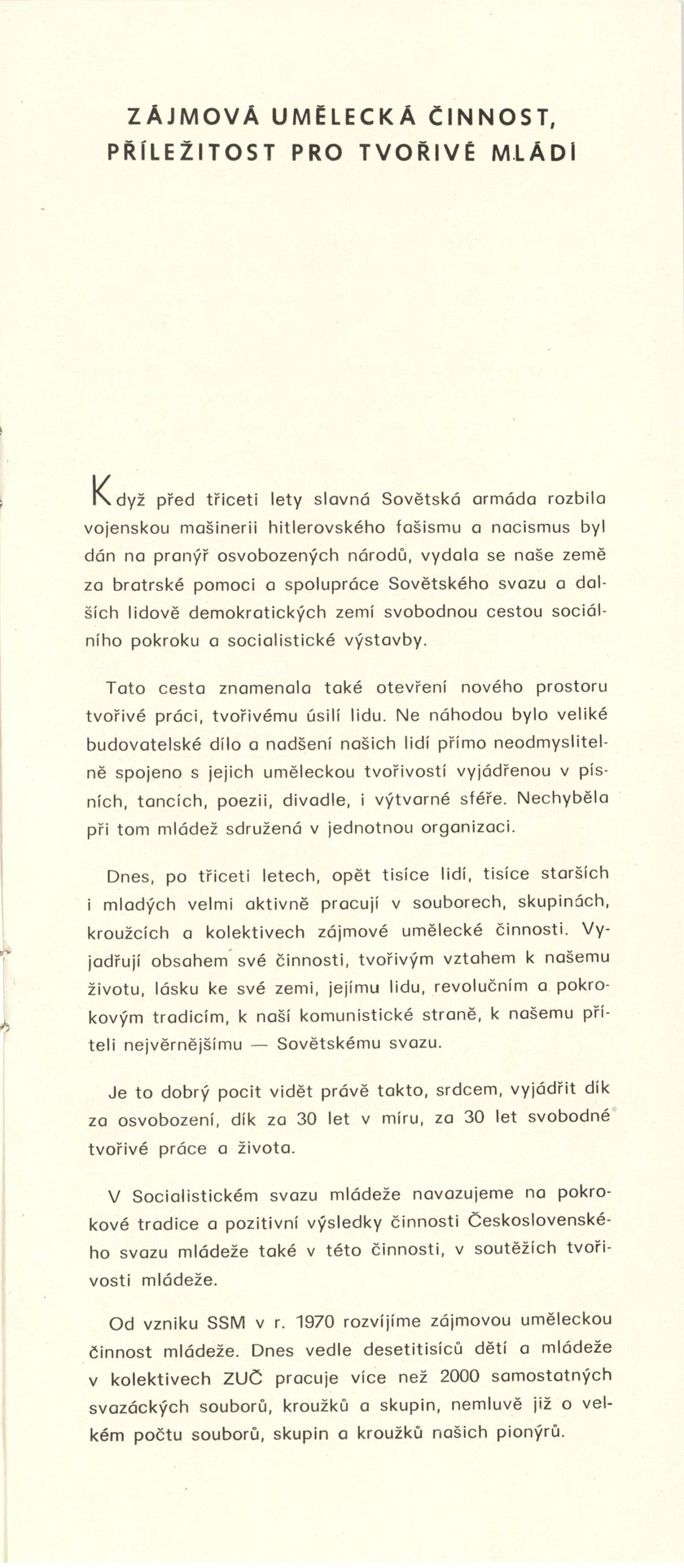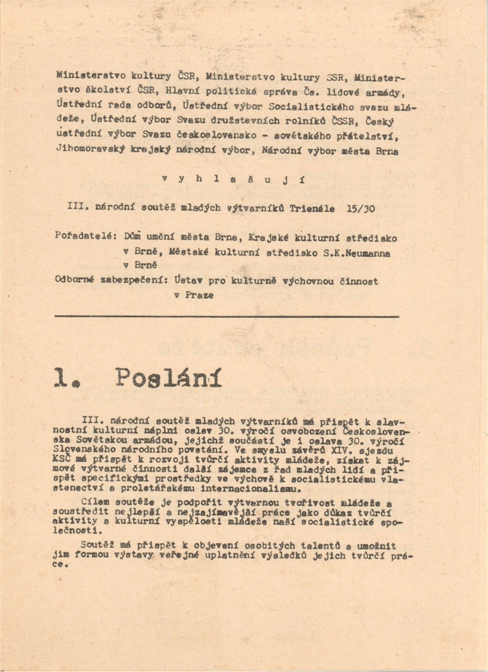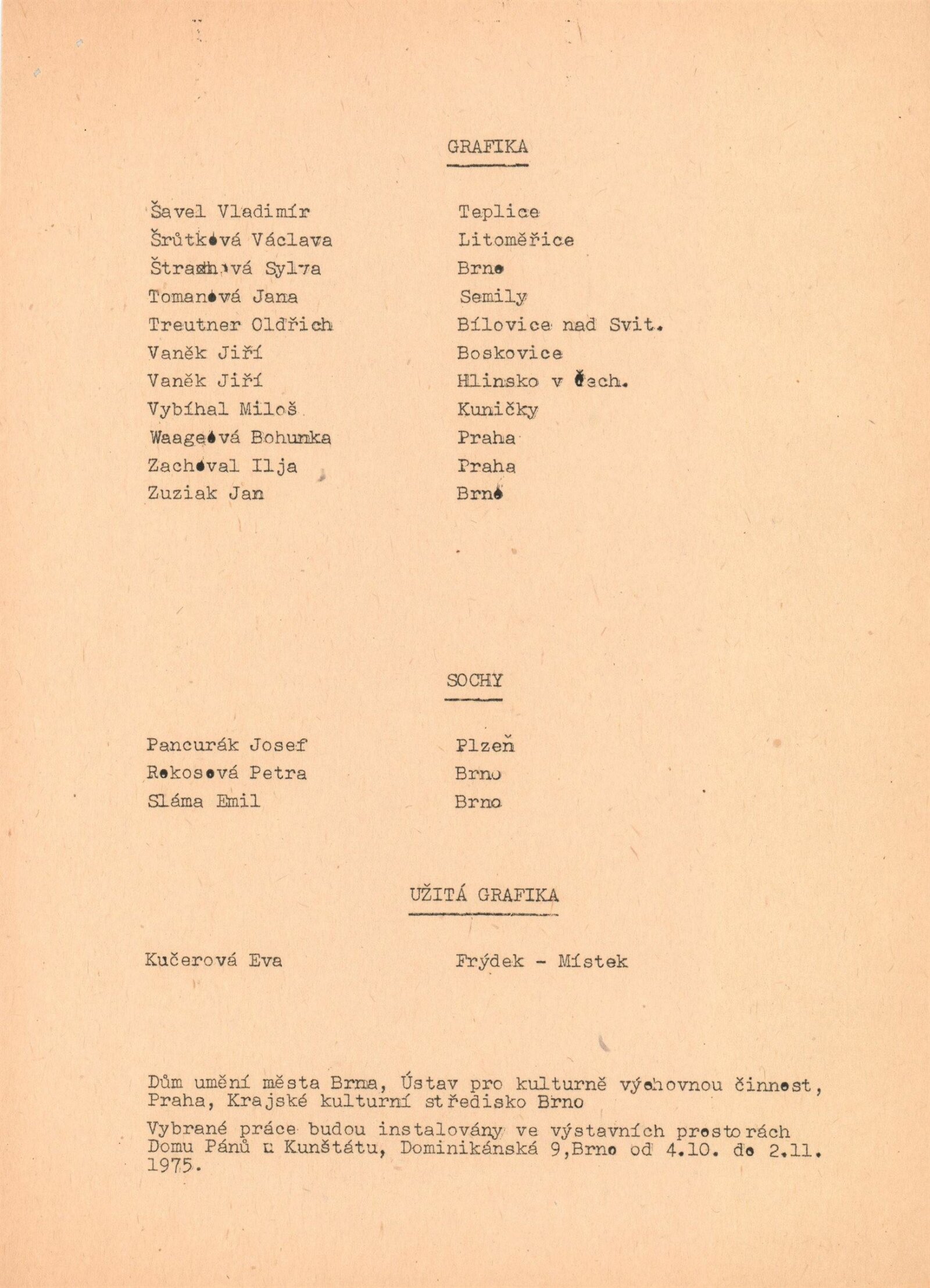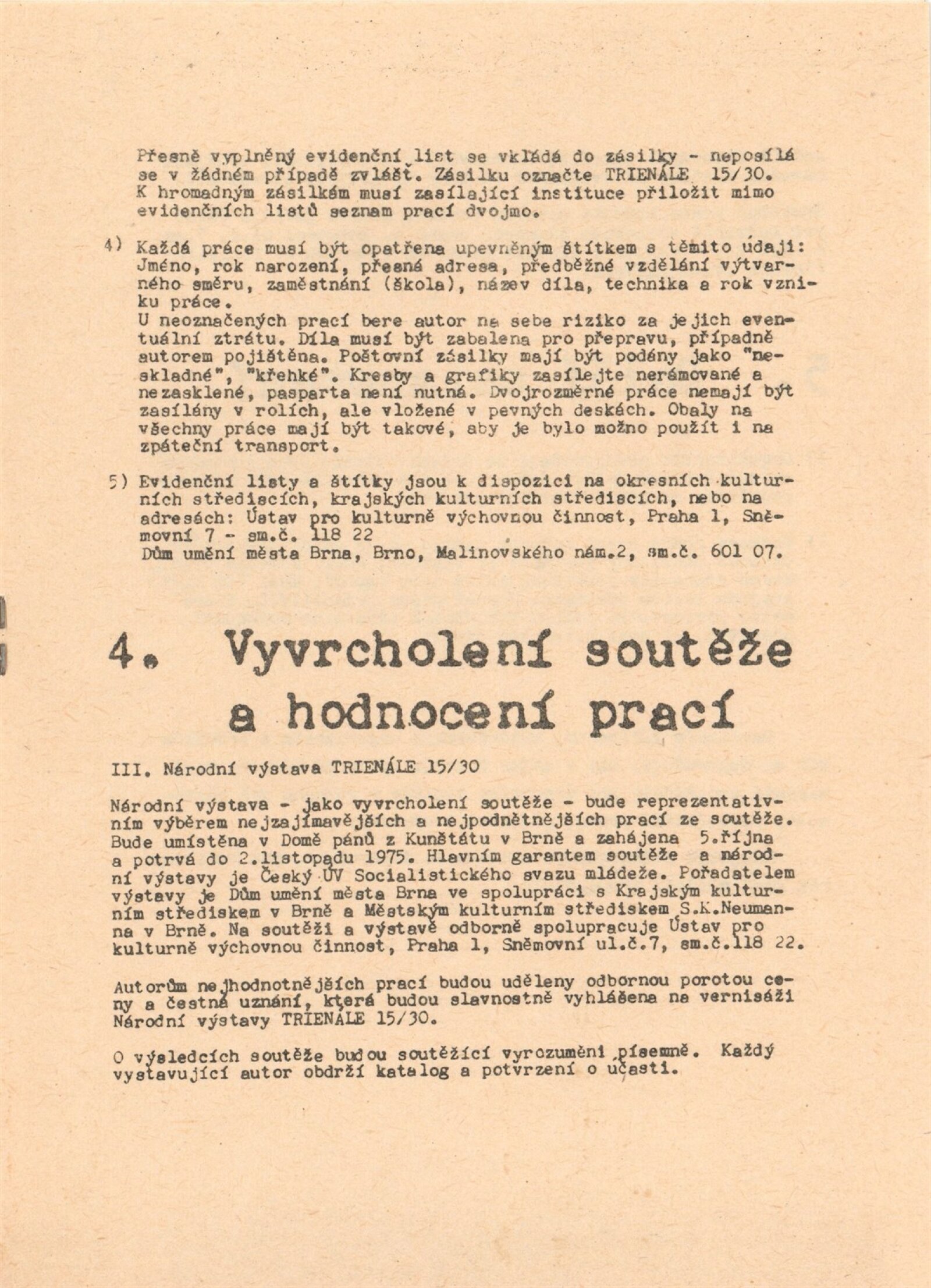 Trienále 15/30. III. národní výstava mladých výtvarníků: Dům umění / Dům pánů z Kunštátu, 4. 10. – 2. 11. 1975 / Texty: Oldřich Janota, Jiří Valoch. – Brno: DUmB, 1975. – 12 s., obr., seznam autorů a prací 12 s., celostátní festival zájmové umělecké činnosti na počest 30. výročí osvobození Československa Sovětskou armádou, DPK 607