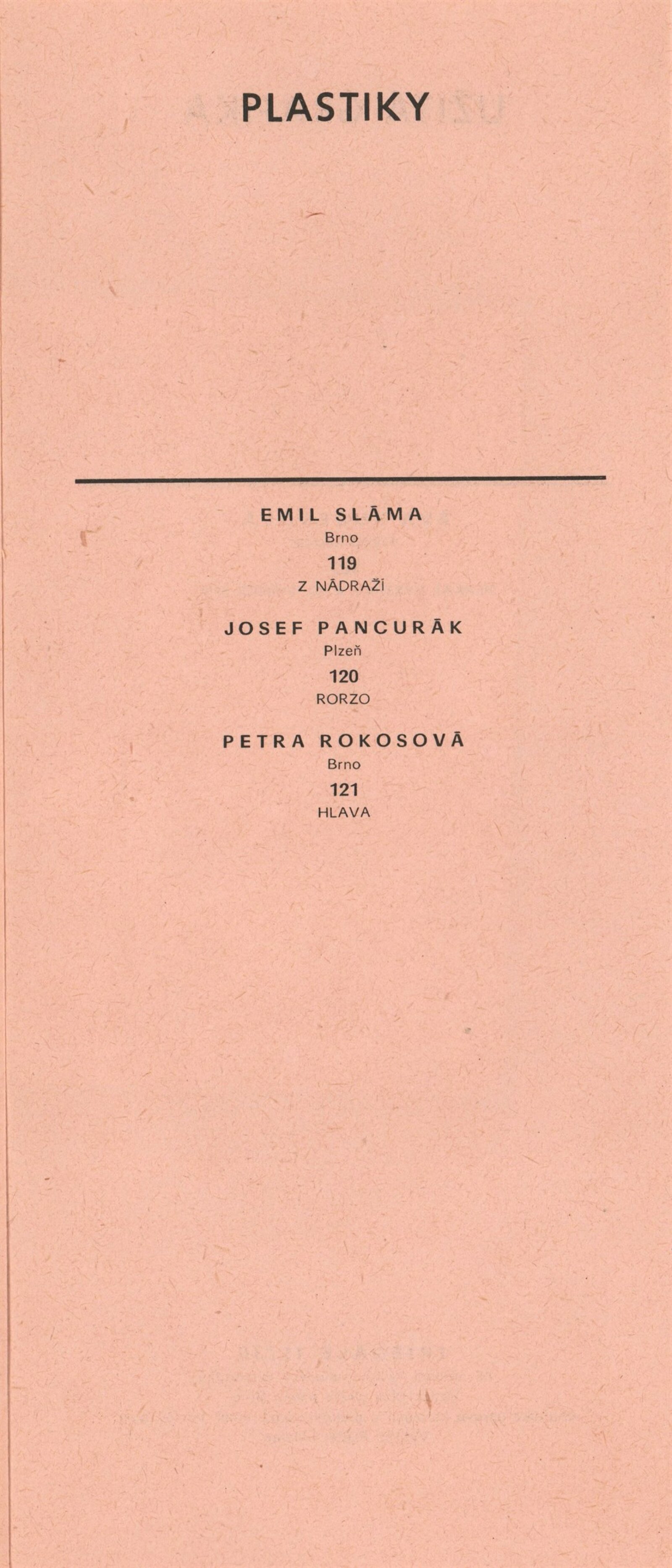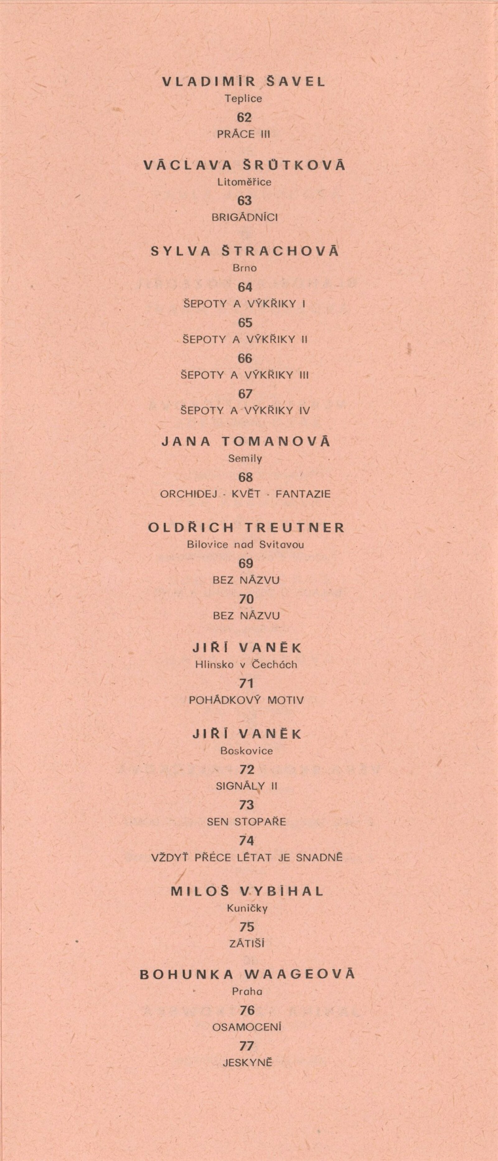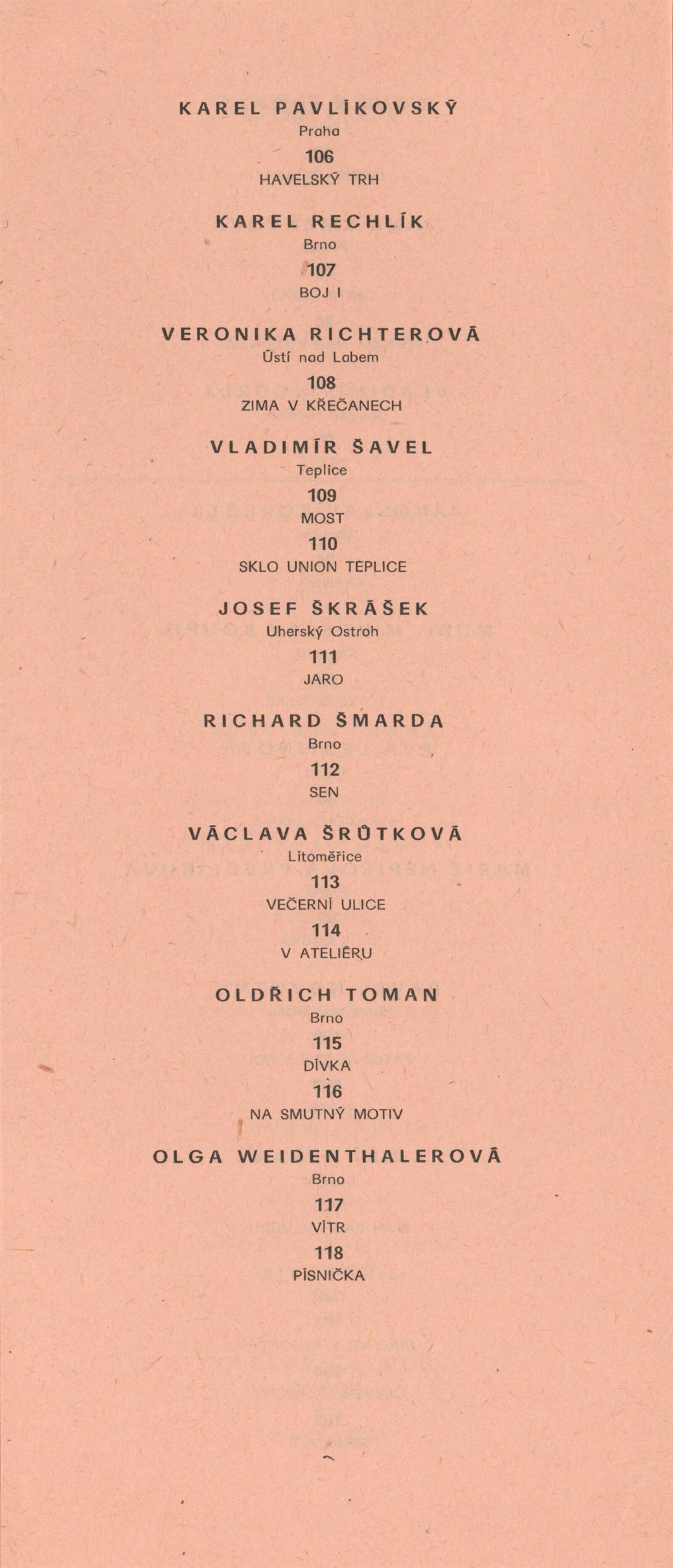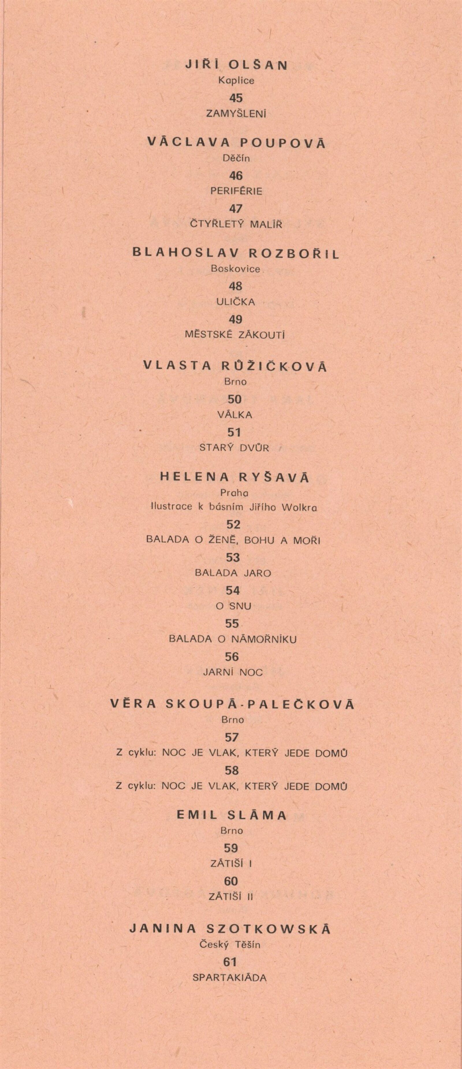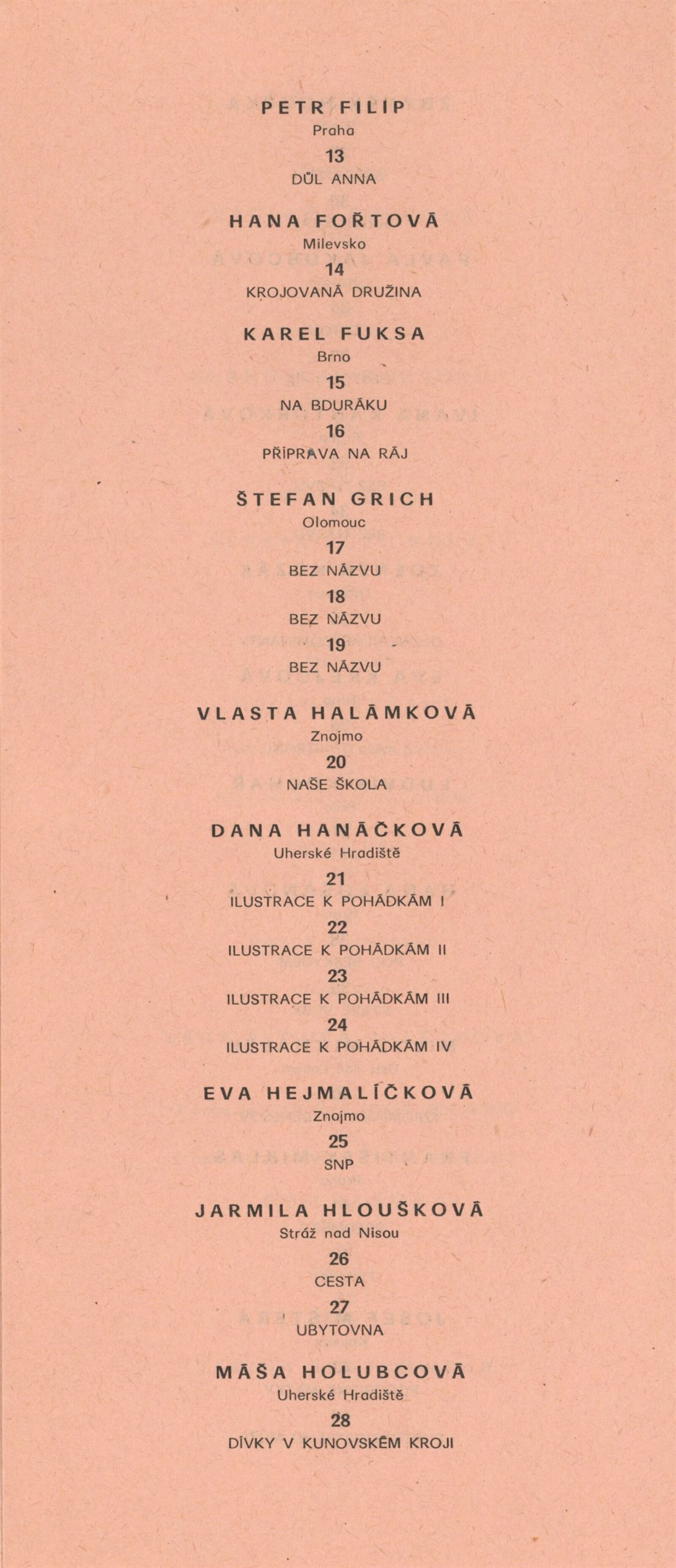 Miroslav Bernatík, Lada Bohatcová, Jiří Bušek, Miroslav Bystřický, Jitka Divišová, Vlaďka Doležalová, Petr Filip, Hana Fořtová, Karel Fuksa, Štefan Grich, Vlasta Halámková, Dana Hanáčková, Eva Hejmalíčková, Jarmila Hloušková, Máša Holubcová, Zbyněk Houška, Pavla Jakubcová, Ivana Kantůrková, Zdeněk Kozák, Eva Krejčová, Ludvík Kuchař, Hana Lošanová, Miloš Michálek, František Miklas, Josef Mištera, Jiří Olšan, Václava Poupová, Blahoslav Rozbořil, Vlasta Růžičková, Helena Ryšavá, Věra Skoupá-Palečková, Emil Sláma, Janina Szotkowská, Vladimír Šavel, Václava Šrůtková, Sylva Štrachová, Jana Tomanová, Oldřich Treutner, Jiří Vaněk, Miloš Vybíhal, Bohunka Waagerová, Ilja Zachoval, Jan Zuziak, Vladimír Franz, Jaroslav Hamža, Jitka Hausmajerová, Ivan Havlík, Anděla Hemzová, Václav Kalouš, Roman Karpaš, Jana Kmentová, Vladimír Kodrla, Jaroslav Koreček, Miroslav Koupil, Eva Leštinová, Marie Nepilová-Preclíková, Pavel Novotný, Jiří Olšan, Jiří Pátík, Karel Pavlikovský, Karel Rechlík, Veronika Richterová, Josef Škrášek, Richard Šmarda, Oldřich Toman, Olga Weidenthalerová, Josef Pancurák, Petra Rokosová, Eva Kučerová