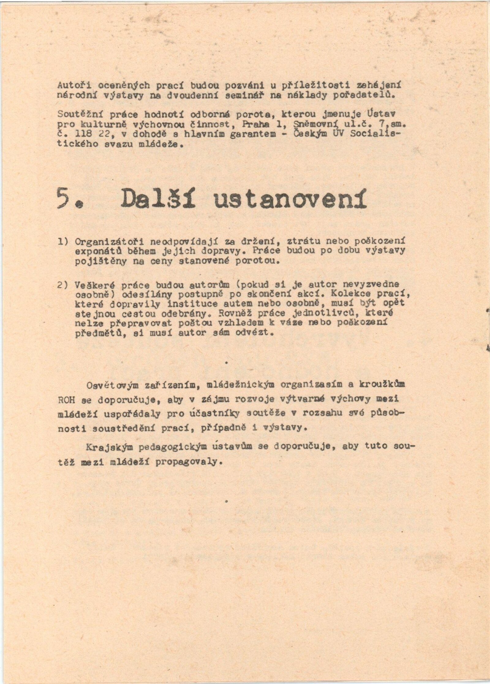 katalog výstavy, soutěžní řád celostátního festivalu zájmové umělecké činnosti, plakát trienále, seznam autorů a děl, ceny a čestná uznání, rezoluce oborového aktivu amatérského výtvarnictví, koncept výstavy, seznam čestných hostů pro pozvánky, prezenční listina tiskové besedy a schůze k trienále, návrh rozpočtu, dohoda o spolupráci na zajištění trienále, zpráva pro tisk, pozvání na tisk. besedu, provozní korespondence (Jiří Valoch a Jiří Rykr), doporučení autorů k účasti na trienále – bianco, žádost o povolení výstavy, recenze v tisku