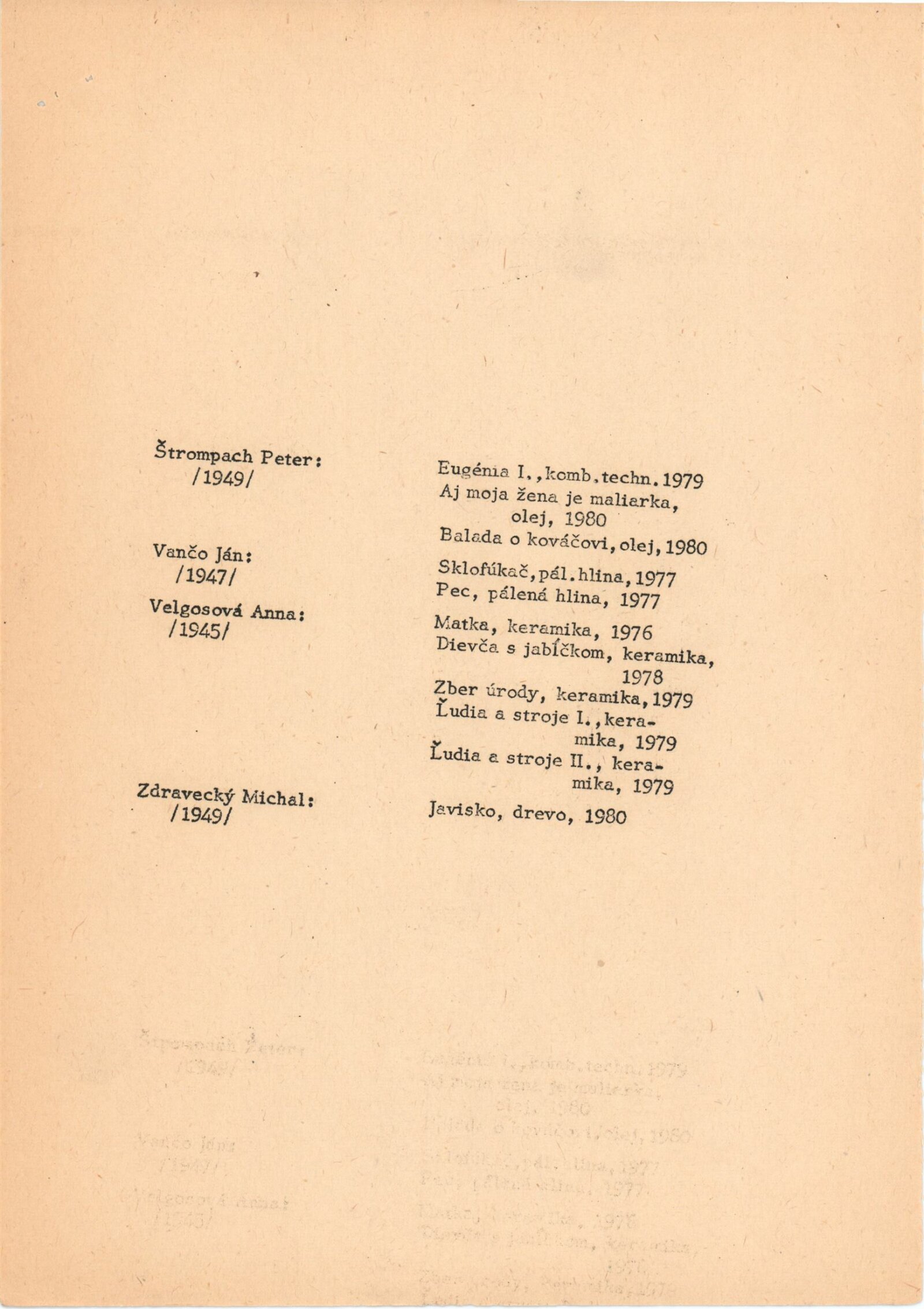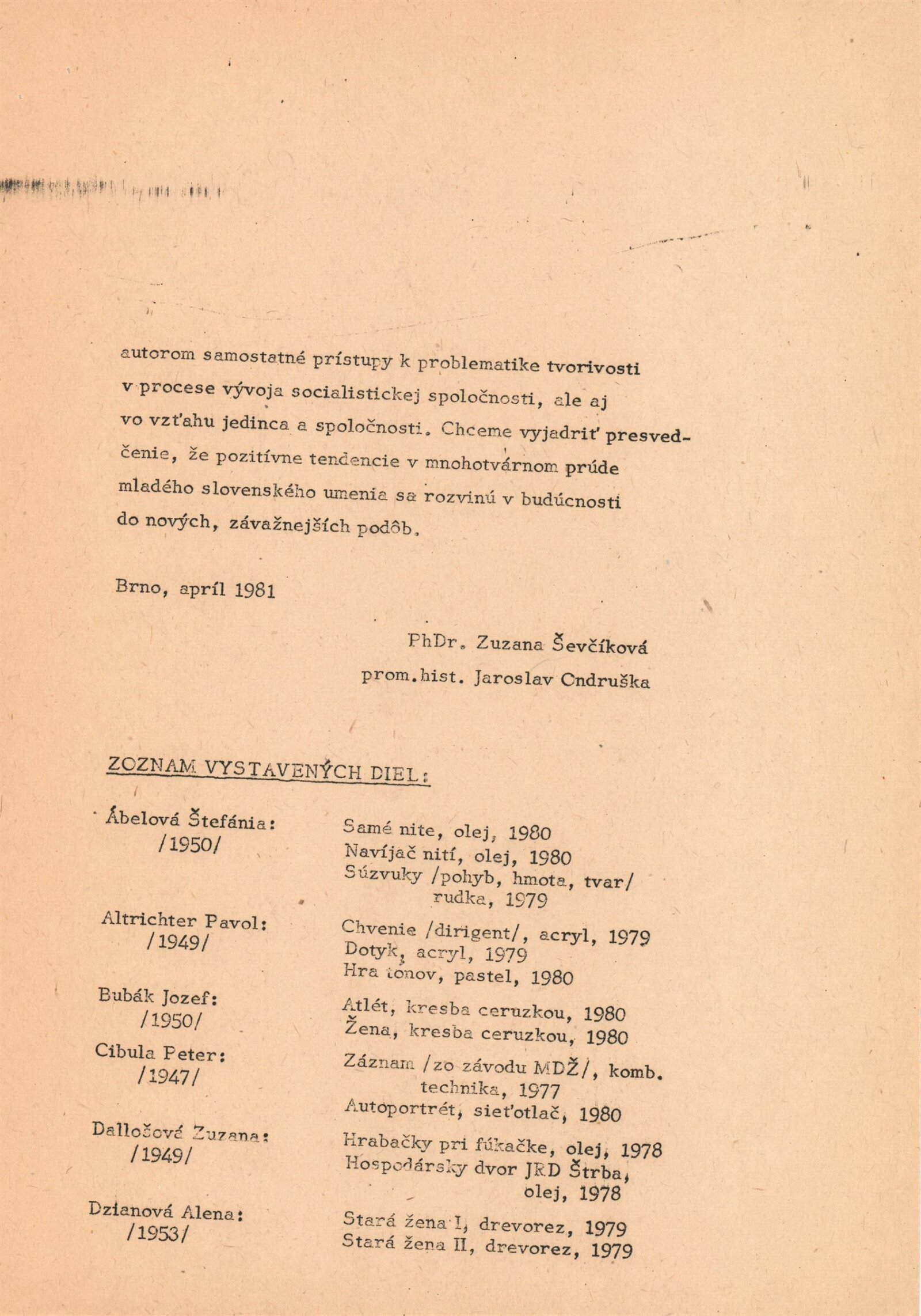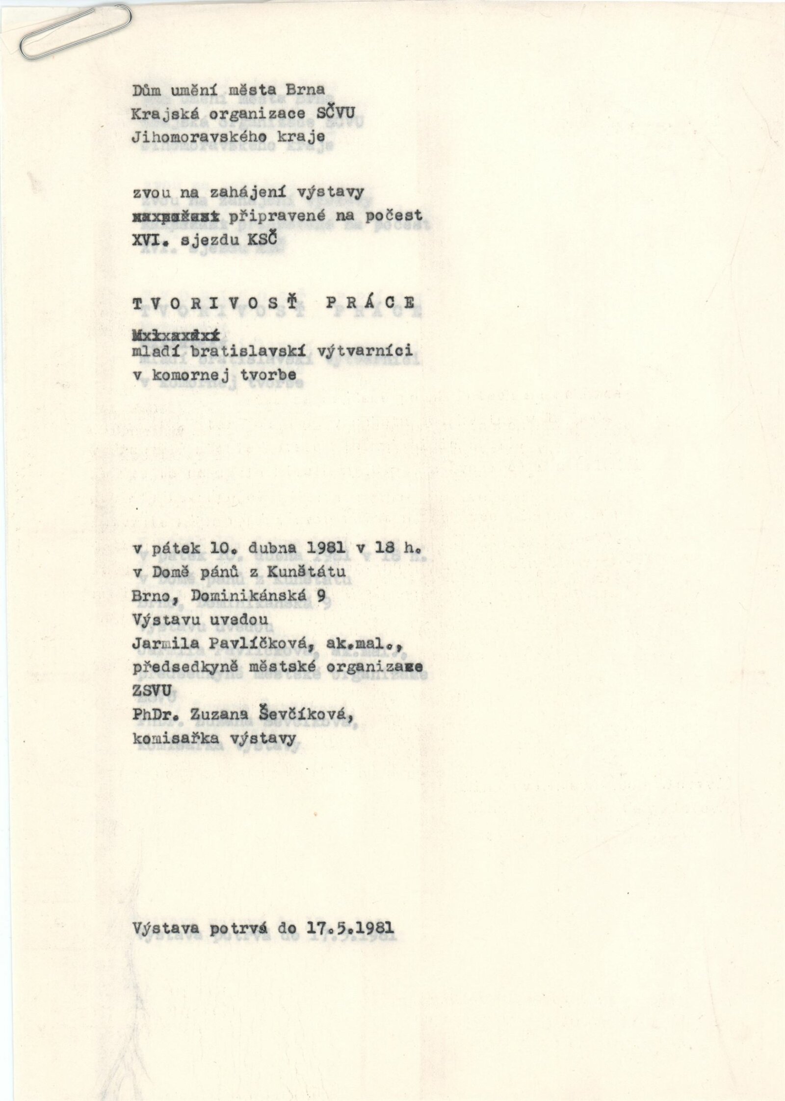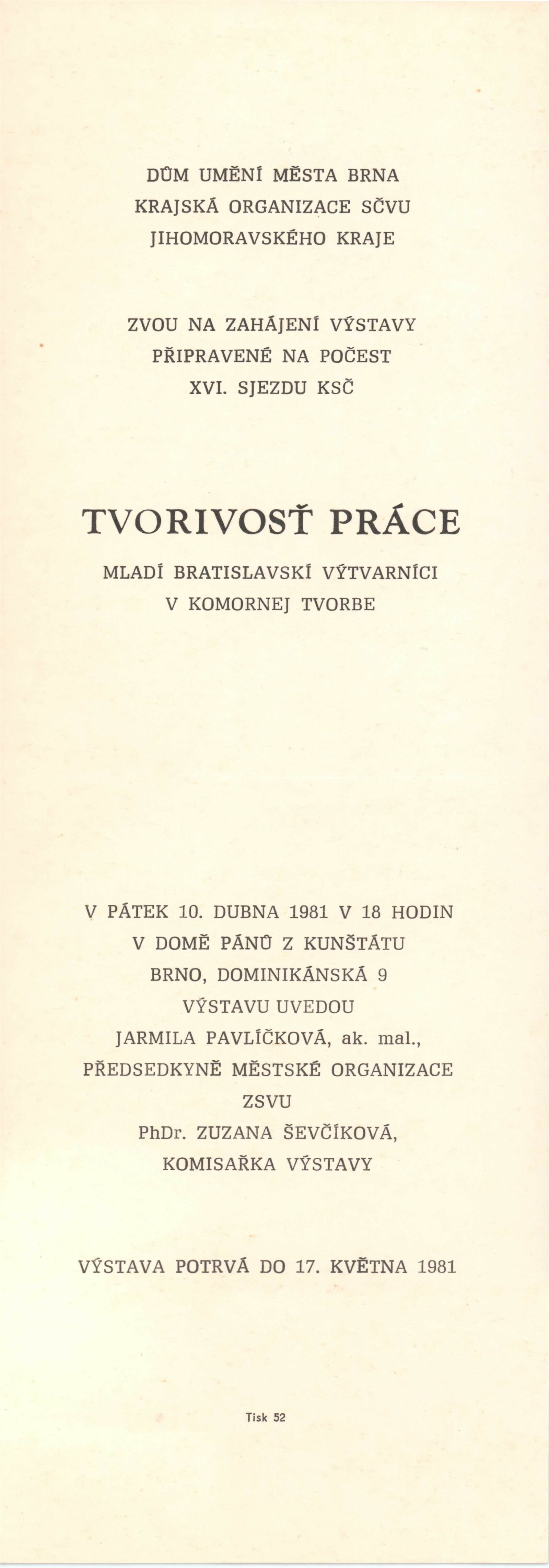 Tvorivost´ práce. Mladí bratislavskí výtvarnici v komornej tvorbe: Dům umění / Dům pánů z Kunštátu, 10. 4. – 17. 5. 1981 / Převzatý katalog. Tvorivost´ práce. Mladí bratislavskí výtvarnici v komornej tvorbe: Výstavna sien´ ZSVU v Bratislave, září 1980 / Text: Jiří Kostka, Jaroslav Ondruška. – Bratislava: Mestská organizácia ZSVU, 1980. – skládačka, 6 s., obr., DPK 758