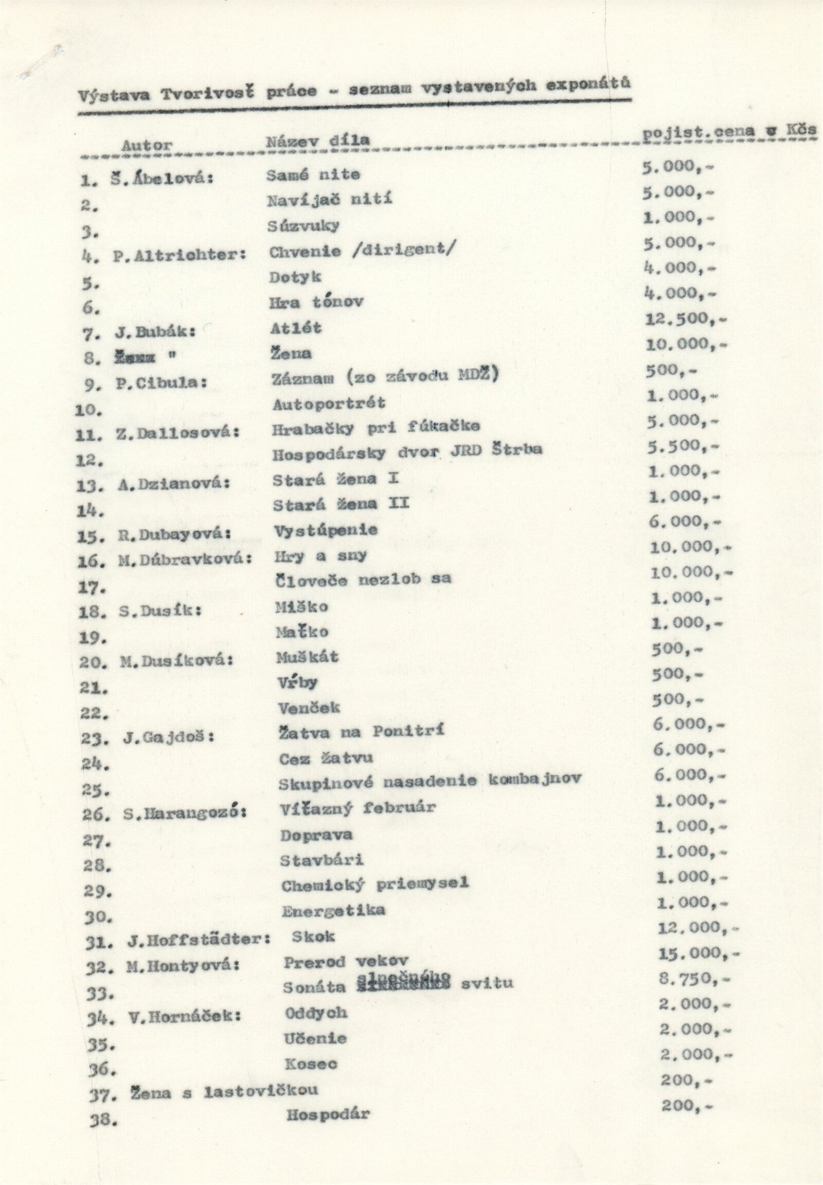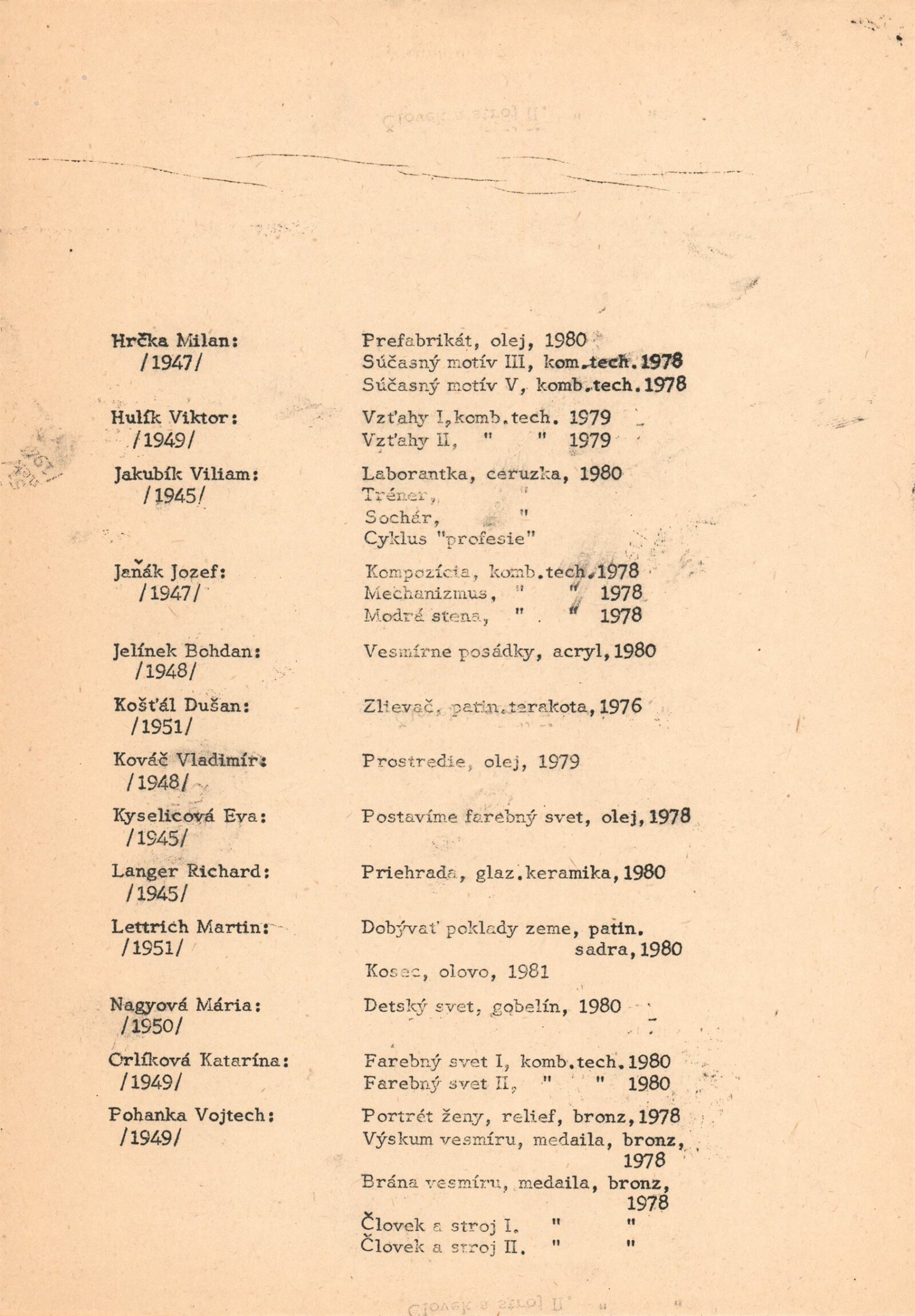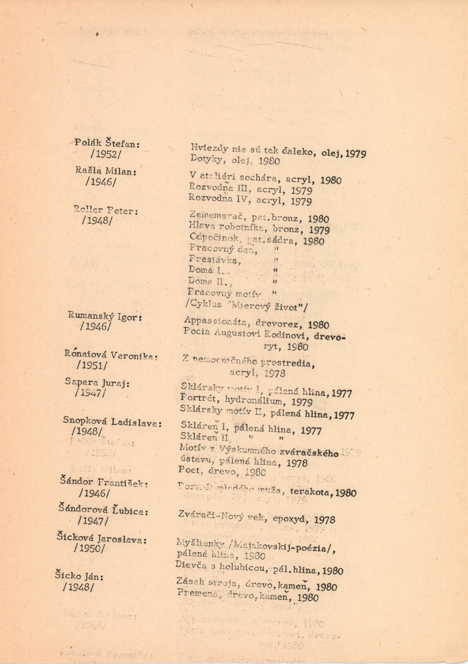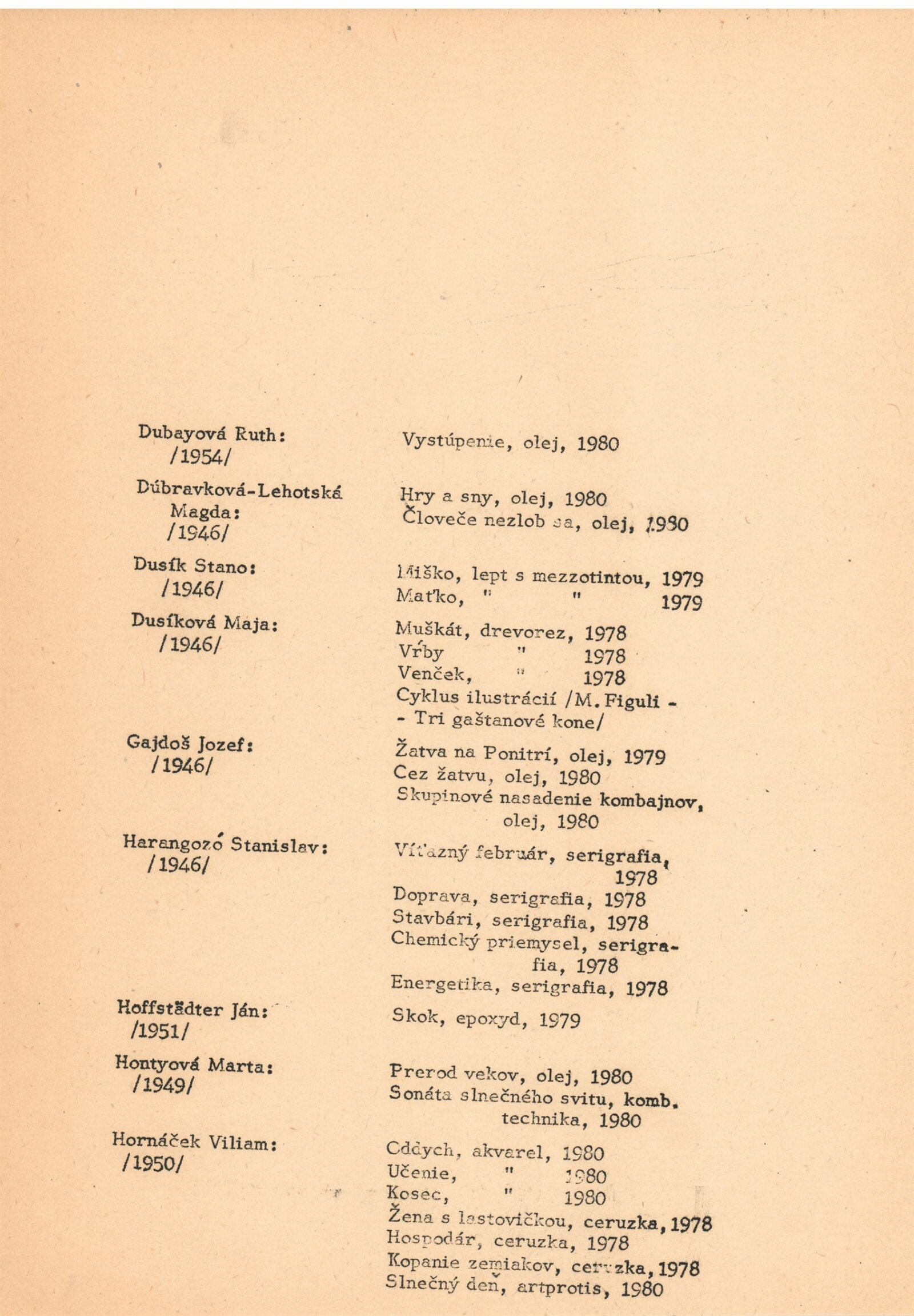 Tvorivost´ práce. Mladí bratislavskí výtvarnici v komornej tvorbe: Dům umění / Dům pánů z Kunštátu, 10. 4. – 17. 5. 1981 / Převzatý katalog. Tvorivost´ práce. Mladí bratislavskí výtvarnici v komornej tvorbe: Výstavna sien´ ZSVU v Bratislave, září 1980 / Text: Jiří Kostka, Jaroslav Ondruška. – Bratislava: Mestská organizácia ZSVU, 1980. – skládačka, 6 s., obr., DPK 758