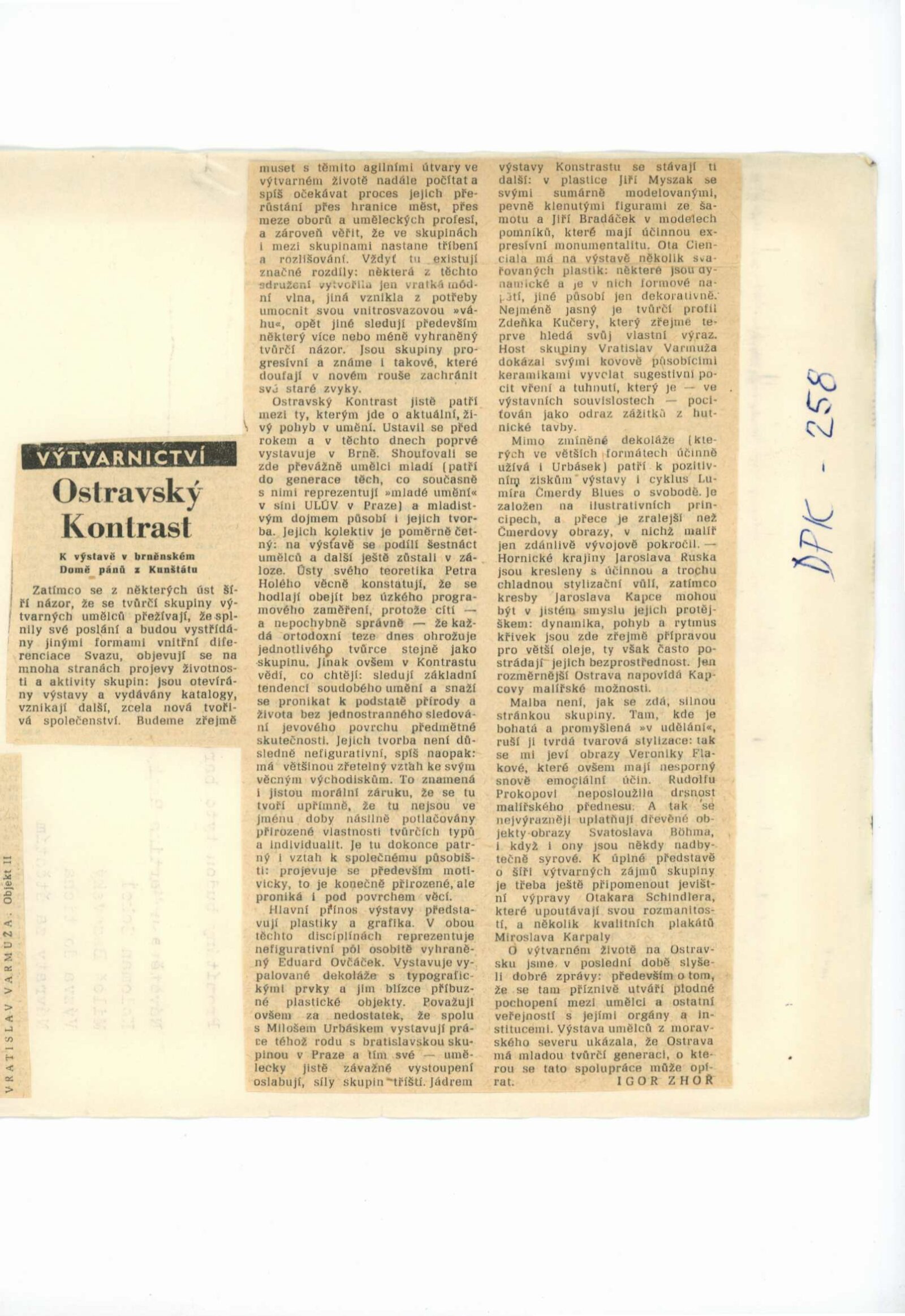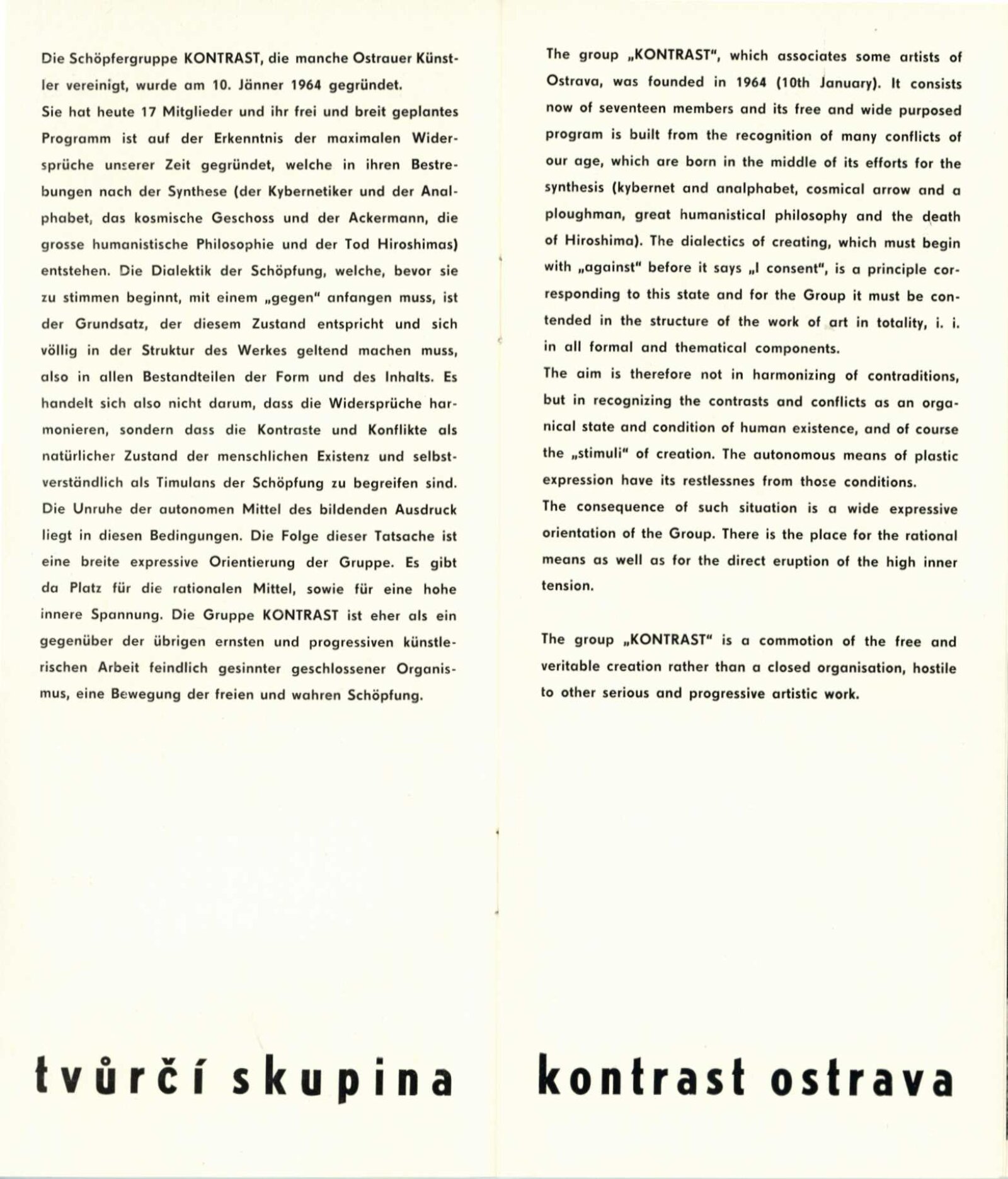 Tvůrčí skupina Kontrast Ostrava: Dům umění města Brna / Dům pánů z Kunštátu, 1. patro, 28. 2. – 4. 4. 1965 / Text: anonymní. – Brno: DUmB, 1965. – 16 s., obr. + seznam vystavených prací 4 s., DPK 258