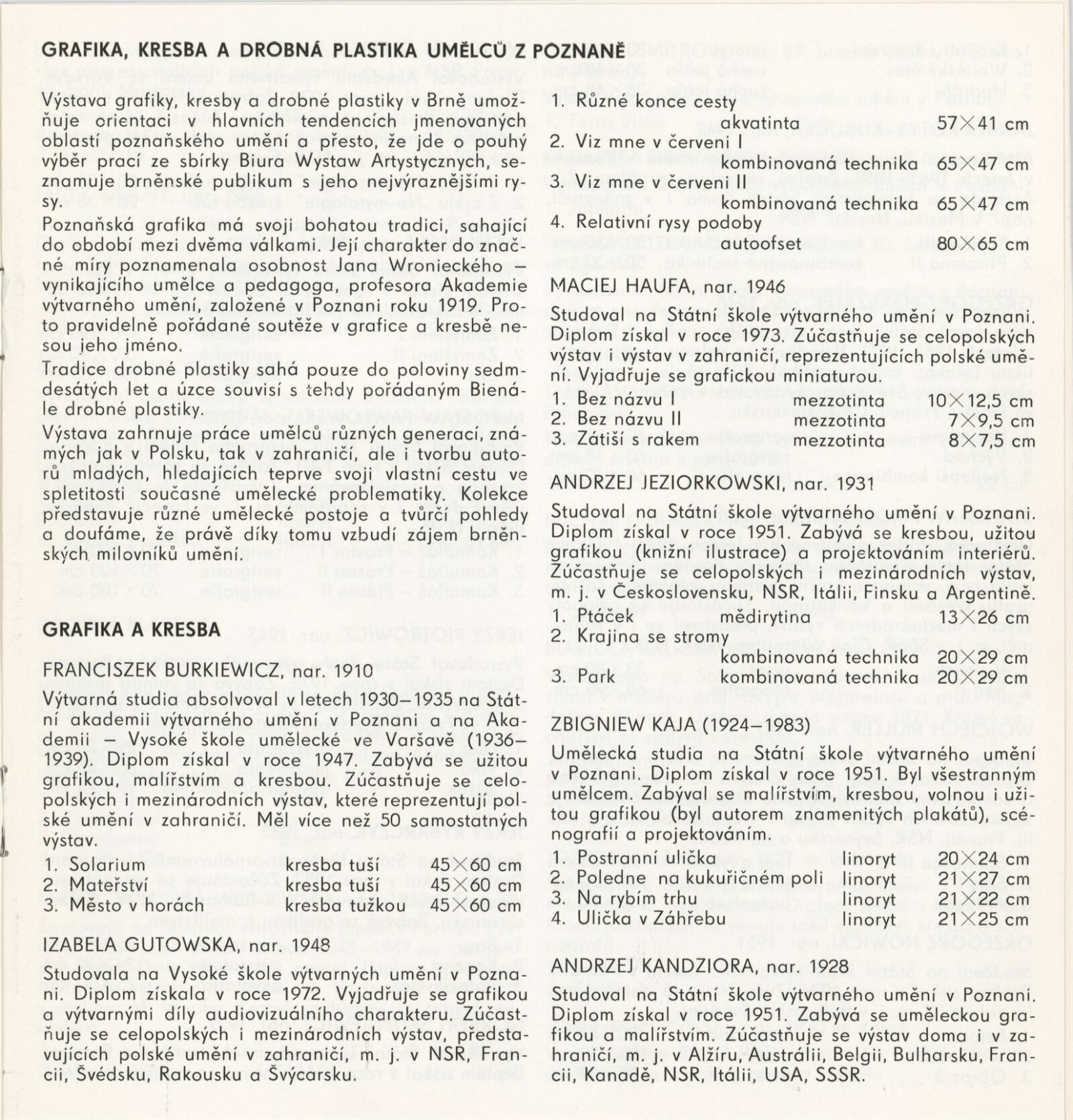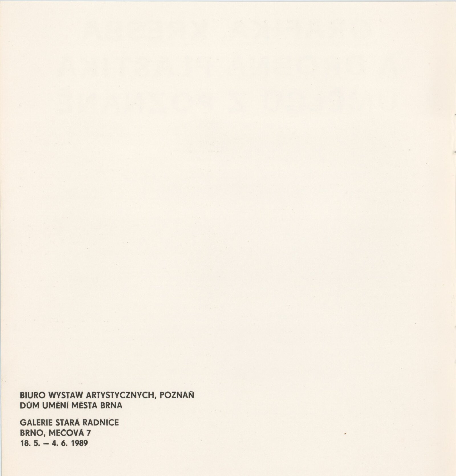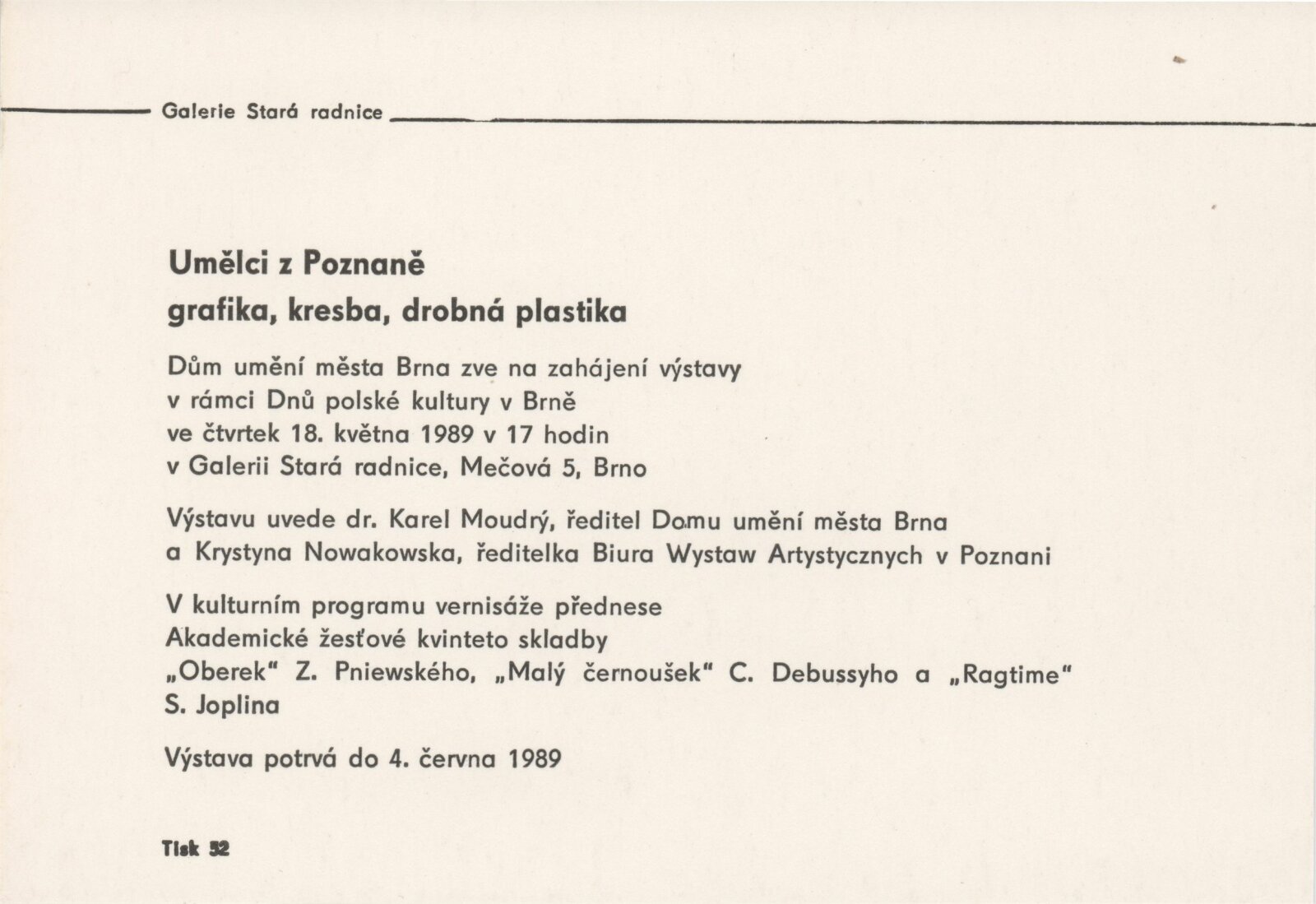 Grafika, kresby a drobná plastika umělců z Poznaně: Galerie Stará radnice, 3. patro, 18. 5. – 4. 6. 1989 / Text: Krystyna Nowakowska. – Brno: DUmB, 1989. – [4] s., GSR 48