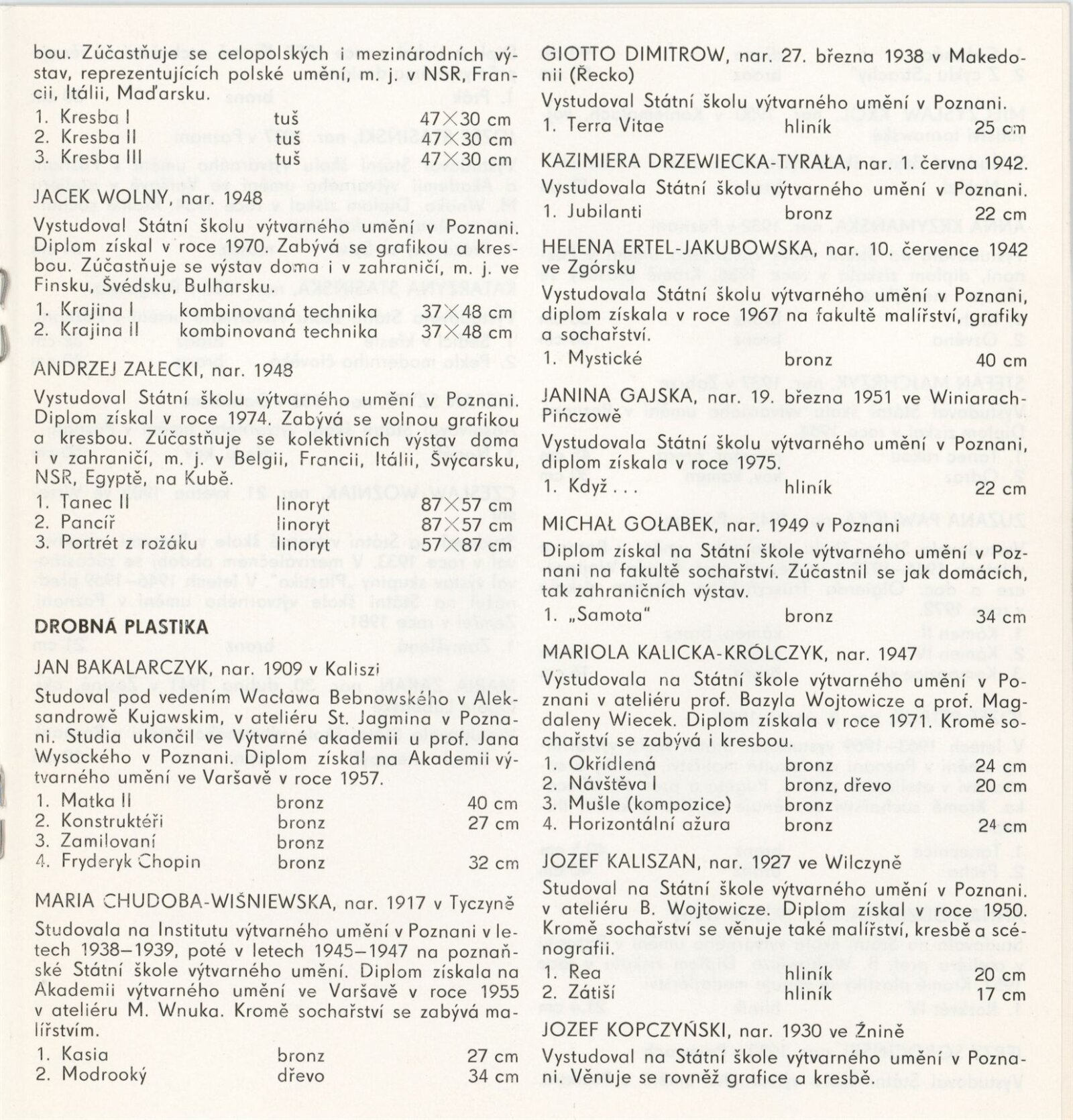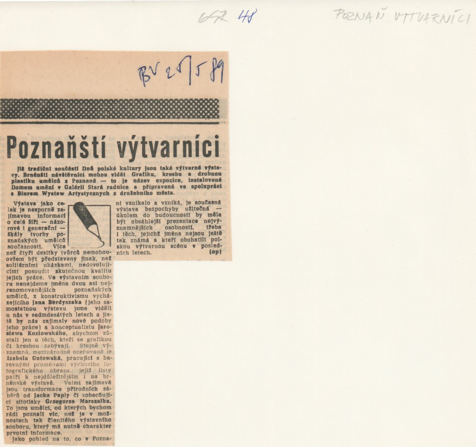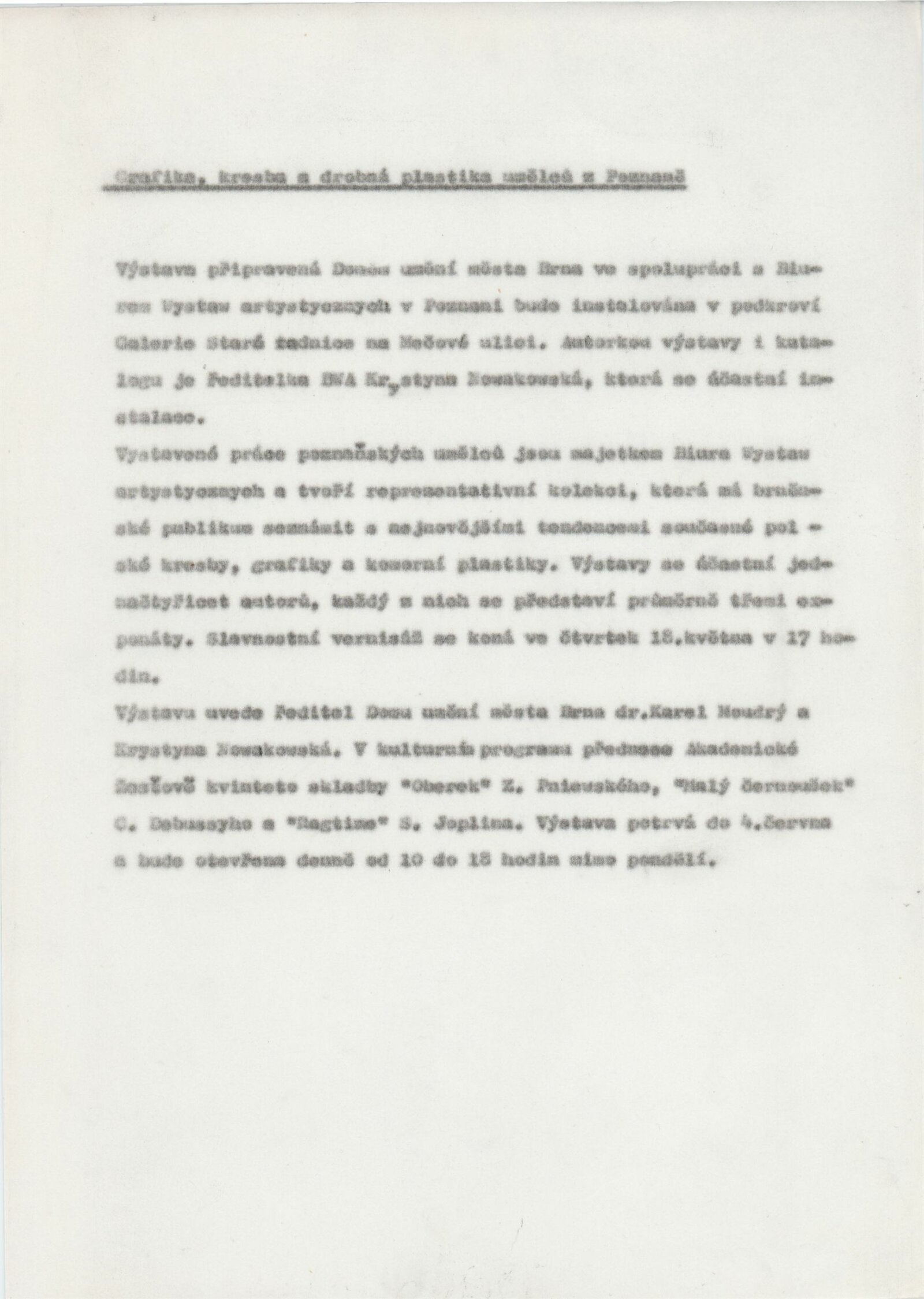 Grafika, kresby a drobná plastika umělců z Poznaně: Galerie Stará radnice, 3. patro, 18. 5. – 4. 6. 1989 / Text: Krystyna Nowakowska. – Brno: DUmB, 1989. – [4] s., GSR 48