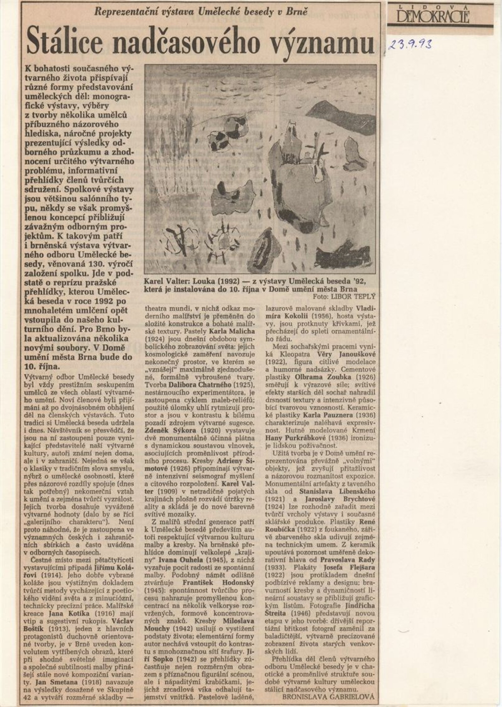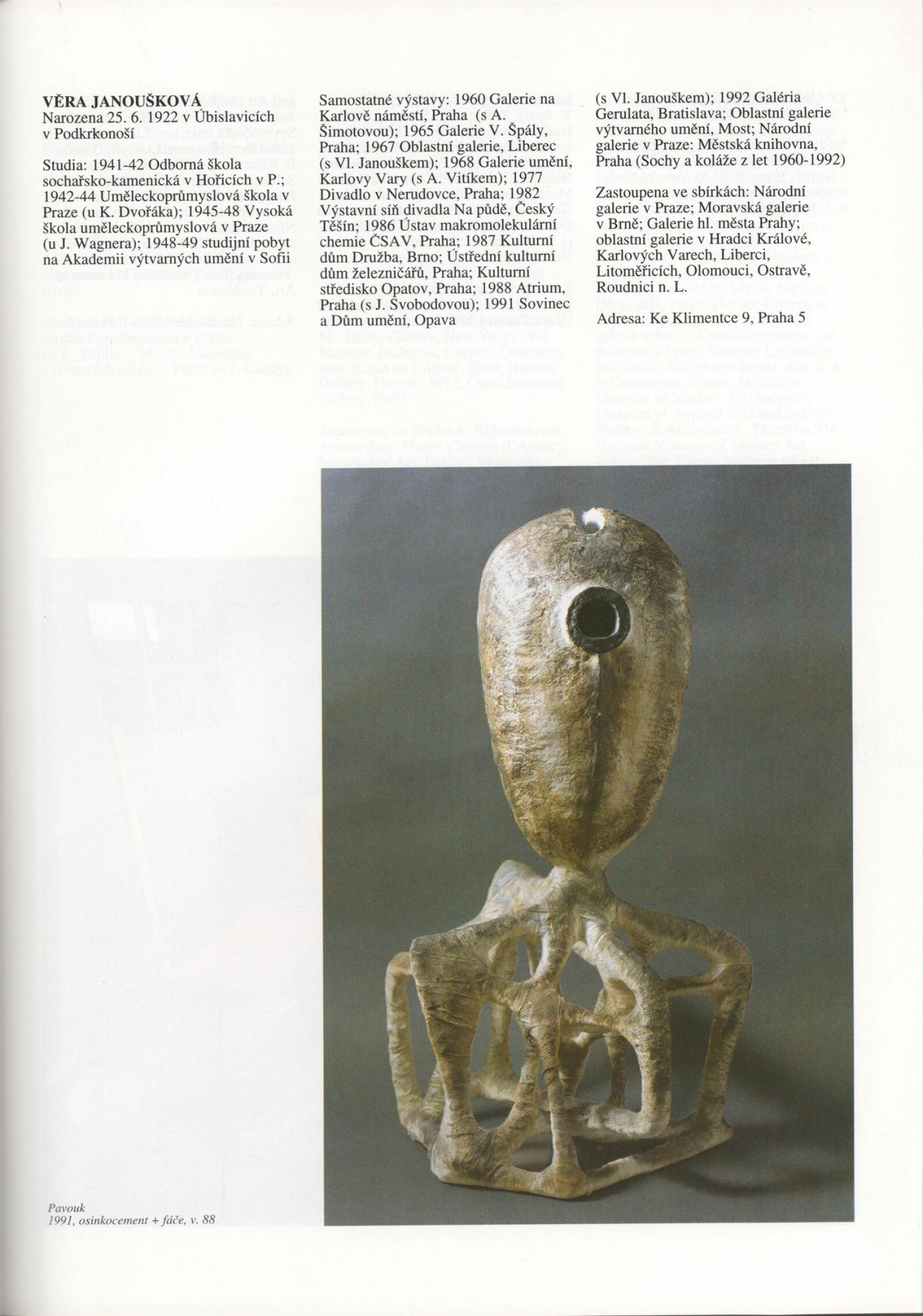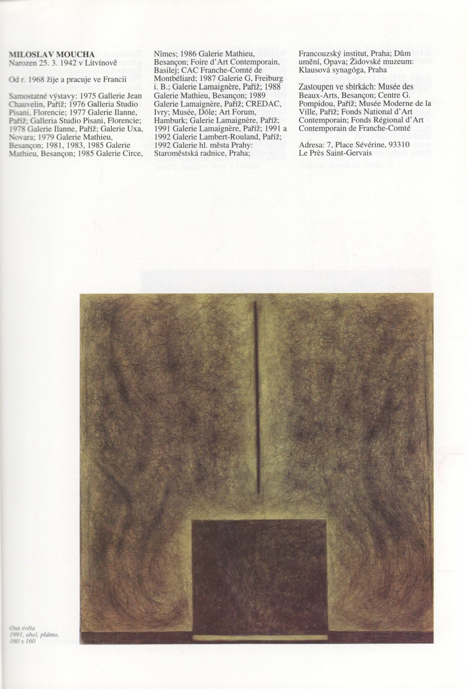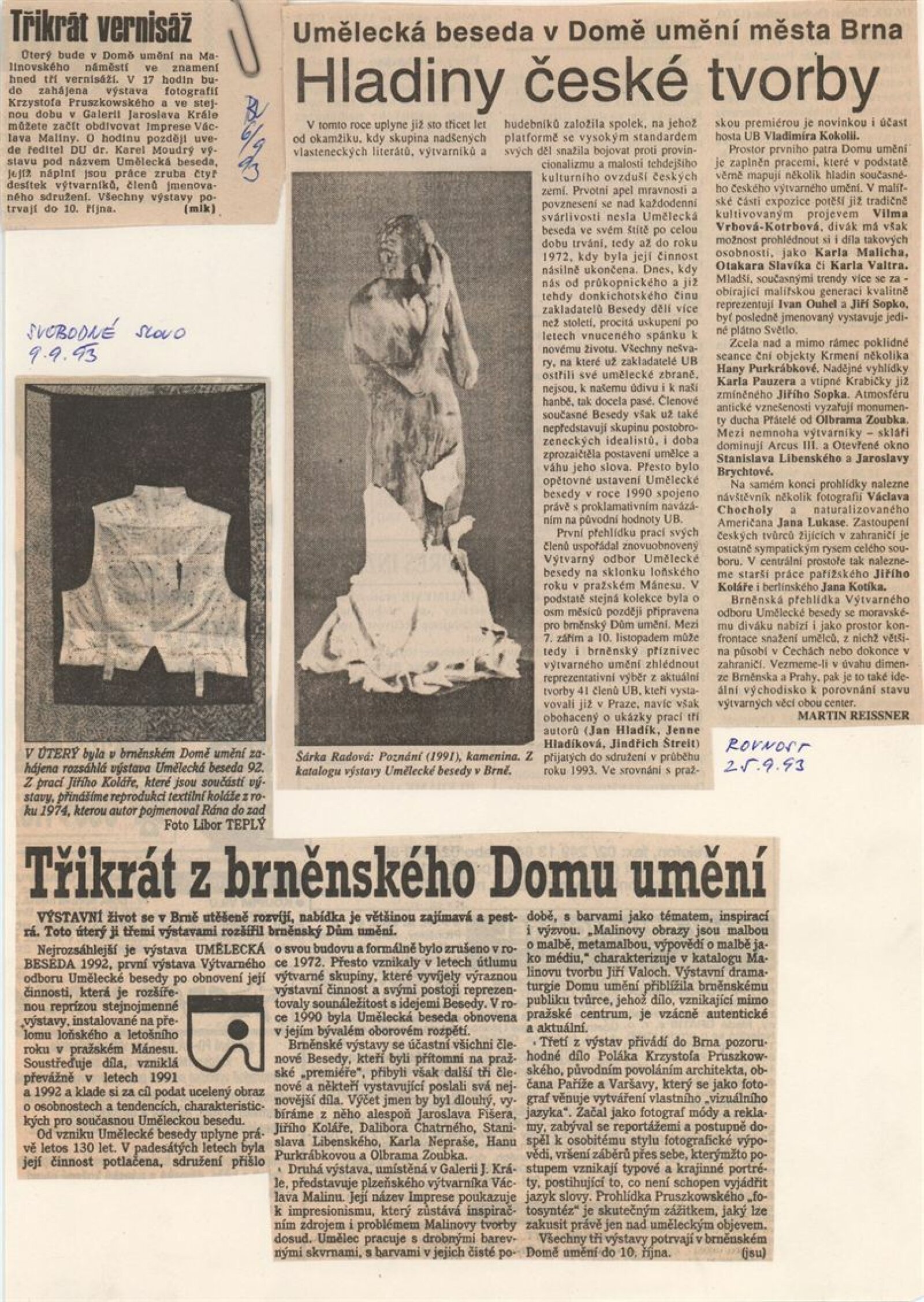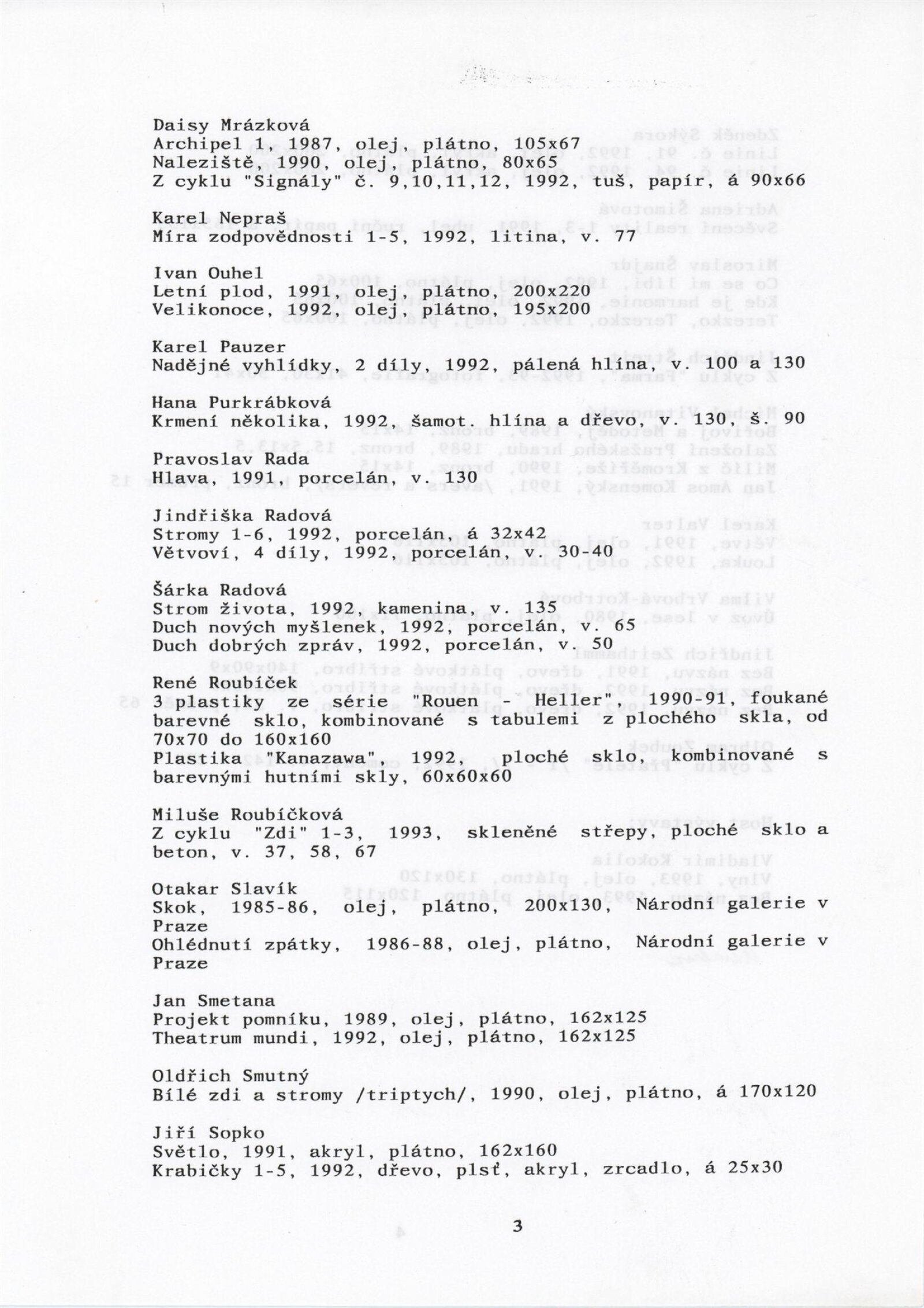 Umělecká beseda 1992: Dům umění města Brna 7. 9. – 10. 10. 1993. Převzatý katalog Umělecká beseda 1. výstava Výtvarného odboru Umělecké besedy po obnovení činnosti: Výstavní sály Mánesa, Praha 15. 12. 1992 – 31. 1. 1993. - Praha: Výtvarný odbor Umělecké besedy, - [46] s., obr.+ Rozmnožený seznam exponátů brněnské výstavy 4 s. Životní data vystavujících DU 952; MG