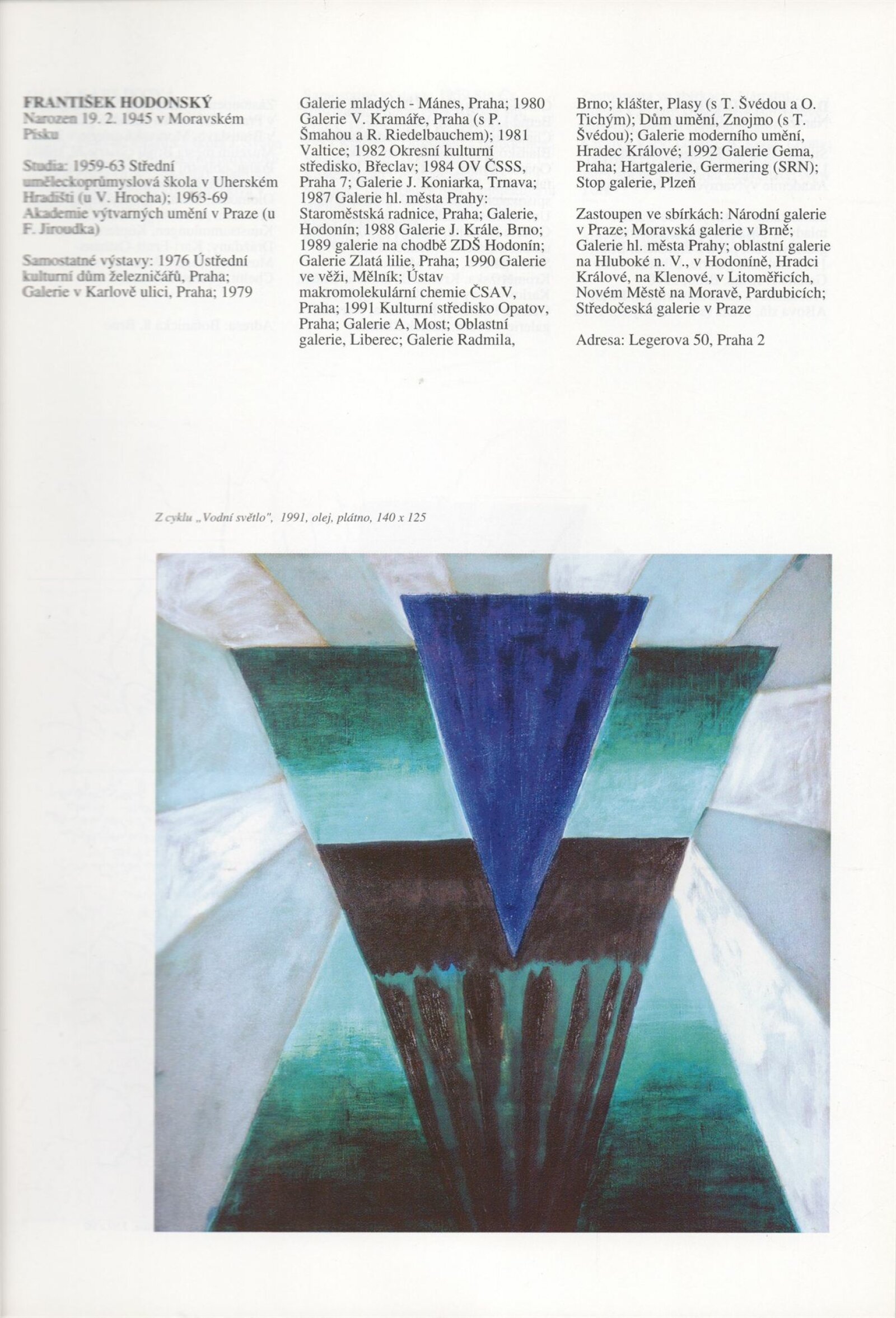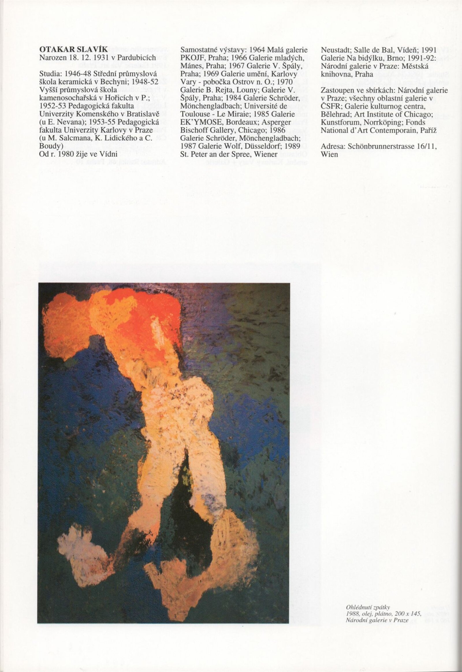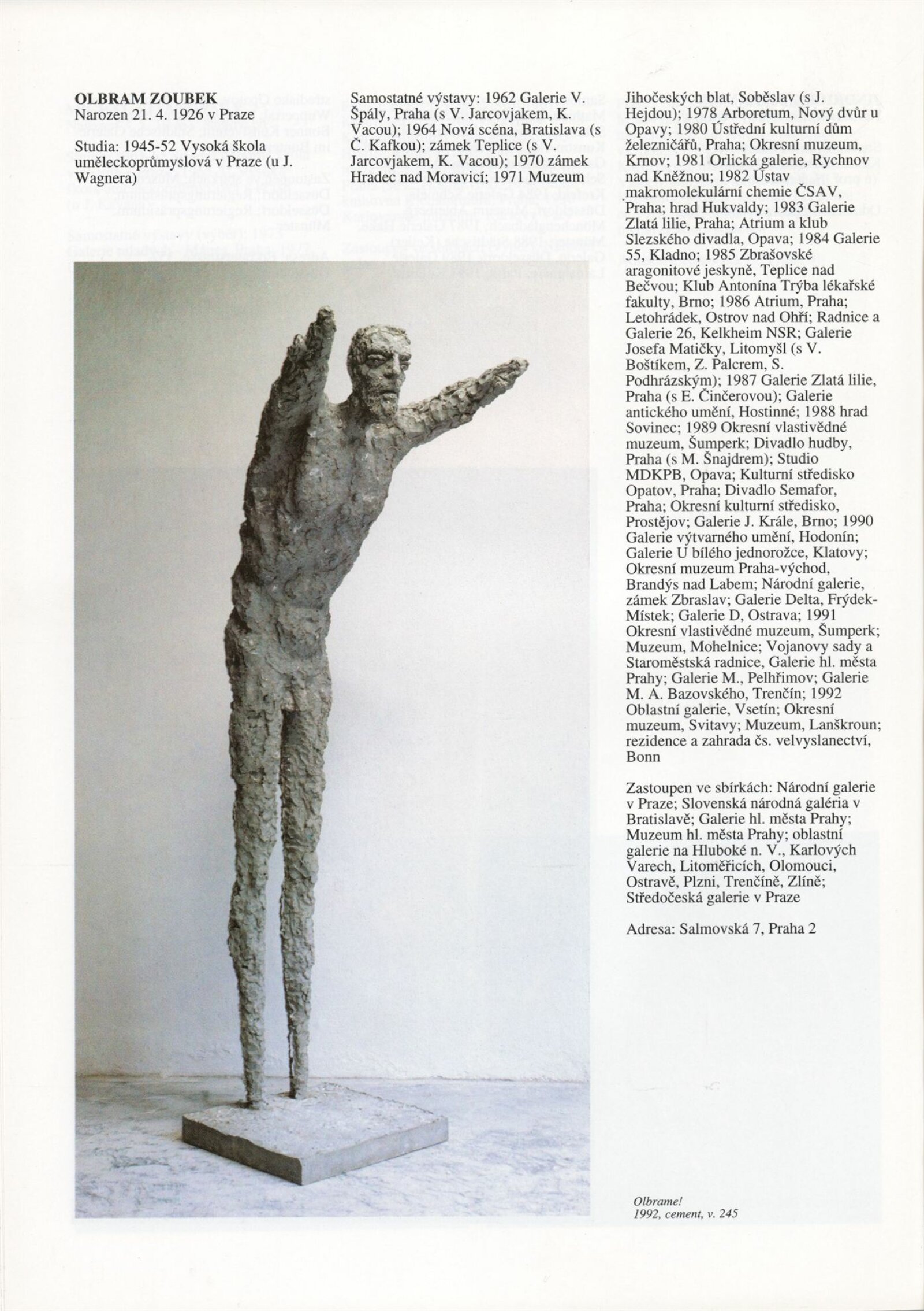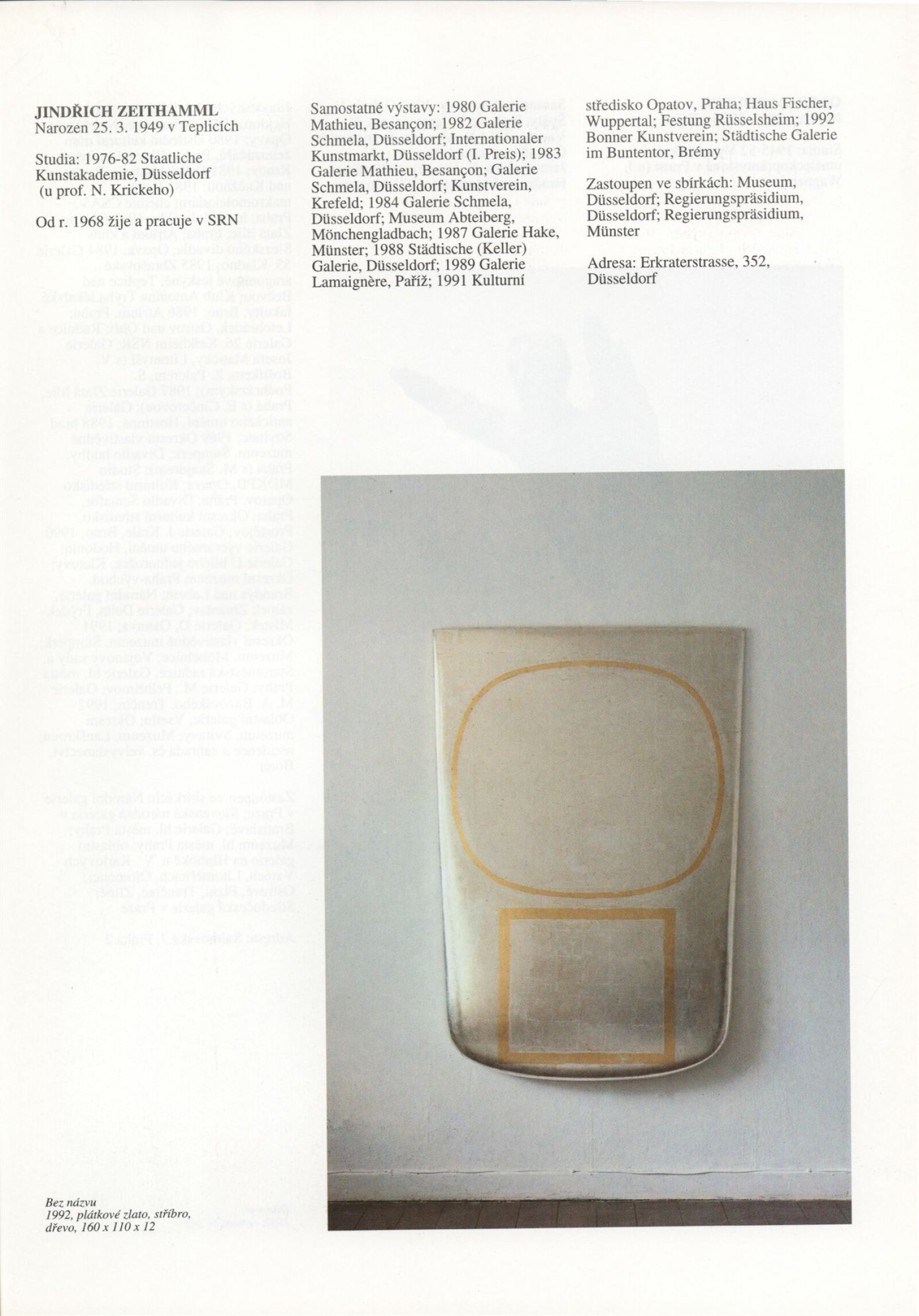 Umělecká beseda 1992: Dům umění města Brna 7. 9. – 10. 10. 1993. Převzatý katalog Umělecká beseda 1. výstava Výtvarného odboru Umělecké besedy po obnovení činnosti: Výstavní sály Mánesa, Praha 15. 12. 1992 – 31. 1. 1993. - Praha: Výtvarný odbor Umělecké besedy, - [46] s., obr.+ Rozmnožený seznam exponátů brněnské výstavy 4 s. Životní data vystavujících DU 952; MG