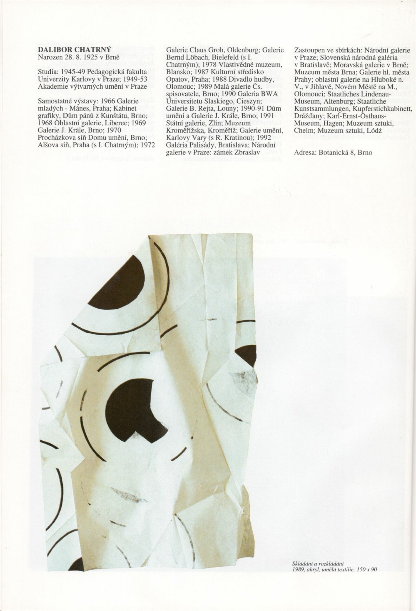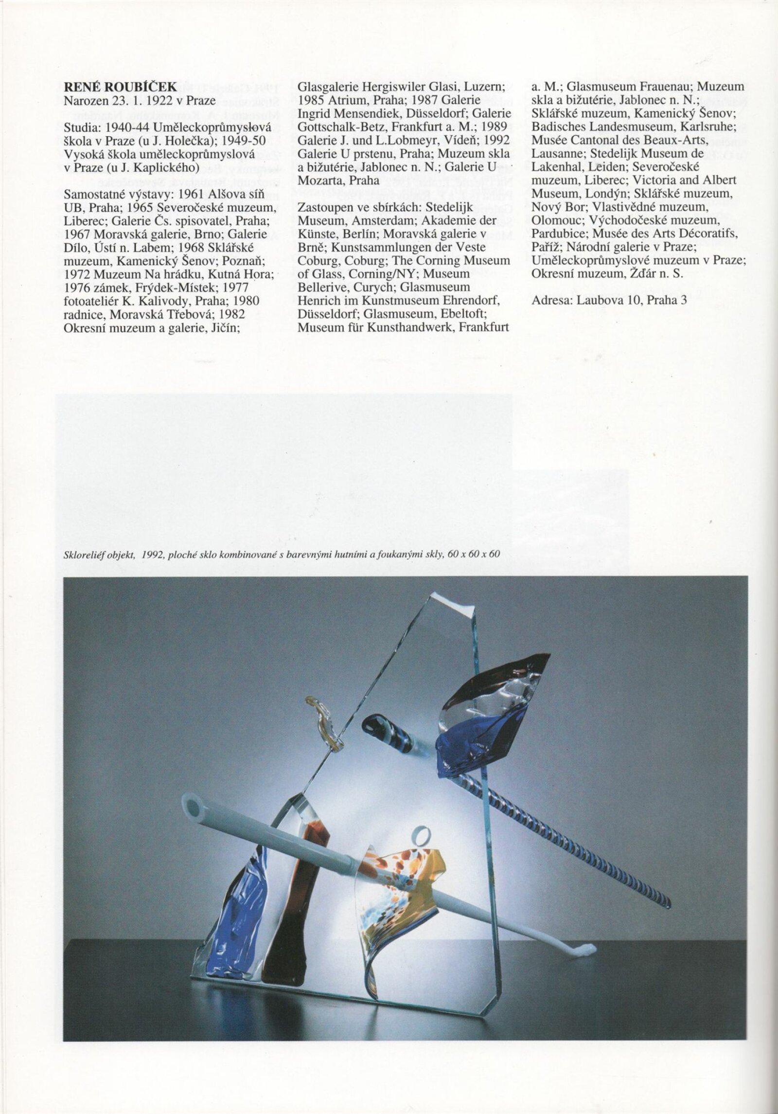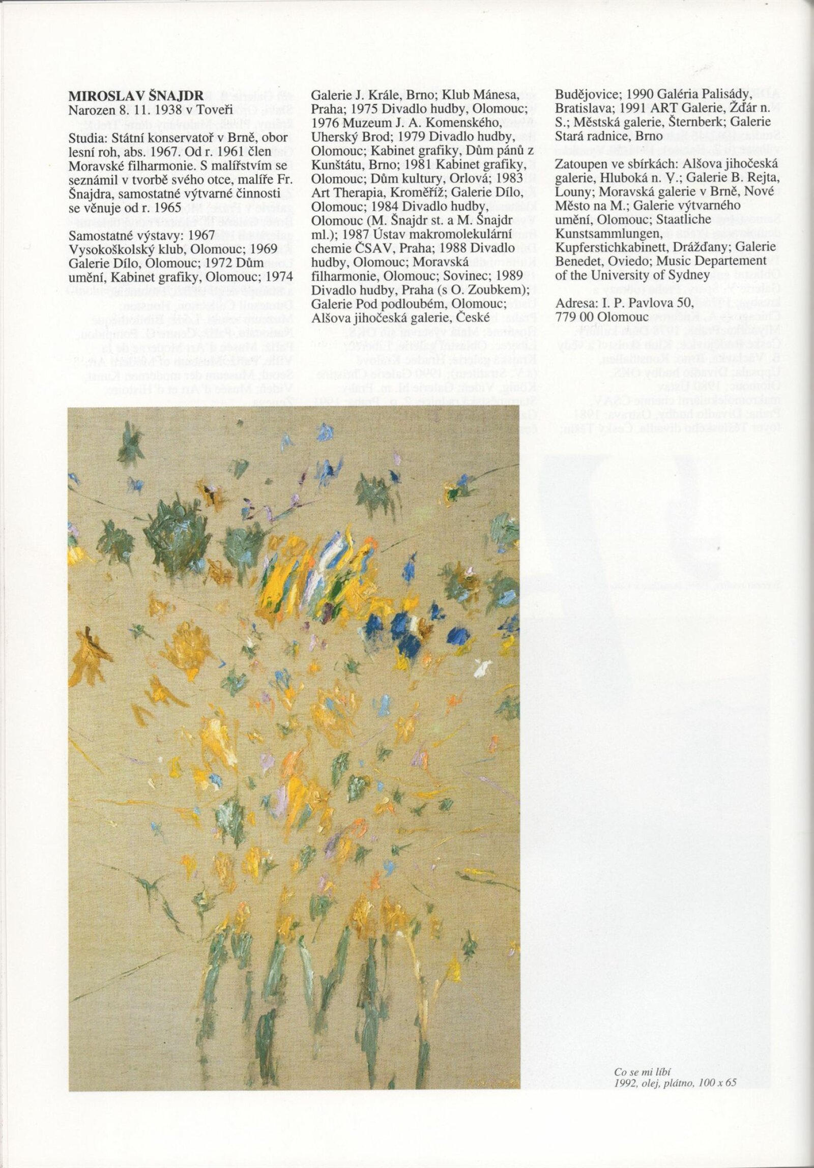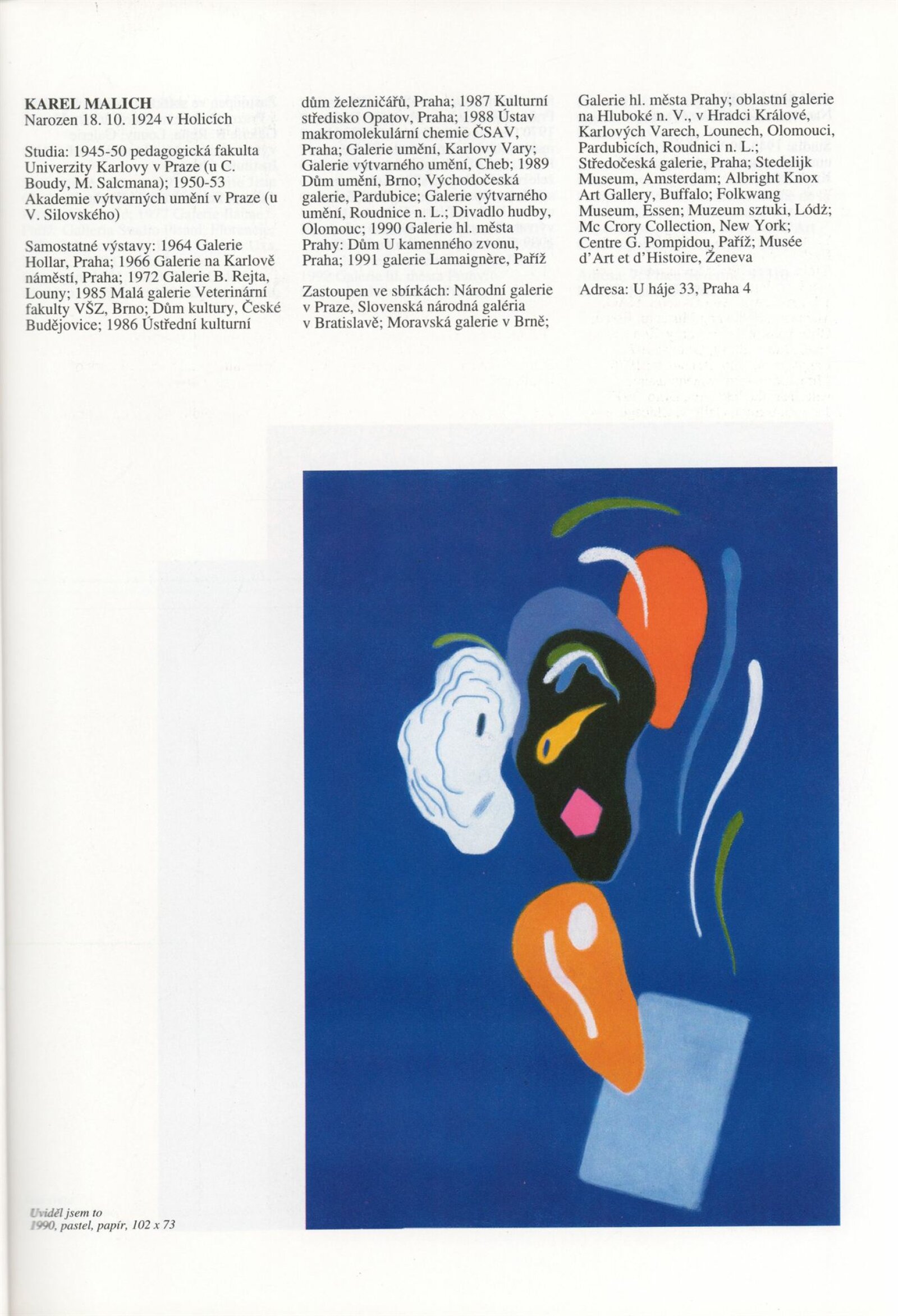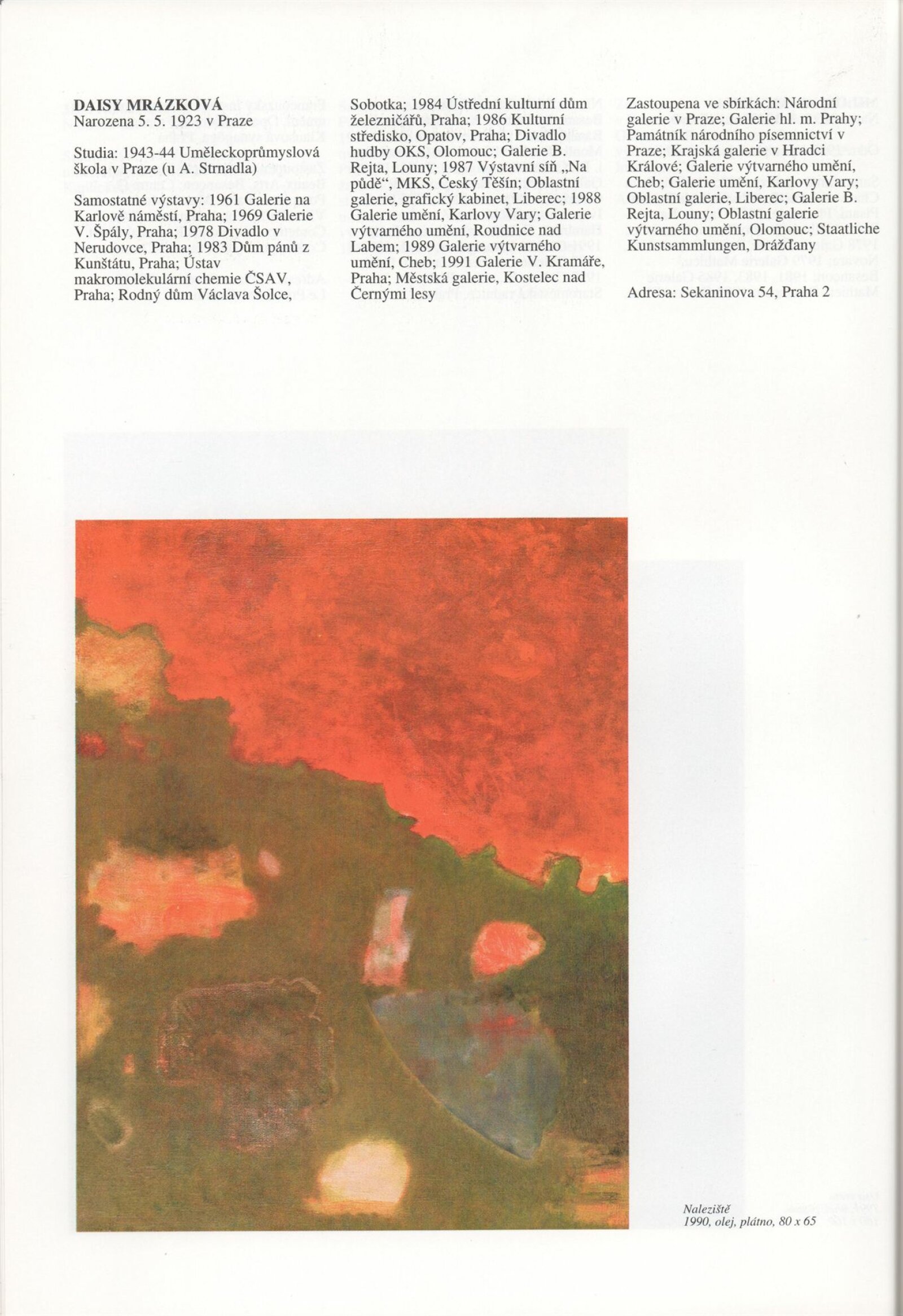 Umělecká beseda 1992: Dům umění města Brna 7. 9. – 10. 10. 1993. Převzatý katalog Umělecká beseda 1. výstava Výtvarného odboru Umělecké besedy po obnovení činnosti: Výstavní sály Mánesa, Praha 15. 12. 1992 – 31. 1. 1993. - Praha: Výtvarný odbor Umělecké besedy, - [46] s., obr.+ Rozmnožený seznam exponátů brněnské výstavy 4 s. Životní data vystavujících DU 952; MG
