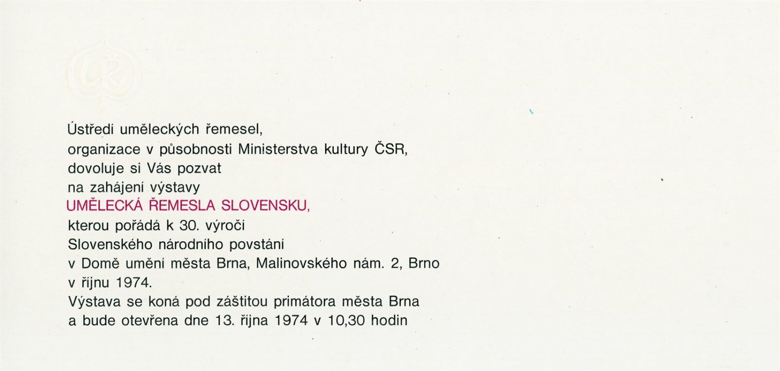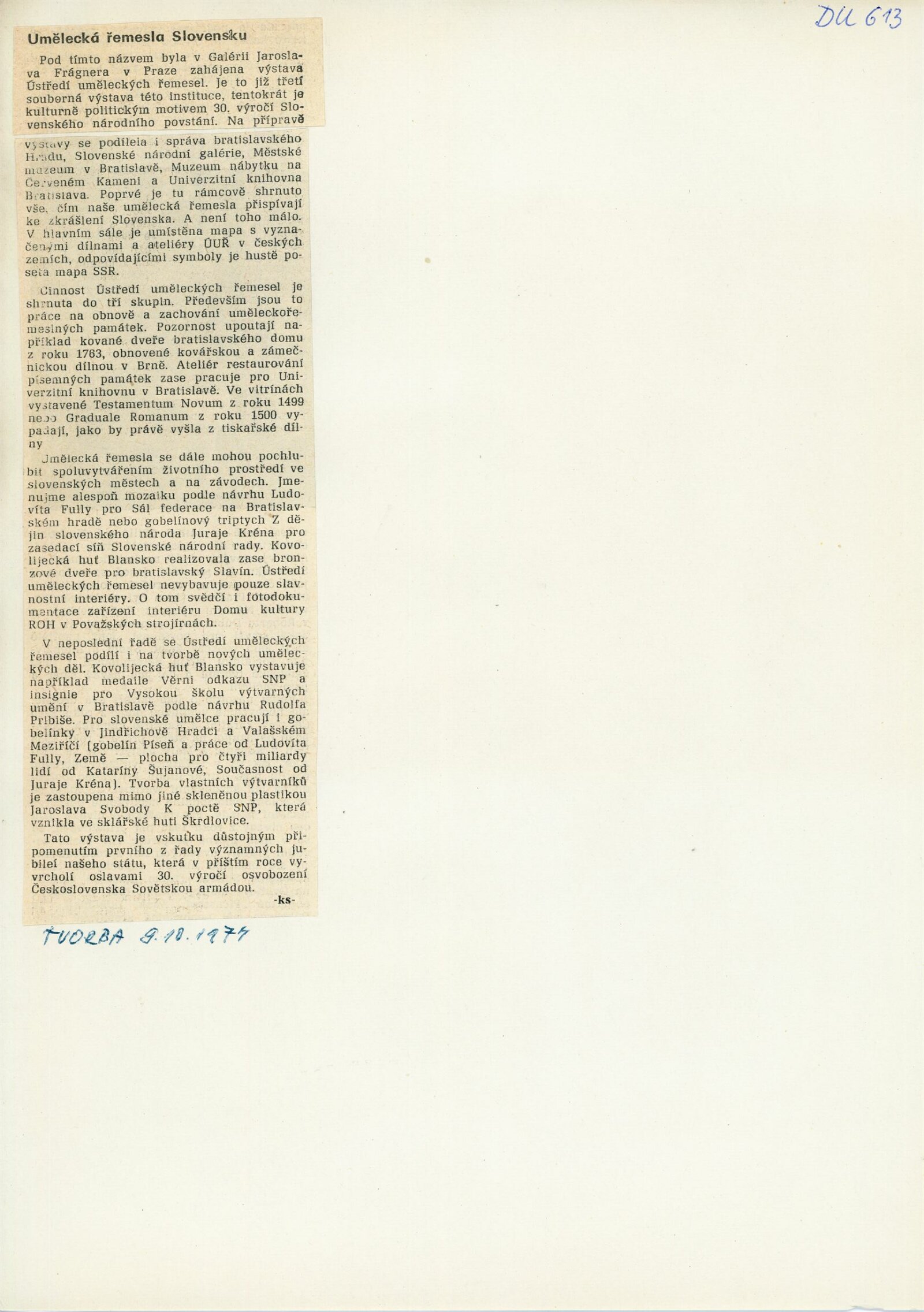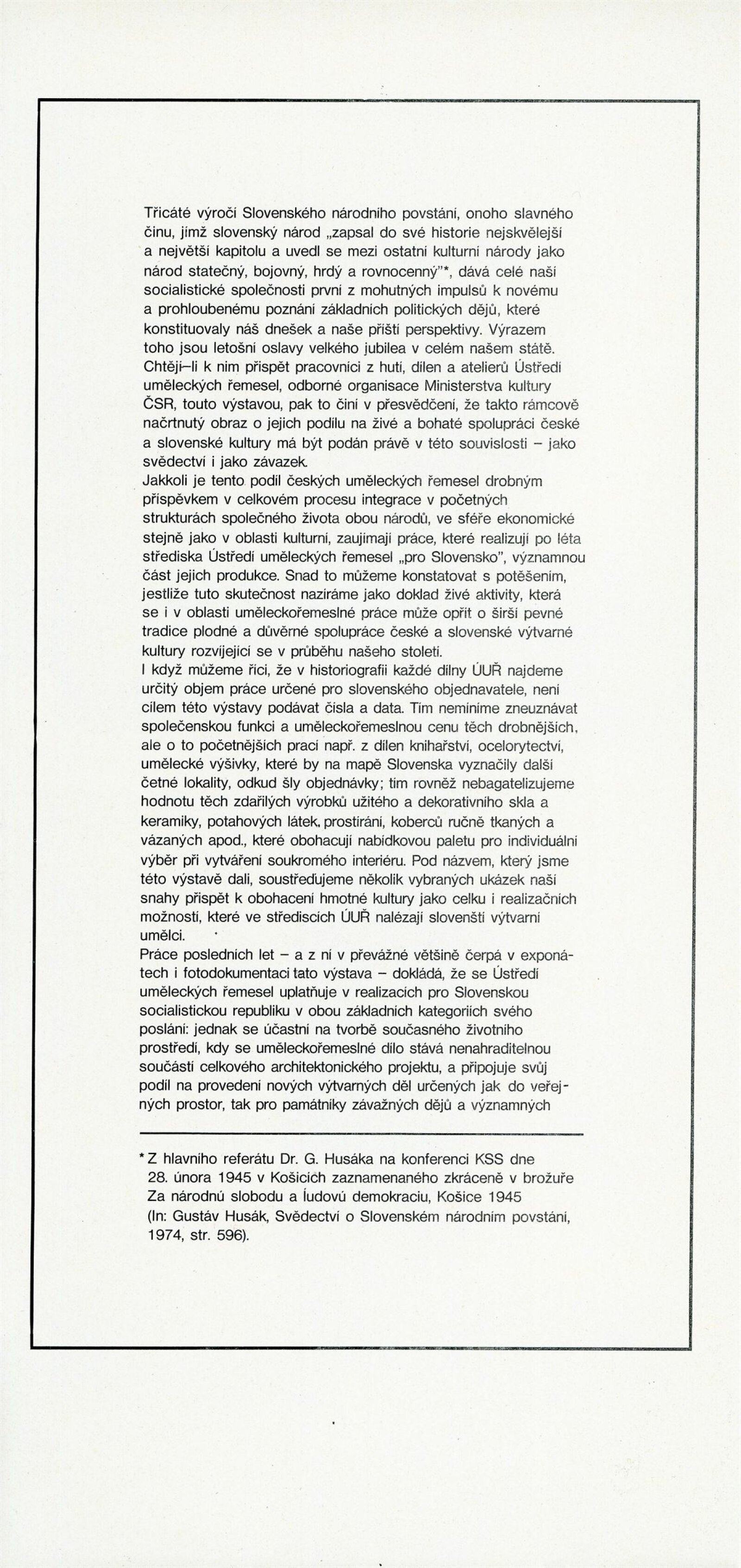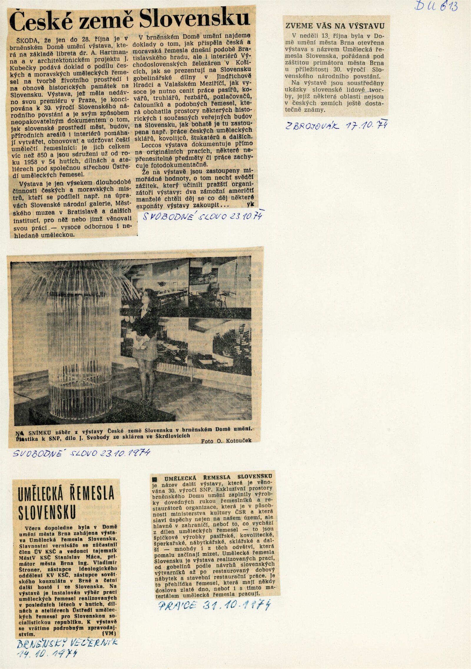 Umělecká řemesla na Slovensku. Dům umění, Brno, 13. 10. – 28. 10. 1974 / Text: Jiří Syrovátka. – Praha: Ústředí uměleckých řemesel, 1974. – skládačka 6 s., obr., DU 613. – MG