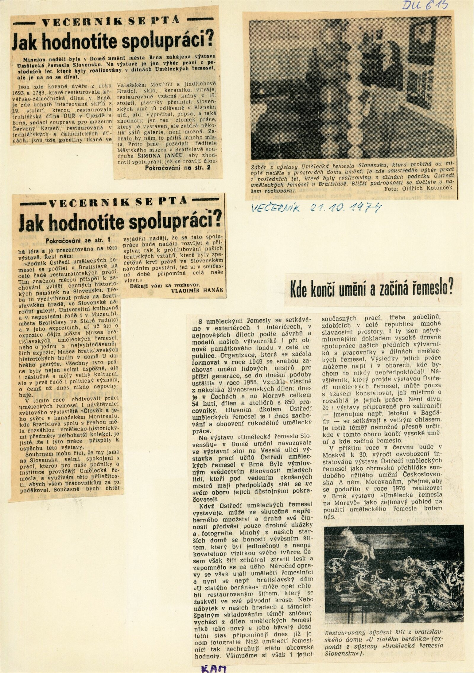pozvánka, katalog, fotografie děl, plakát (Galerie Jaroslava Frágnera Praha), libreto výstavy, zpráva o programu vernisáže, hospodářská smlouva (DU a Ústředí uměleckých řemesel Praha), zápis ze schůze o výstavě, žádost o povolení výstavy, recenze v tisku