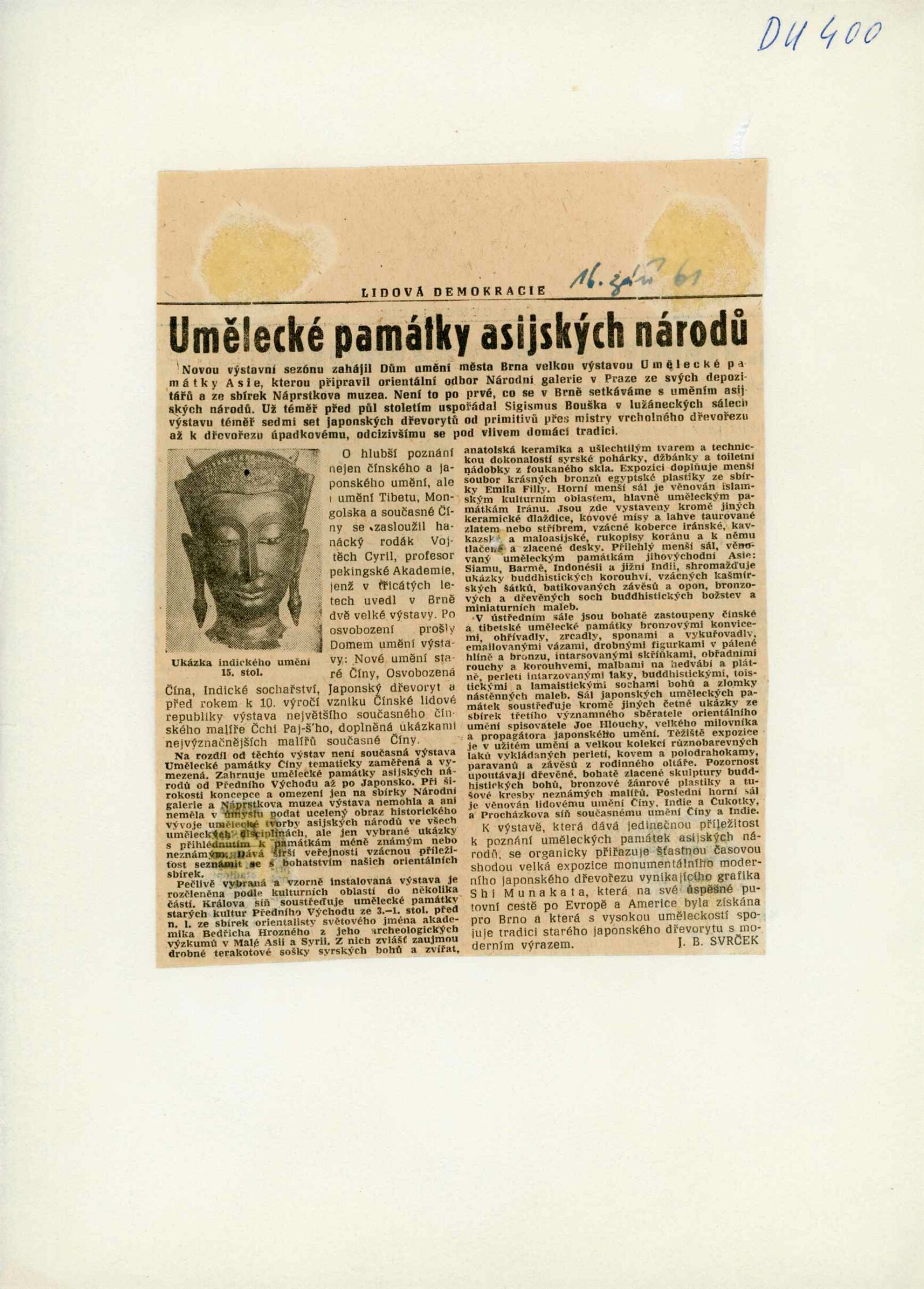 Umělecké památky Asie ze sbírek Národní galerie a Náprstkova musea v Praze: Dům umění města Brna, 3. 9. – 22. 10. 1961 / Text: Lubor Hájek. – Brno: DUmB, 1961. – 16 s., obr., DU 400. – MG