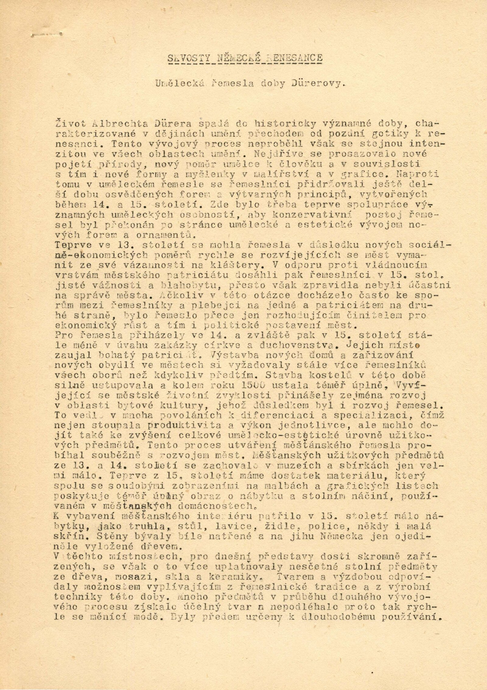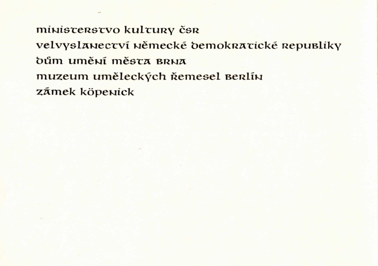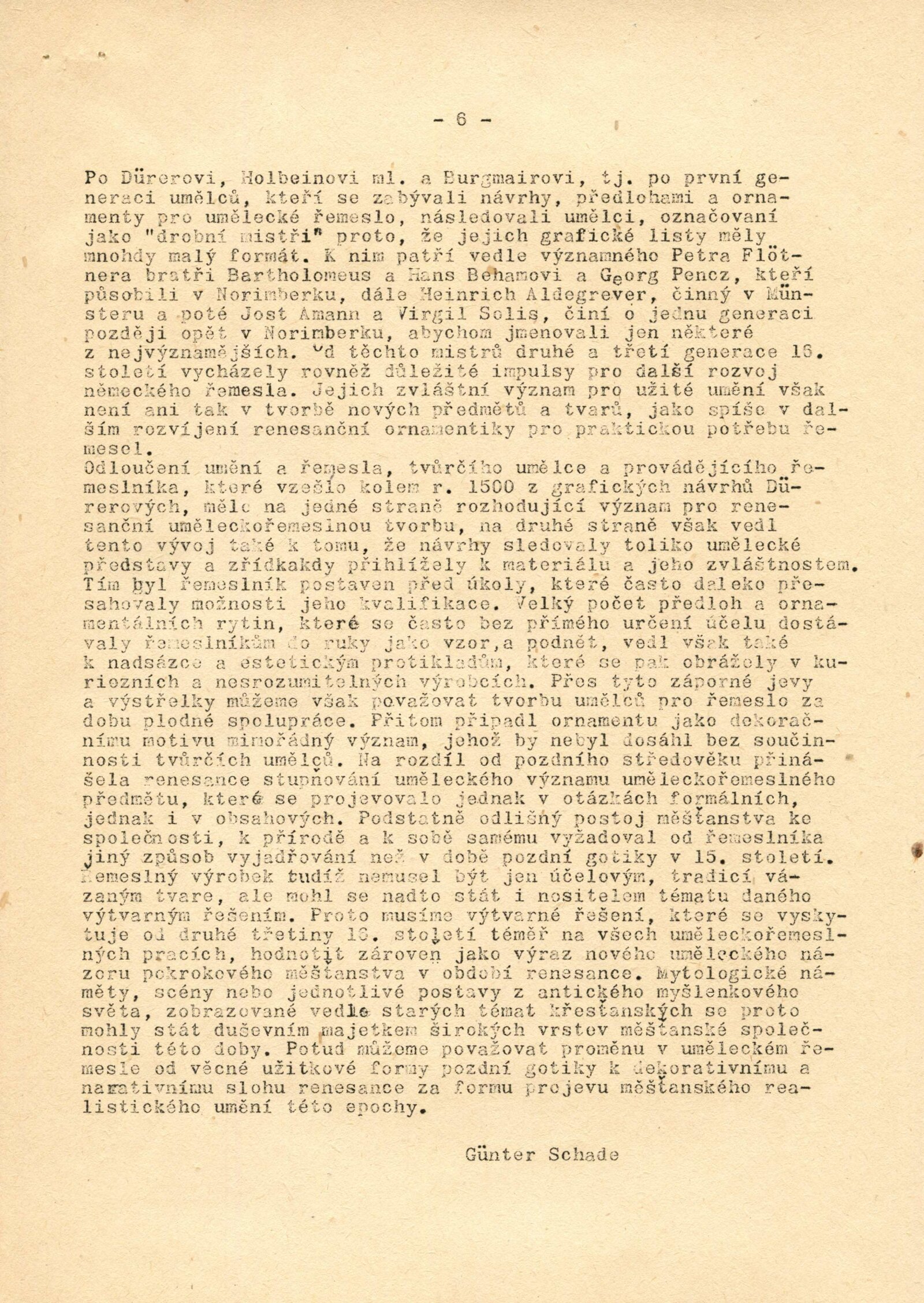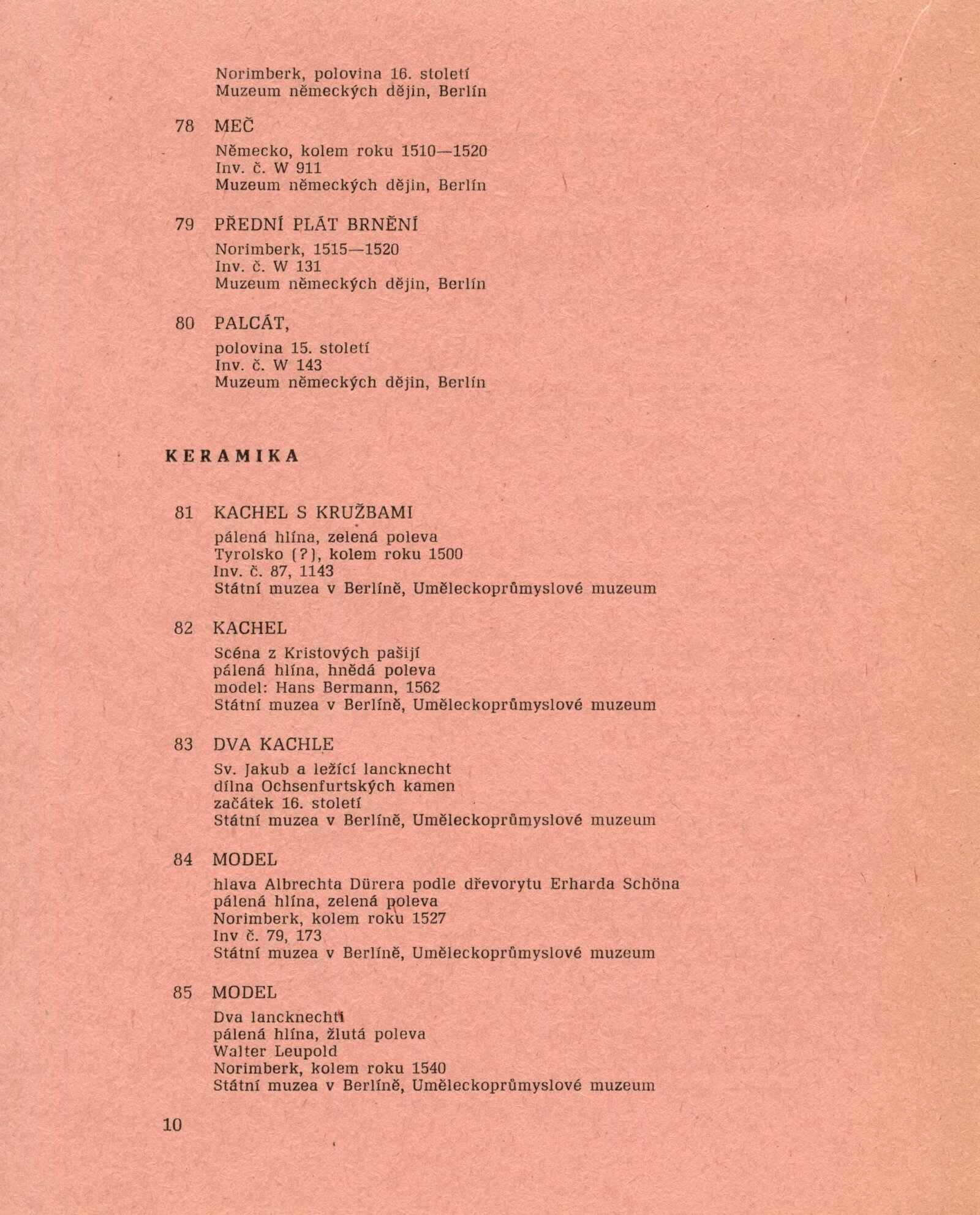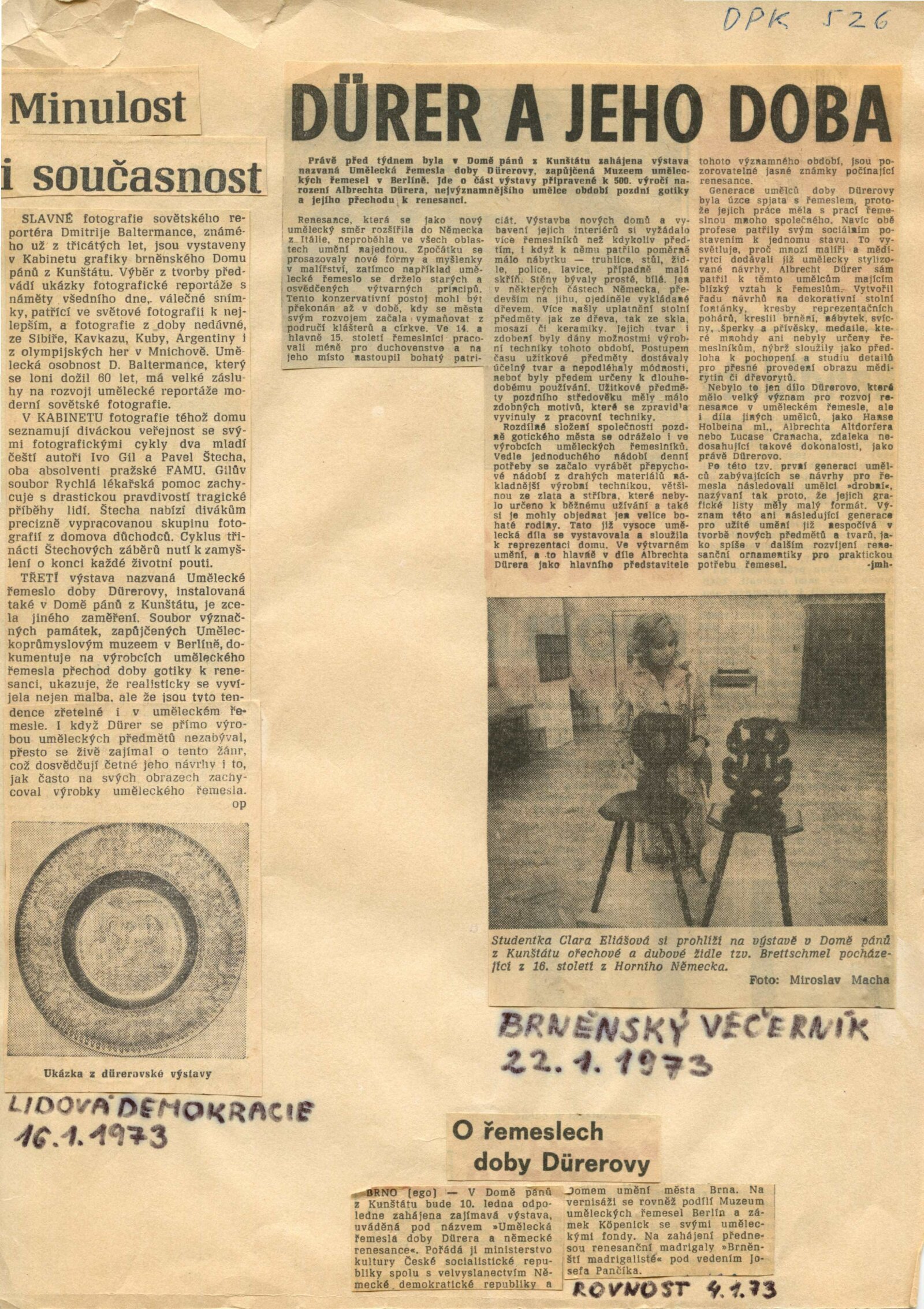 Umělecká řemesla doby Dürerovy a německé renesance: Dům umění / Dům pánů z Kunštátu, 10. 1. – 28. 1. 1973 / Převzatý katalog. Umělecké řemeslo doby Dürera a německé renesance. Výstava u příležitosti pětistého výročí narození Albrechta Dürera: Uměleckoprůmyslové muzeum, 1972 / Text: Günter Schade. – Praha: Uměleckoprůmyslové muzeum, 1972. – 11 s., 16 s., obr. příl., 1 l. bar. obr., seznam exponátů 14 s., DPK 526. – MG